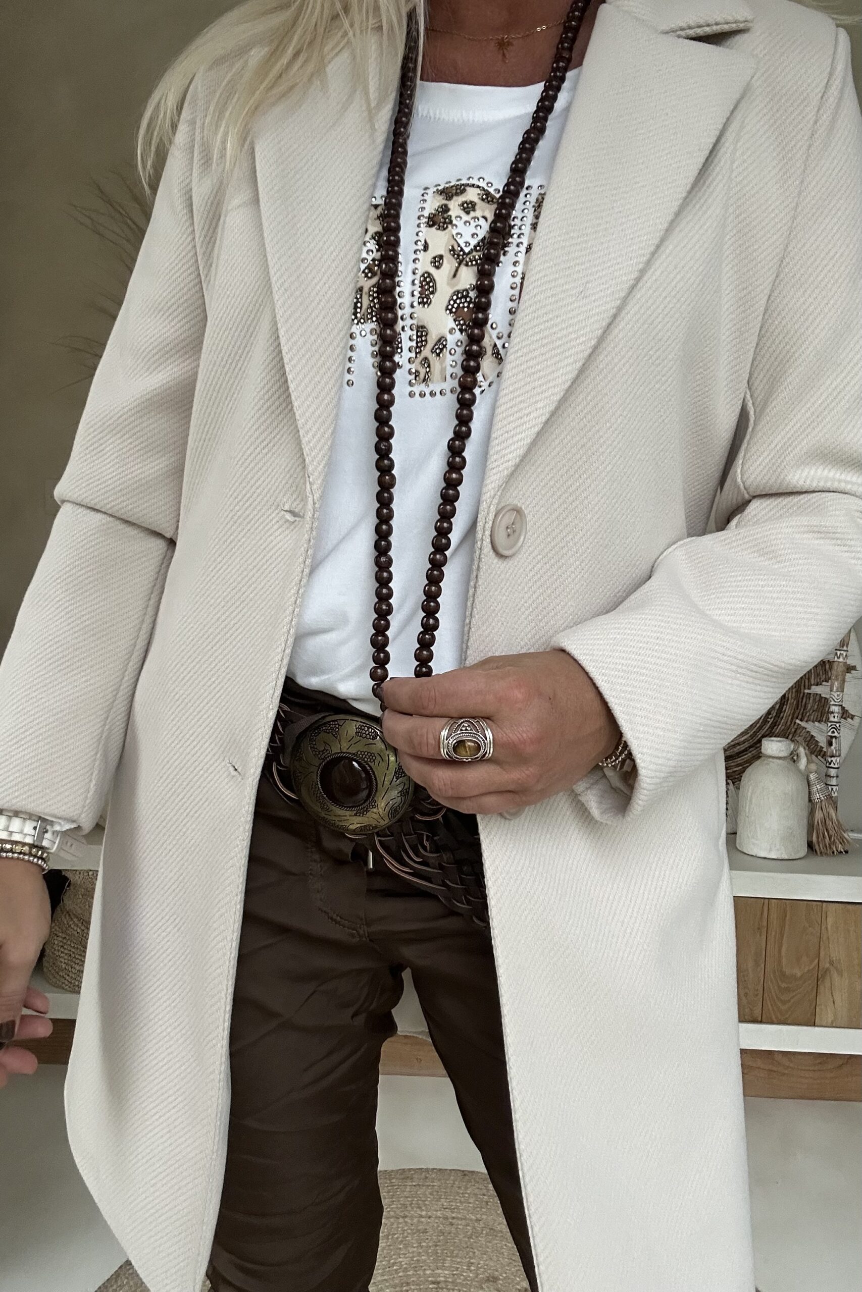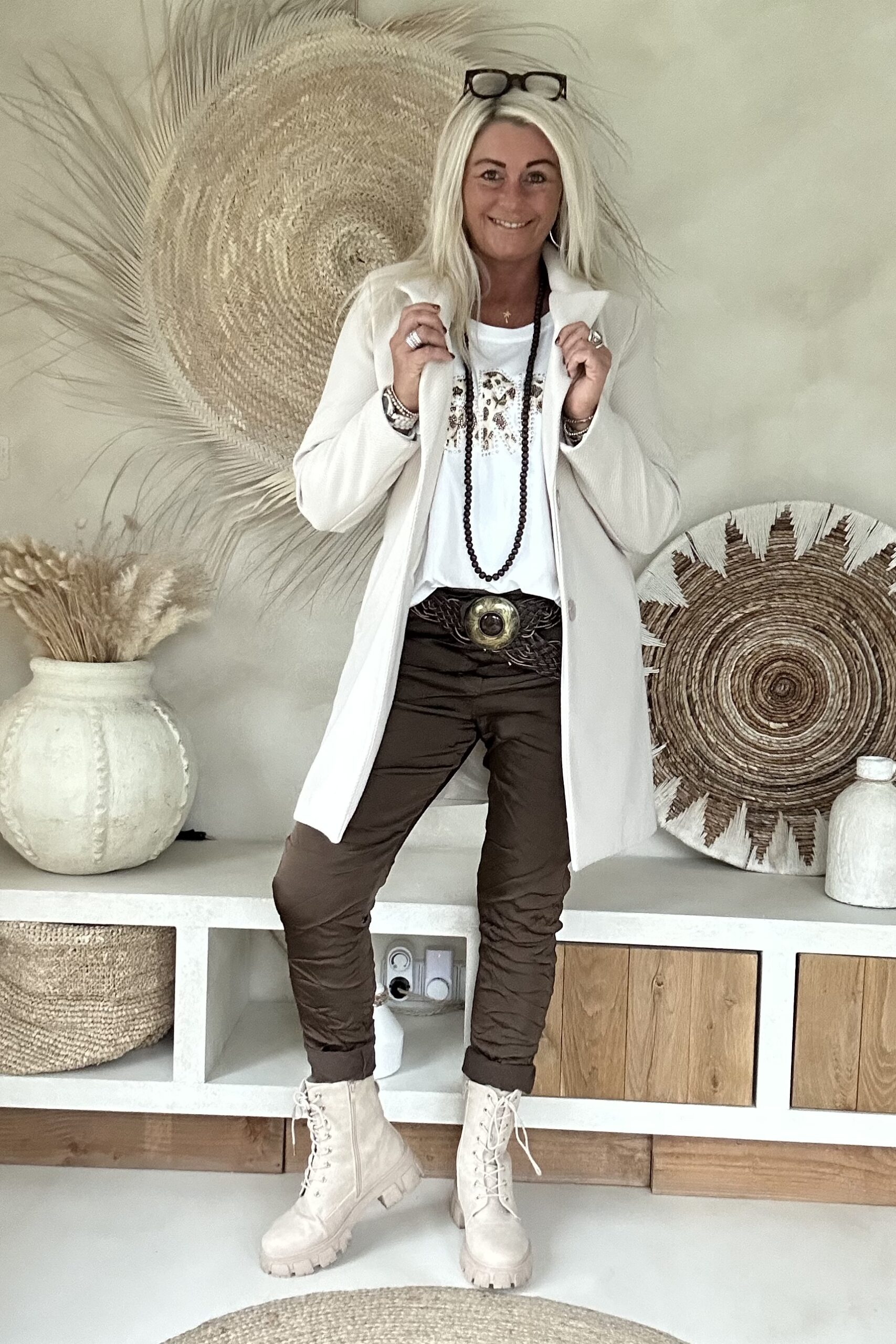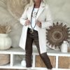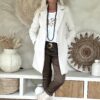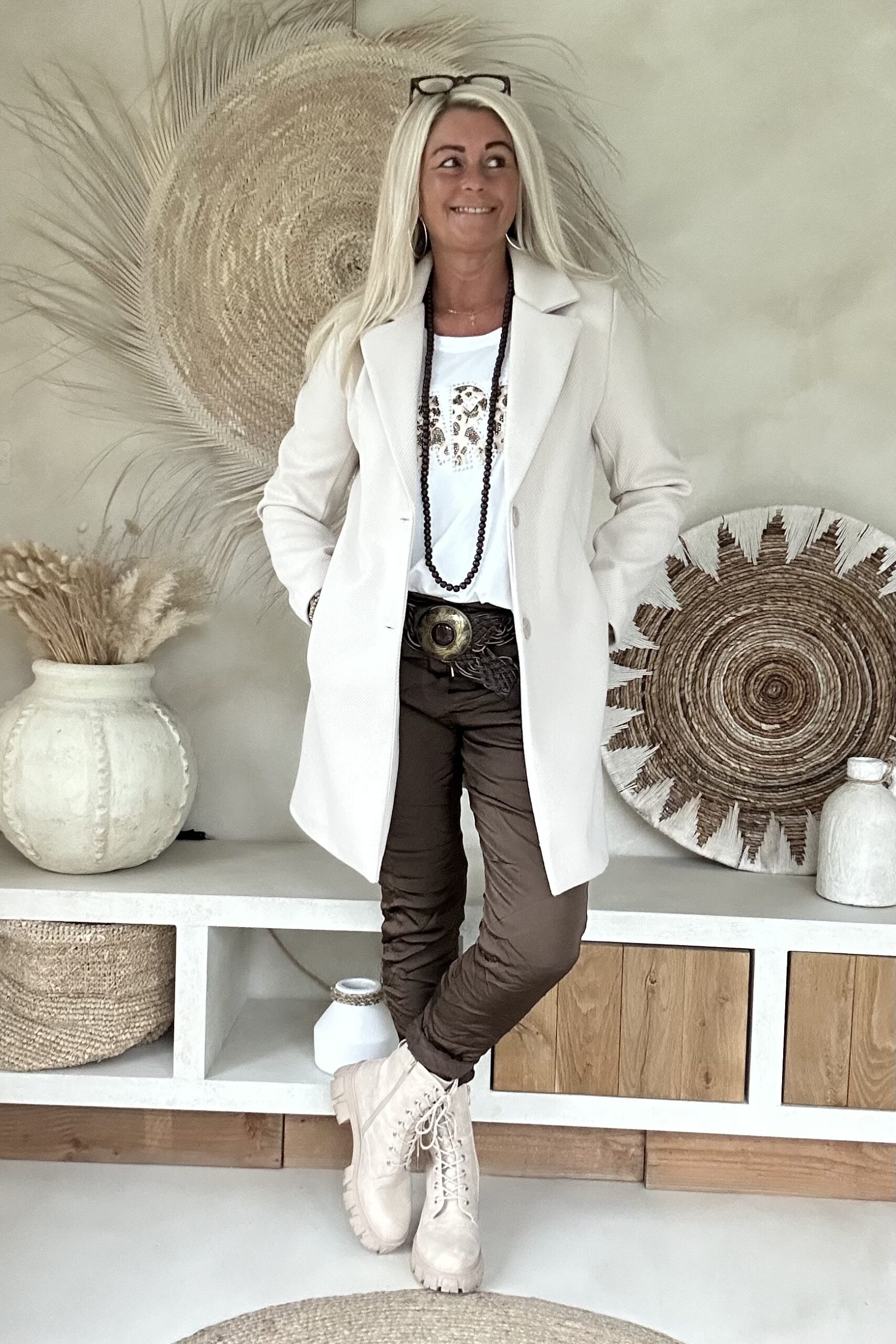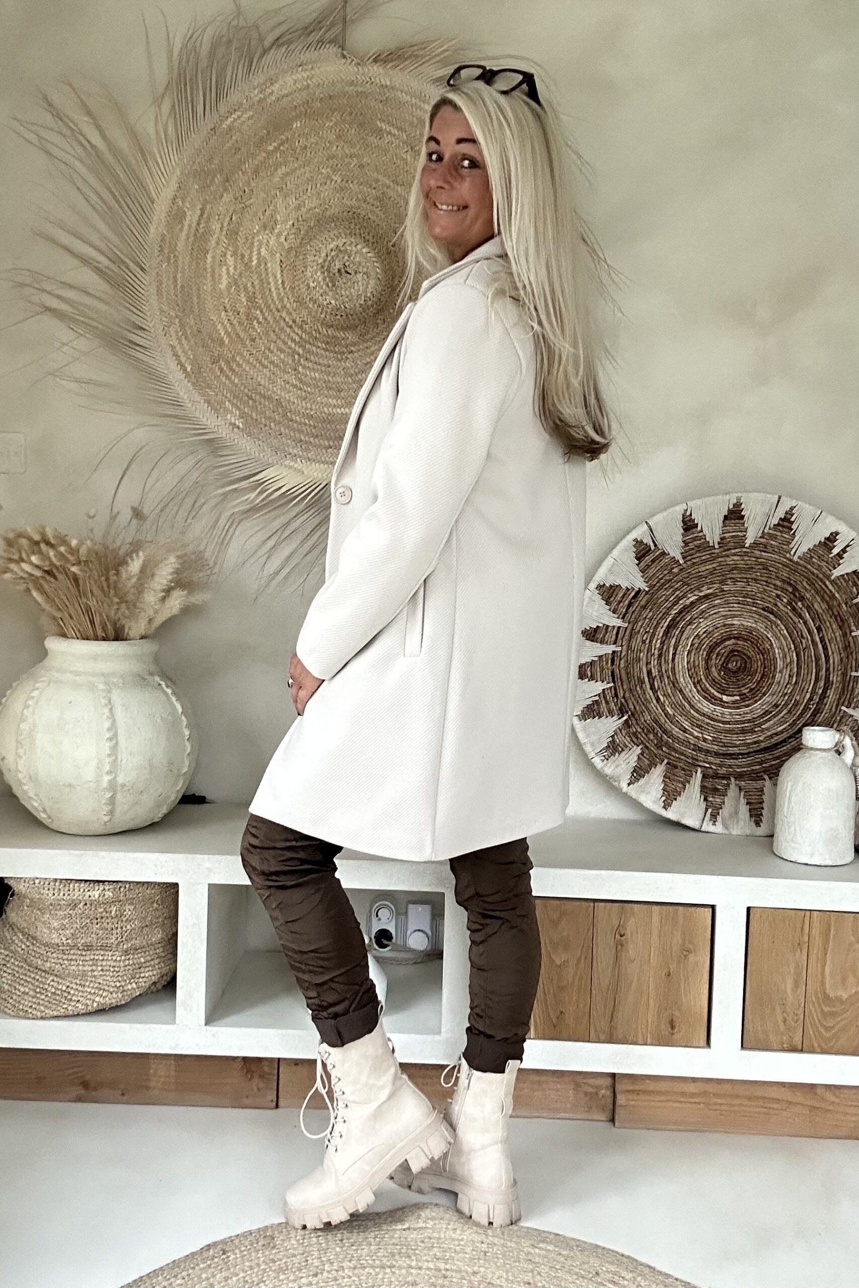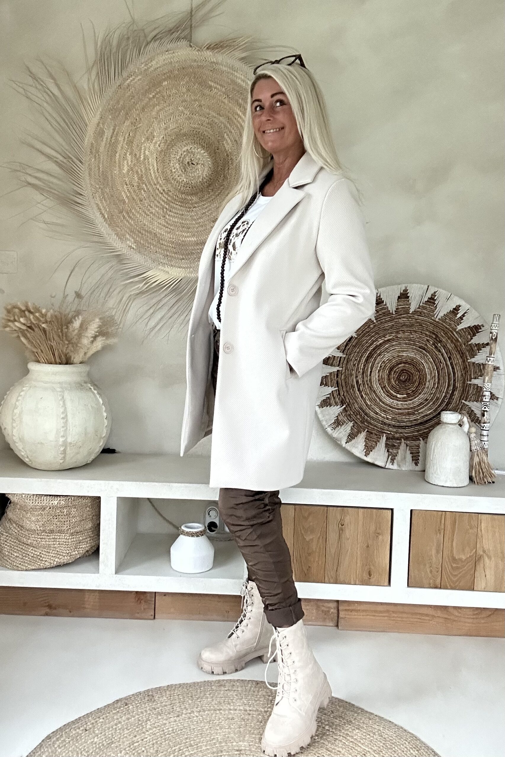 Stijlvol colbert met een subtiele diagonale structuur in de stof die het geheel een chique, luxe uitstraling geeft. Dit model heeft een licht getailleerde snit, waardoor het mooi aansluit zonder strak te zitten. De jas is volledig gevoerd met een dunne voeringstof en sluit met twee knopen aan de voorzijde. Dankzij de elegante pasvorm en het tijdloze design is dit colbert een echte allrounder: draag het casual met een jeans en sneakers, of combineer het met een blouse en laarsjes voor een geklede look. Ook ideaal als lichte tussenjas in het voorjaar of najaar. Verkrijgbaar in ecru, bruin en zwart – drie kleuren die moeiteloos te combineren zijn met elke outfit.