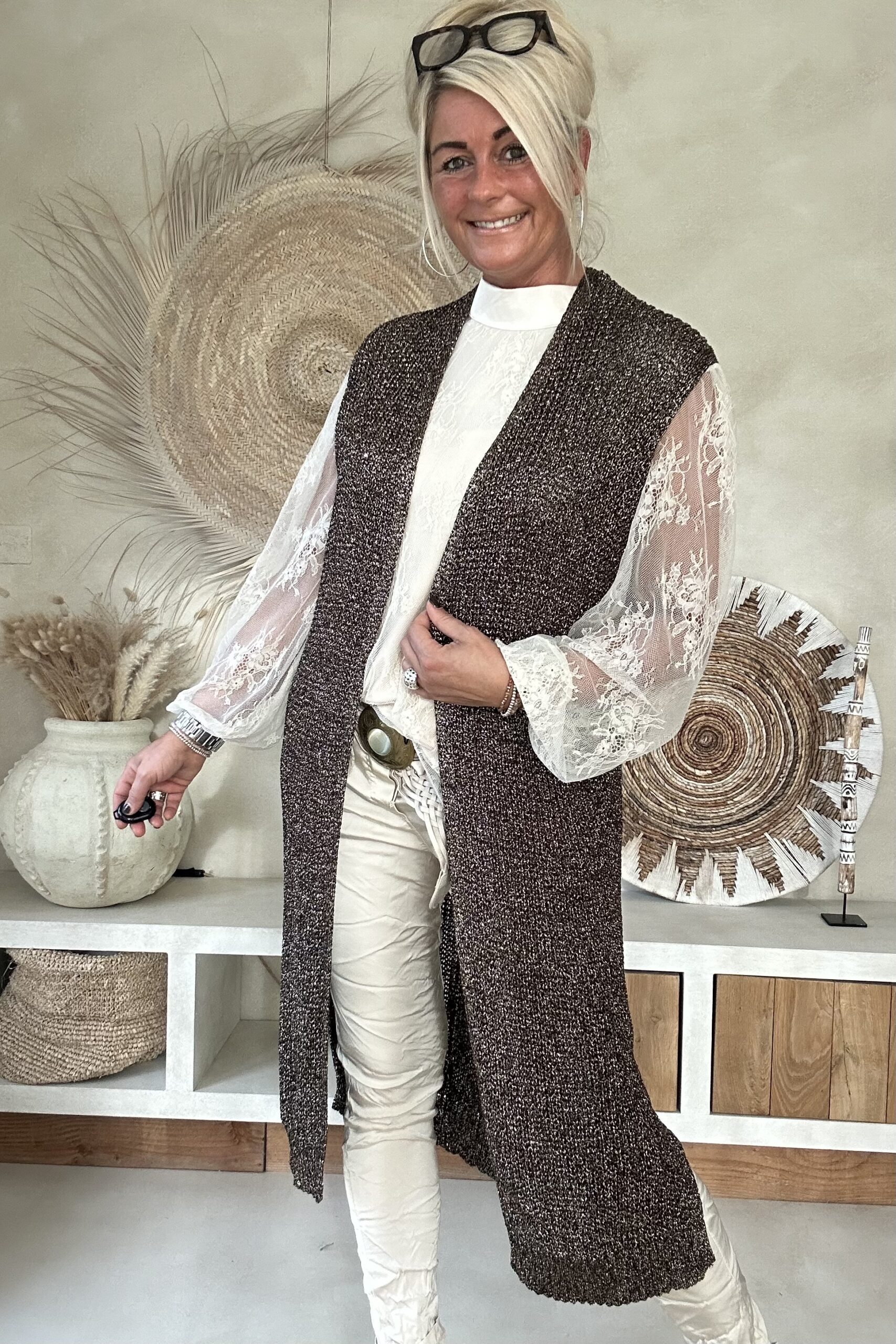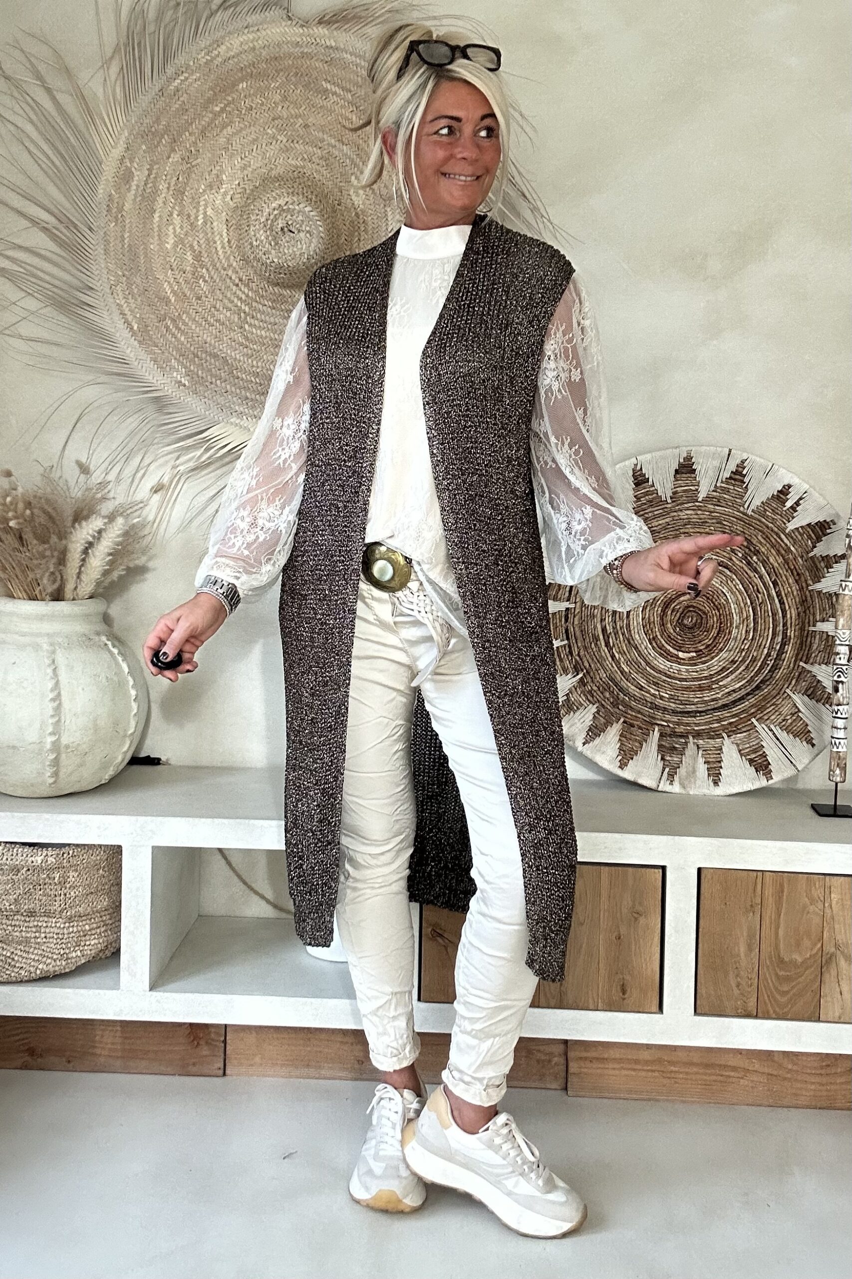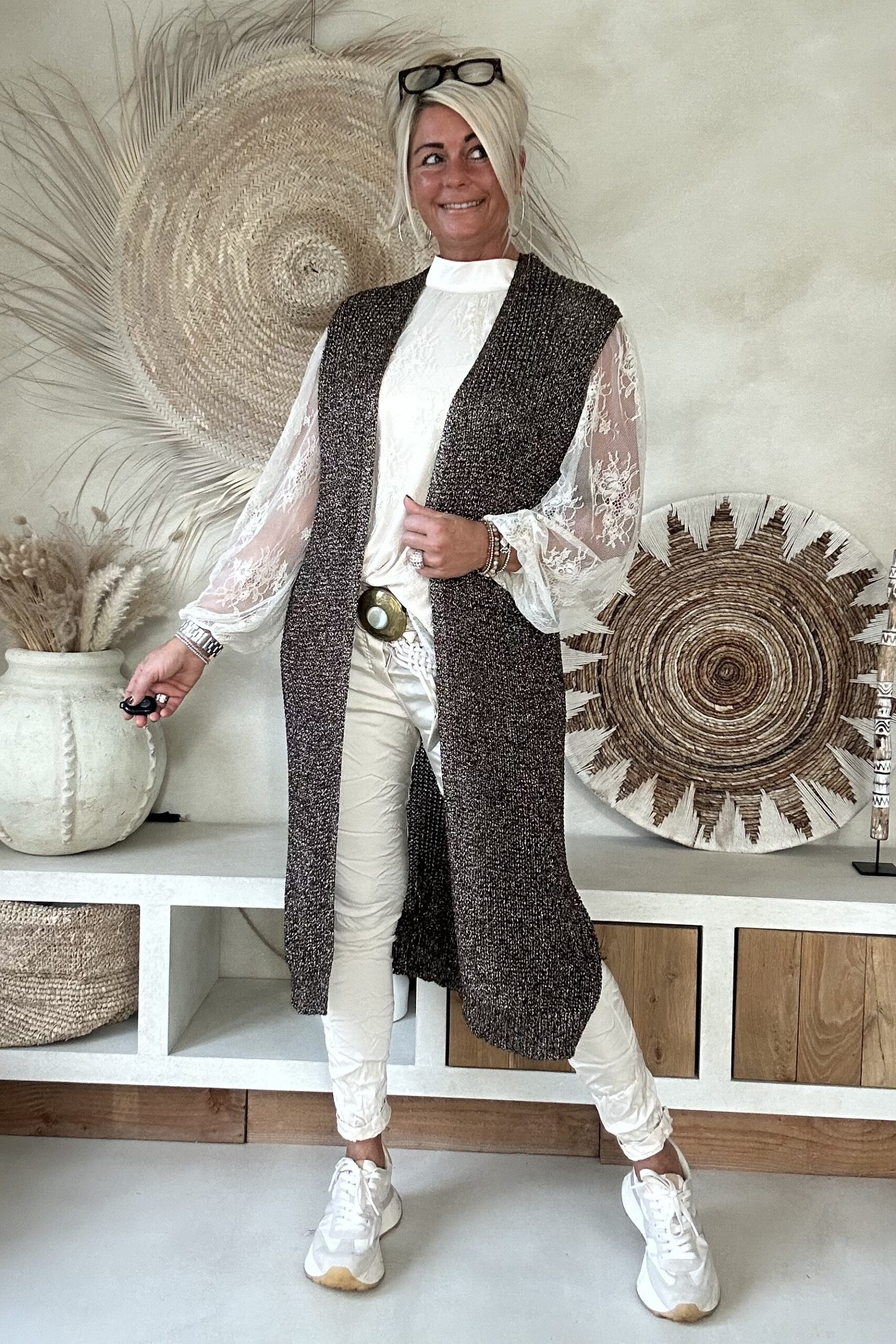 Stijlvol gebreid mouwloos vest met subtiele lurex accenten. Het lange, openvallende model geeft elke outfit een chique en nonchalante touch. One size, passend t/m maat 44. Prachtig te combineren met een lichte broek voor een elegante, feestelijke look, of juist met warme bruintinten of een stoere jeans voor een stijlvolle party-uitstraling.
