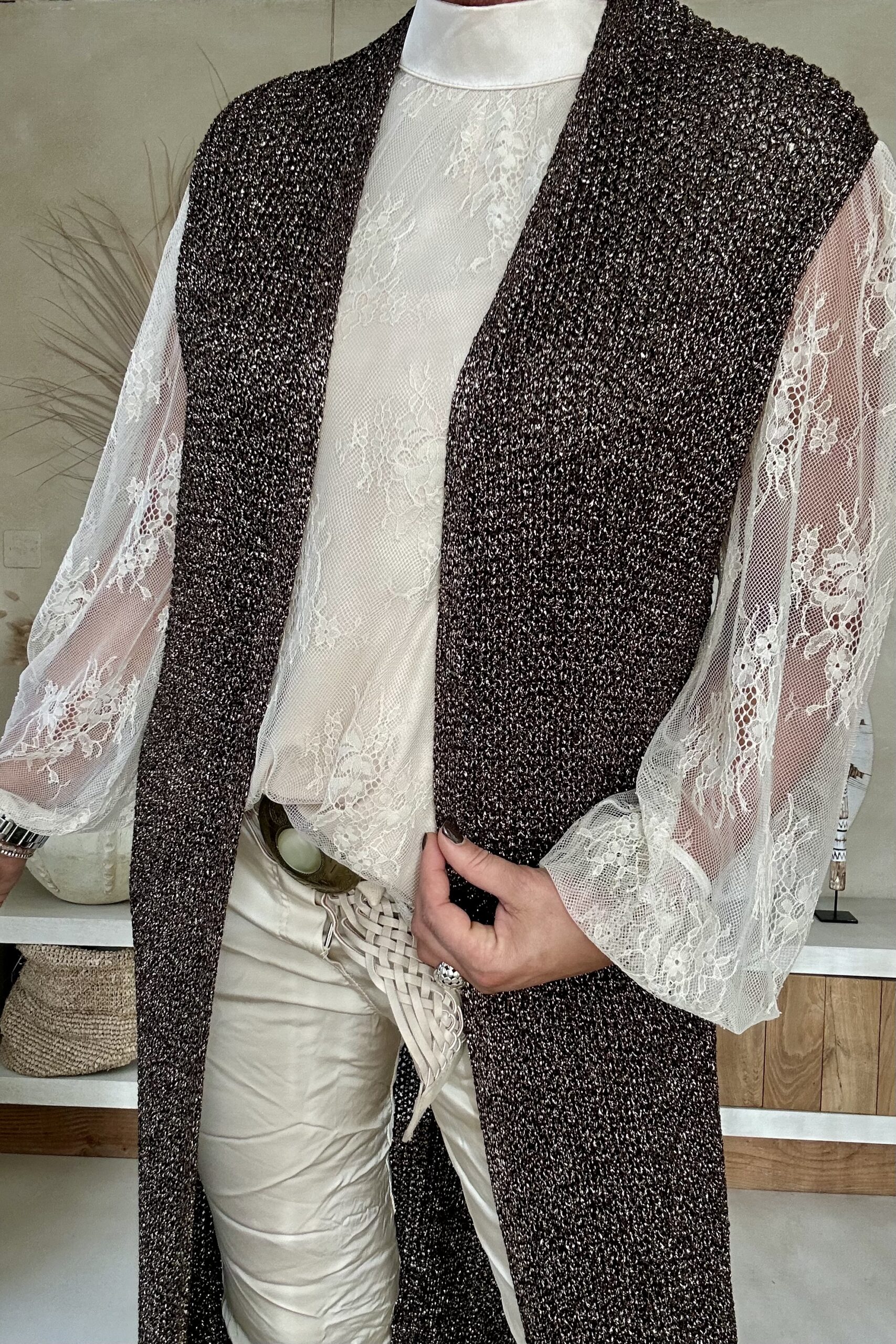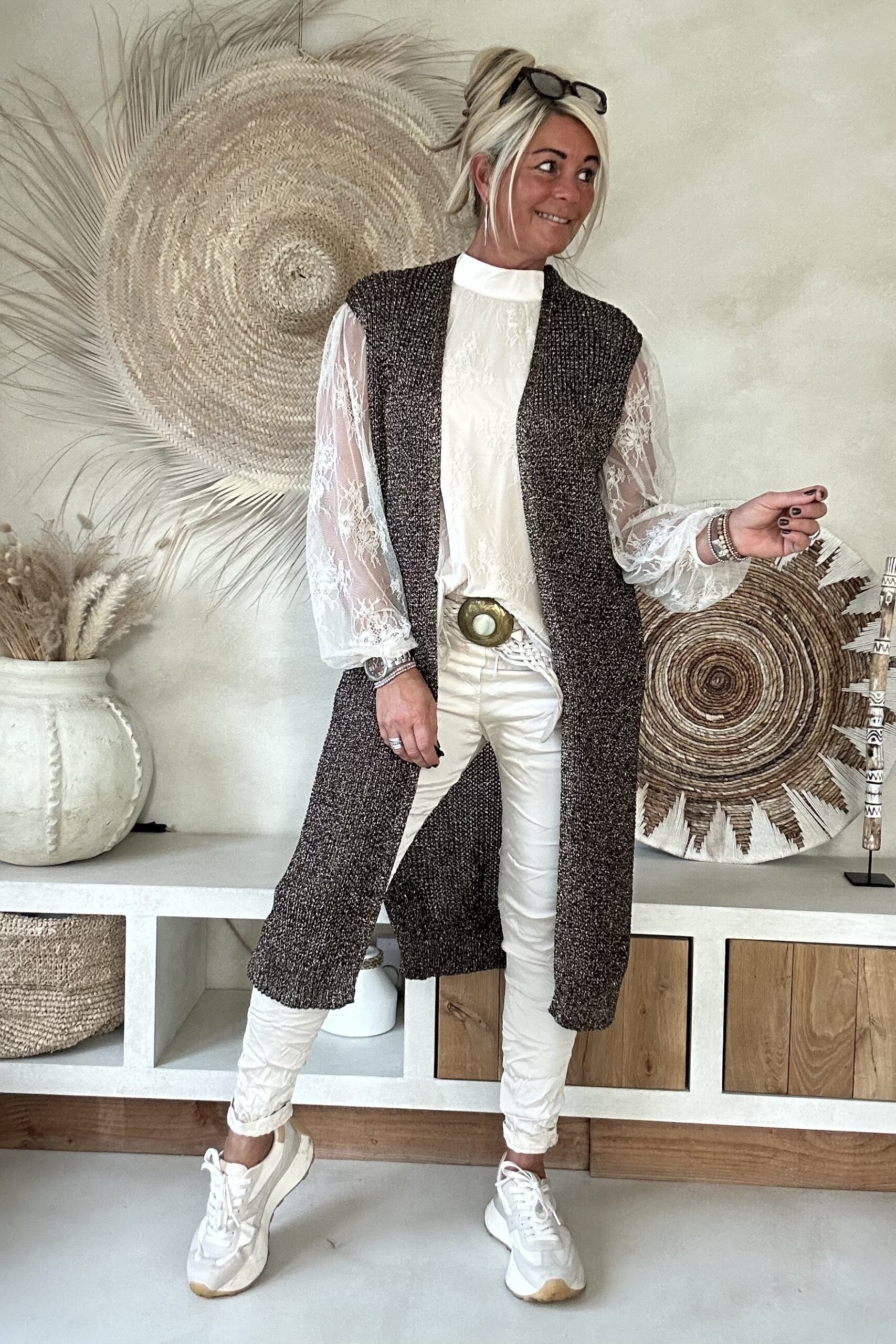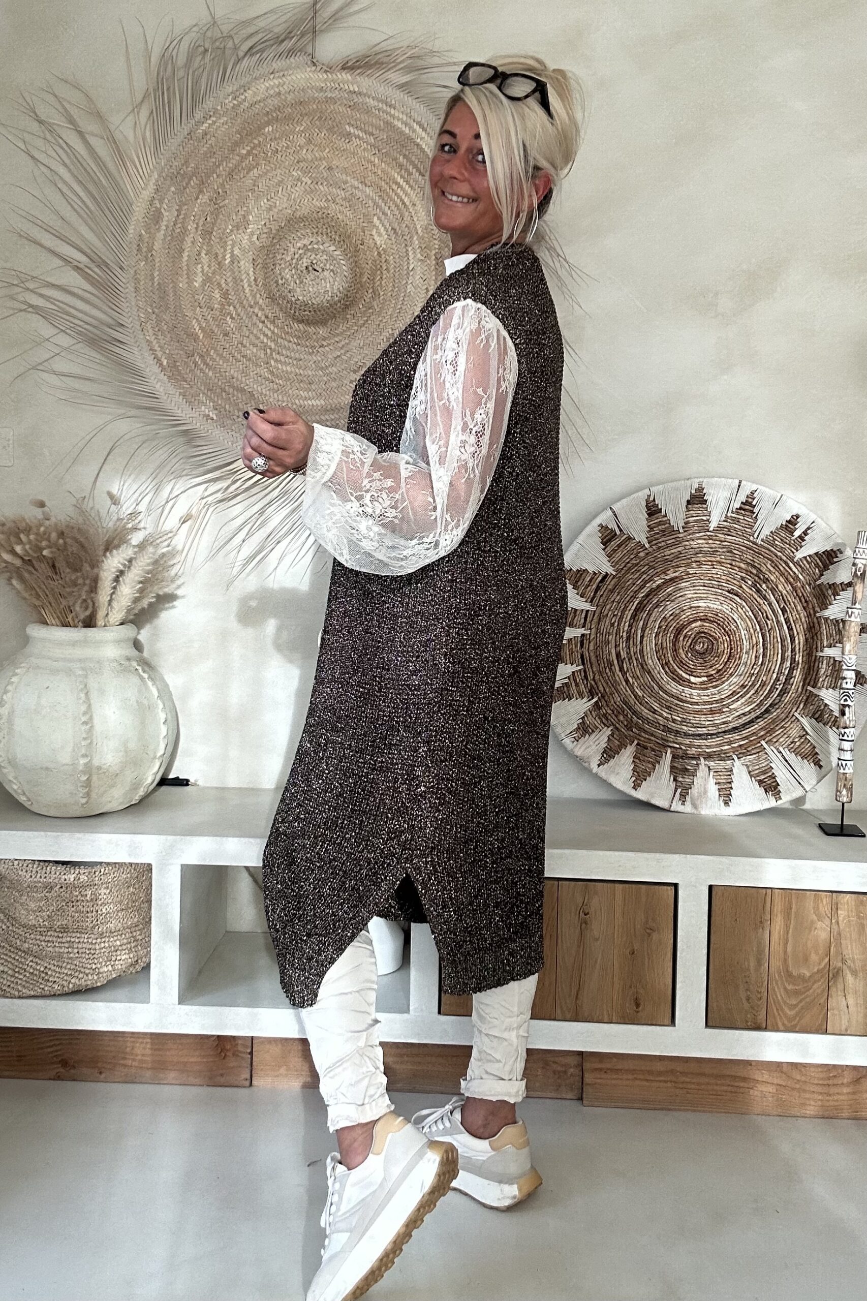 Stijlvol gebreid mouwloos vest met subtiele lurex accenten. Het lange, openvallende model geeft elke outfit een chique en nonchalante touch. One size, passend t/m maat 44. Prachtig te combineren met een lichte broek voor een elegante, feestelijke look, of juist met warme bruintinten of een stoere jeans voor een stijlvolle party-uitstraling.