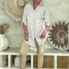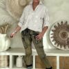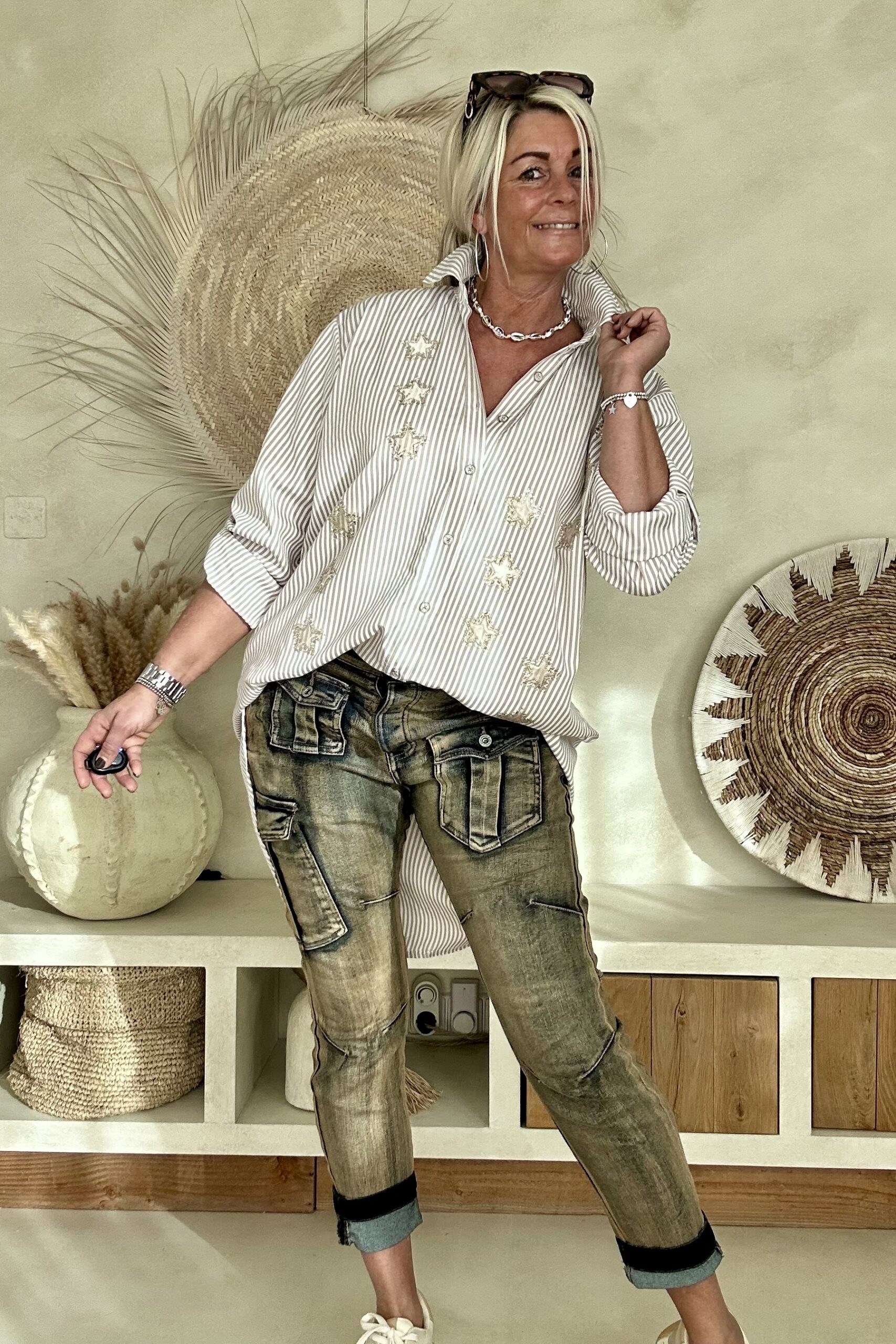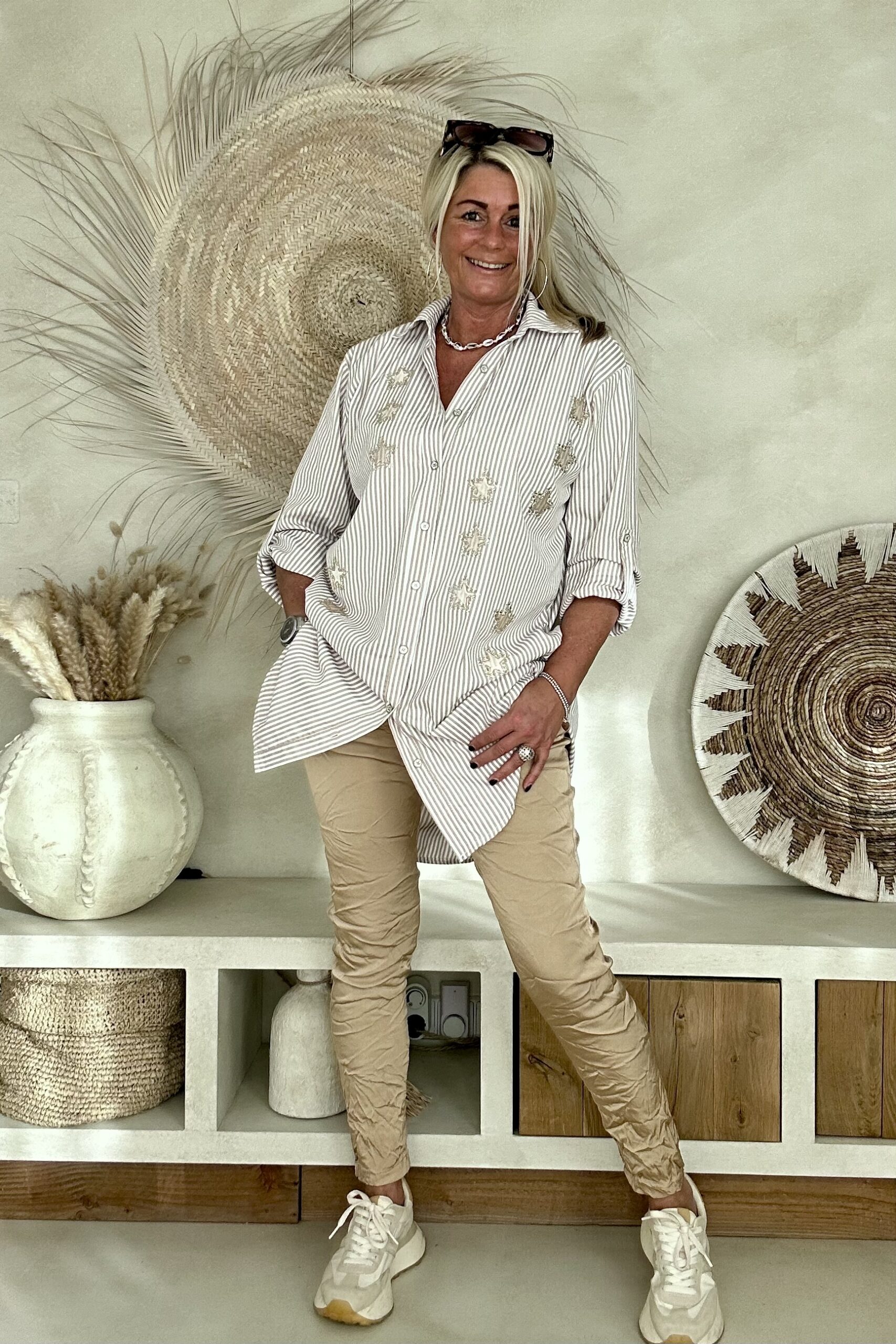 Deze oversized overhemd blouse met stars and stripes dessin in zand met wit is een echte eyecatcher. Het oversized model draagt comfortabel en geeft een nonchalante uitstraling. Leuk te combineren met cargo jeans Jelka of met de jogpant satijn glans Charlie in champagne voor een stijlvolle, casual look.