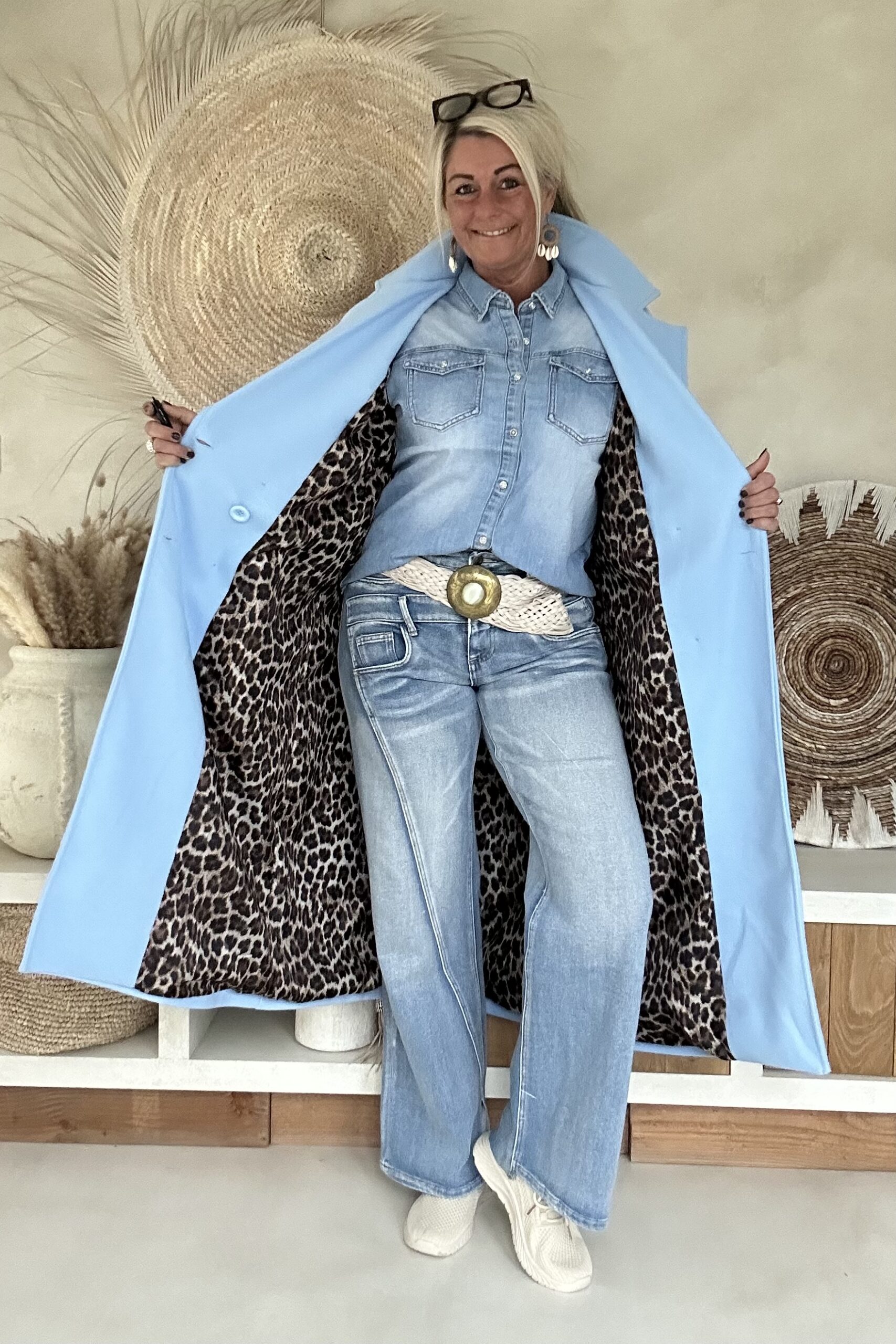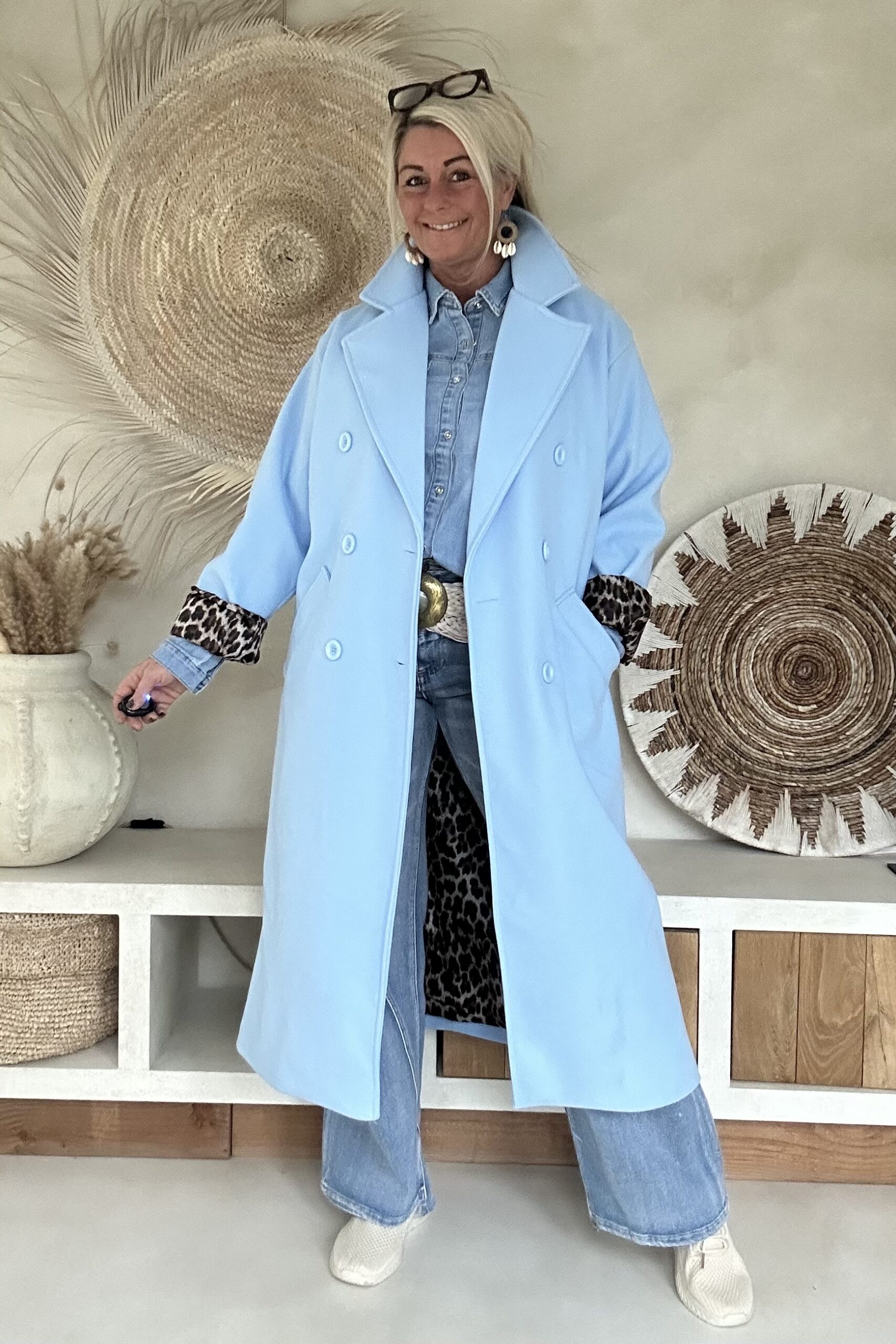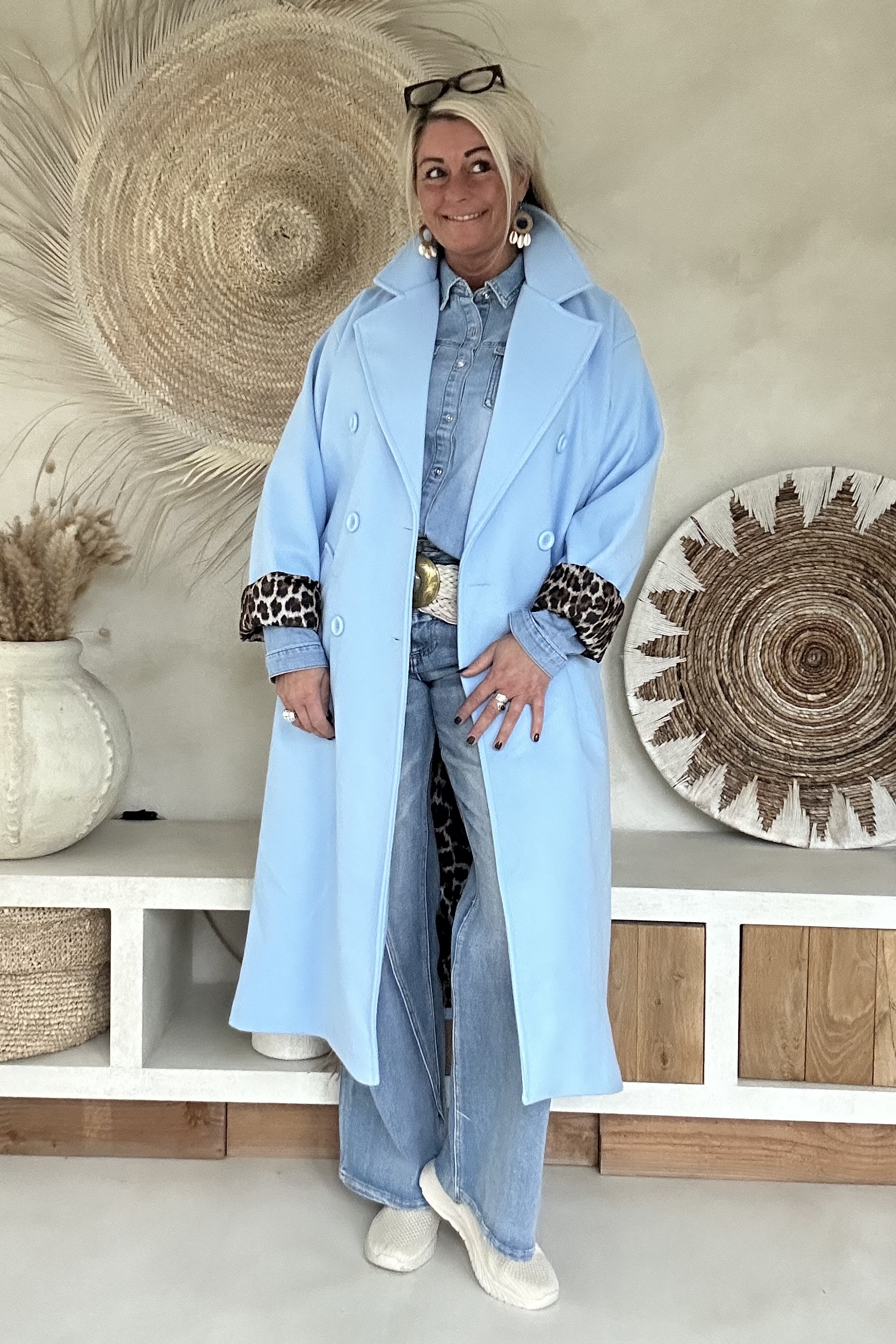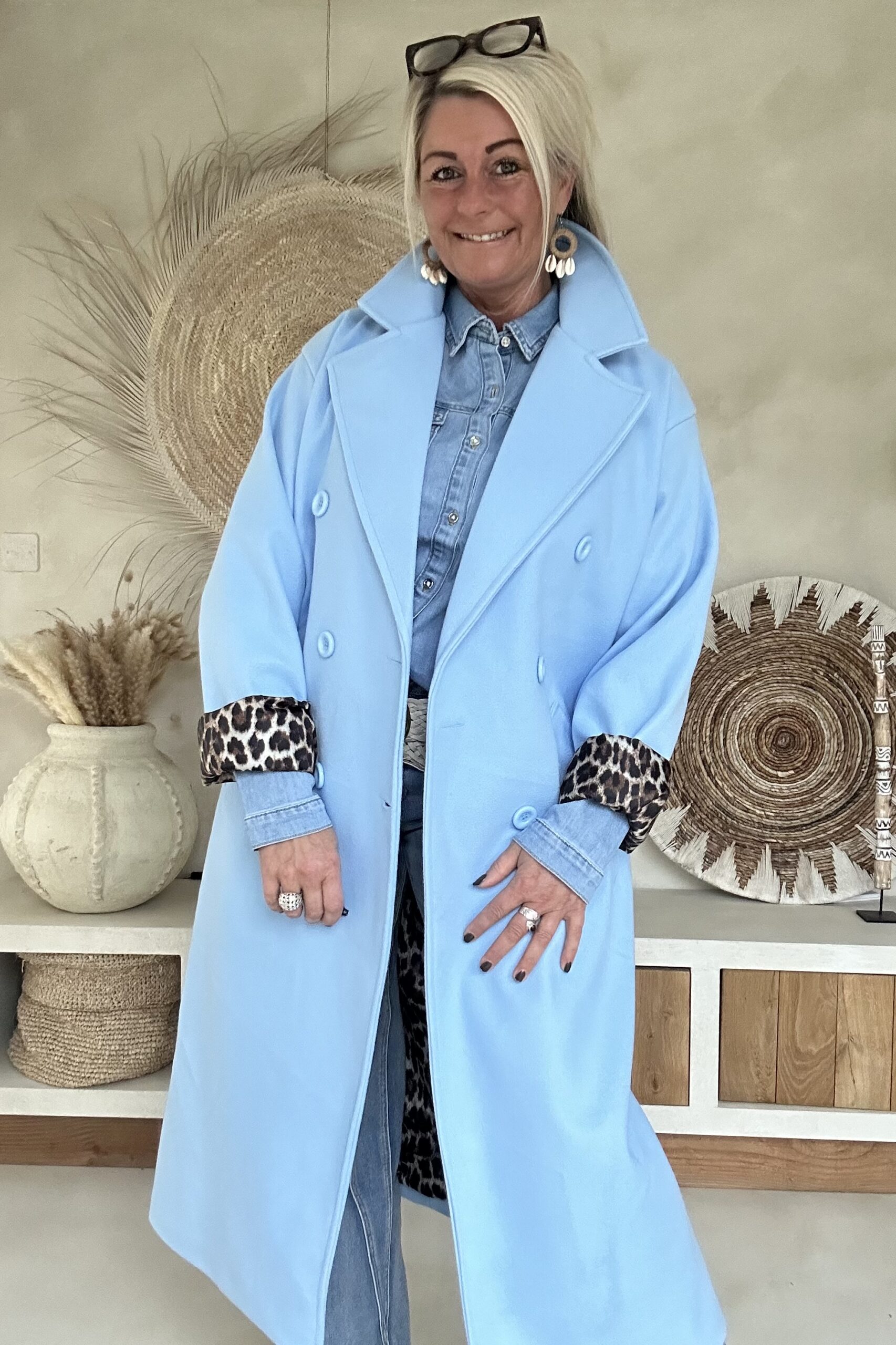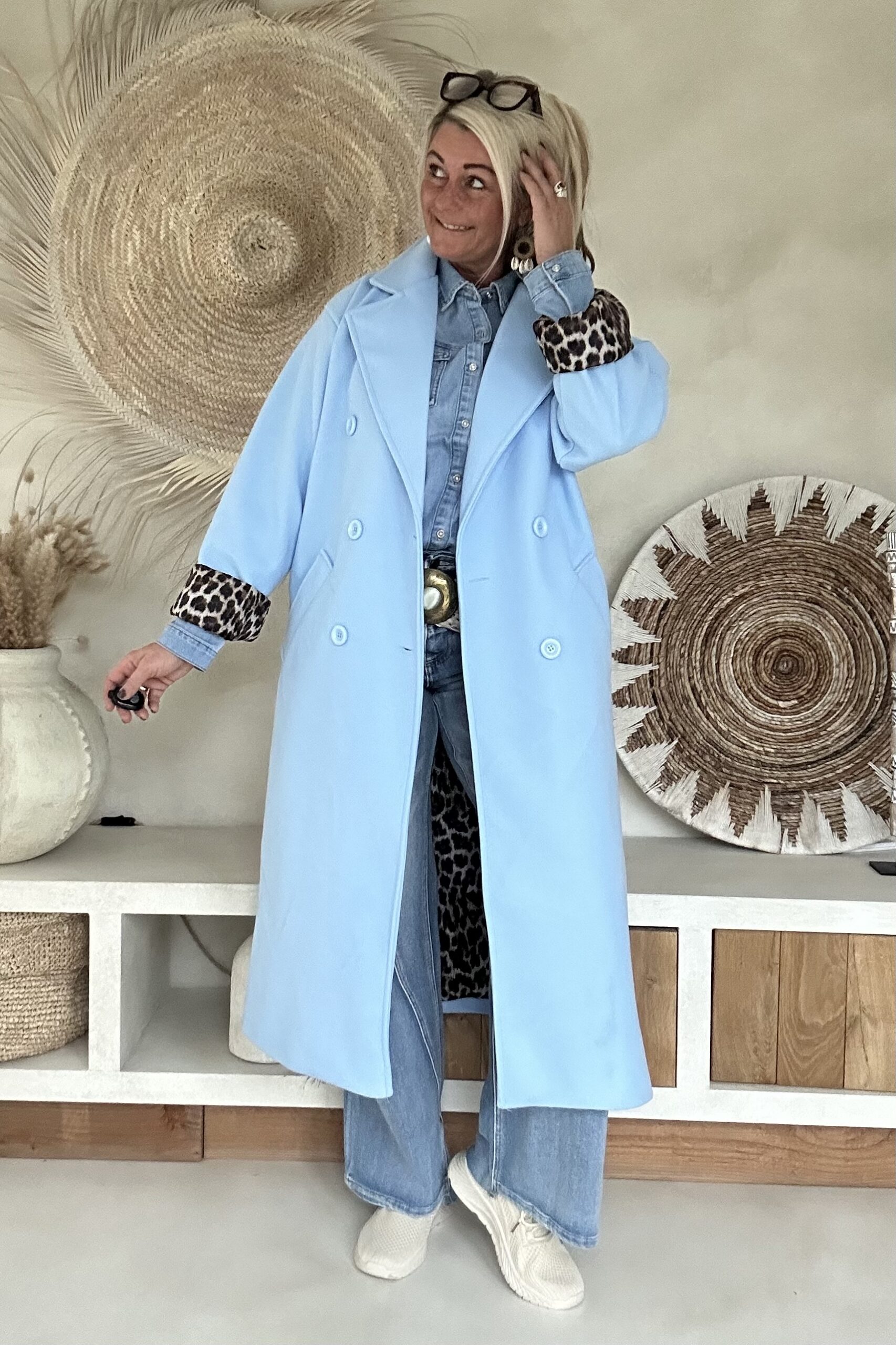 Deze te gekke oversized trenchcoat is er eentje die je outfit in één keer afmaakt. De licht blauwe kleur geeft een rustige maar frisse basis, terwijl de luipaarddetails aan de omslag van de mouwen en de volledige voering zorgen voor een stoere, speelse twist. Door de oversized pasvorm valt de jas mooi nonchalant en is hij perfect om te dragen over zowel casual als meer geklede looks.
