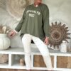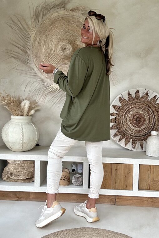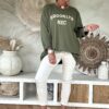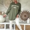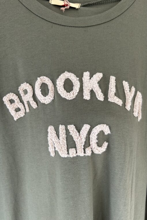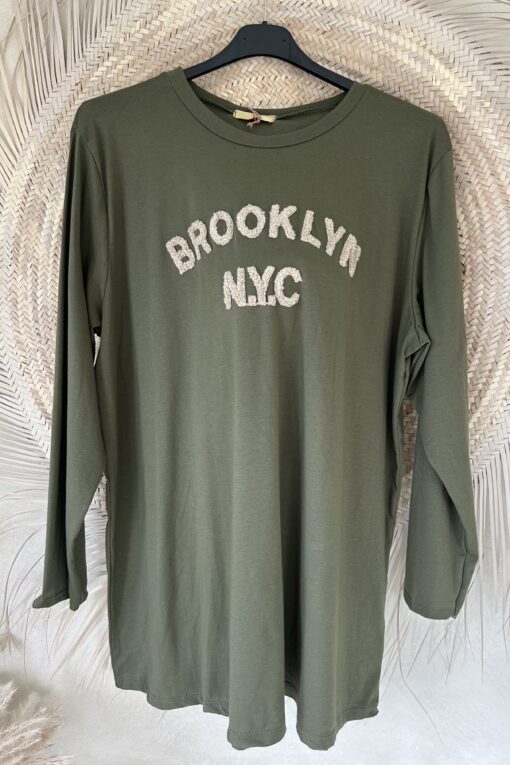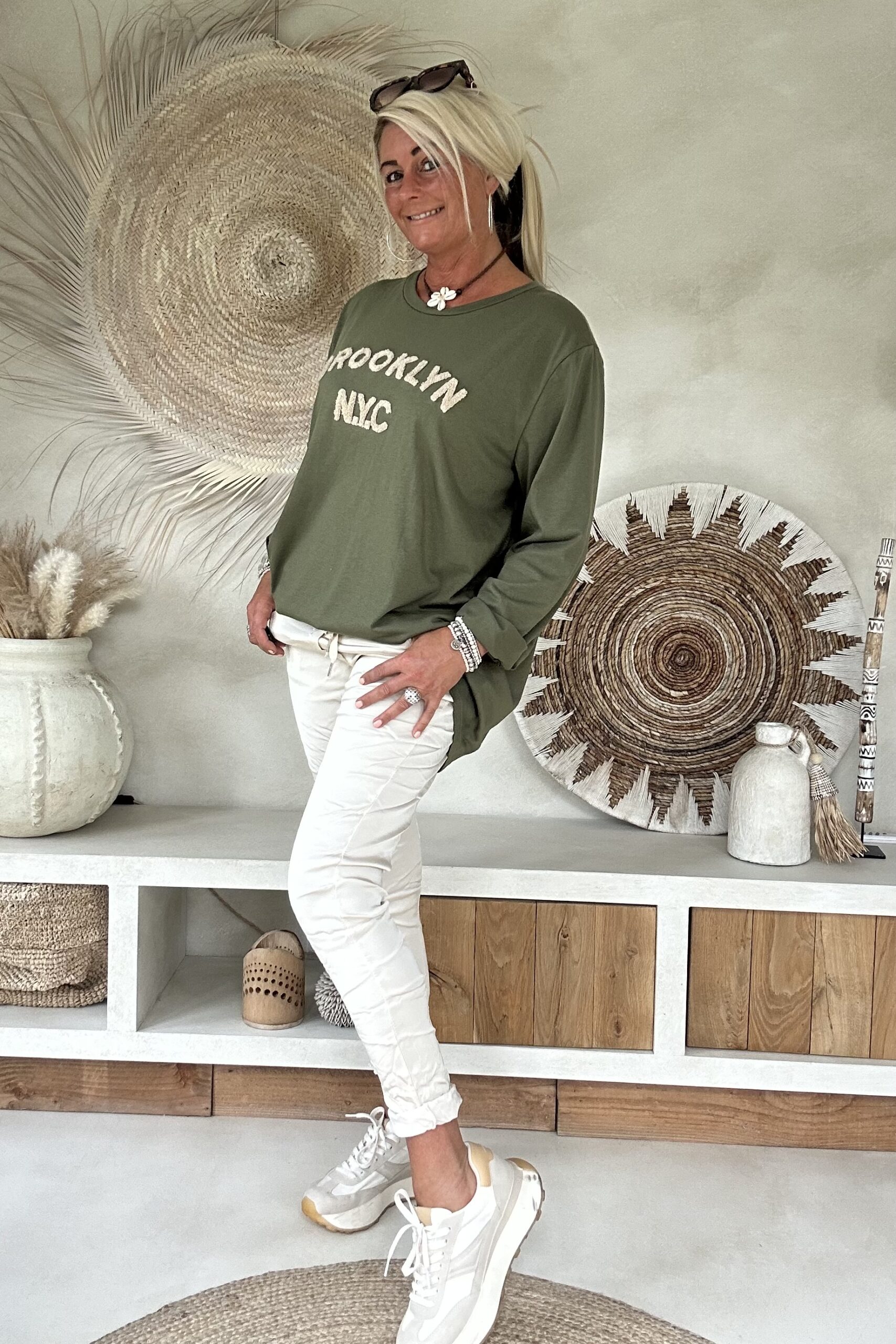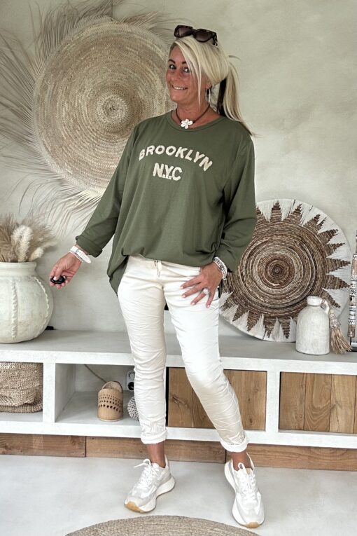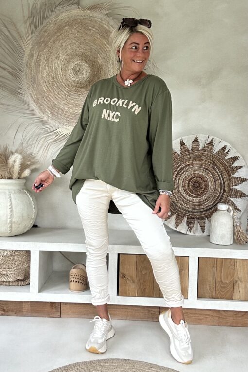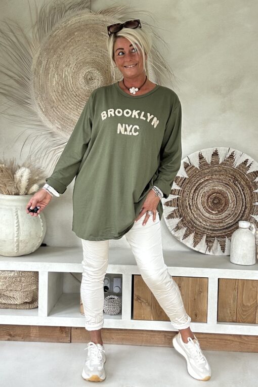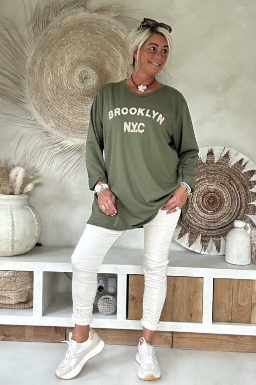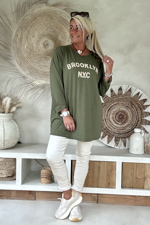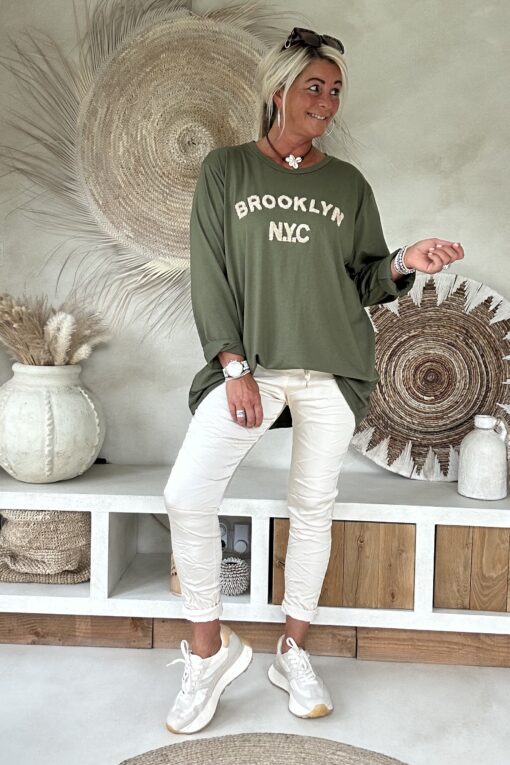 Dit camel oversized tricot shirt is een echte musthave voor een relaxte en stoere look! Het zachte materiaal met stretch maakt hem heerlijk comfortabel en de opdruk “Brooklyn NYC” in badstof geeft een speelse en trendy touch. Leuk om te combineren met een jeans of een coated broek, maar ook perfect onder een jasje of vest.
