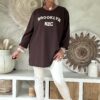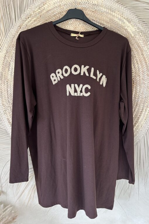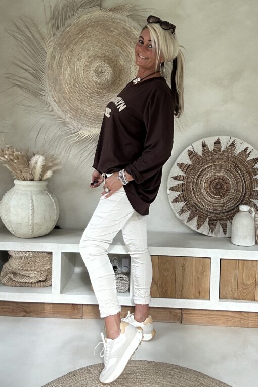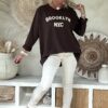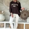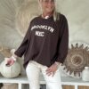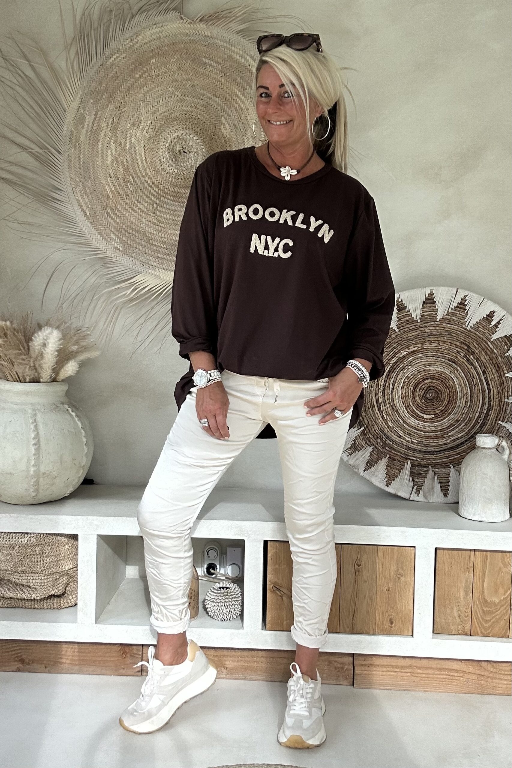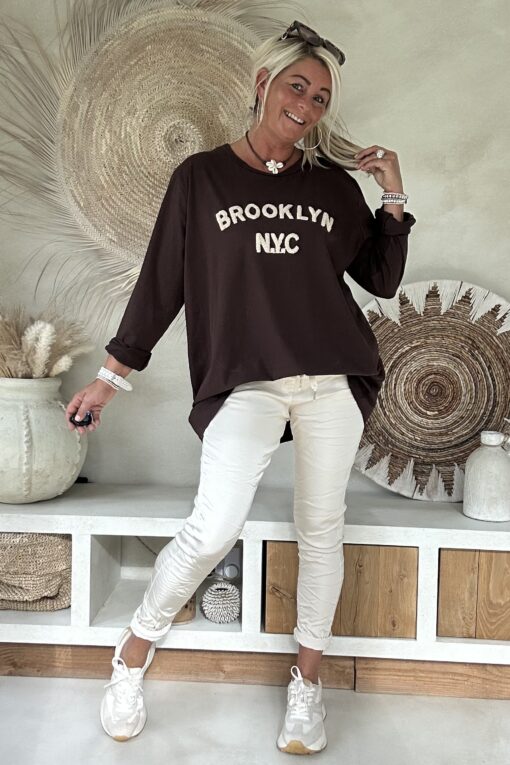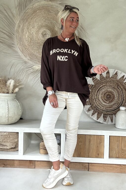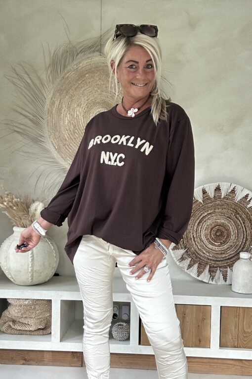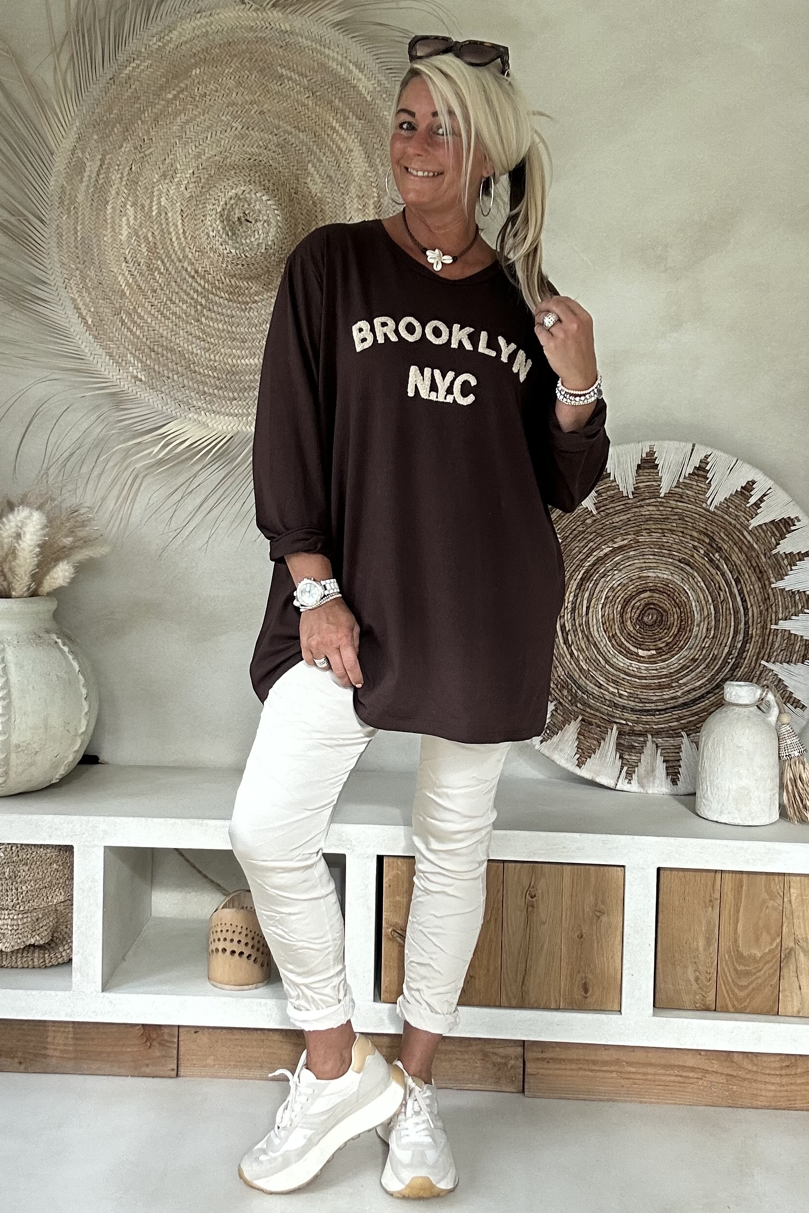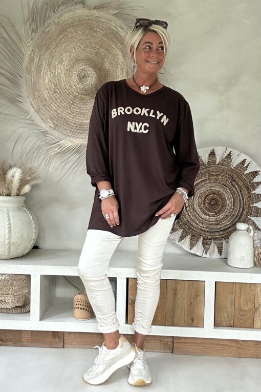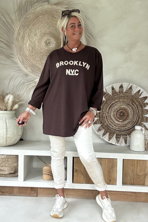 Dit camel oversized tricot shirt is een echte musthave voor een relaxte en stoere look! Het zachte materiaal met stretch maakt hem heerlijk comfortabel en de opdruk “Brooklyn NYC” in badstof geeft een speelse en trendy touch. Leuk om te combineren met een jeans of een coated broek, maar ook perfect onder een jasje of vest.