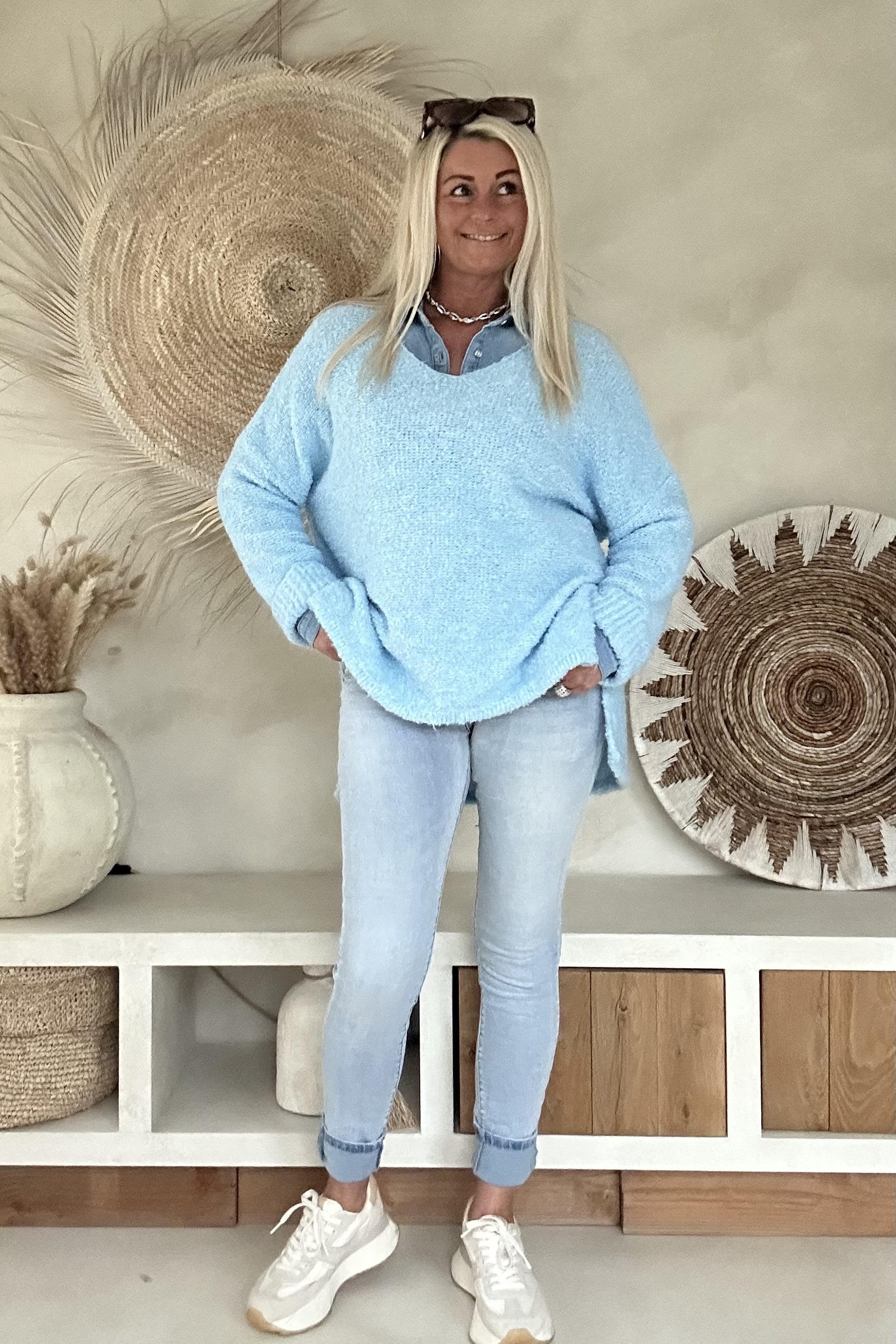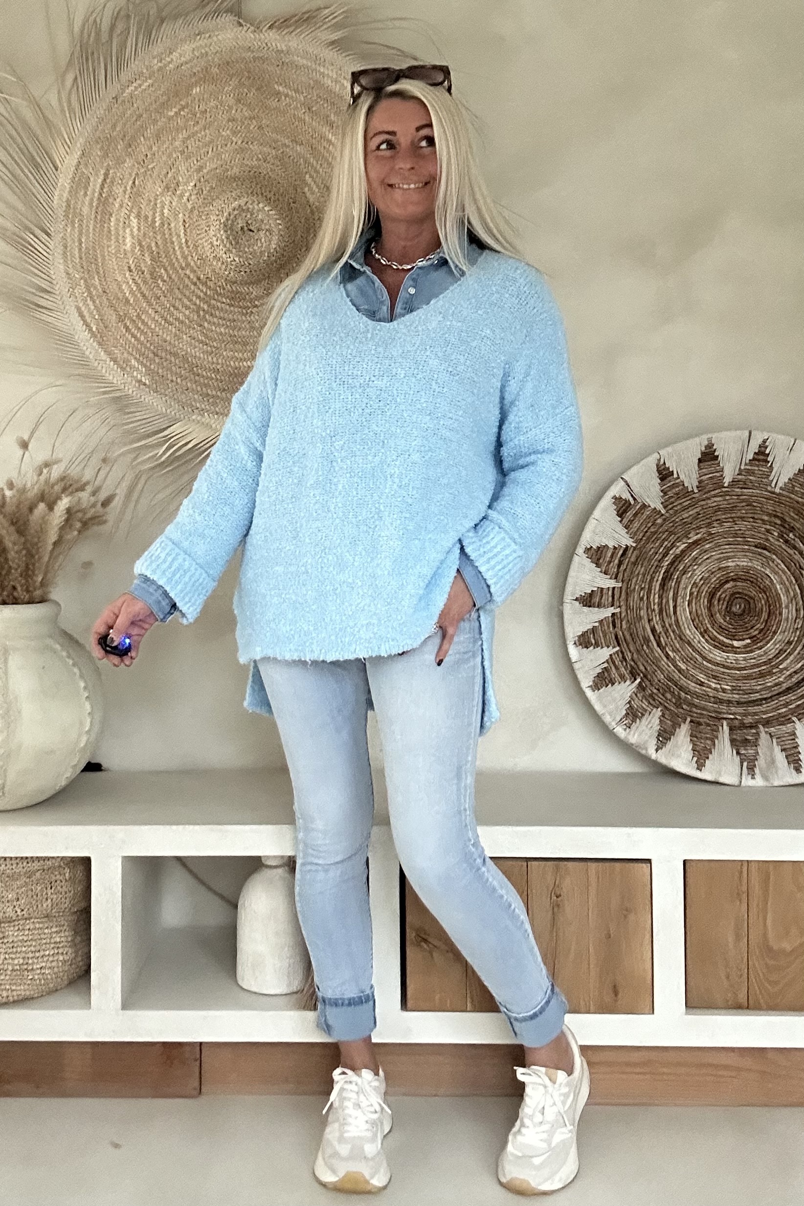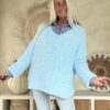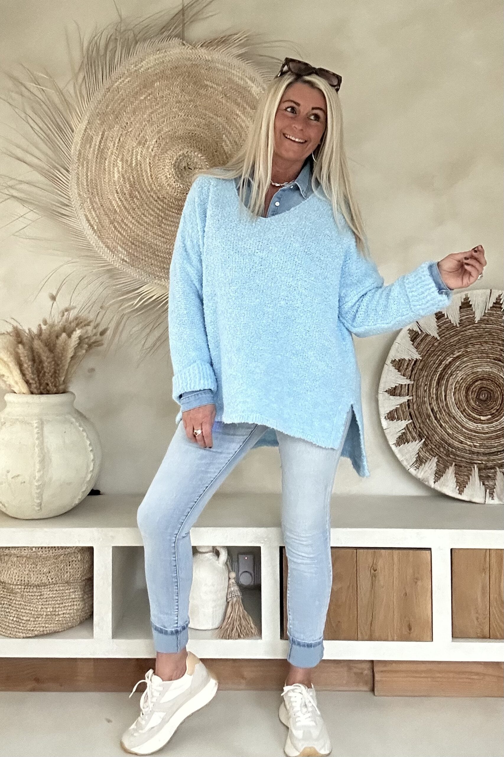 Deze comfortabele trui is uitgevoerd in een zachte, luchtig gebreide kwaliteit en valt mooi soepel om het lichaam. De V-hals zorgt voor een vrouwelijke en open uitstraling, terwijl de langere achterkant een speels en modern effect geeft. Door de losse knit en fijne materiaalmix voelt de trui prettig aan en is hij ideaal voor dagelijks gebruik. Een veelzijdig item dat zowel casual als iets gekleder (bijvoorbeeld met blouse eronder) gedragen kan worden.