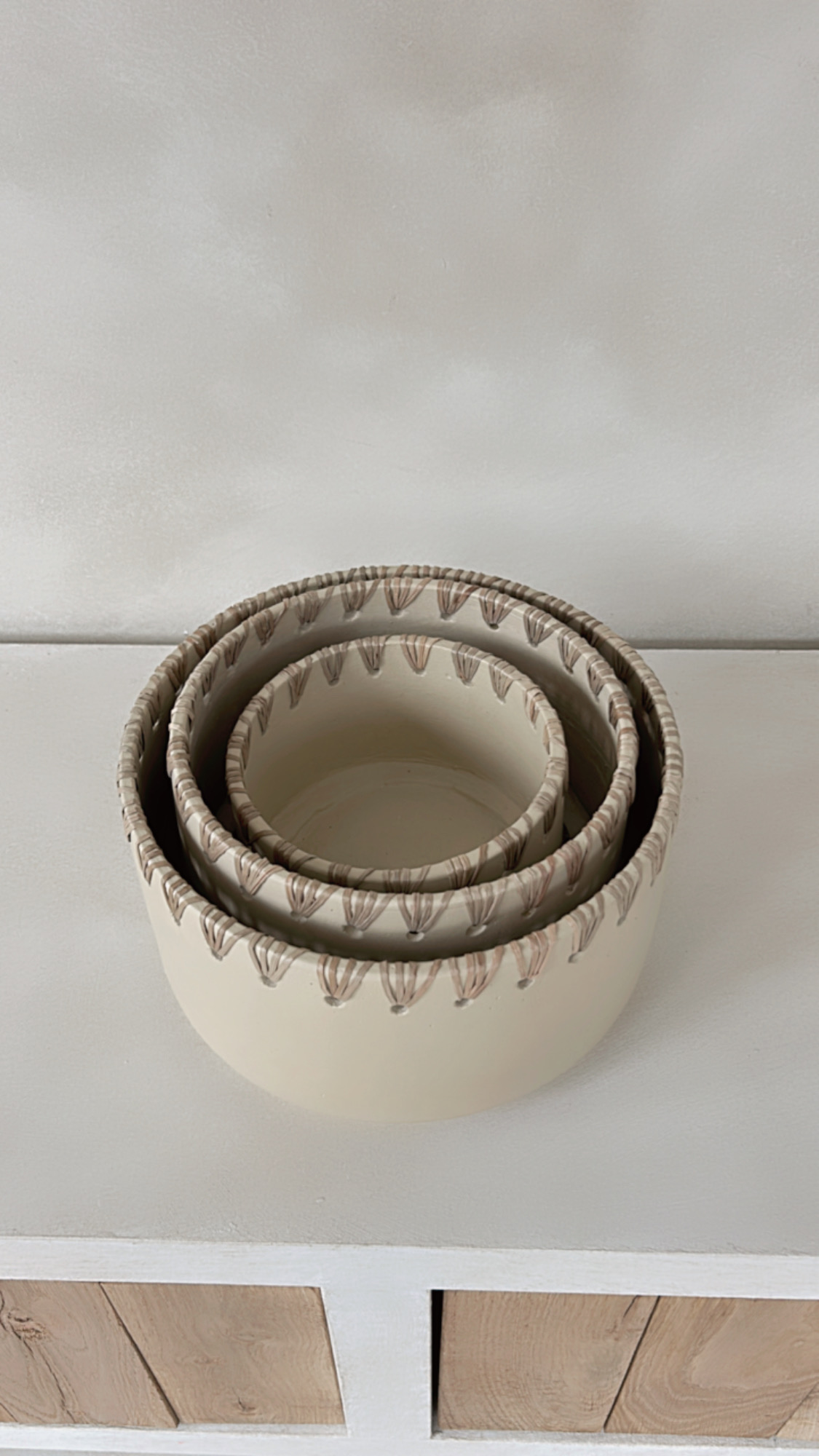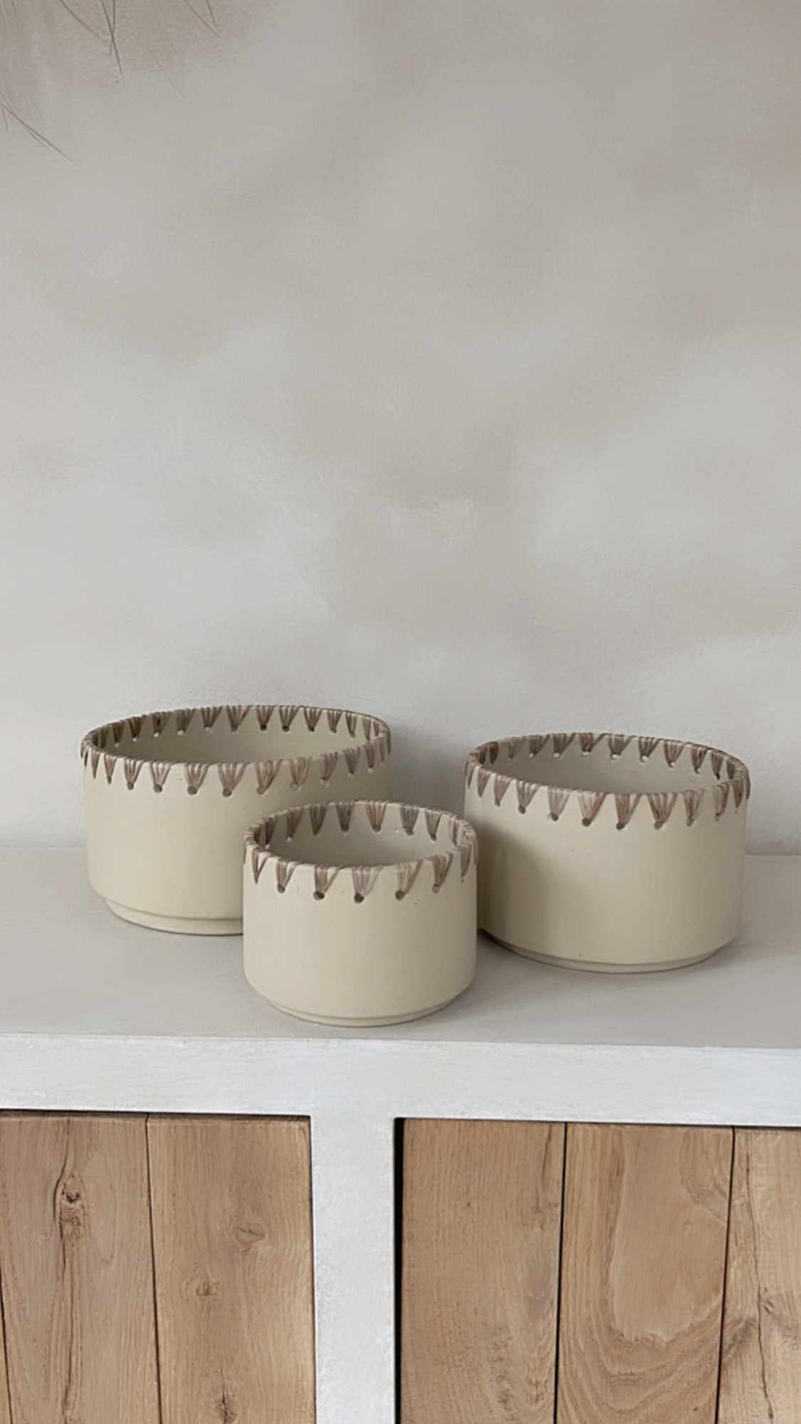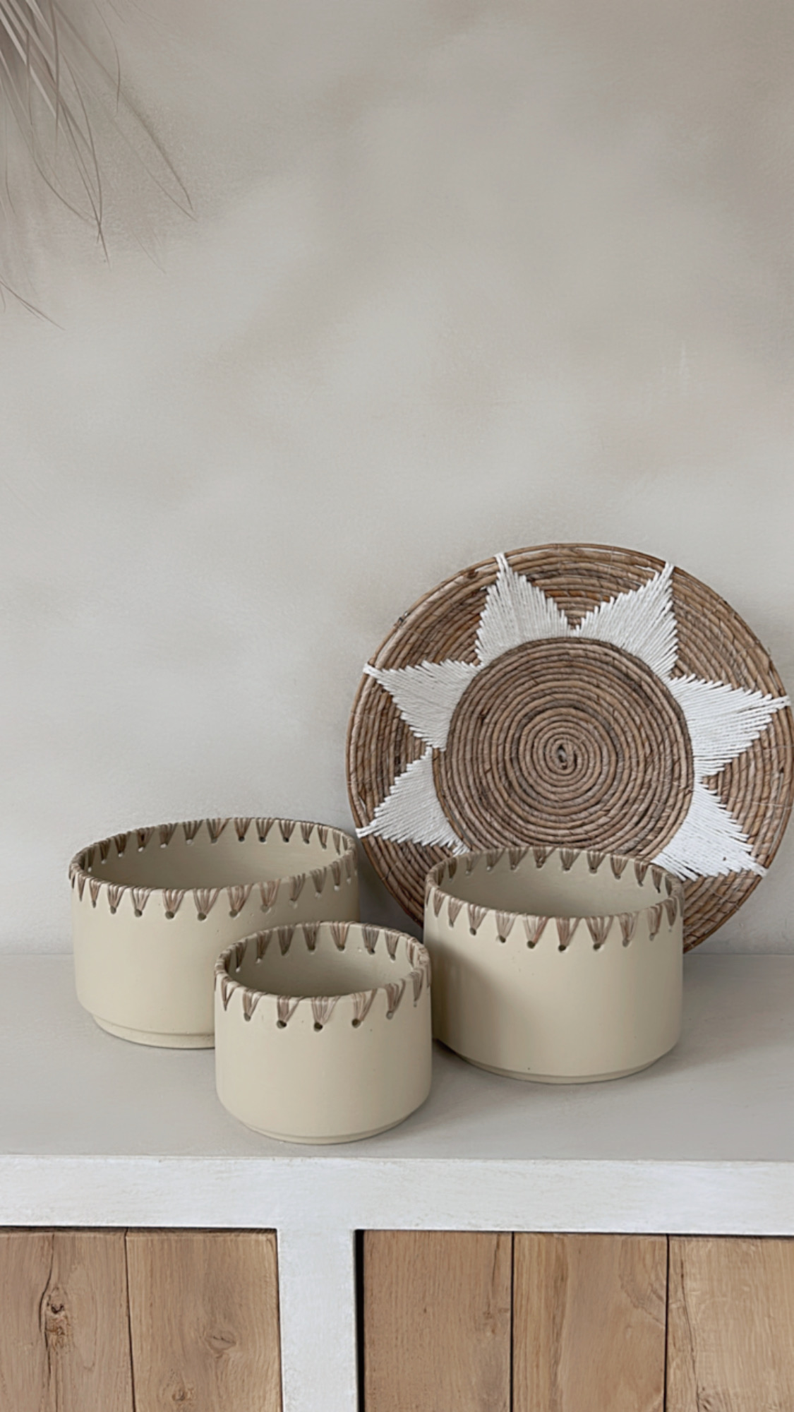 Deze prachtige set van drie plantenpotten combineert eenvoud met een ambachtelijke touch. Elke pot is afgewerkt met een handgevlochten touwrand langs de bovenkant, wat zorgt voor een warme en natuurlijke uitstraling. Mooi met planten, droogbloemen of als decoratief object op een kast of tafel. Dankzij de zandkleurige tinten zijn de potten makkelijk te combineren in elk interieur.