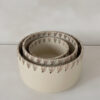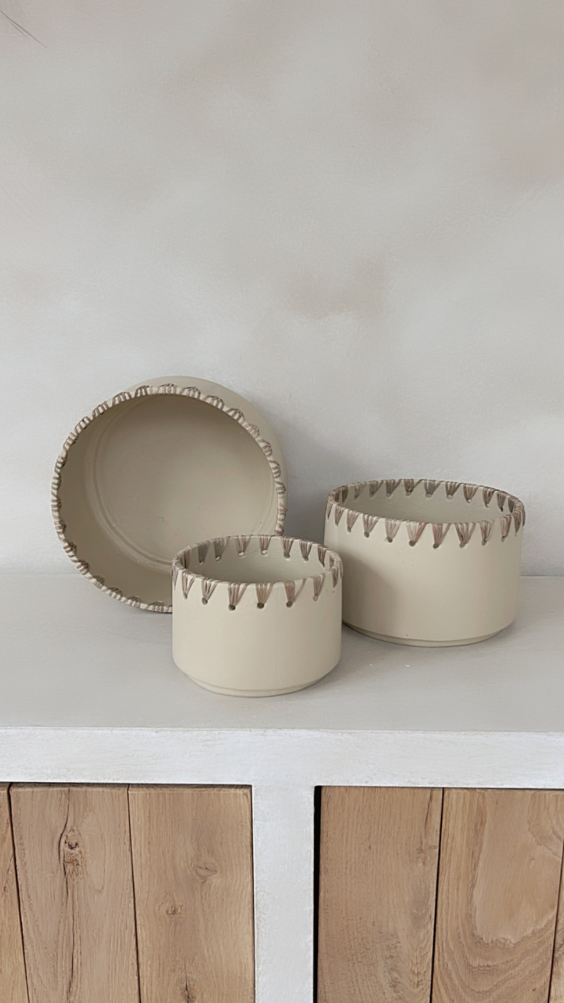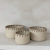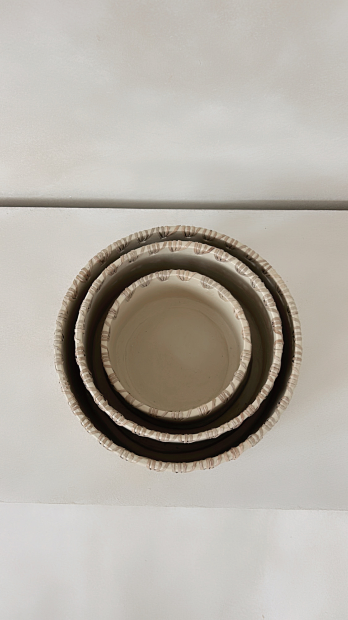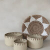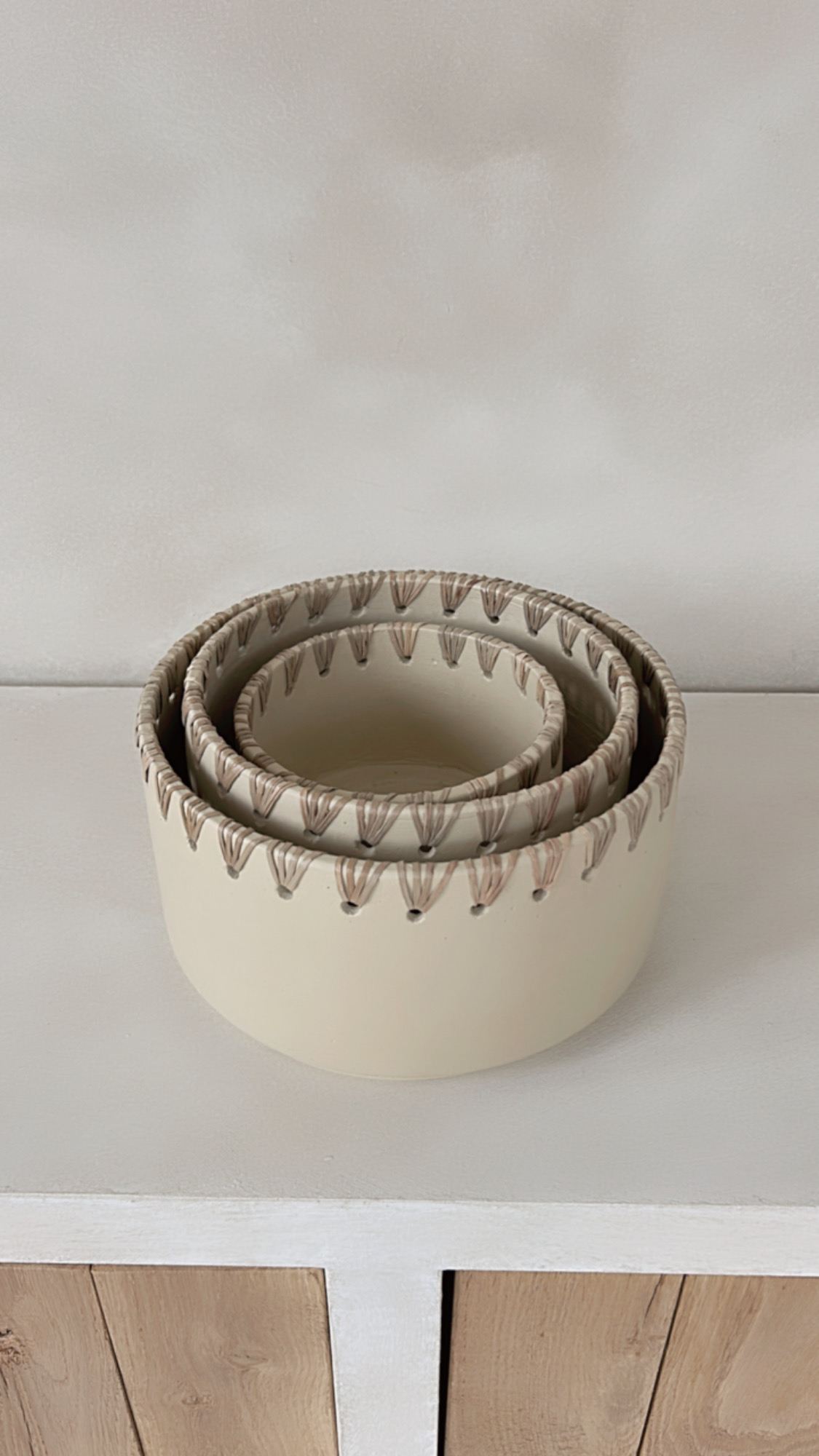 Deze prachtige set van drie plantenpotten combineert eenvoud met een ambachtelijke touch. Elke pot is afgewerkt met een handgevlochten touwrand langs de bovenkant, wat zorgt voor een warme en natuurlijke uitstraling. Mooi met planten, droogbloemen of als decoratief object op een kast of tafel. Dankzij de zandkleurige tinten zijn de potten makkelijk te combineren in elk interieur.