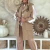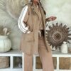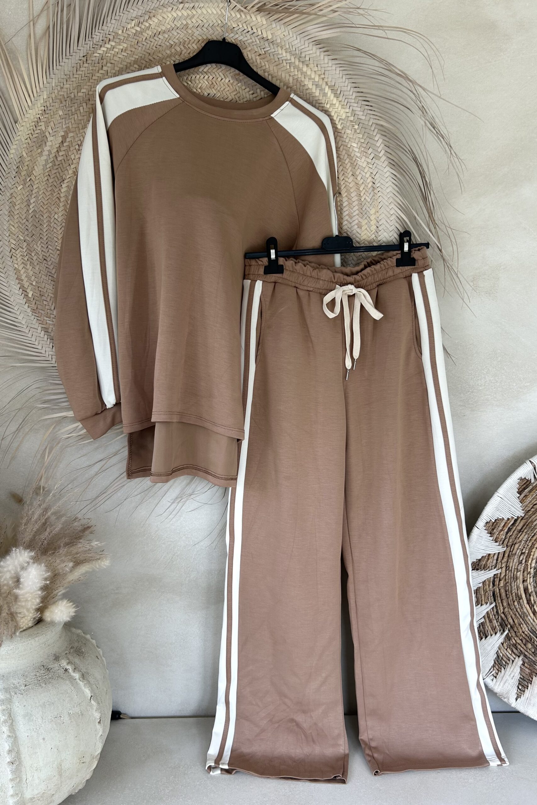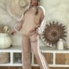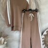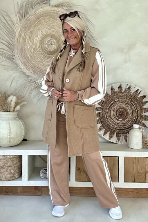 Dit trainingspak/joggingpak combineert ultiem comfort met een stijlvolle retro look. De camel kleurige basis met witte strepen zorgt voor een sportieve, vintage uitstraling. De gladde stof geeft dat echte trainingspak-gevoel, terwijl de losse pasvorm en details zorgen voor een heerlijk draagbare set. De broek heeft een elastische tailleband met aantrekkoord en de sweater valt aan de achterkant iets langer voor een speels effect.