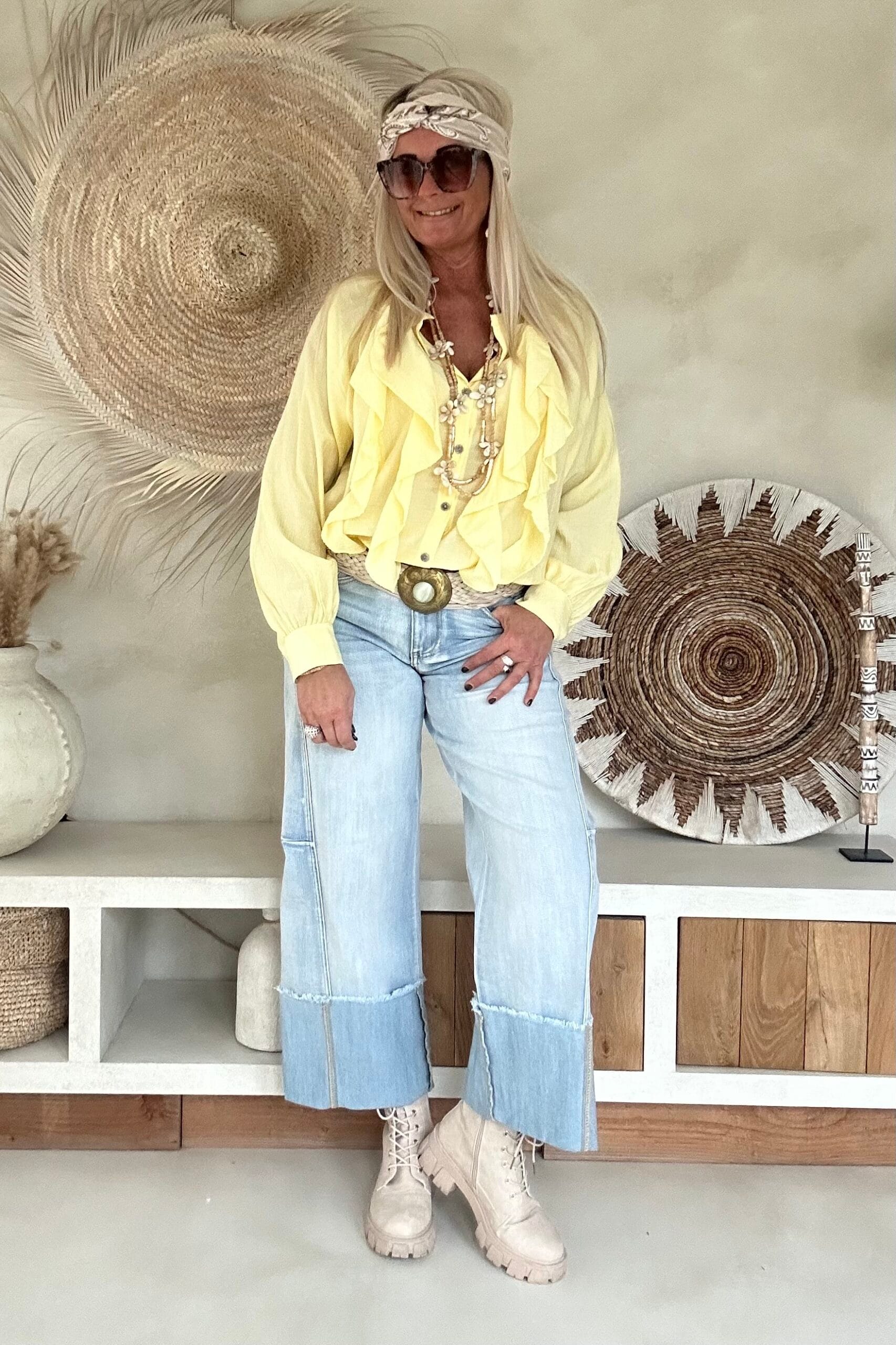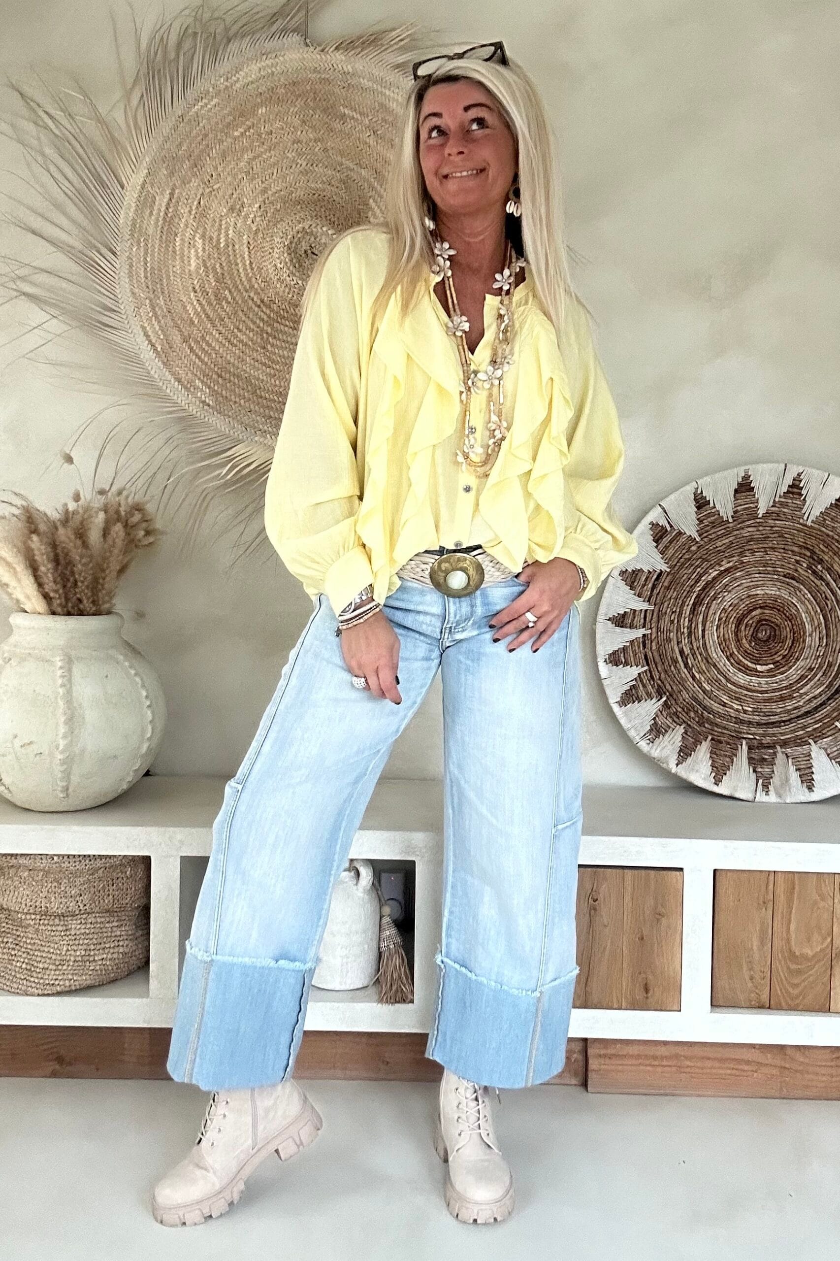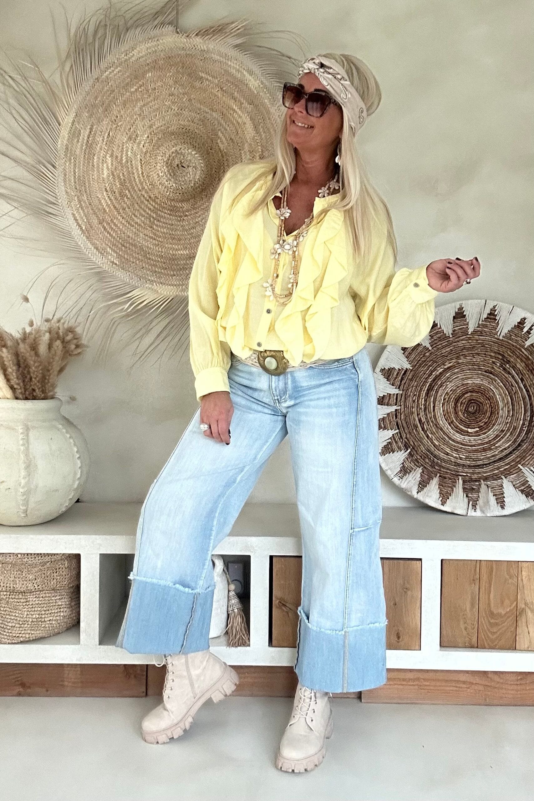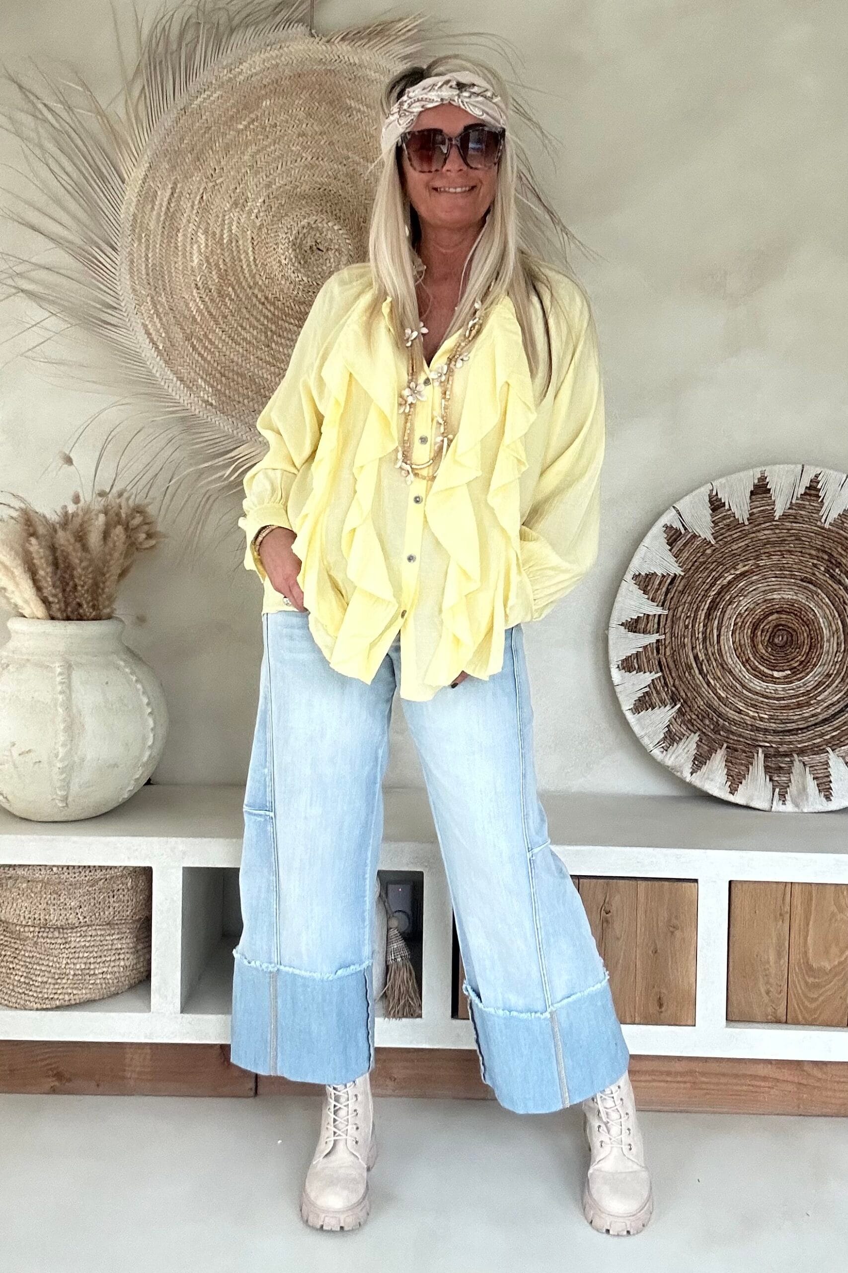Deze vrouwelijke blouse is gemaakt van een zachte, soepelvallende viscose en afgewerkt met speelse ruffles aan de voorzijde. De luchtige stof en losse valling geven de blouse een nonchalante uitstraling. Draag ’m stoer op de Peggy jeans of juist gekleder op de witte stretchbroek Fleur. Met een bandana erbij maak je de look helemaal af voor die fijne hippie vibe.