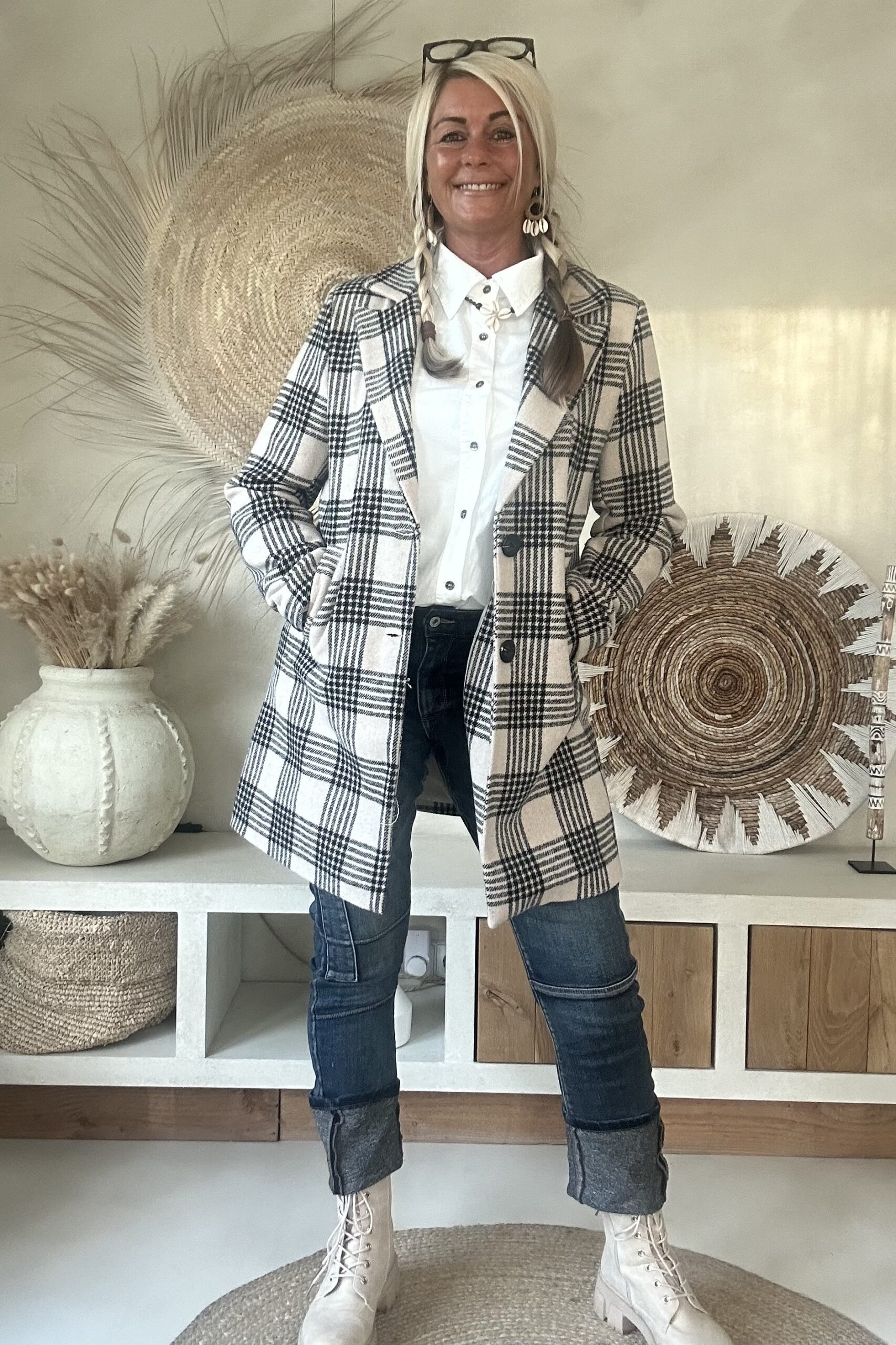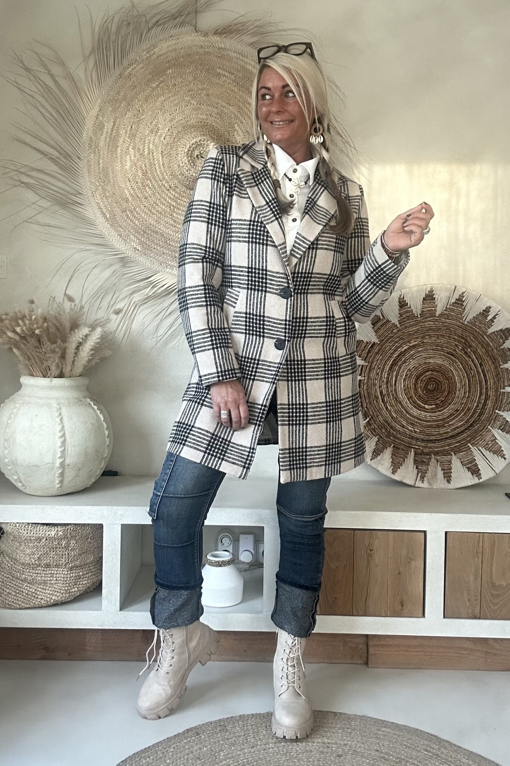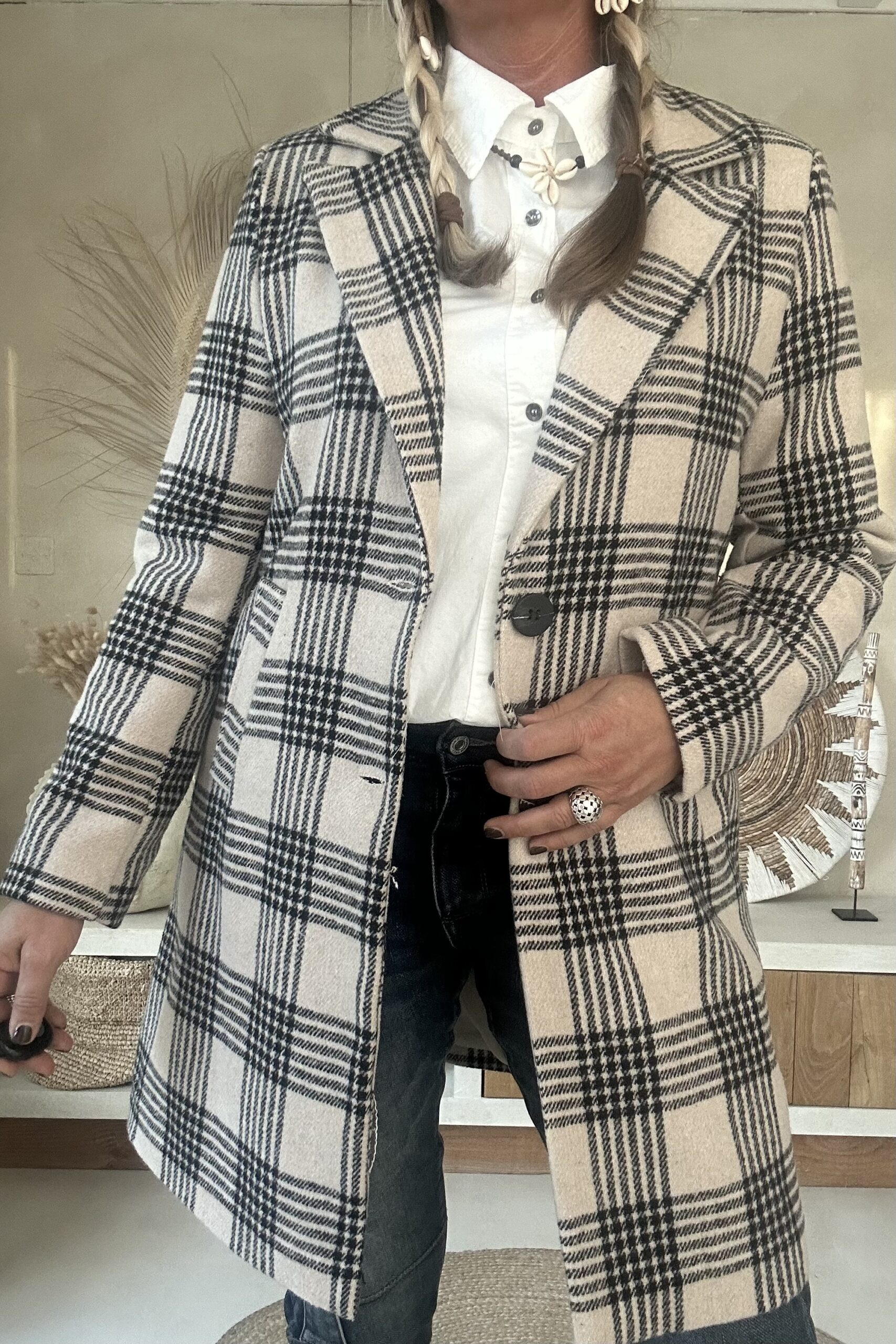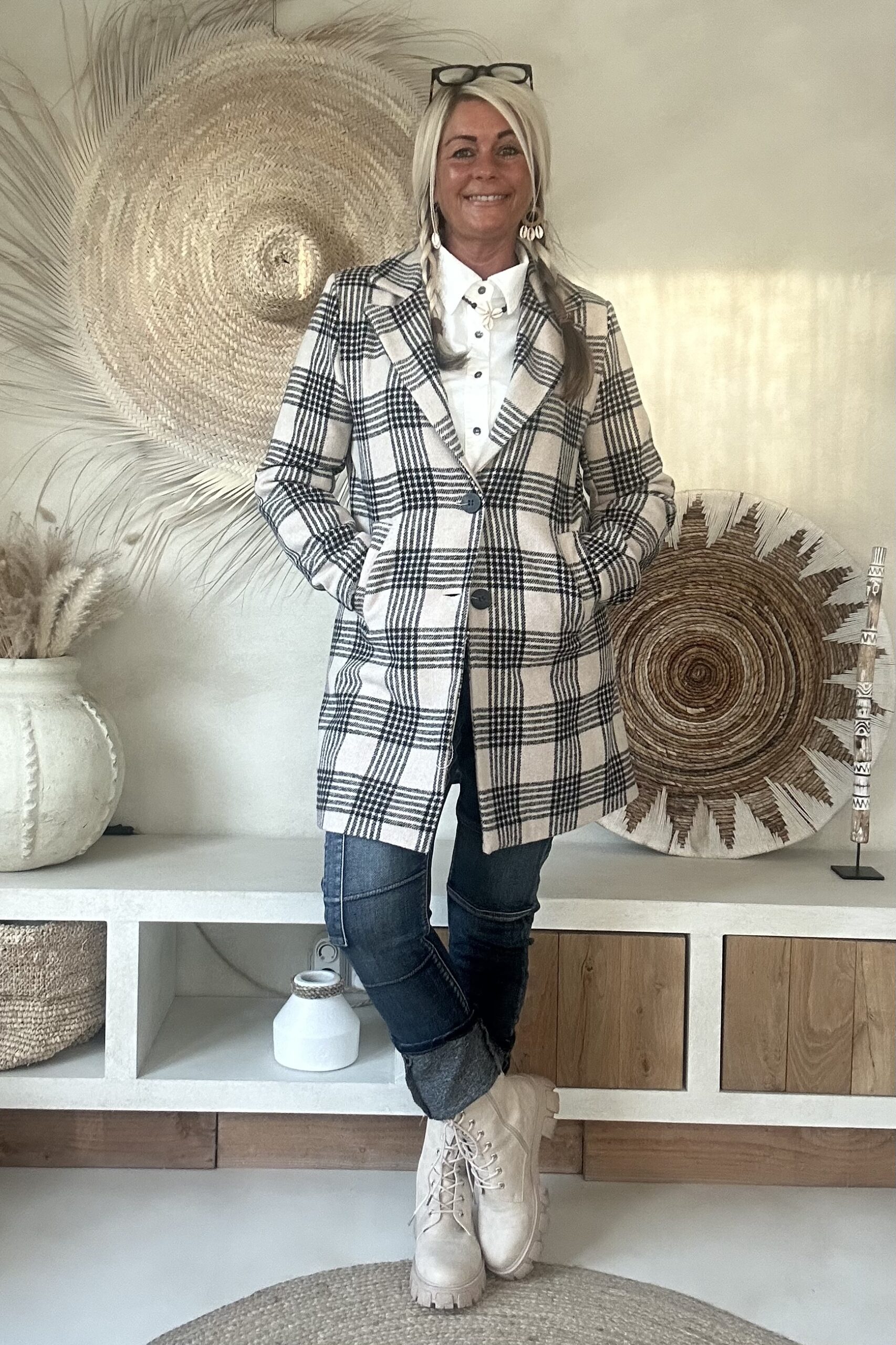 Stijlvolle tussenjas met een klassiek ruitdessin, uitgevoerd in een recht model. De jas heeft een gevoerde binnenzijde met een dunne voeringstof, wat zorgt voor extra draagcomfort. Dankzij de twee knopen aan de voorkant en de handige steekzakken krijgt deze blazer een tijdloze en veelzijdige uitstraling. Perfect te combineren voor zowel een casual als een geklede look.