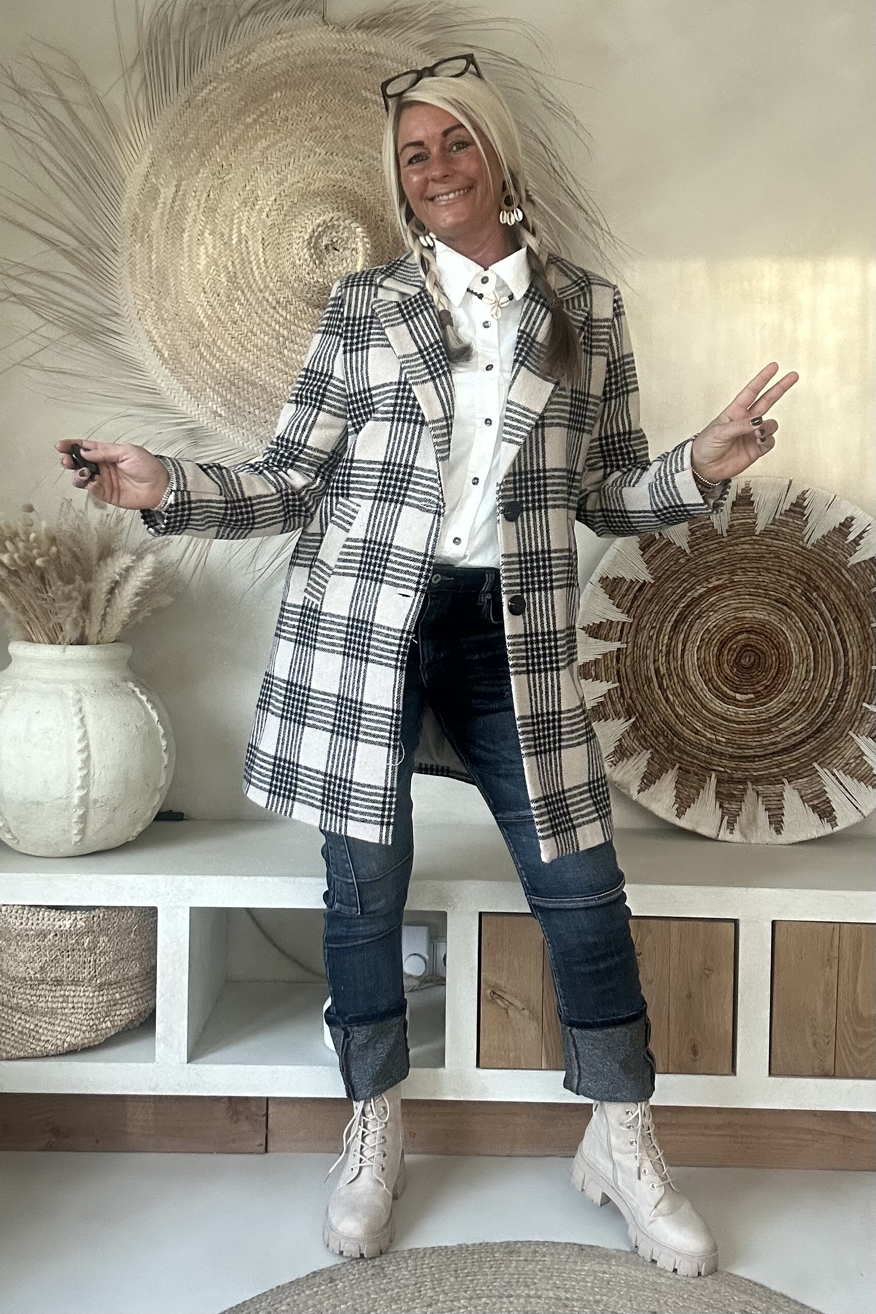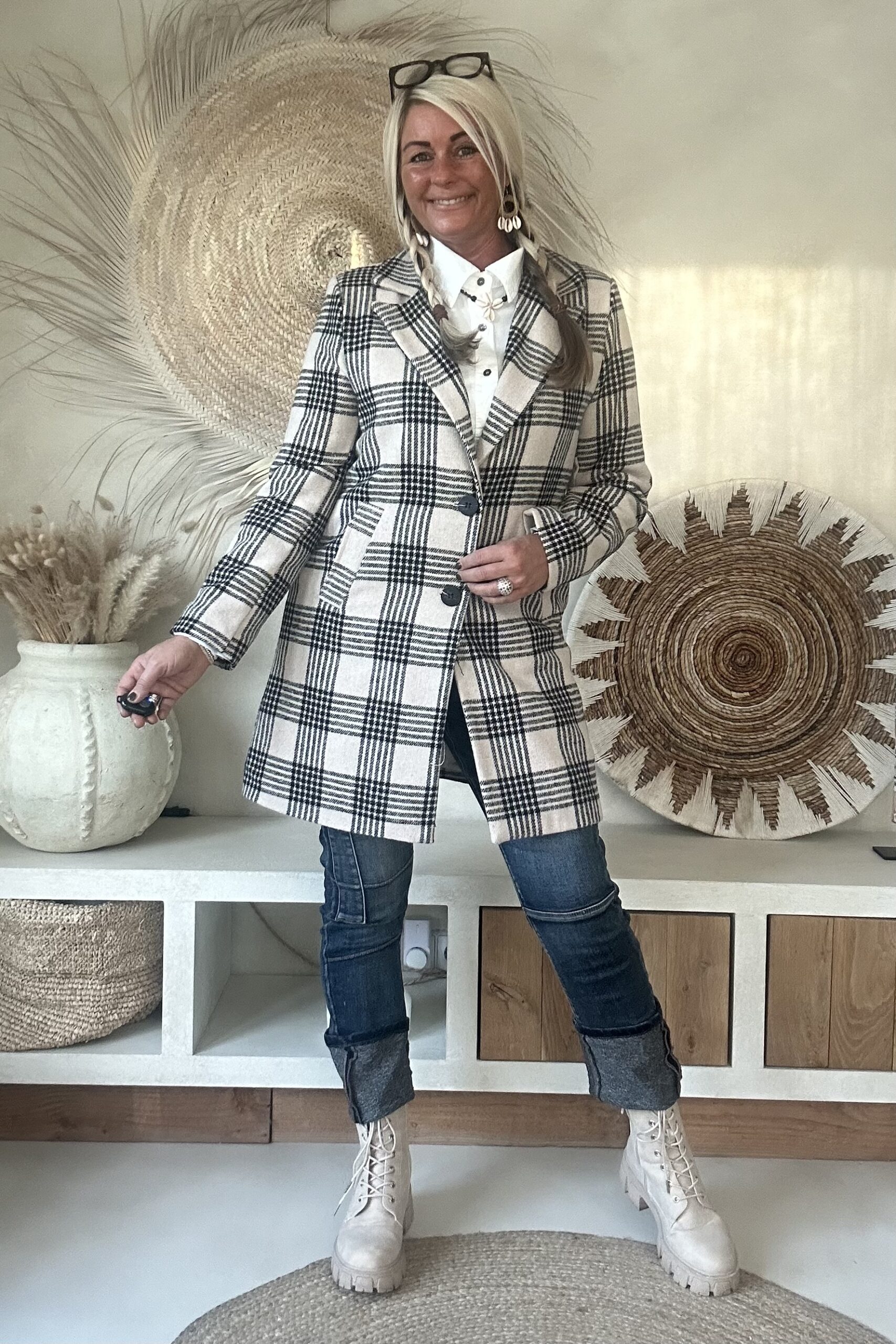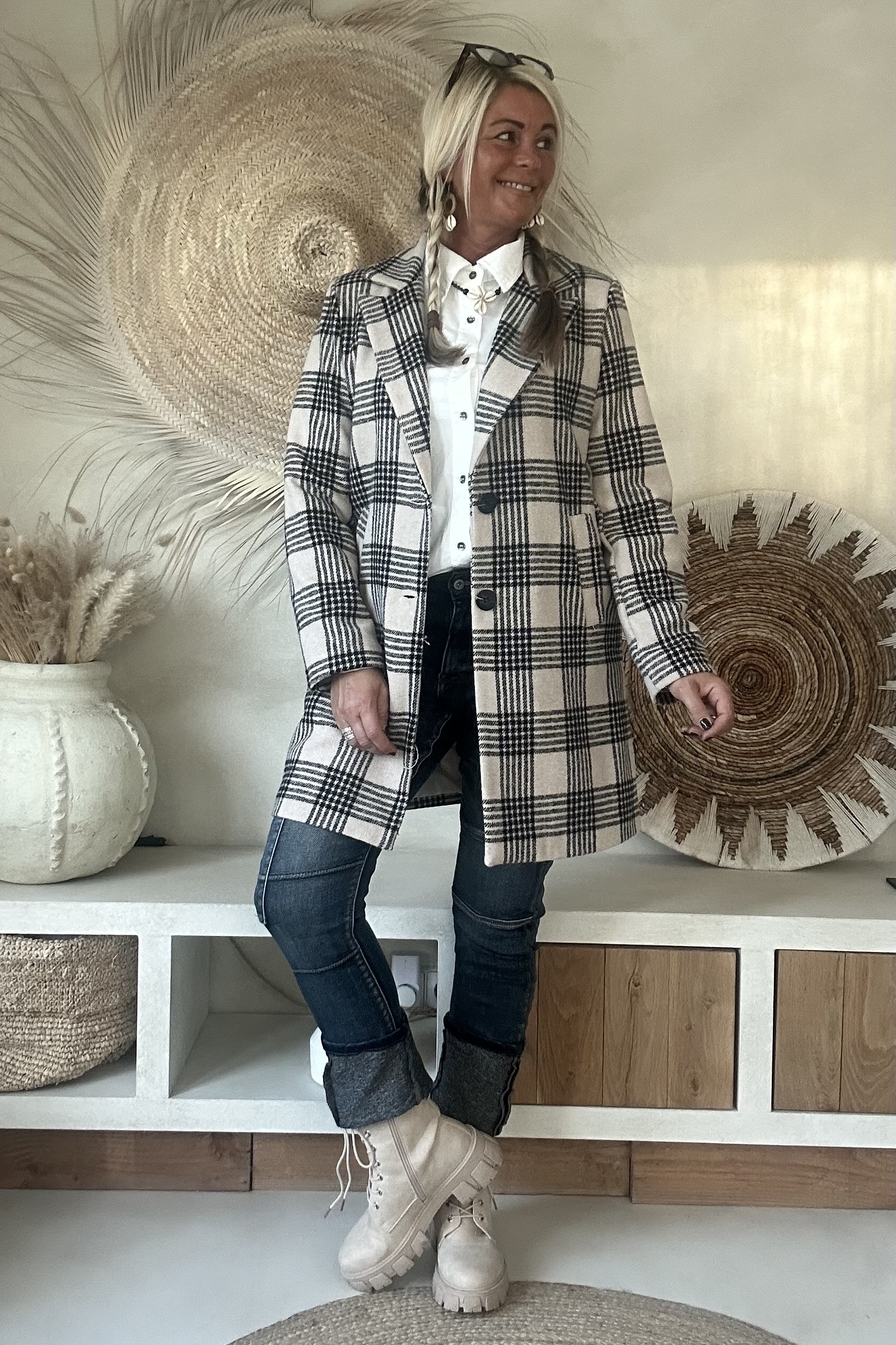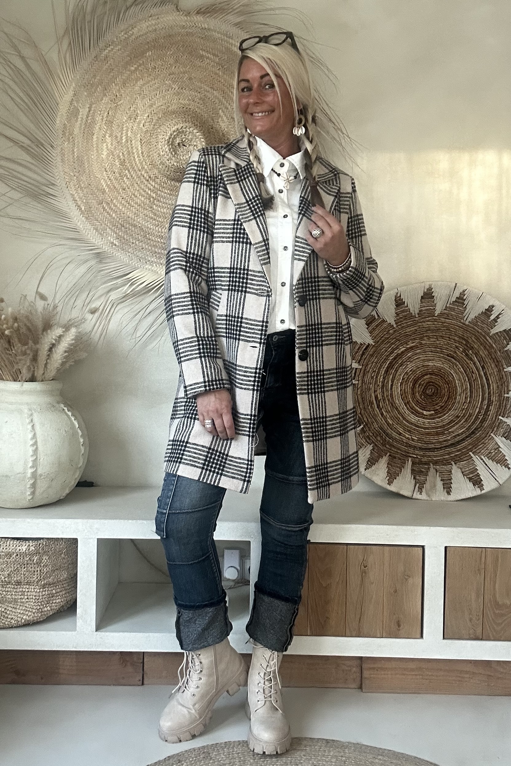Stijlvolle tussenjas met een klassiek ruitdessin, uitgevoerd in een recht model. De jas heeft een gevoerde binnenzijde met een dunne voeringstof, wat zorgt voor extra draagcomfort. Dankzij de twee knopen aan de voorkant en de handige steekzakken krijgt deze blazer een tijdloze en veelzijdige uitstraling. Perfect te combineren voor zowel een casual als een geklede look.