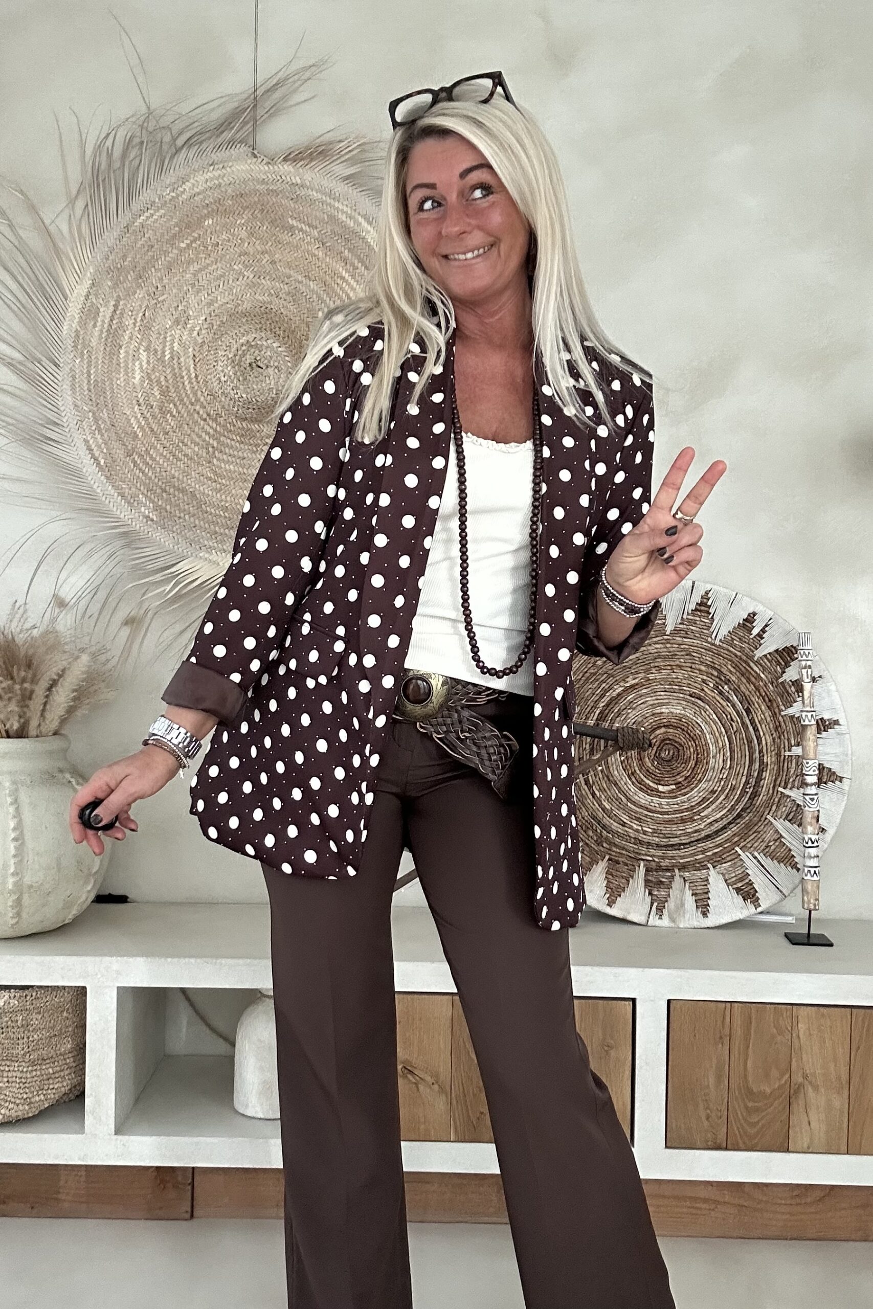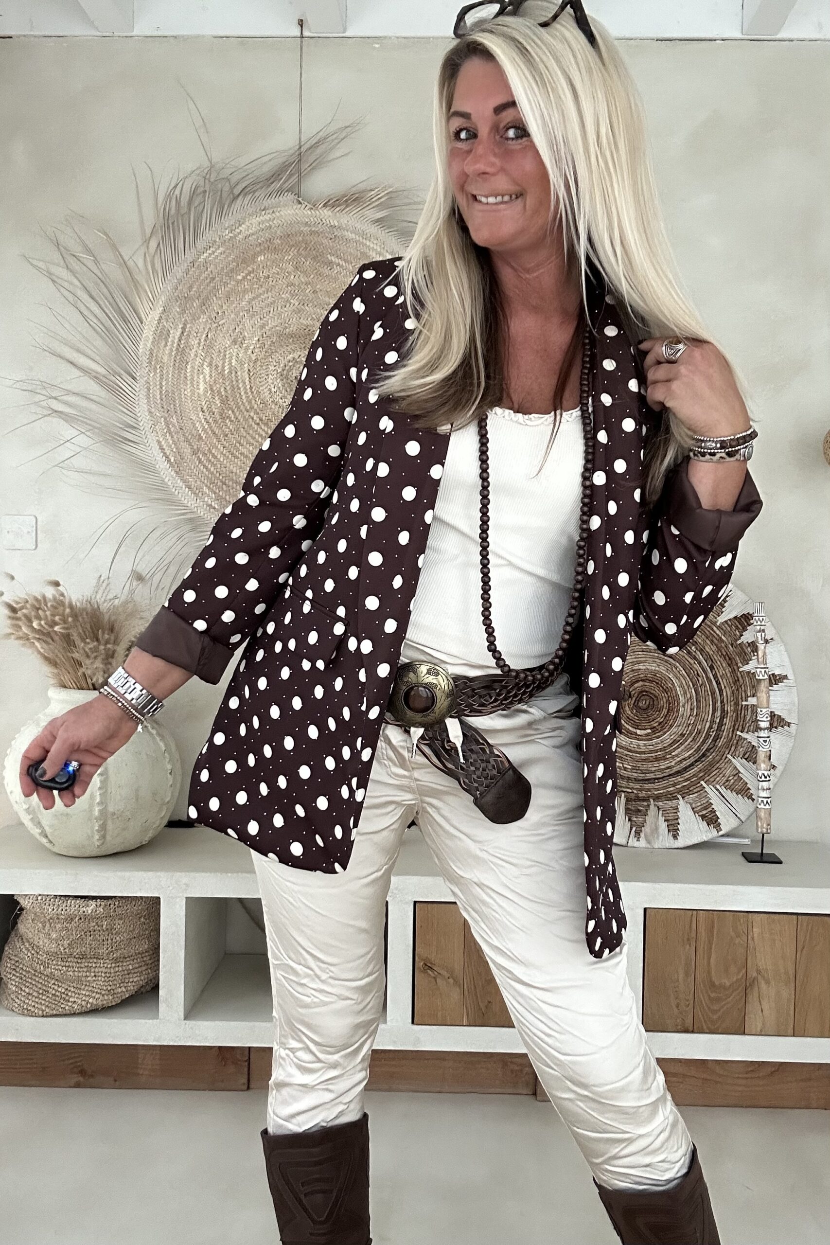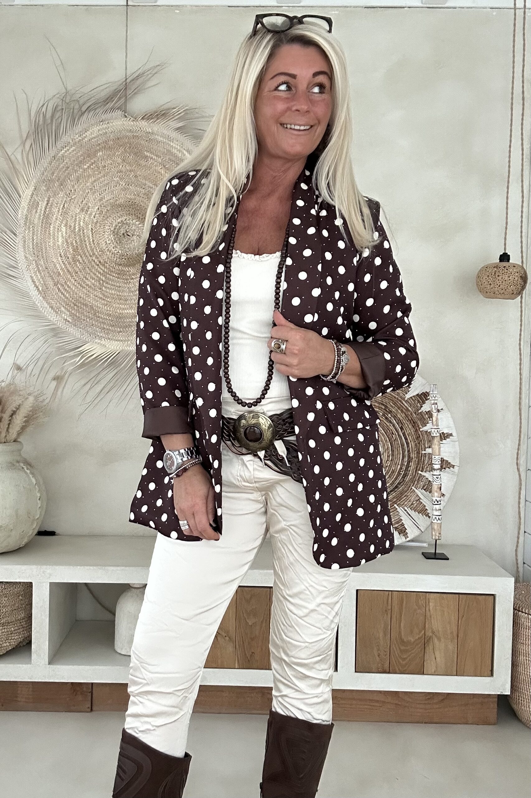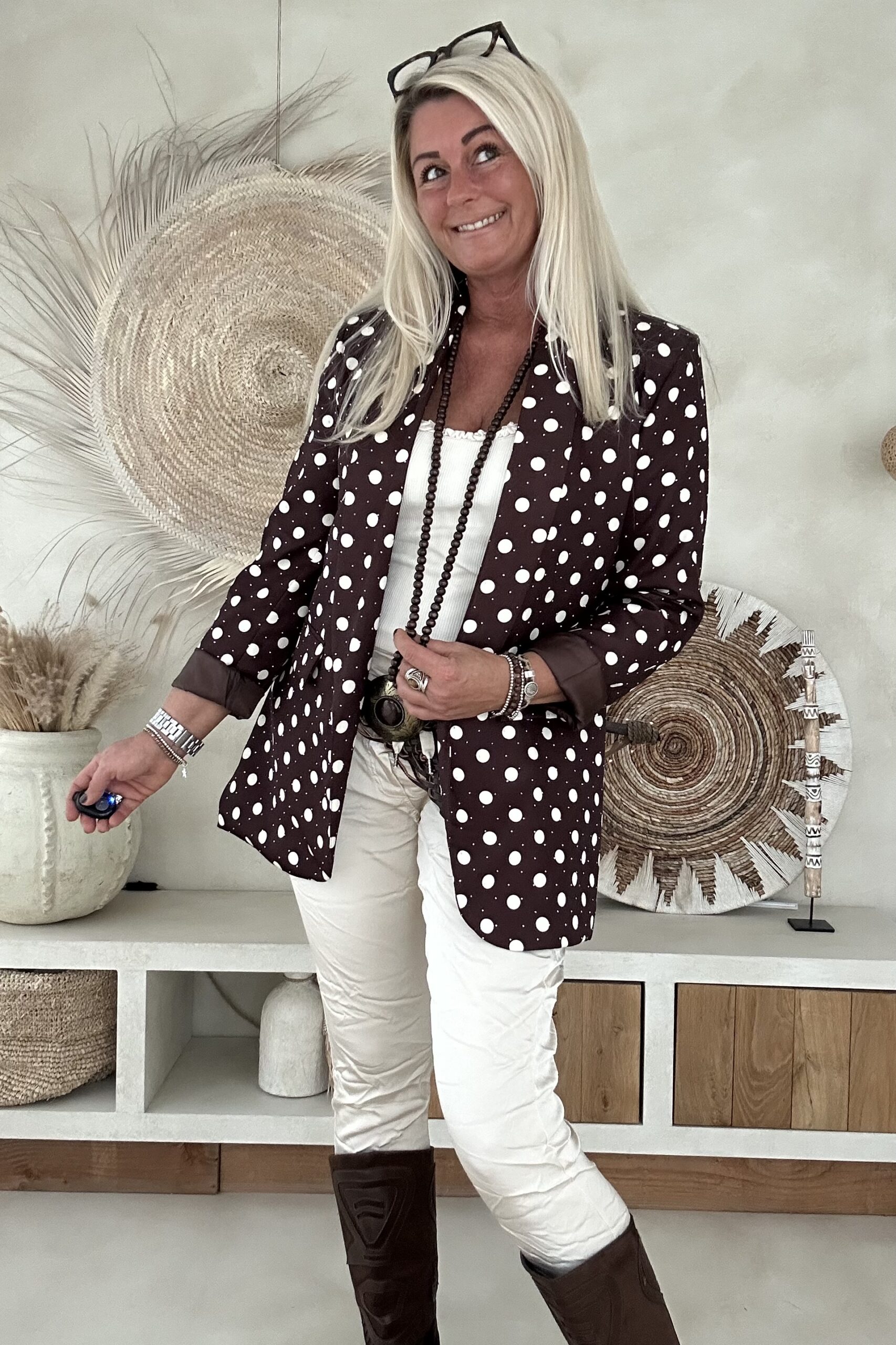 Stijlvolle blazer in een diepe chocoladebruine tint, uitgevoerd met een speels polkadotdessin en verfijnde glinsterende steentjes. De sjaalkraag en het openvallende model geven een elegante uitstraling, terwijl de mouwen naar wens omgeslagen kunnen worden voor een nonchalante of juist geklede look.