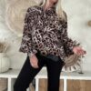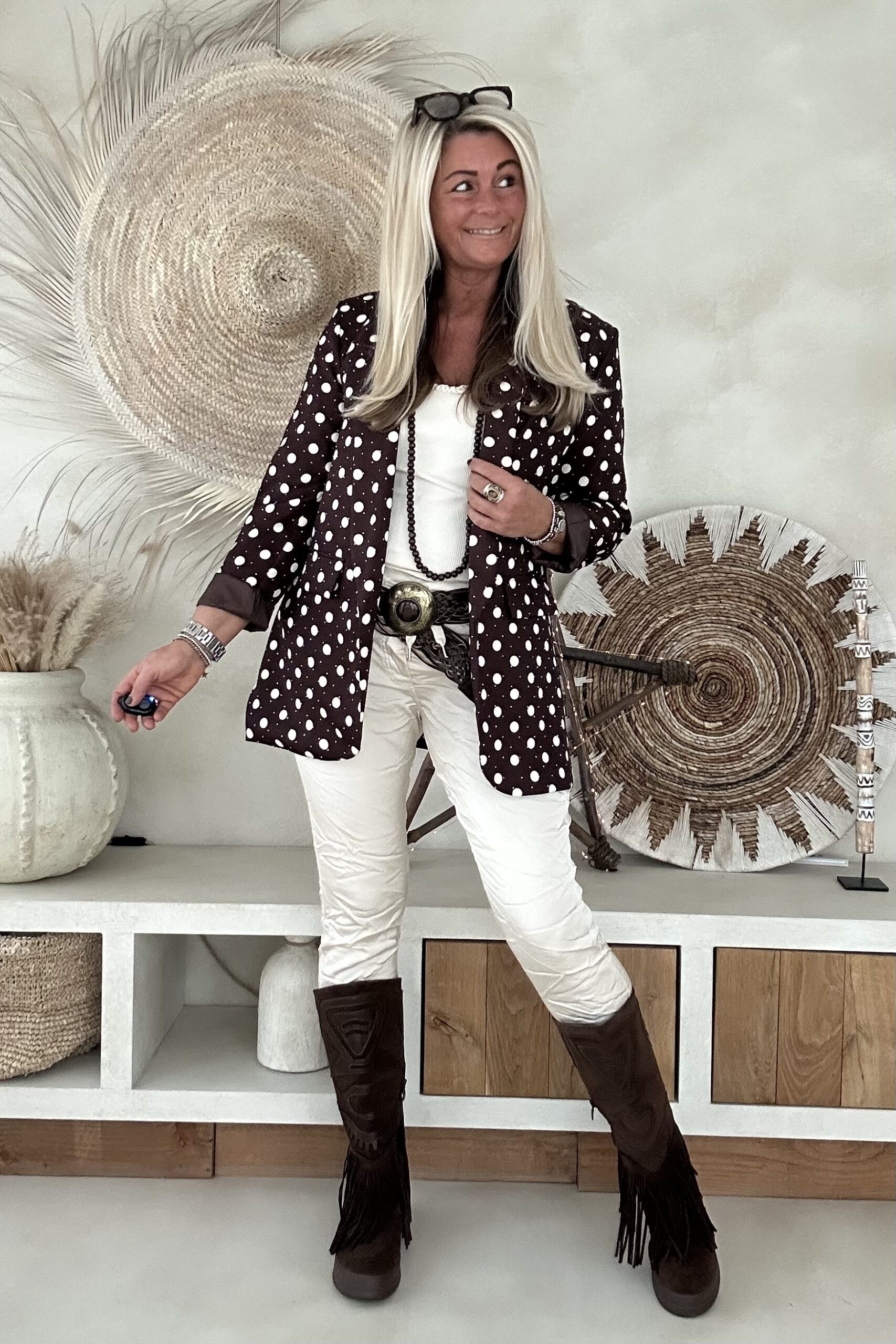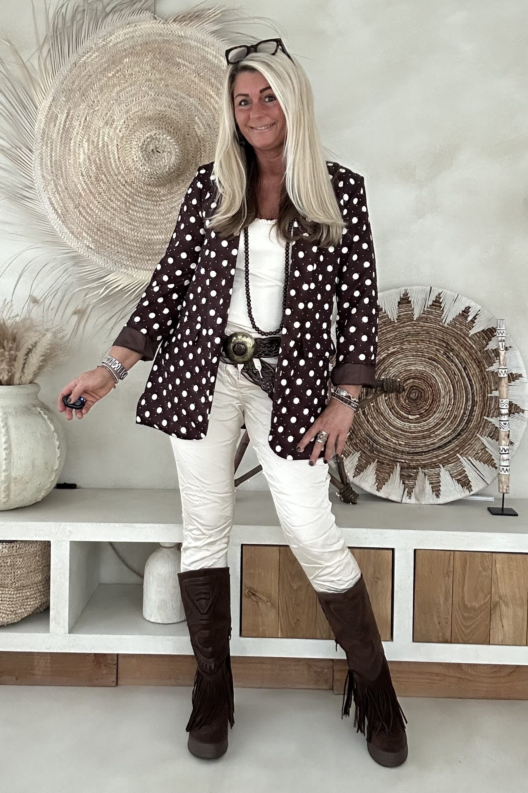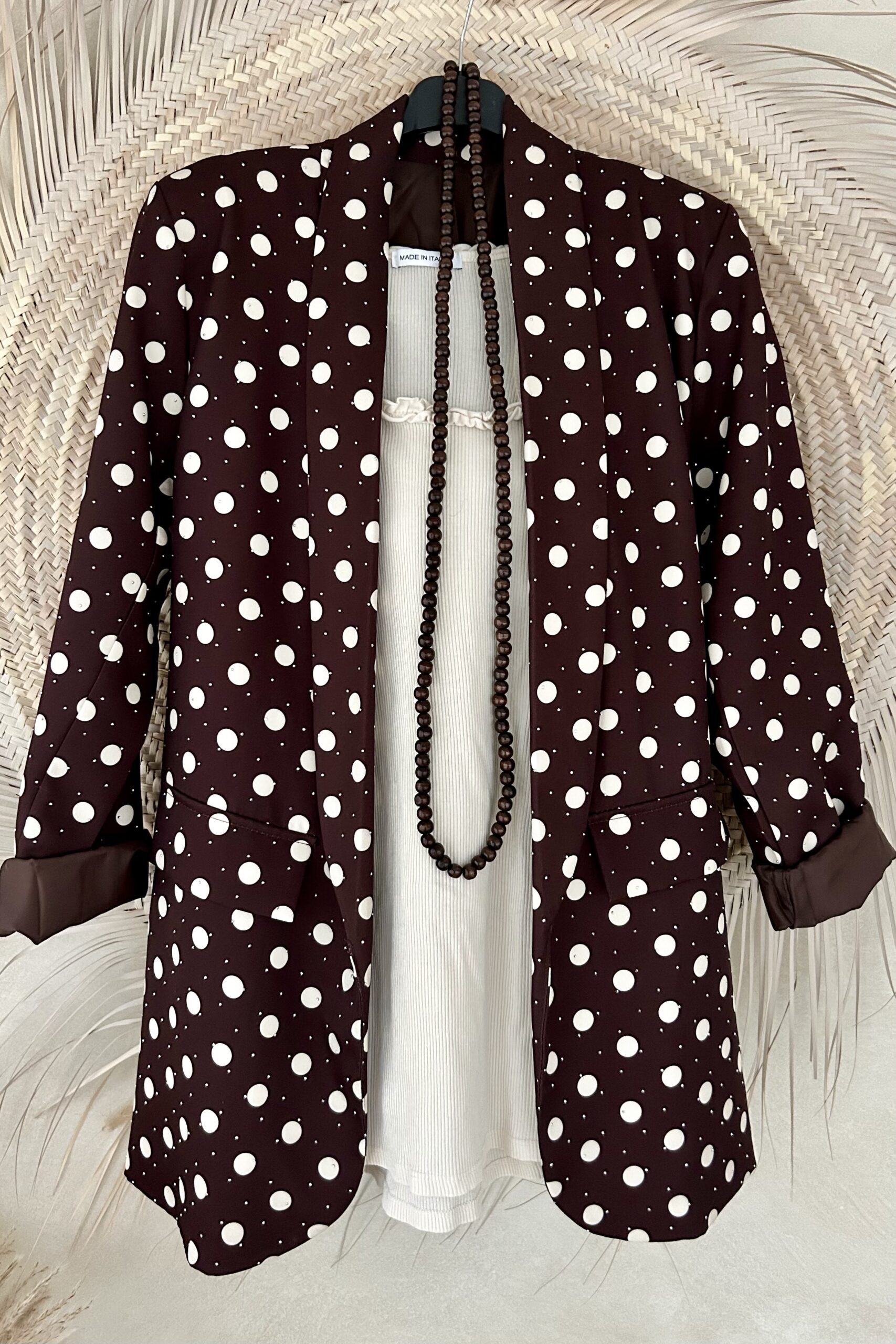 Stijlvolle blazer in een diepe chocoladebruine tint, uitgevoerd met een speels polkadotdessin en verfijnde glinsterende steentjes. De sjaalkraag en het openvallende model geven een elegante uitstraling, terwijl de mouwen naar wens omgeslagen kunnen worden voor een nonchalante of juist geklede look.