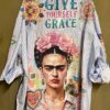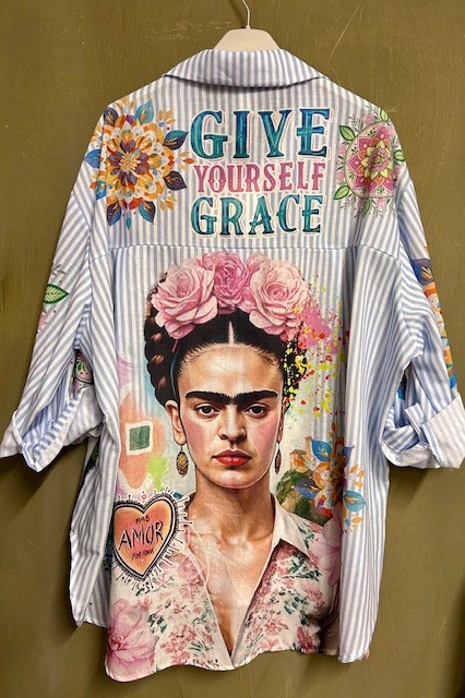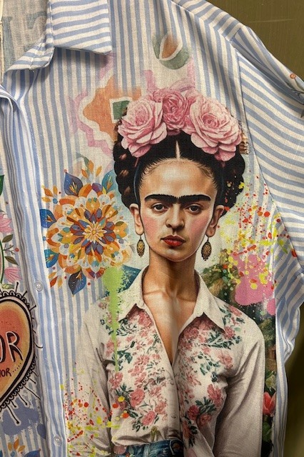 • Kenmerken & details: opvallende Frida Kahlo print, artistieke teksten en bloemendetails, klassieke kraag, knoopsluiting aan de voorzijde, soepel en licht draagcomfort.
