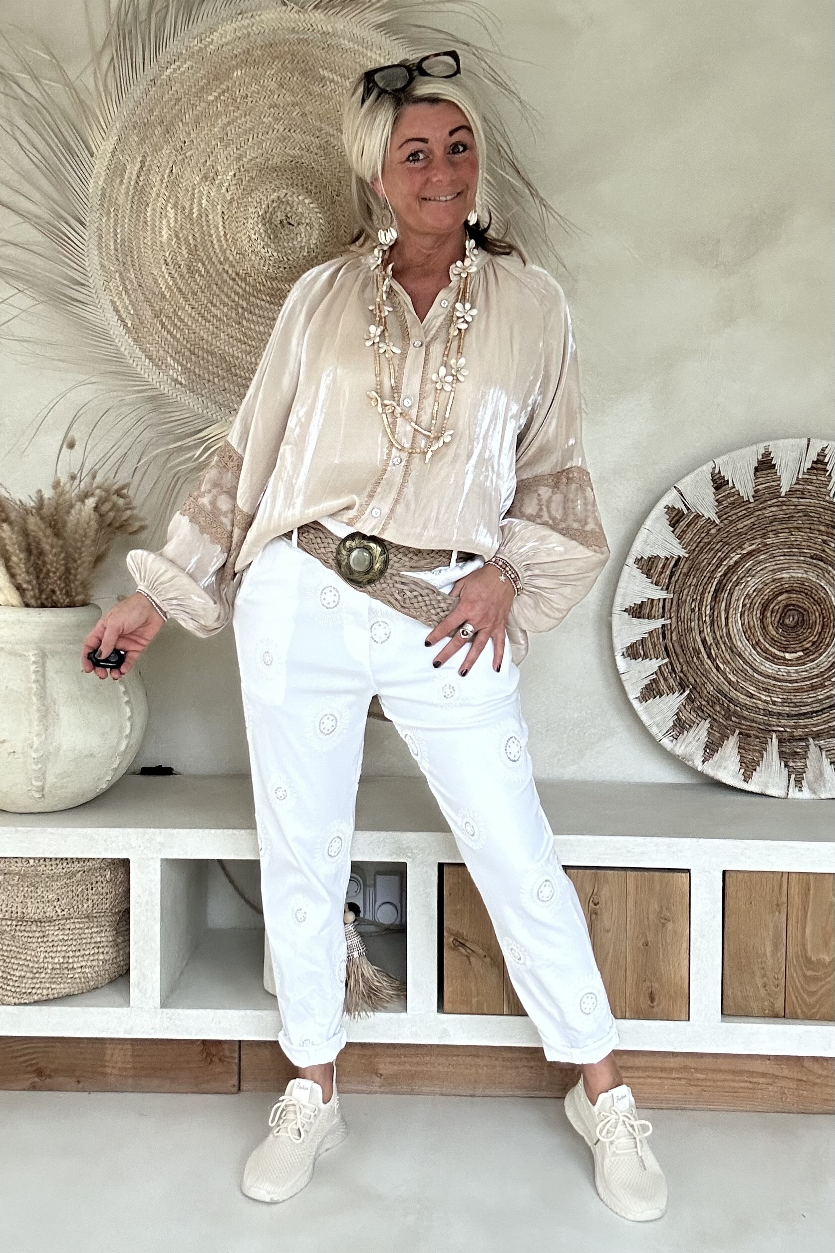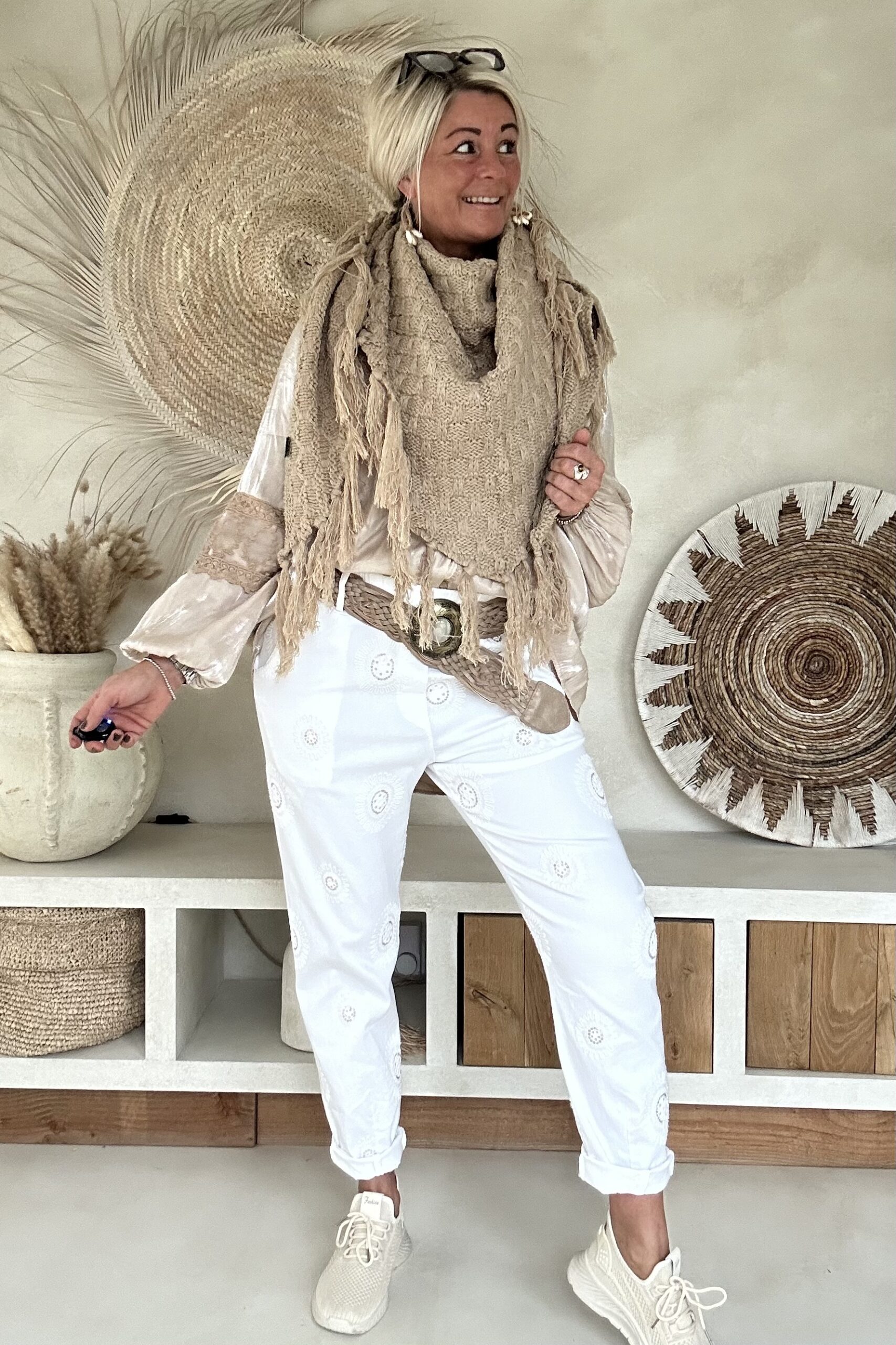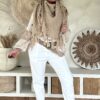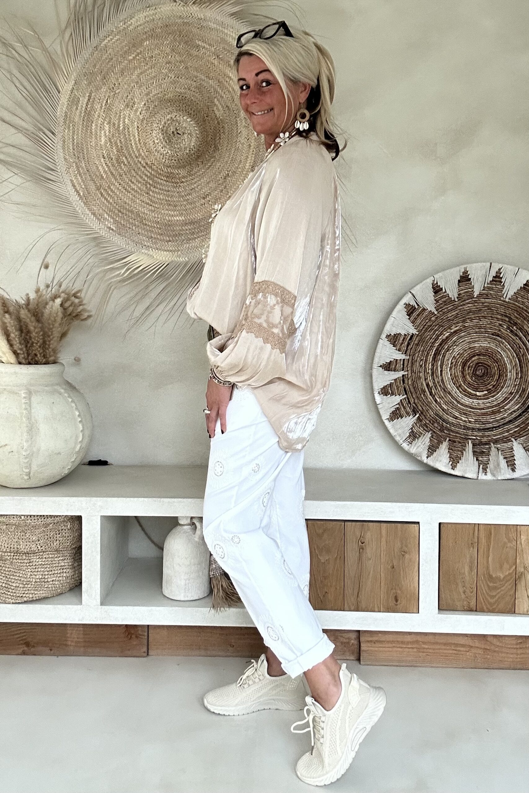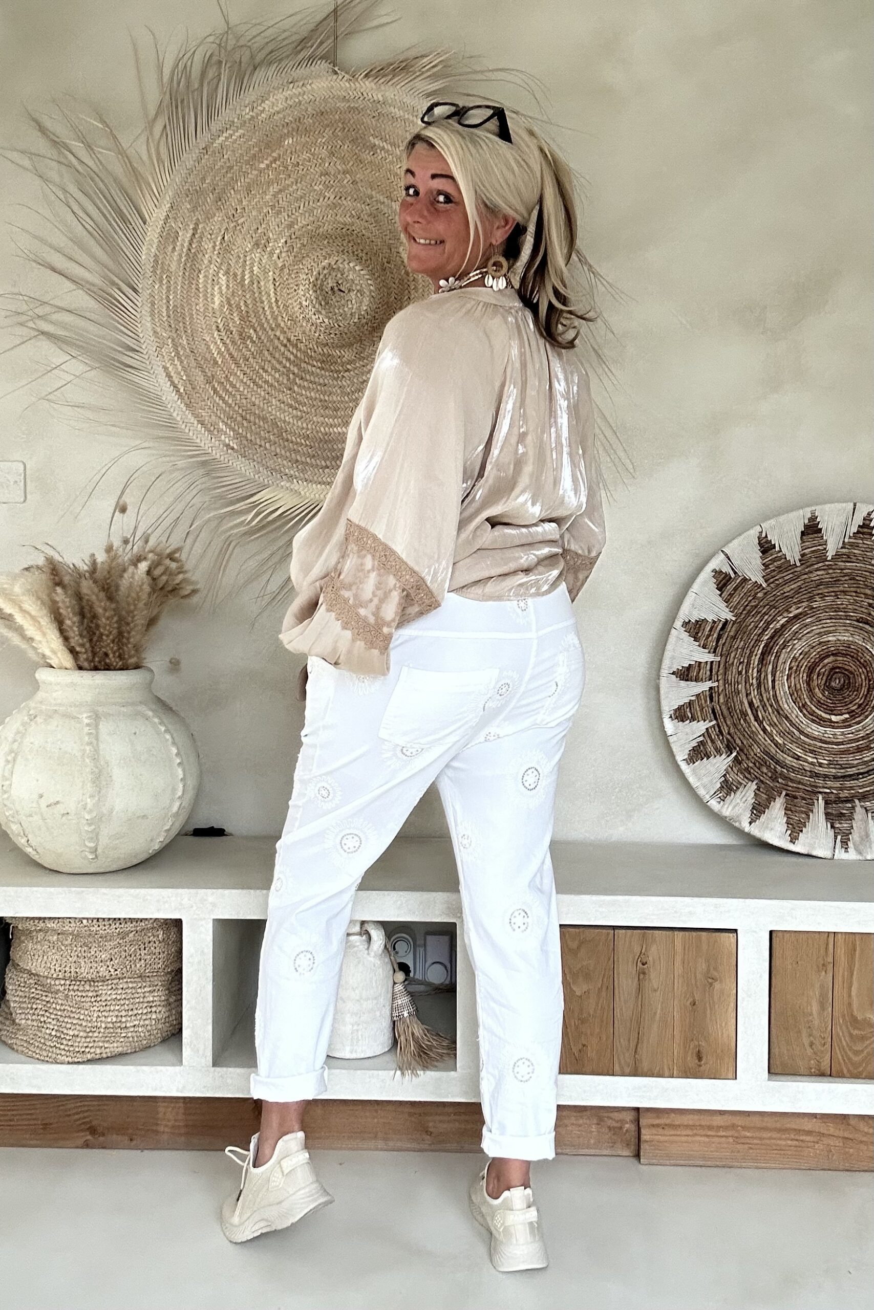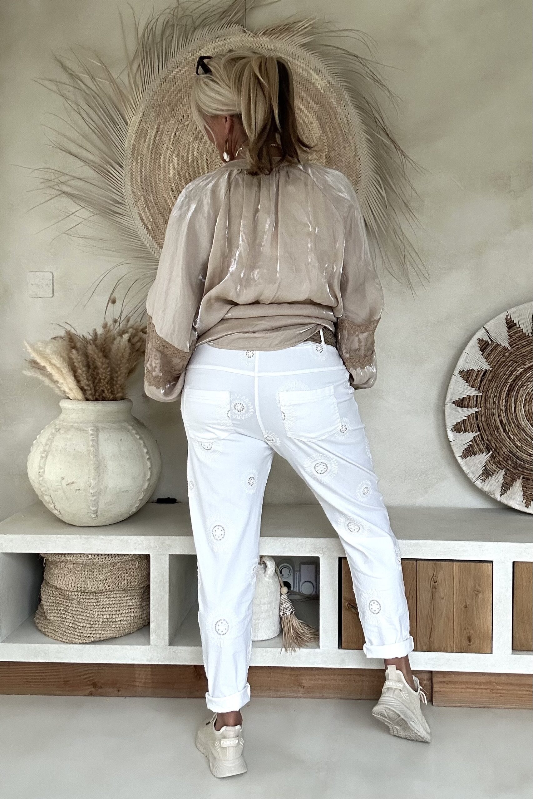 Deze super comfy stretchbroek is er eentje waar je meteen in wilt wonen. De zachte, soepele stof met veel stretch zorgt voor een heerlijk draagcomfort, terwijl de mooie borduursels en subtiele pailletjes net dat extra detail geven. De broek heeft een ontspannen uitstraling, maar oogt toch verzorgd en stijlvol.