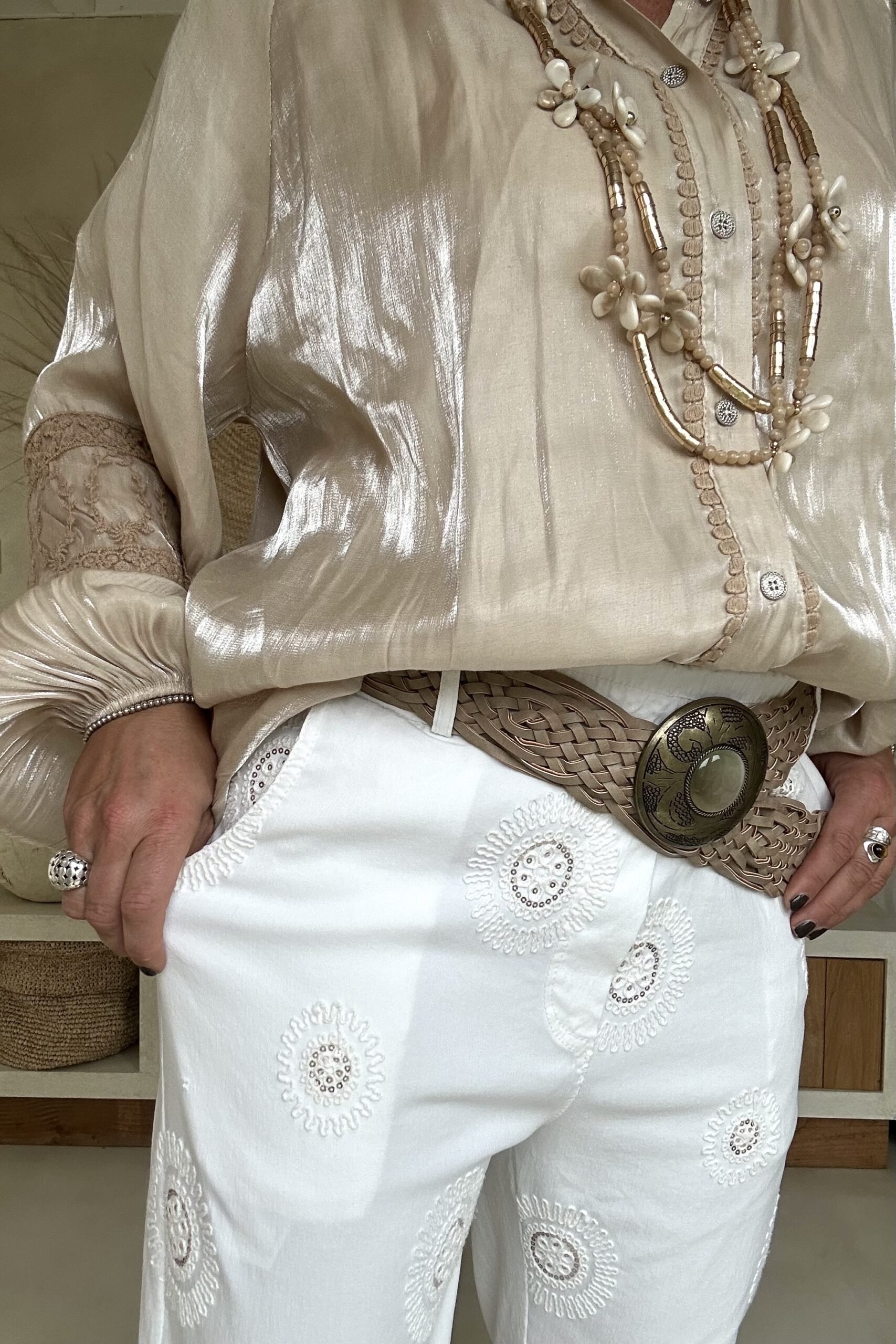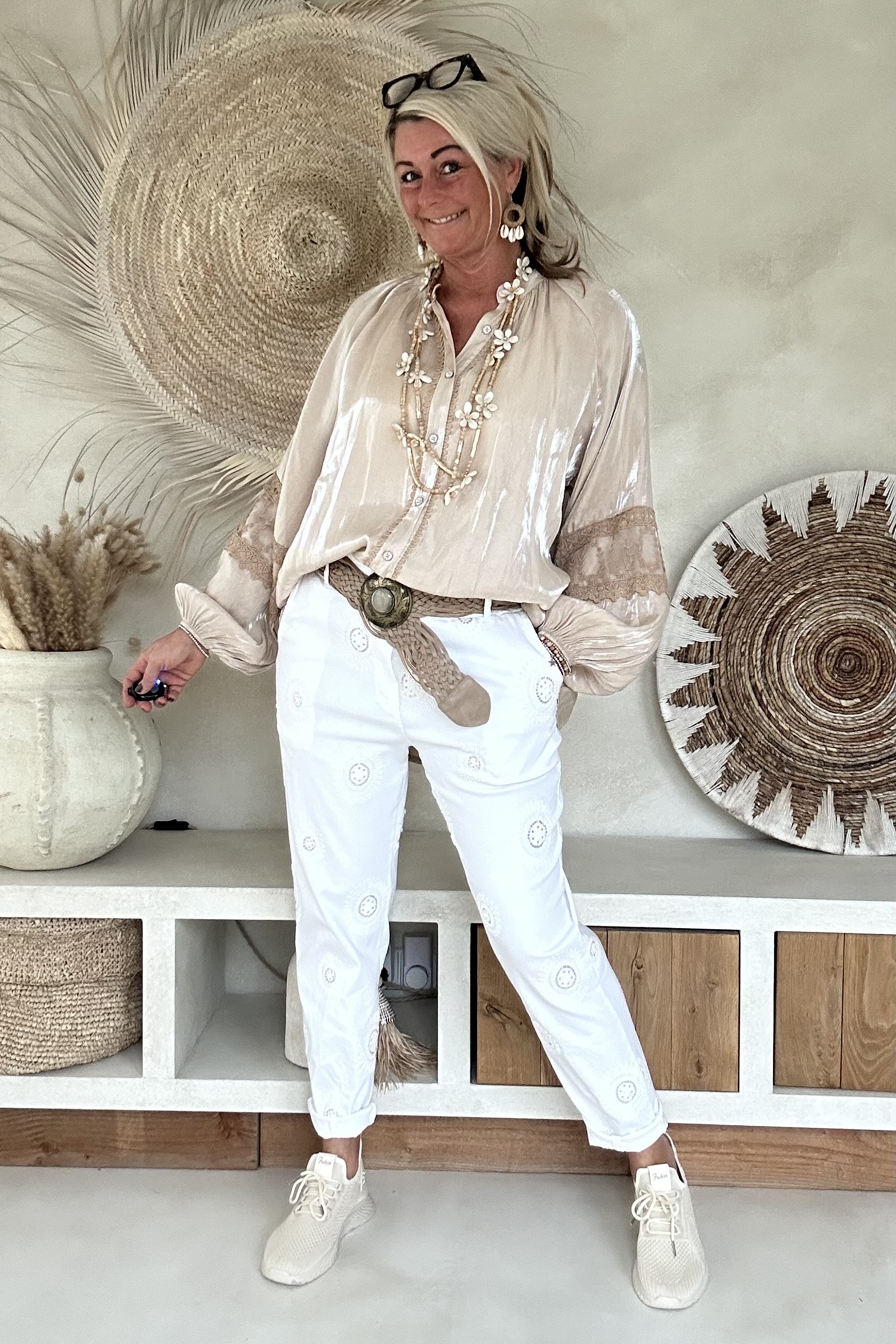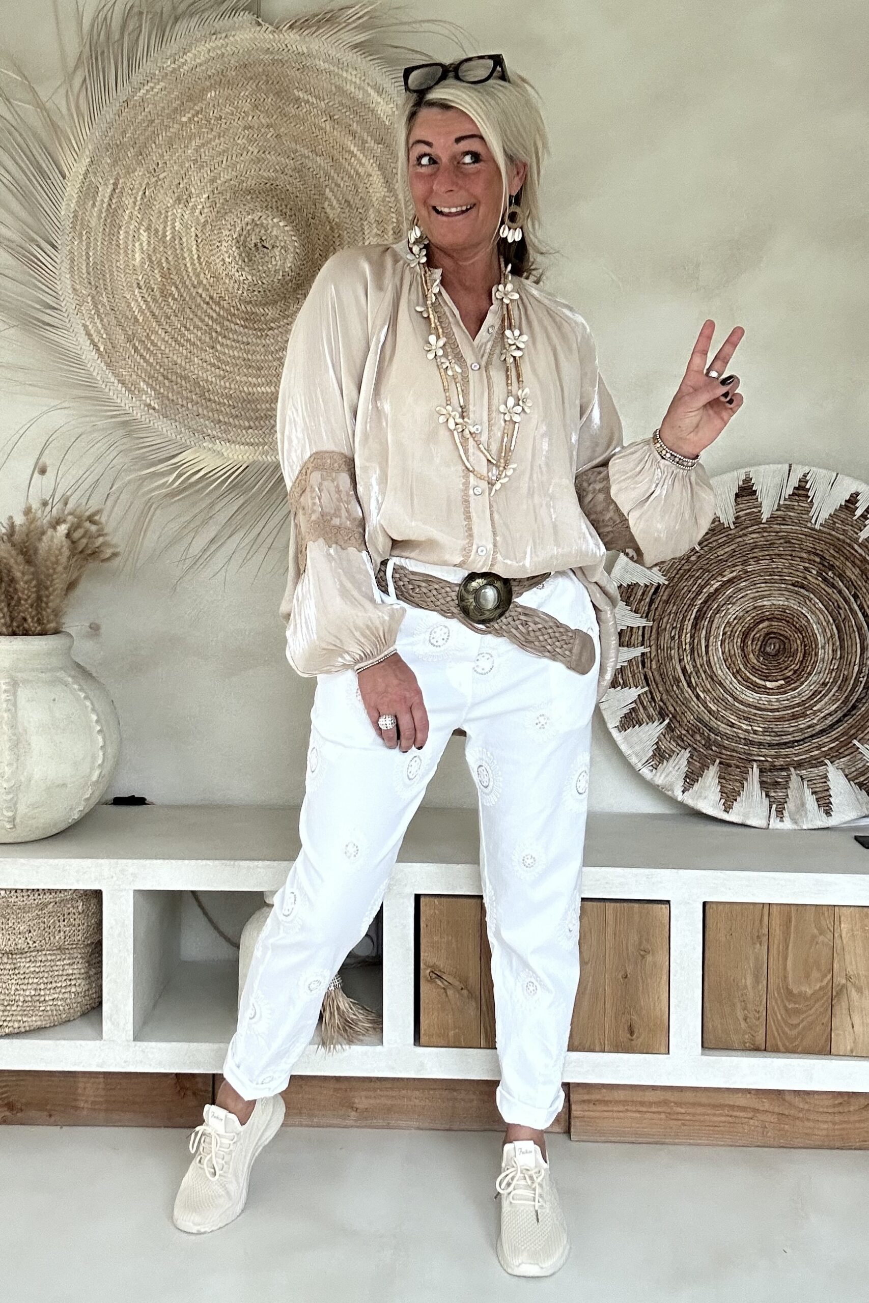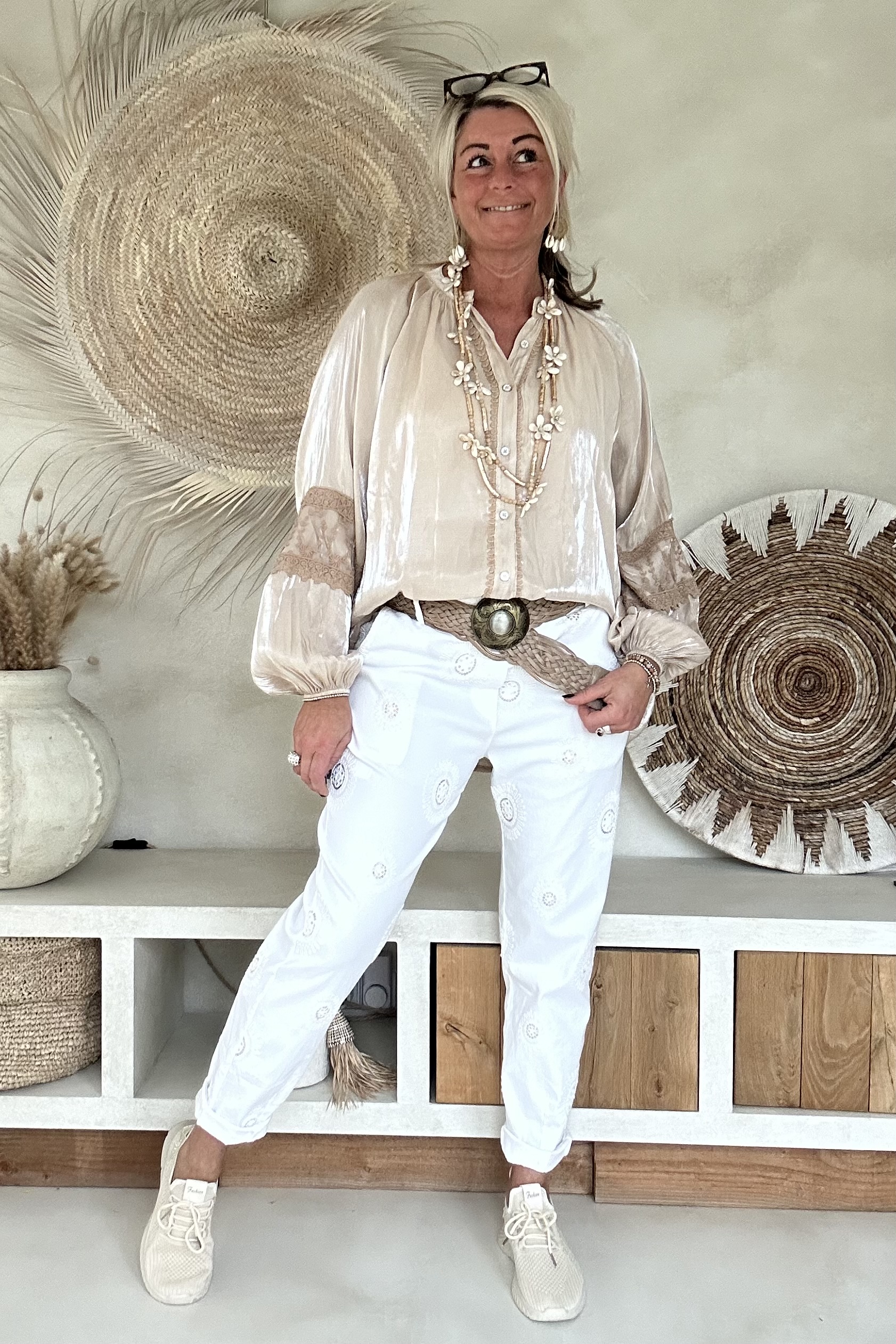 Deze super comfy stretchbroek is er eentje waar je meteen in wilt wonen. De zachte, soepele stof met veel stretch zorgt voor een heerlijk draagcomfort, terwijl de mooie borduursels en subtiele pailletjes net dat extra detail geven. De broek heeft een ontspannen uitstraling, maar oogt toch verzorgd en stijlvol.