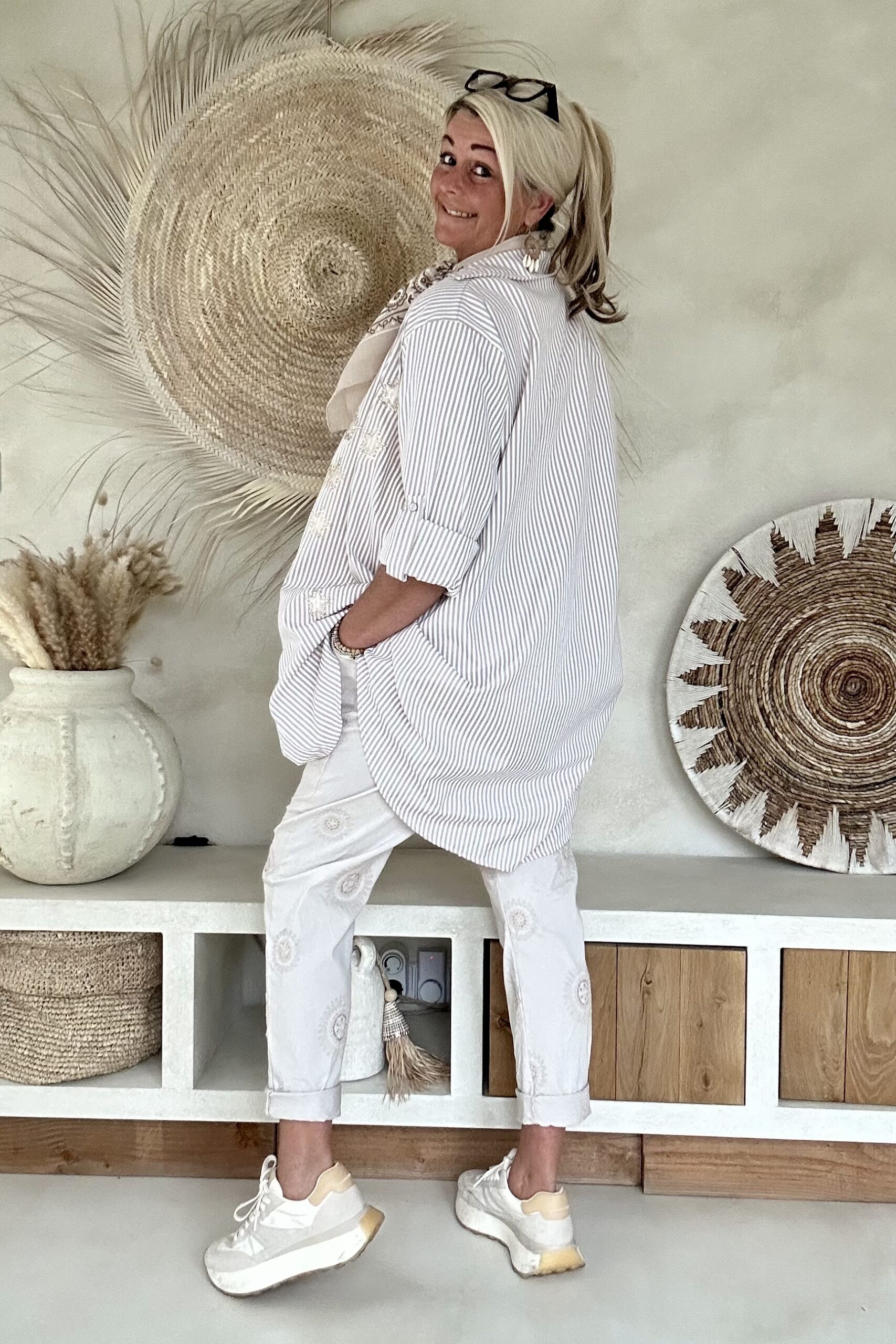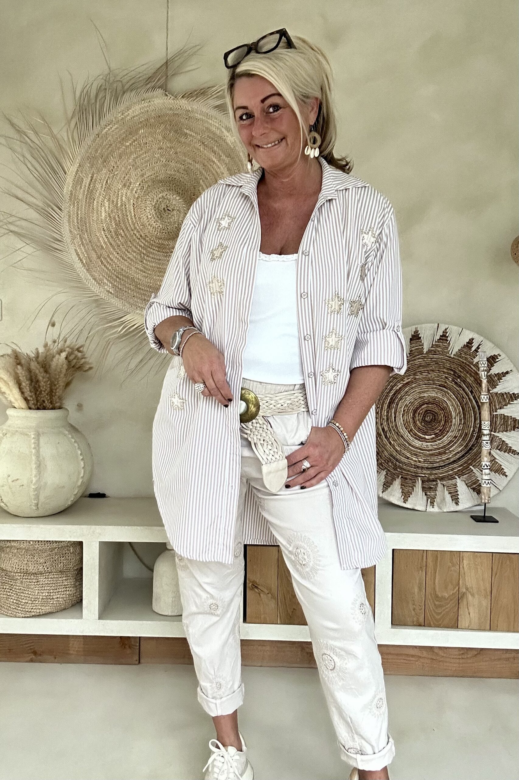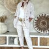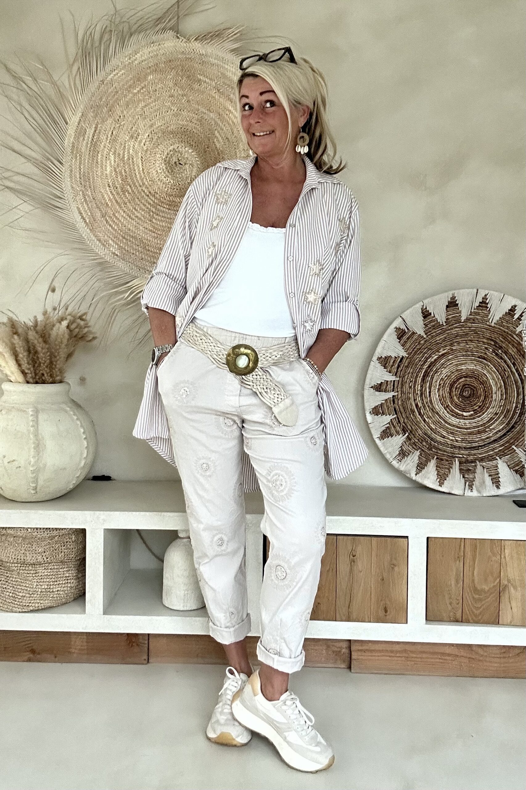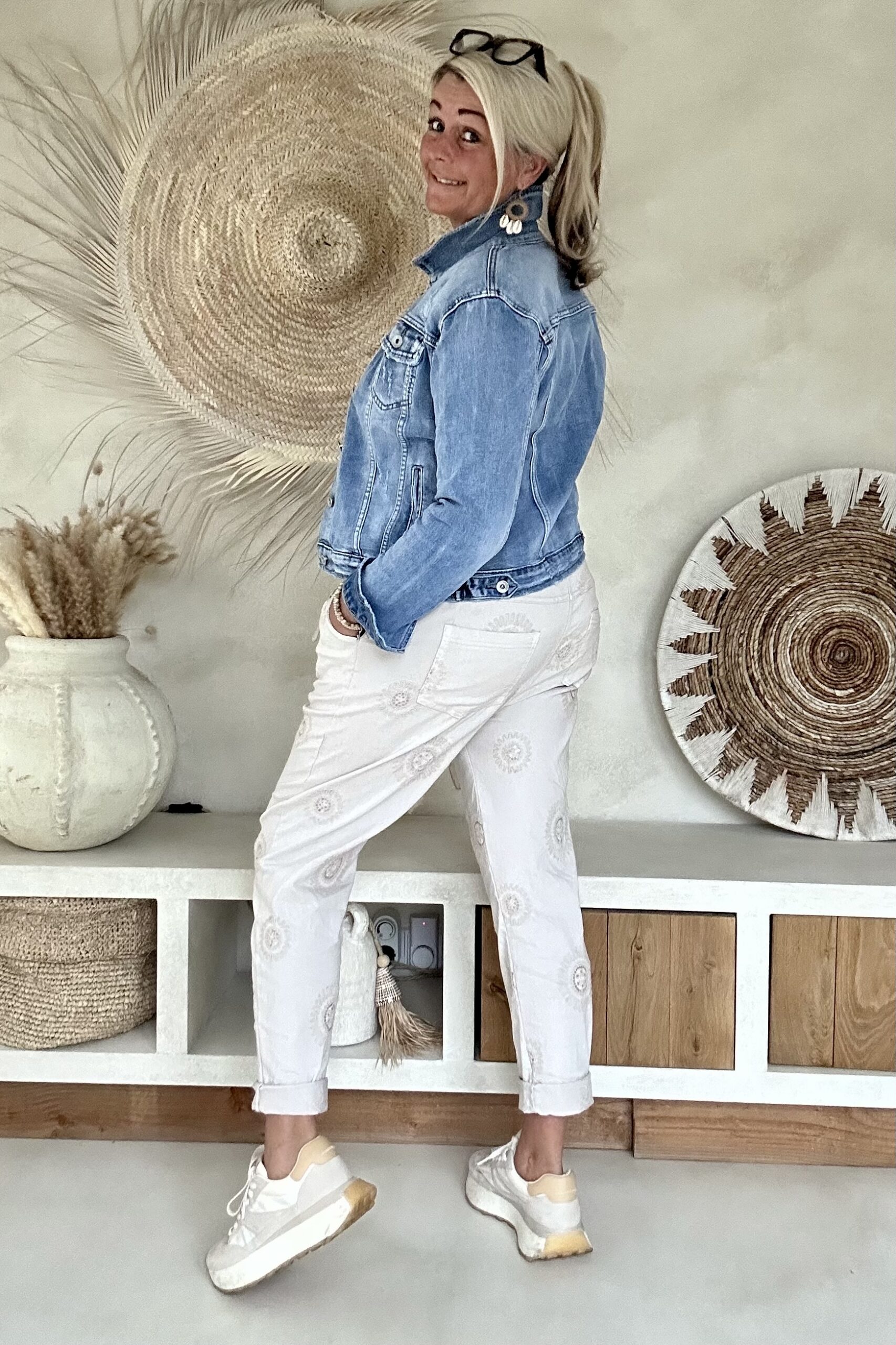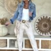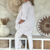 Deze super comfy stretchbroek is er eentje waar je meteen in wilt wonen. De zachte, soepele stof met veel stretch zorgt voor een heerlijk draagcomfort, terwijl de mooie borduursels en subtiele pailletjes net dat extra detail geven. De broek heeft een ontspannen uitstraling, maar oogt toch verzorgd en stijlvol.