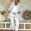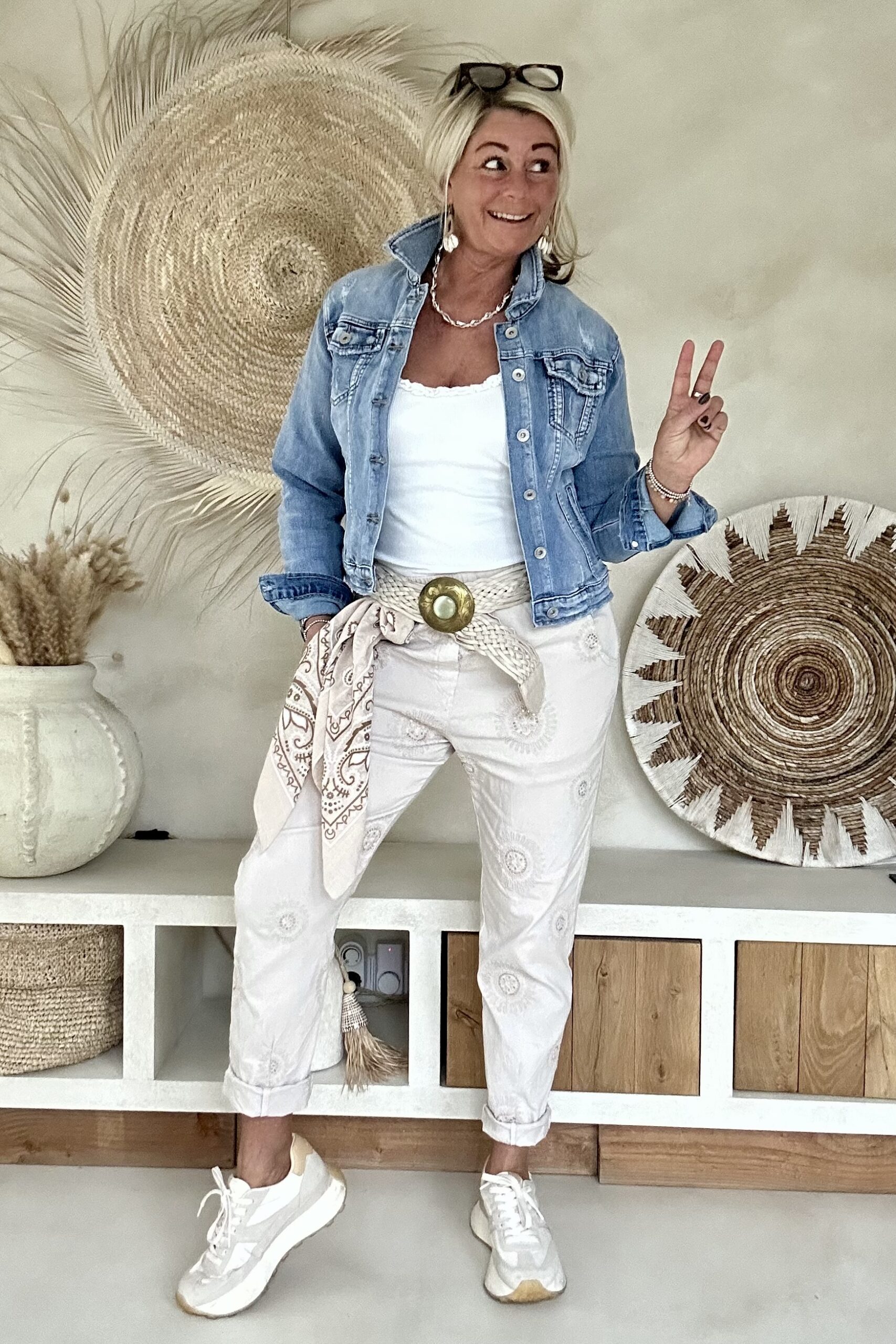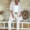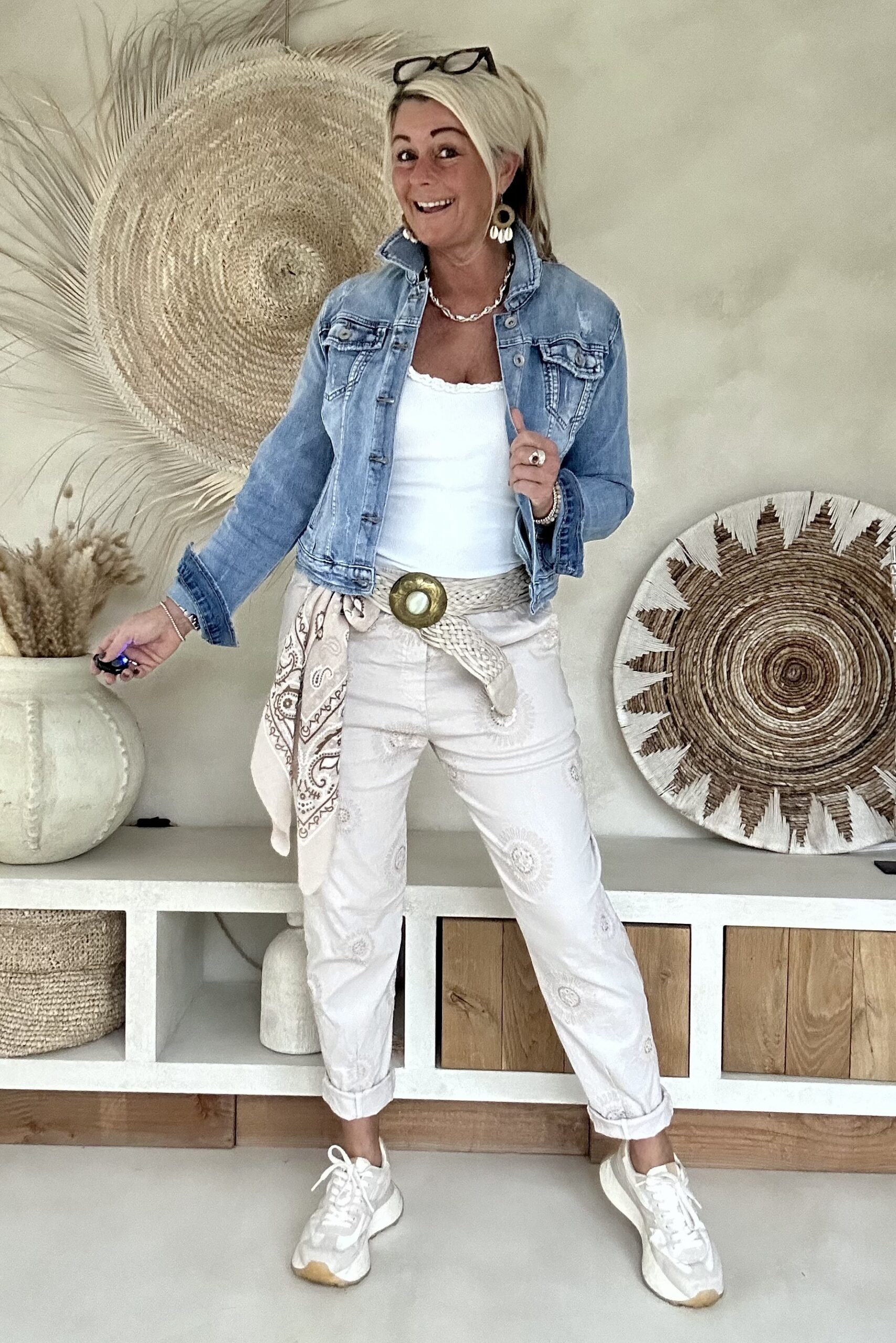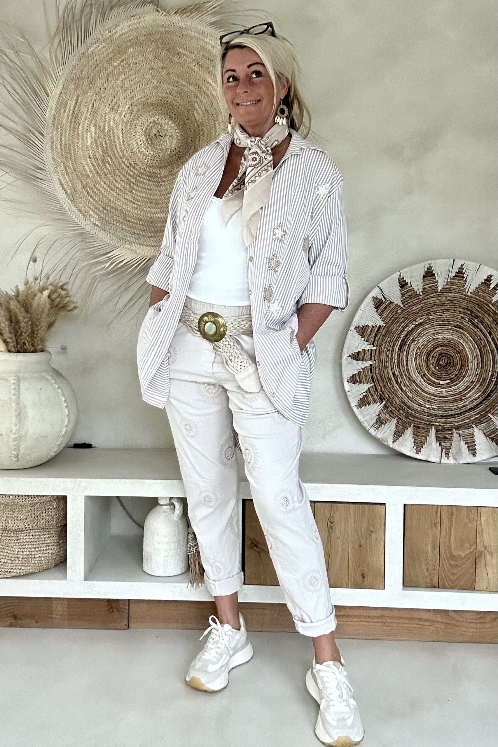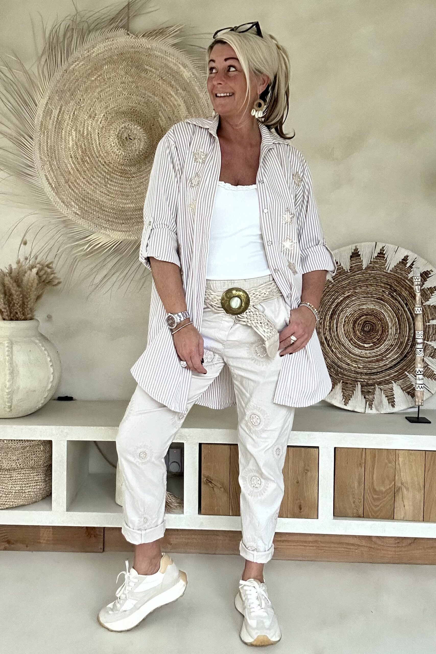Deze super comfy stretchbroek is er eentje waar je meteen in wilt wonen. De zachte, soepele stof met veel stretch zorgt voor een heerlijk draagcomfort, terwijl de mooie borduursels en subtiele pailletjes net dat extra detail geven. De broek heeft een ontspannen uitstraling, maar oogt toch verzorgd en stijlvol.