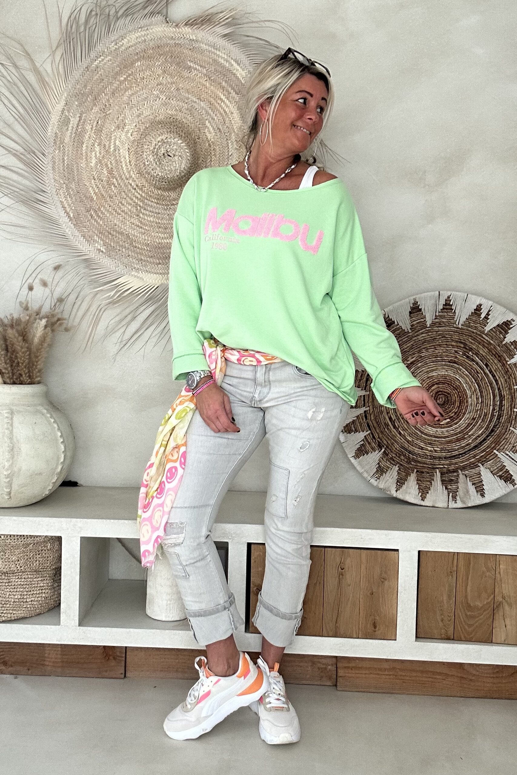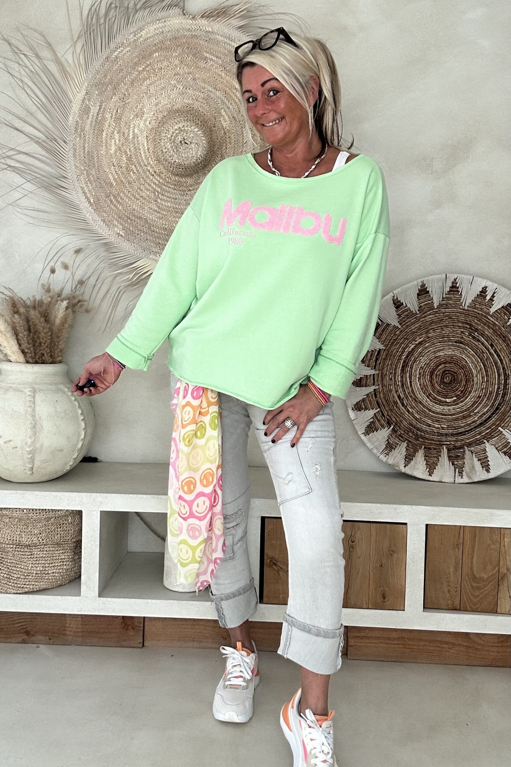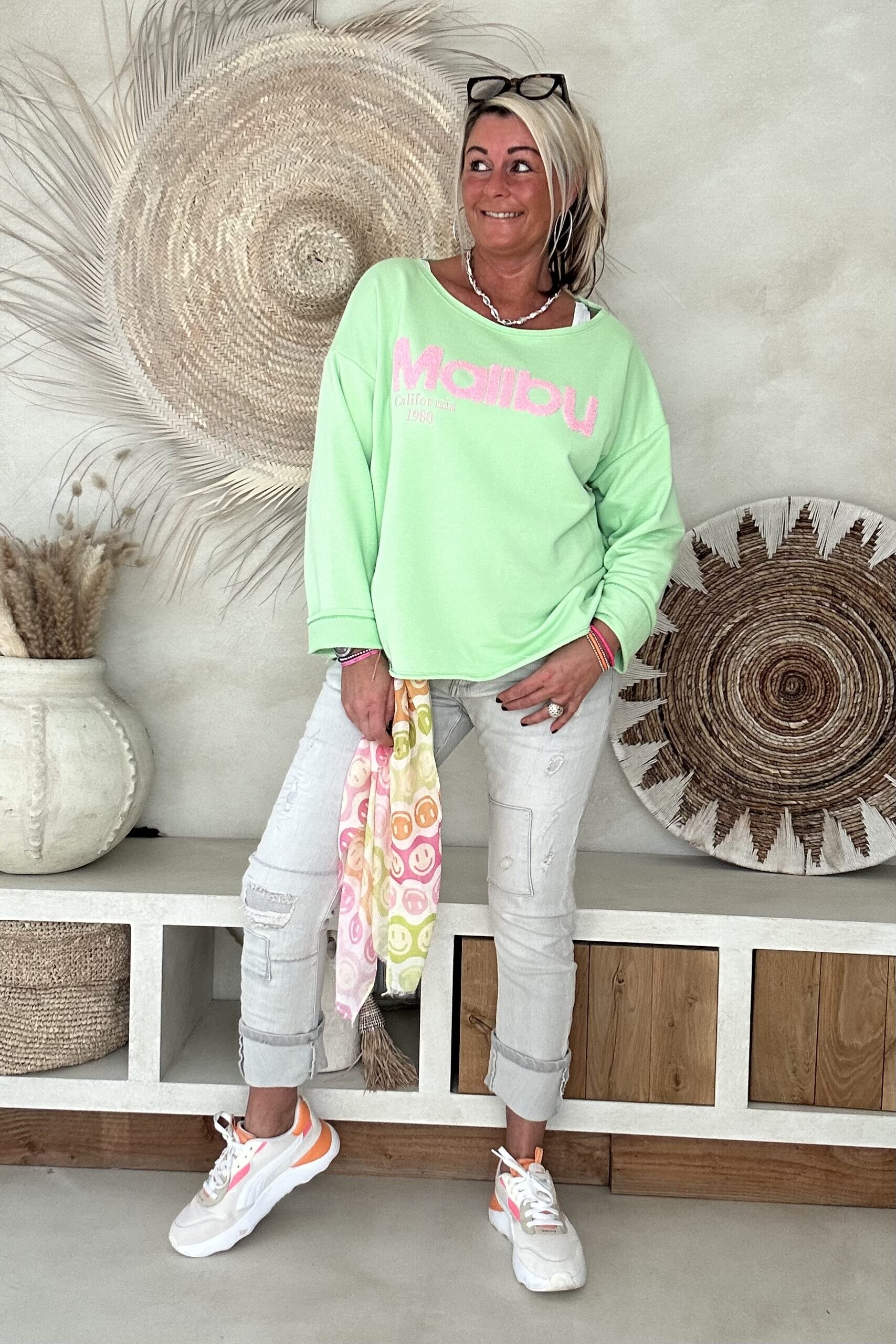 Deze heerlijke sweater is de perfecte mix van comfy en casual met een speelse twist. De opvallende “Malibu” opdruk in zachte roze badstof letters geeft een vrolijke, zomerse vibe en zorgt voor een subtiel 3D-effect. De sweater heeft een relaxte pasvorm en een wijde hals die nonchalant off-shoulder gedragen kan worden voor een extra vrouwelijke touch.