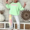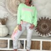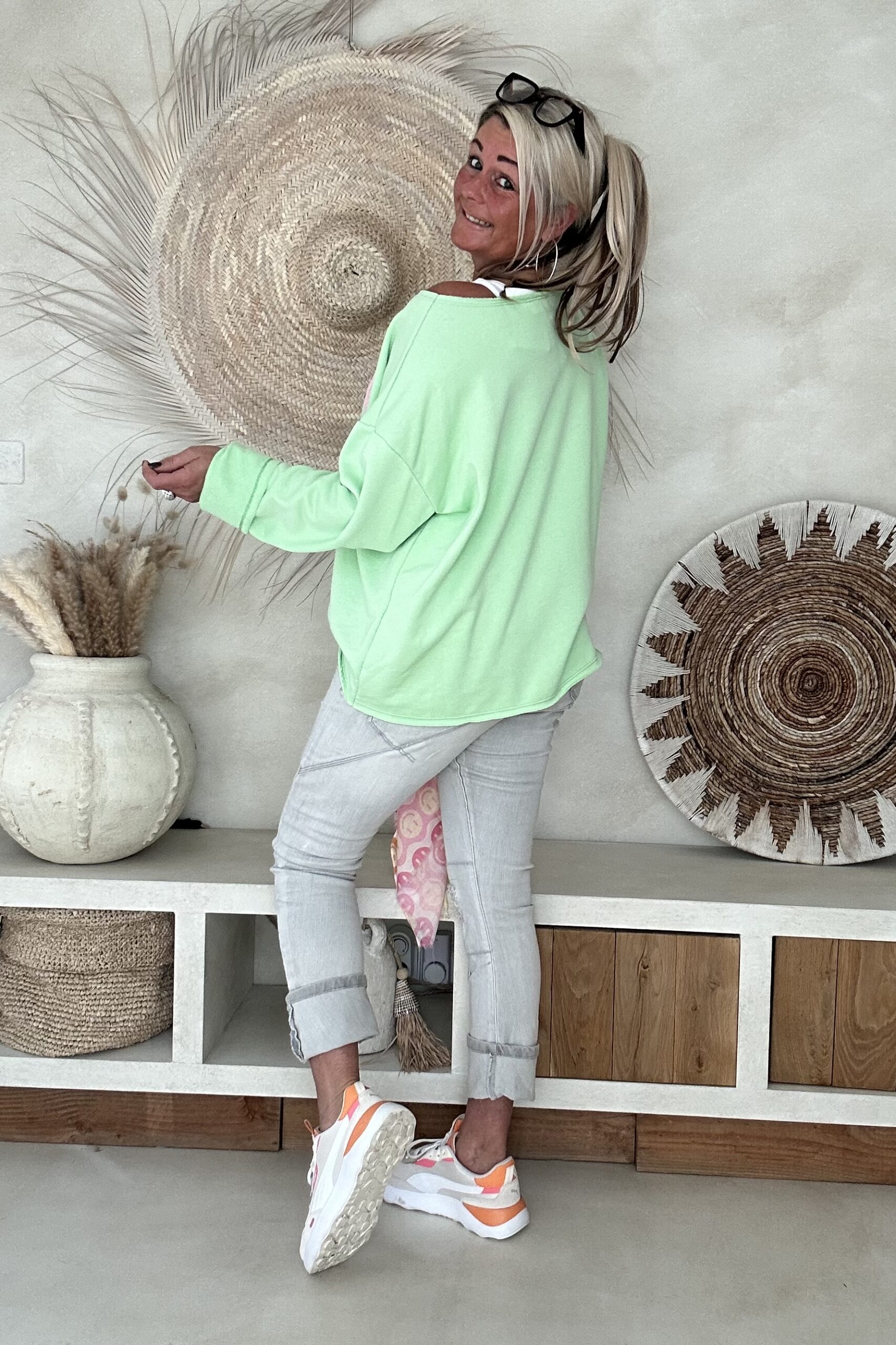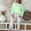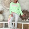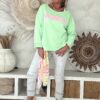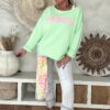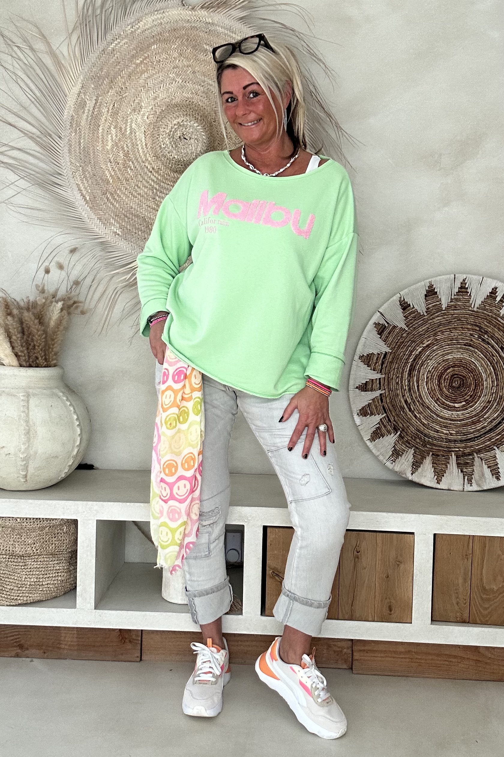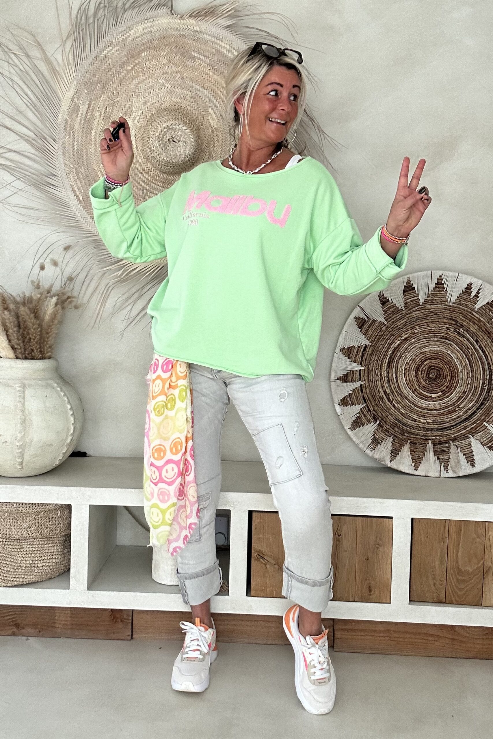 Deze heerlijke sweater is de perfecte mix van comfy en casual met een speelse twist. De opvallende “Malibu” opdruk in zachte roze badstof letters geeft een vrolijke, zomerse vibe en zorgt voor een subtiel 3D-effect. De sweater heeft een relaxte pasvorm en een wijde hals die nonchalant off-shoulder gedragen kan worden voor een extra vrouwelijke touch.