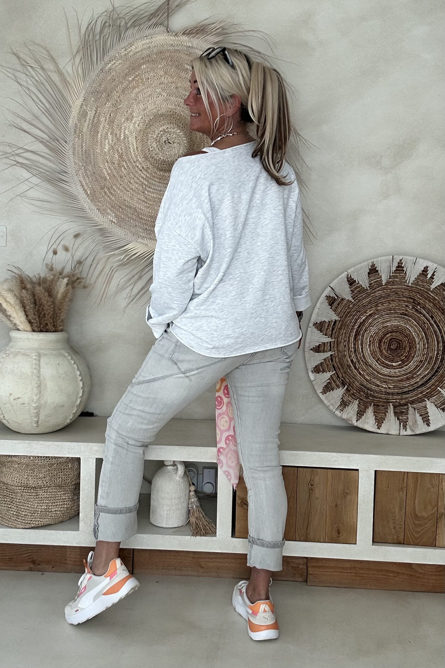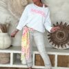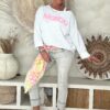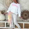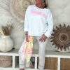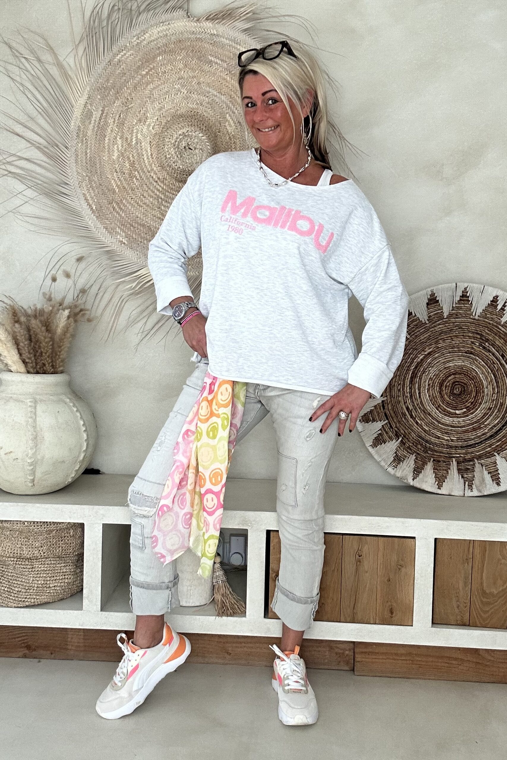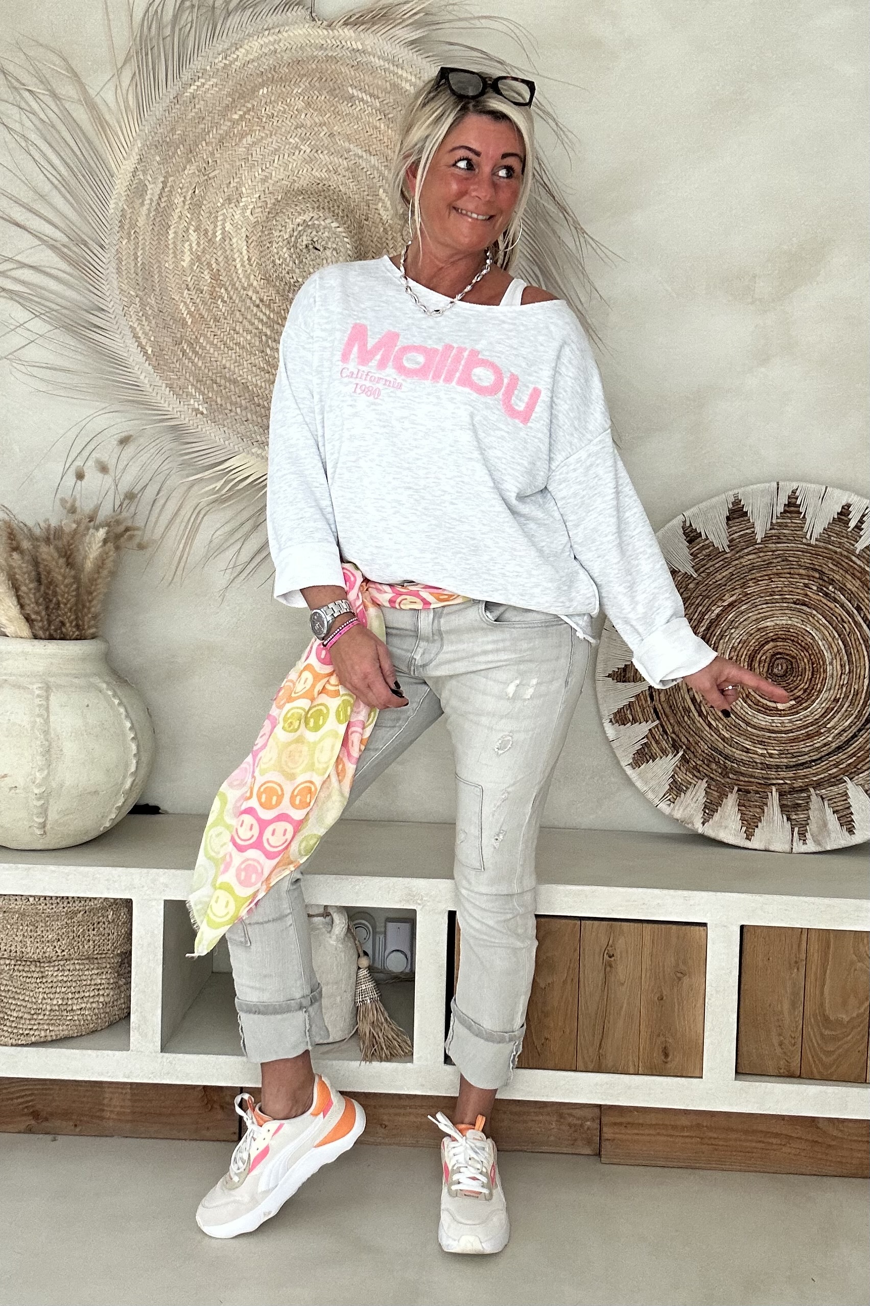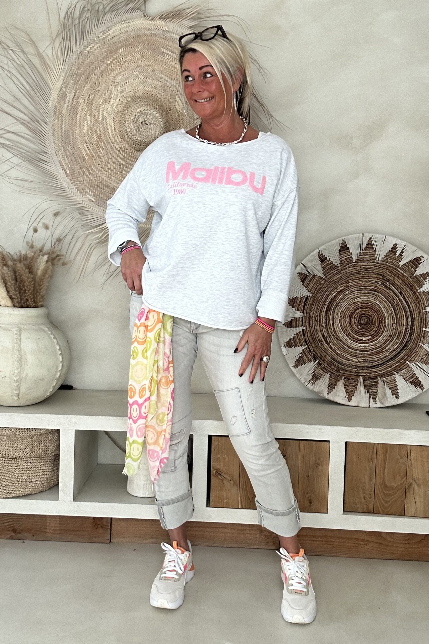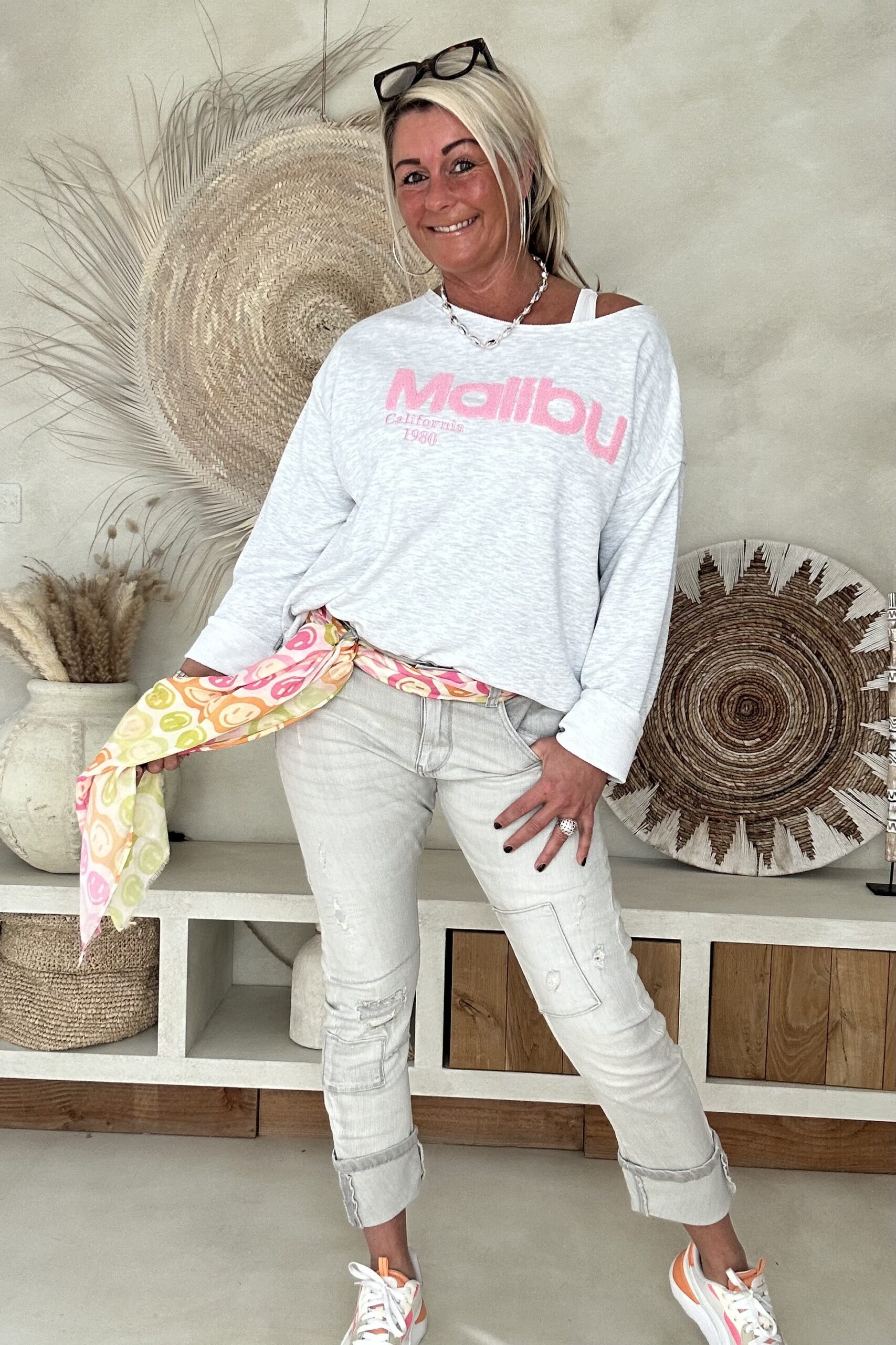 Deze heerlijke sweater is de perfecte mix van comfy en casual met een speelse twist. De opvallende “Malibu” opdruk in zachte roze badstof letters geeft een vrolijke, zomerse vibe en zorgt voor een subtiel 3D-effect. De sweater heeft een relaxte pasvorm en een wijde hals die nonchalant off-shoulder gedragen kan worden voor een extra vrouwelijke touch.