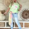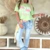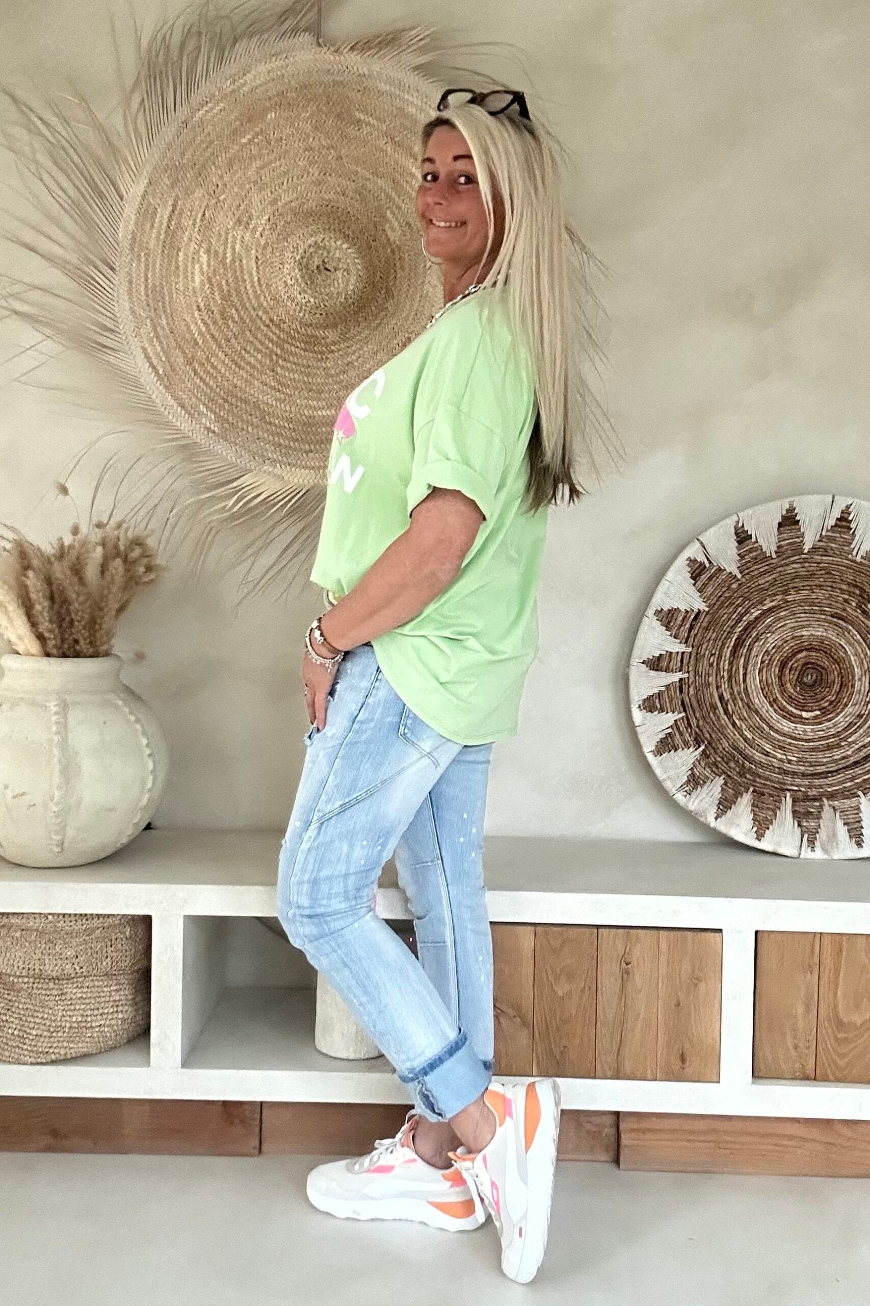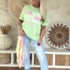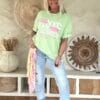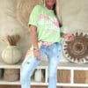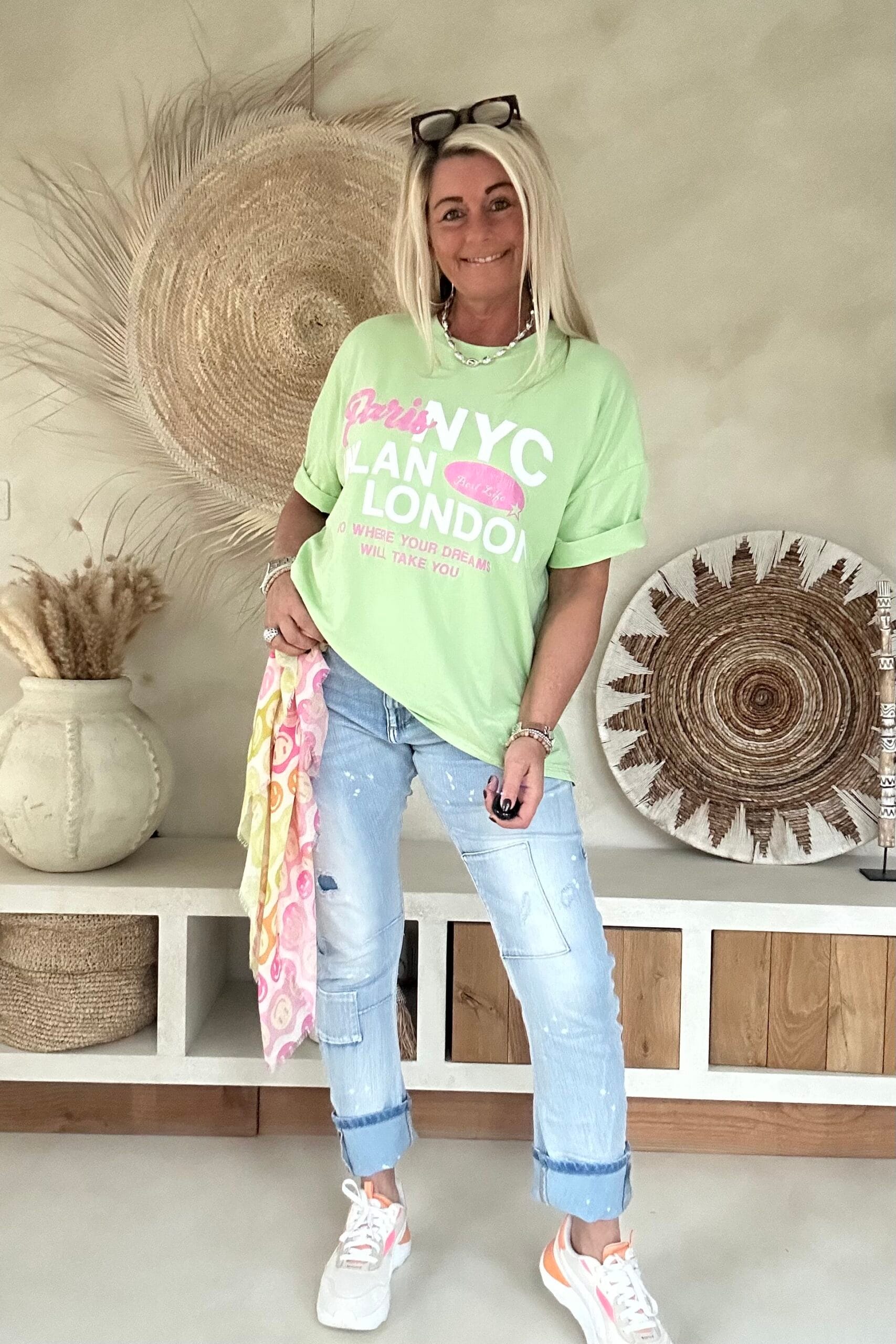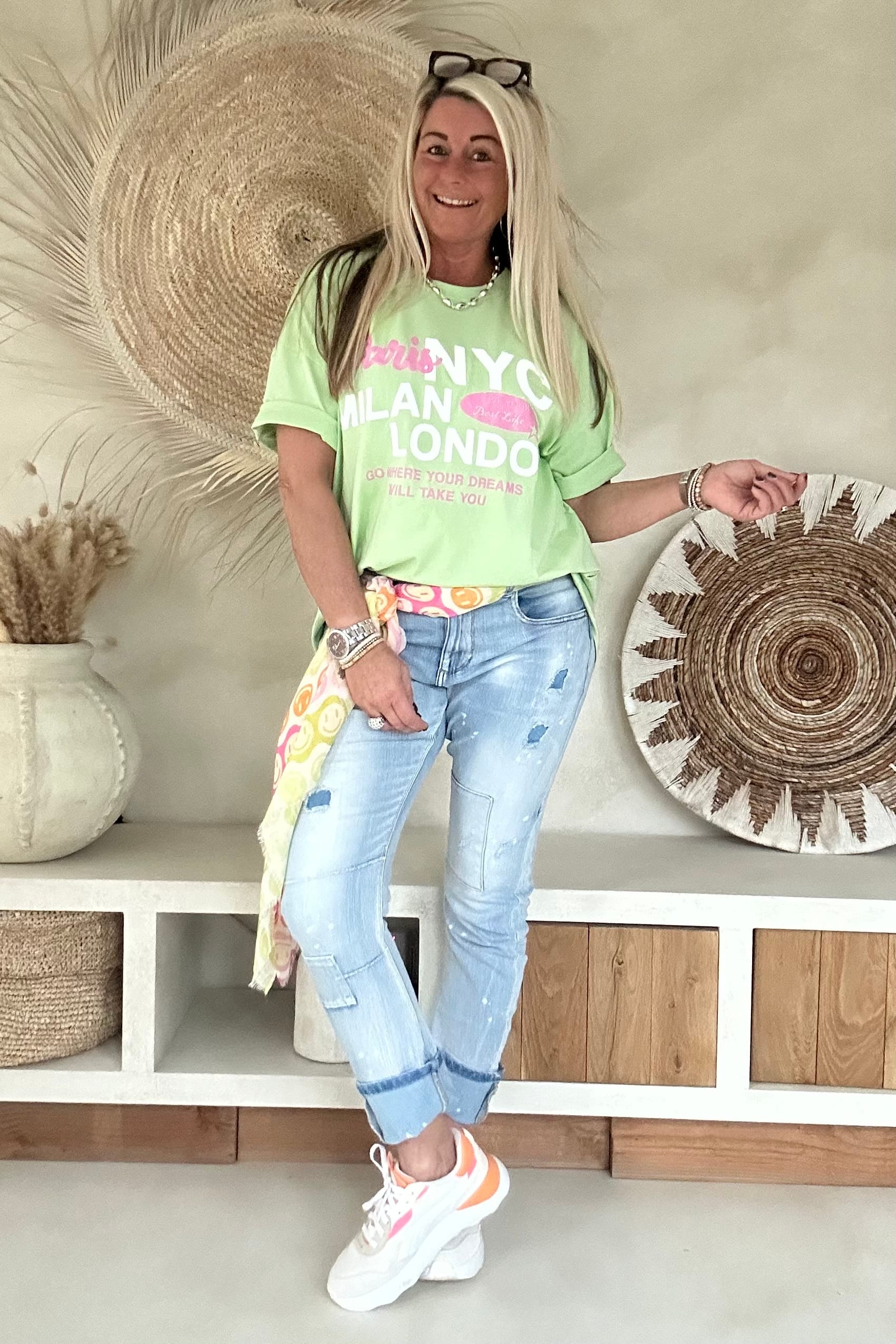 Dit ruimvallende T-shirt is zo’n item waar je meteen blij van wordt. De speelse foam opdruk met steden als Paris, NYC, Milan en London geeft het shirt een frisse, trendy uitstraling. Door de elastische kwaliteit draagt het heerlijk comfortabel en de achterkant valt iets langer dan de voorkant, wat zorgt voor een nonchalante en flatterende look. Perfect om los te dragen op een jeans of half in te steken voor een casual vibe.