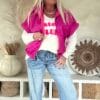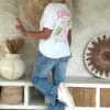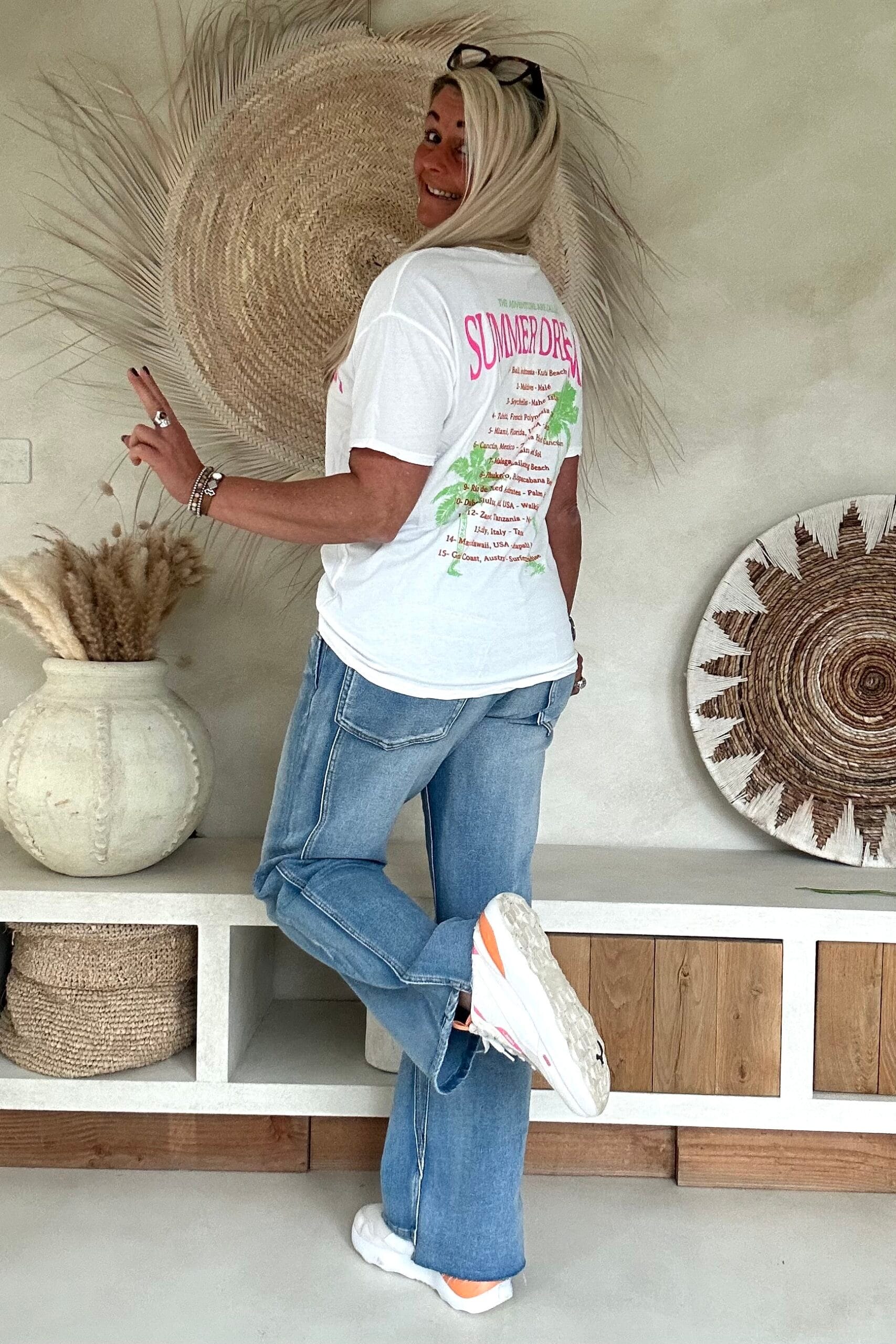 Dit T-shirt ademt zomer. Het zachte katoen draagt heerlijk comfortabel en de relaxte fit maakt ’m perfect voor elke dag. De “Summer Dream” print op de voorzijde geeft meteen dat zonnige gevoel. Op de rug staat een uitgebreide print met een echte bucketlist aan droombestemmingen – denk aan Bali, Seychellen, Tahiti en meer – die het shirt een speelse en verrassende twist geeft. Super leuk op een jeans, maar ook perfect onder een jackje of bodywarmer.