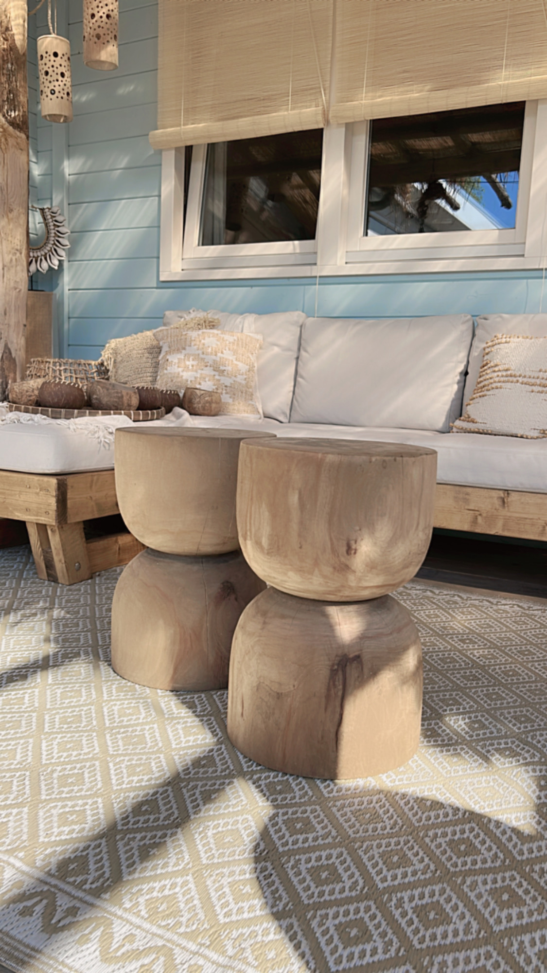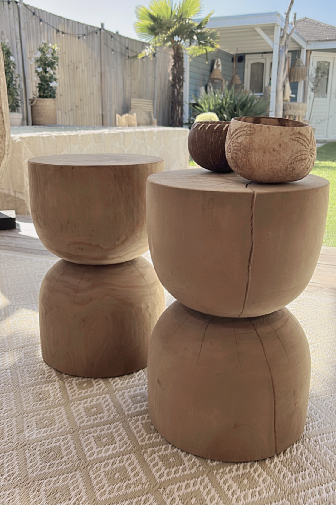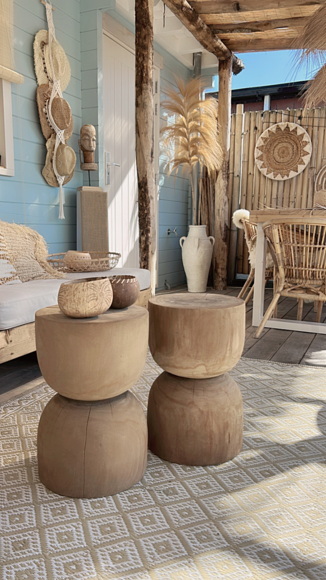 Deze robuuste kruk van massief teakhout is een echte alleskunner. Met zijn elegante diabolo-vorm en warme houttekening is hij niet alleen functioneel, maar ook een decoratief statement in je interieur of onder de overkapping. Gebruik hem als bijzettafel, als verhoging voor je favoriete plant of gewoon als extra zitplek tijdens een gezellige borrel.