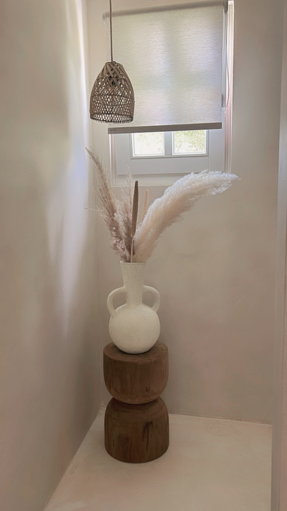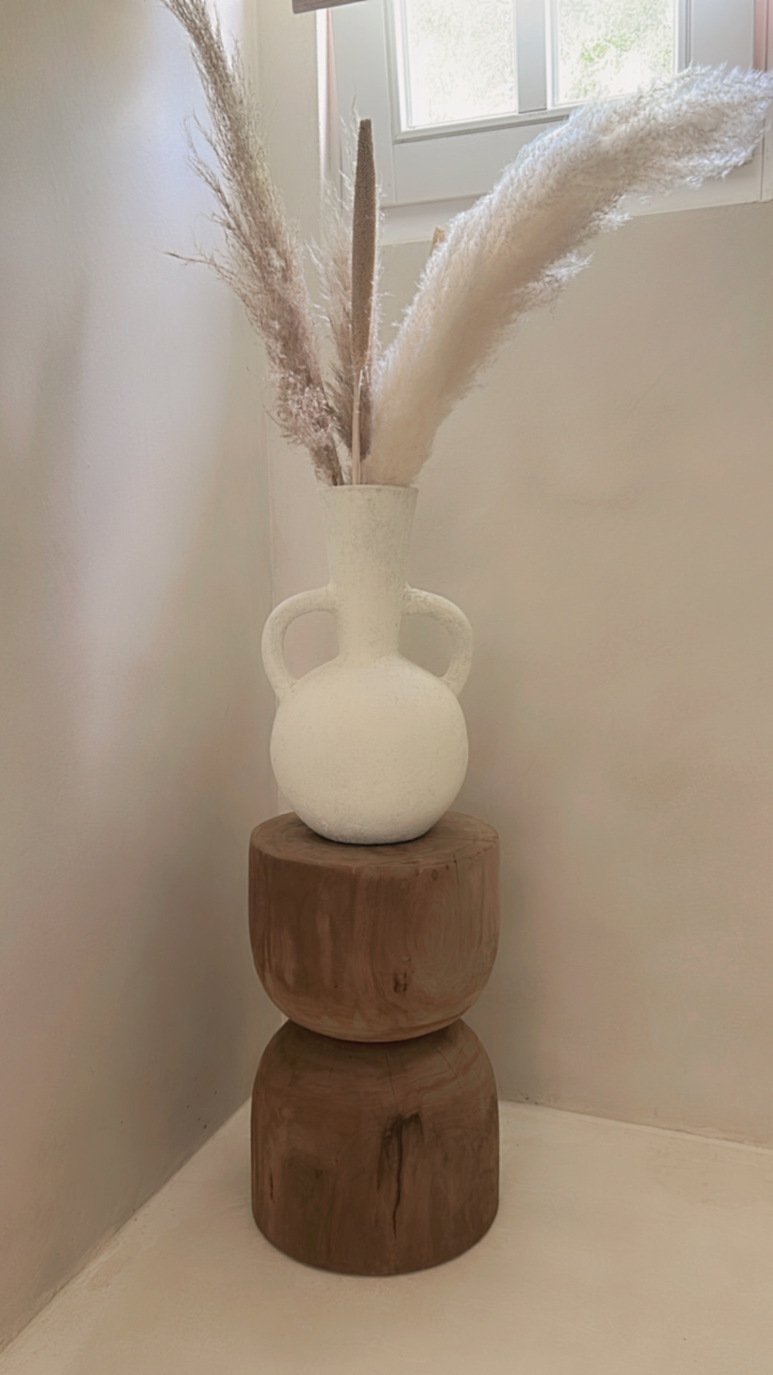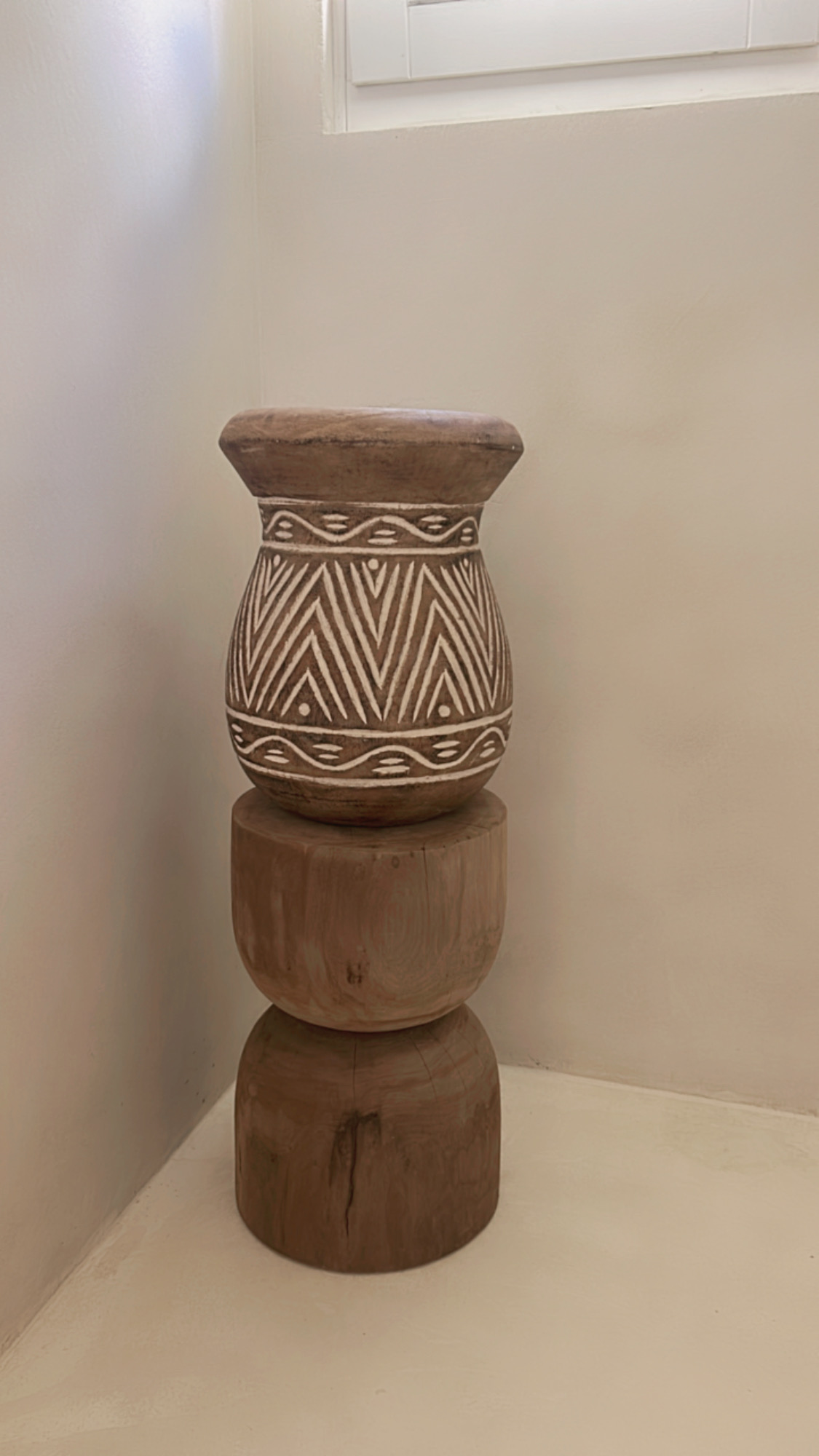 Deze robuuste kruk van massief teakhout is een echte alleskunner. Met zijn elegante diabolo-vorm en warme houttekening is hij niet alleen functioneel, maar ook een decoratief statement in je interieur of onder de overkapping. Gebruik hem als bijzettafel, als verhoging voor je favoriete plant of gewoon als extra zitplek tijdens een gezellige borrel.
