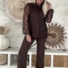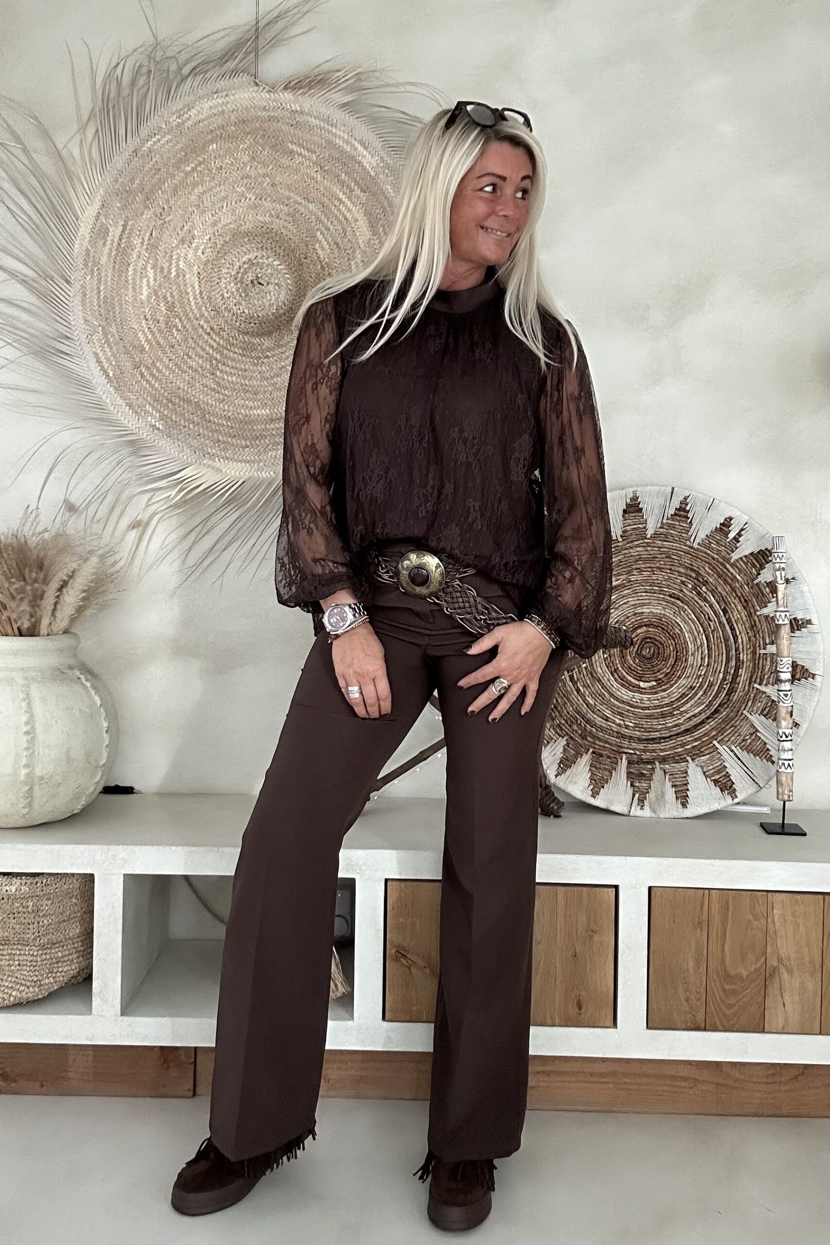 Een romantische kanten top met hooggesloten hals, gevoerd lijf en sierlijke semi-transparante mouwen. De elegante bloemkant geeft een vrouwelijke, verfijnde uitstraling, terwijl de zachte voering zorgt voor comfortabel draaggemak. Een tijdloze top die zowel chic als stoer te combineren is.