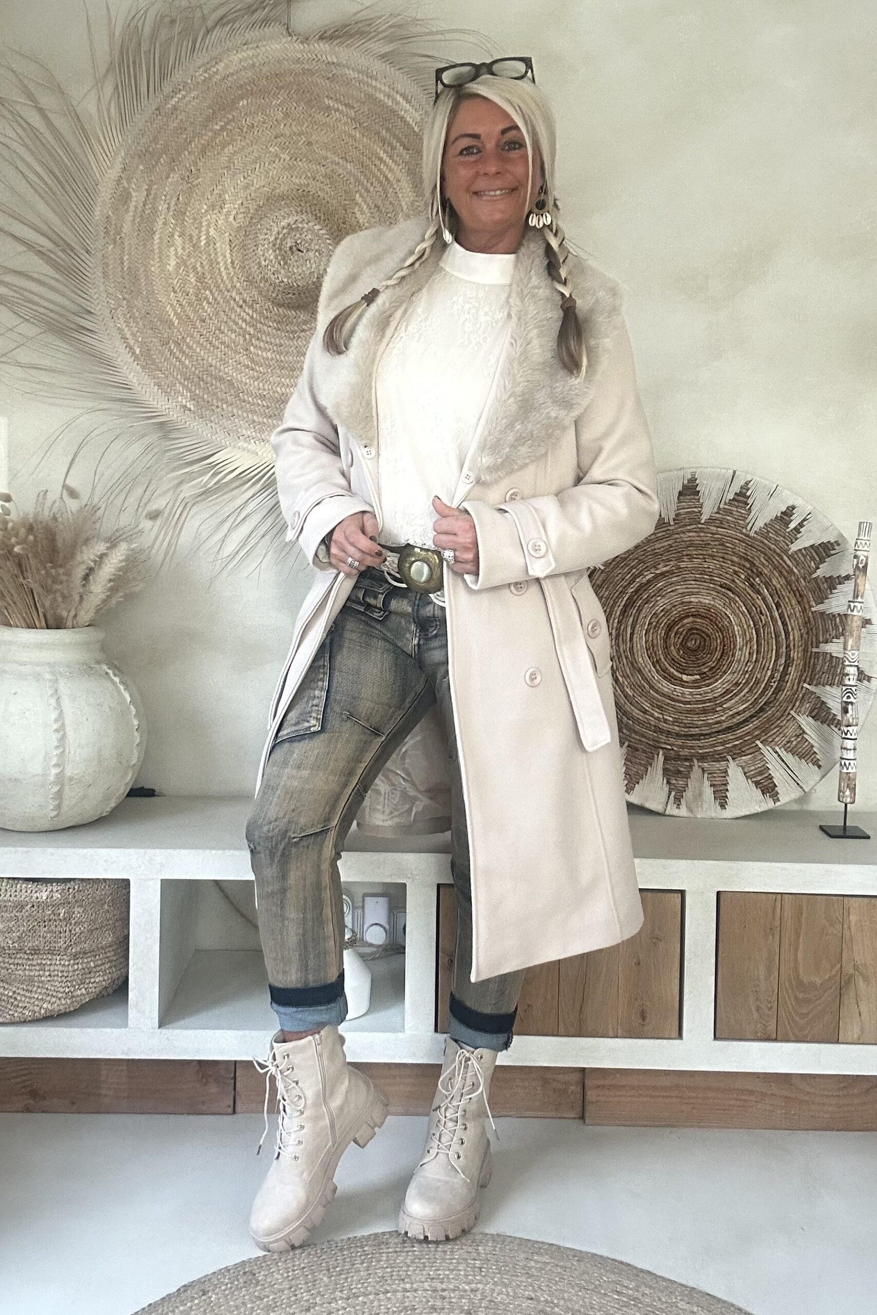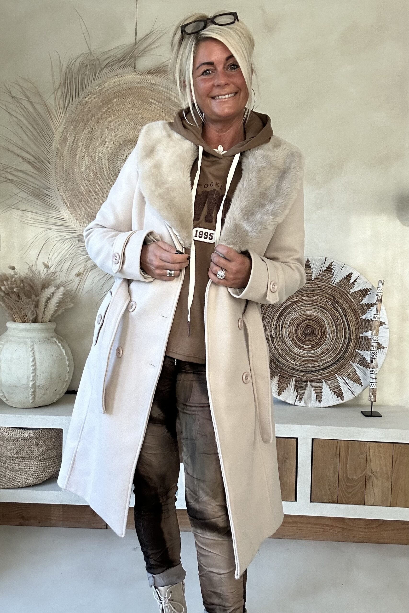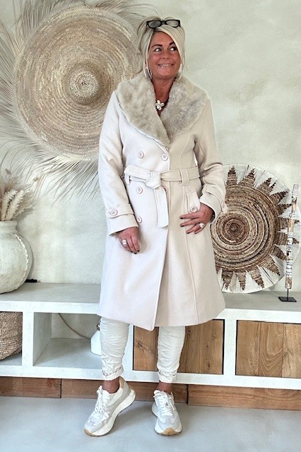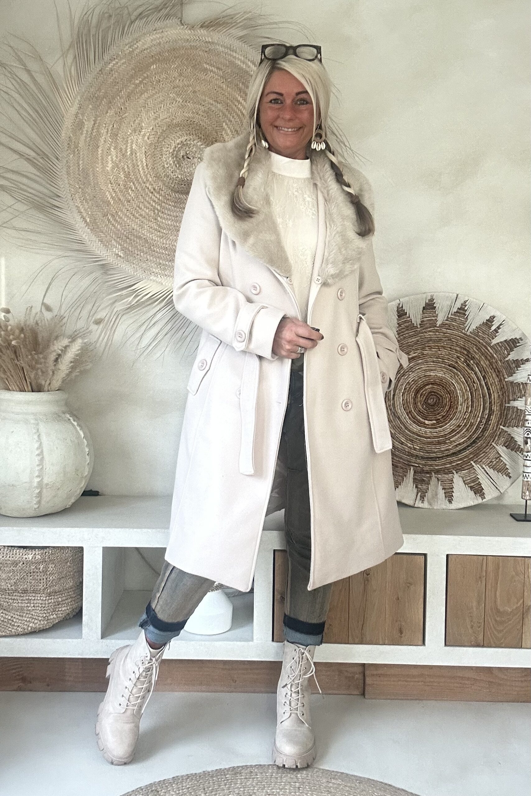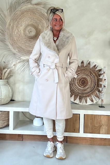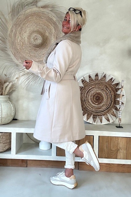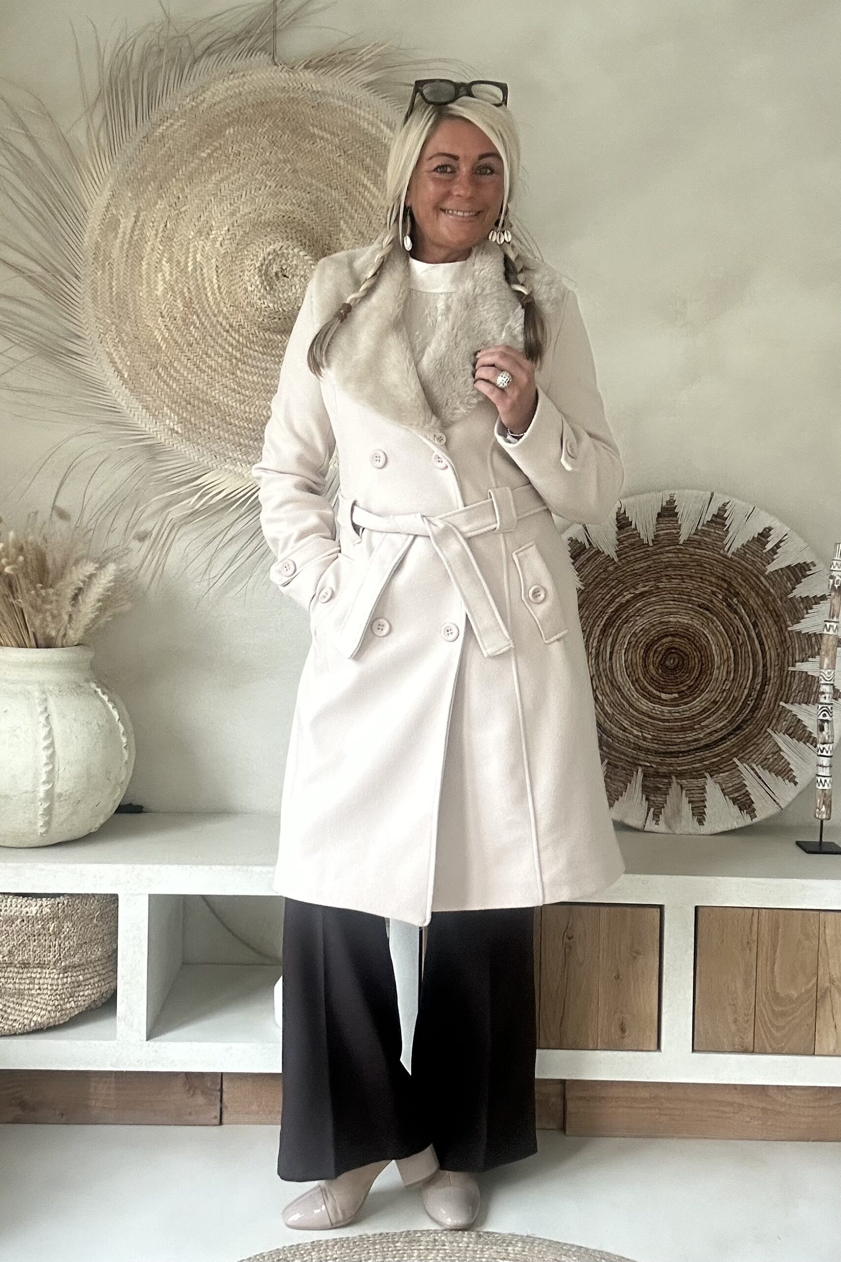 Deze elegante trenchcoat is een stijlvolle musthave voor het najaar en de winter. De soft beige kleur geeft een chique uitstraling en de afneembare fake fur kraag – bevestigd met knoopjes – zorgt voor een warme, luxe touch. Draag de jas met kraag voor een classy look of zonder voor een moderne, clean uitstraling. De dubbele rij knopen, ceintuur in de taille en flatterende pasvorm maken hem tijdloos én veelzijdig.