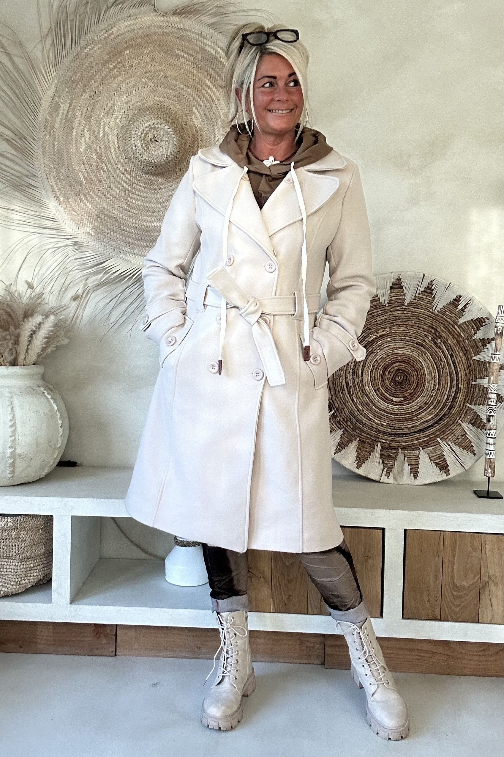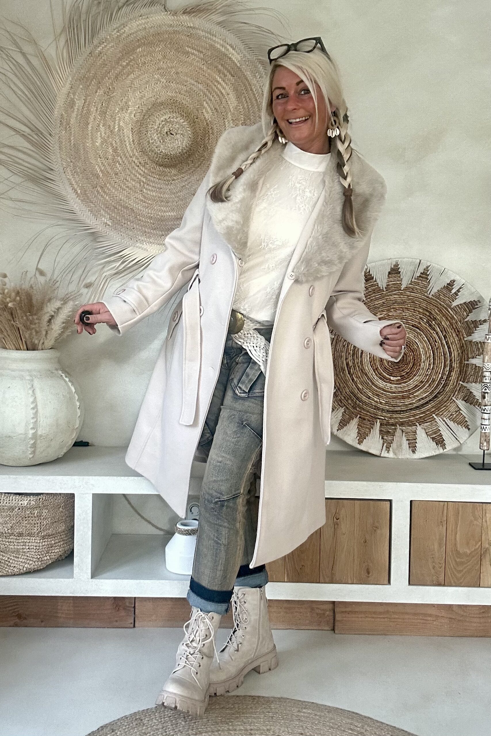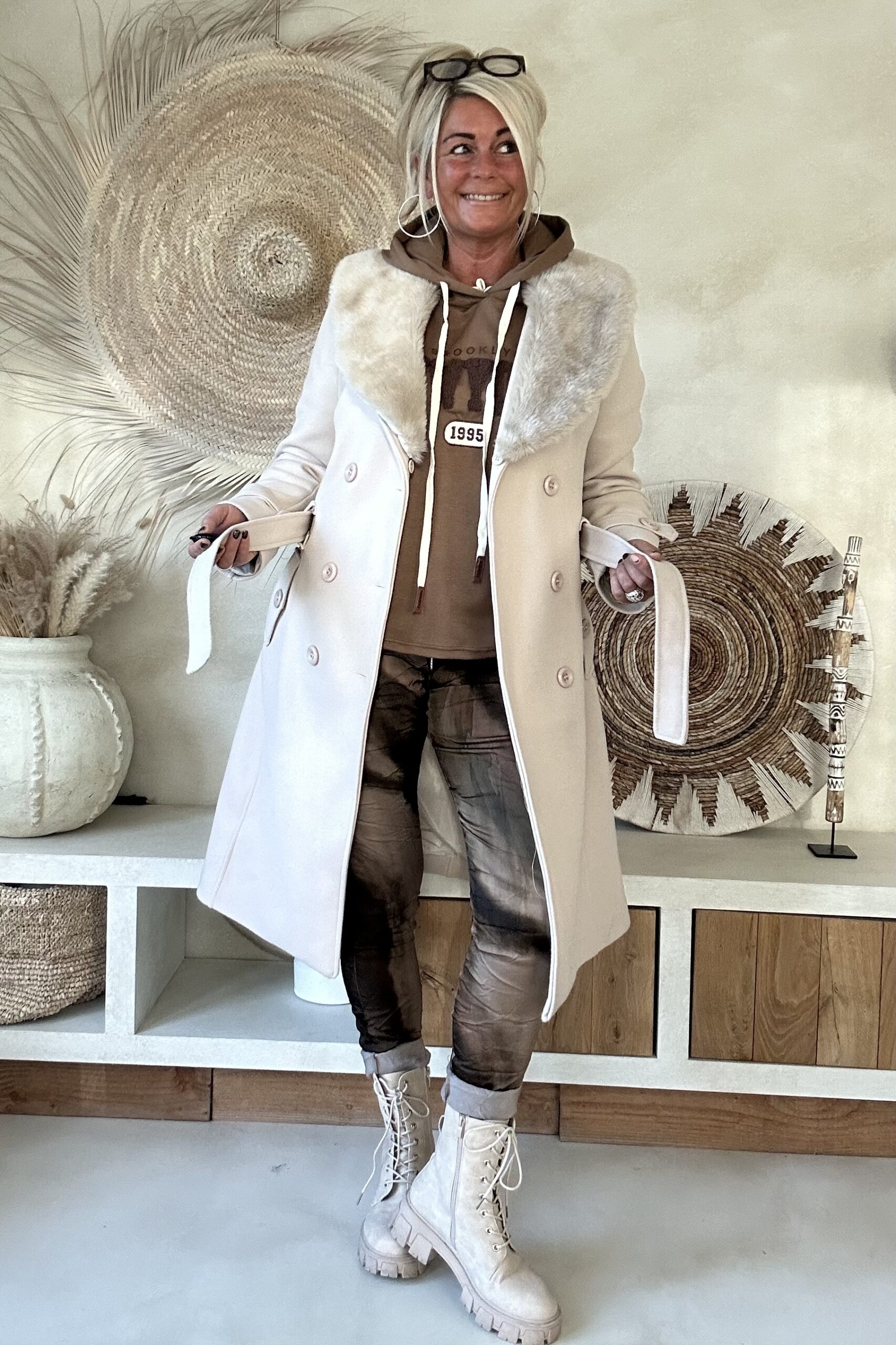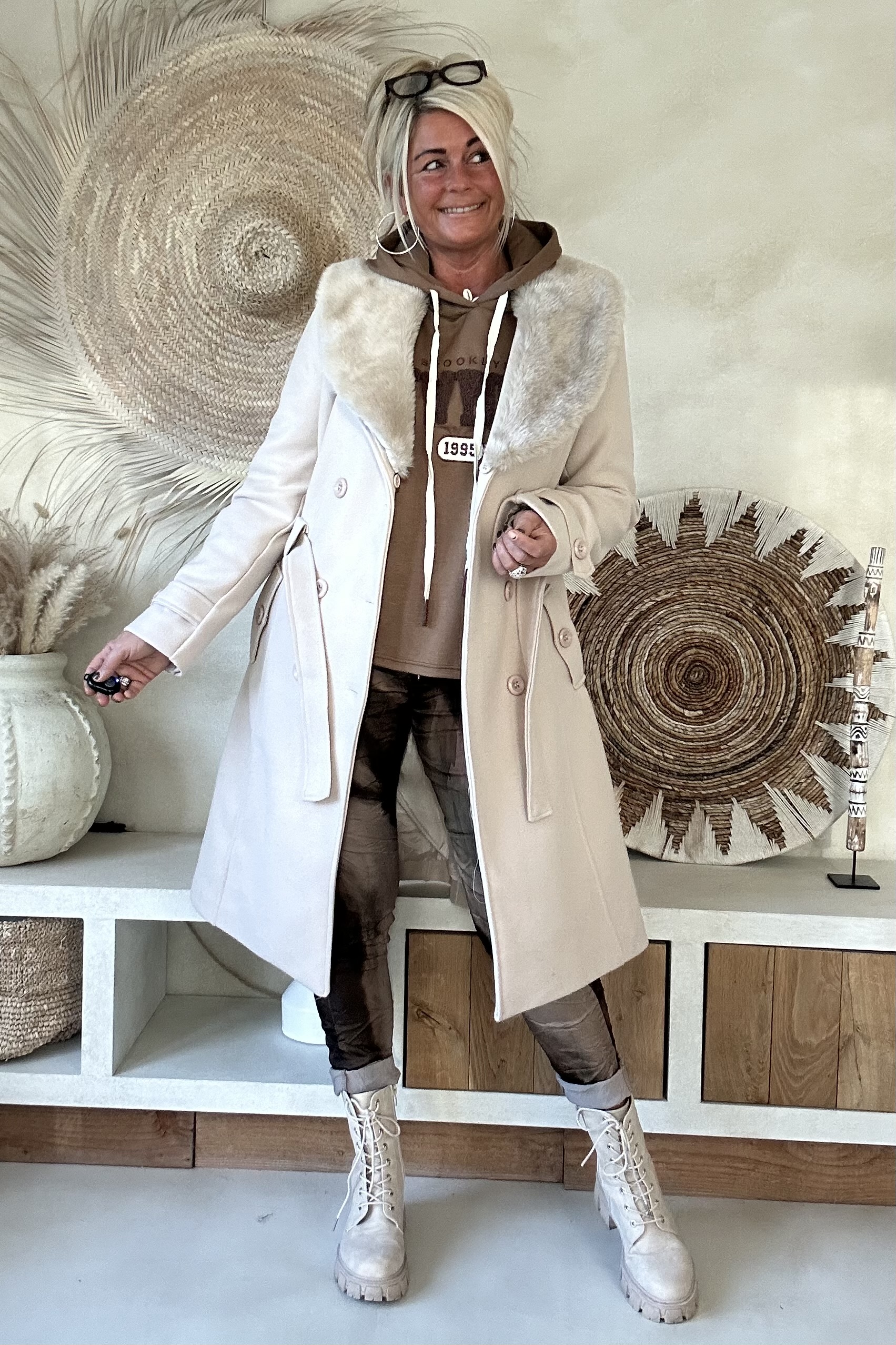 Deze elegante trenchcoat is een stijlvolle musthave voor het najaar en de winter. De soft beige kleur geeft een chique uitstraling en de afneembare fake fur kraag – bevestigd met knoopjes – zorgt voor een warme, luxe touch. Draag de jas met kraag voor een classy look of zonder voor een moderne, clean uitstraling. De dubbele rij knopen, ceintuur in de taille en flatterende pasvorm maken hem tijdloos én veelzijdig.