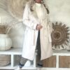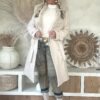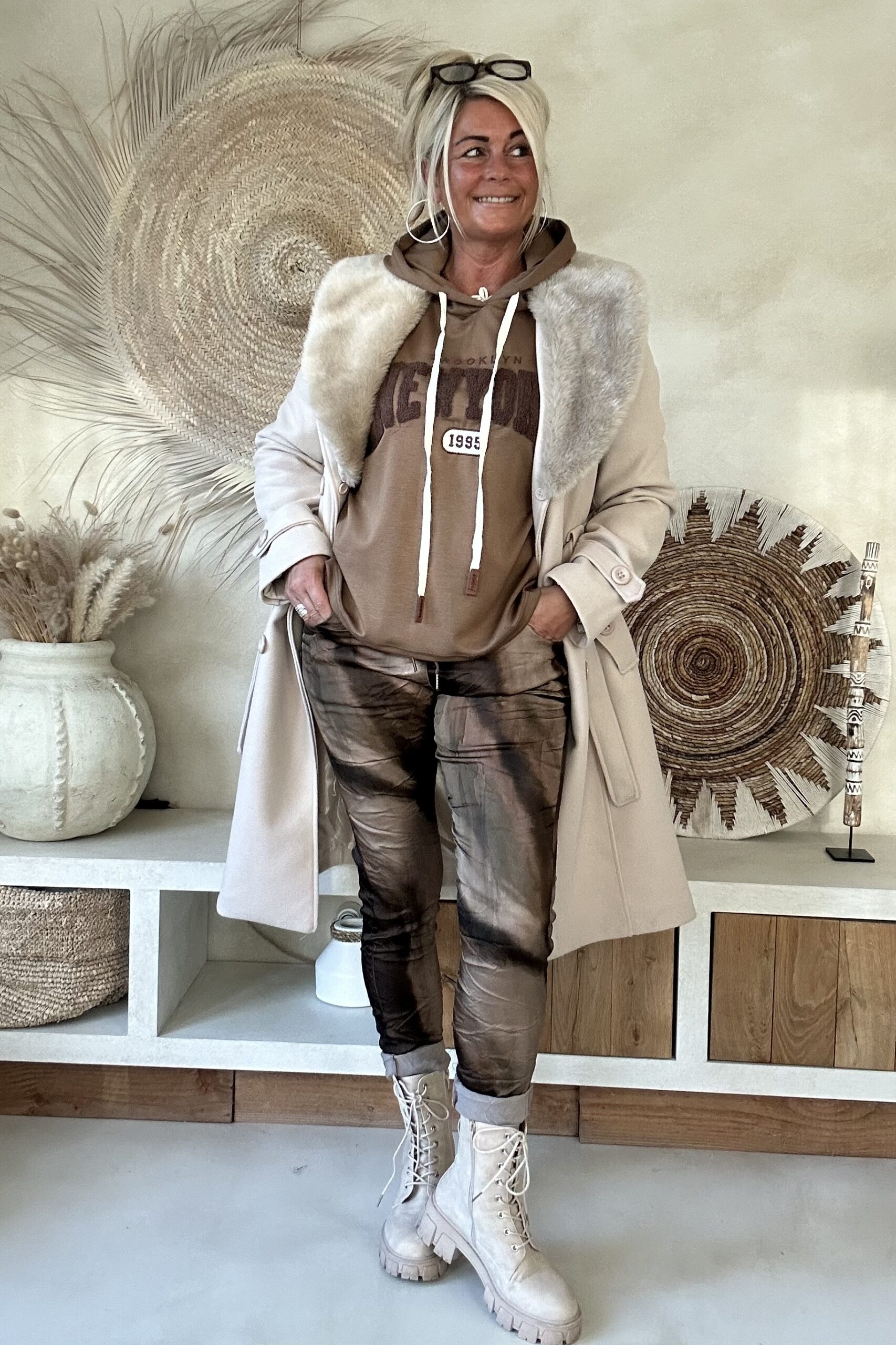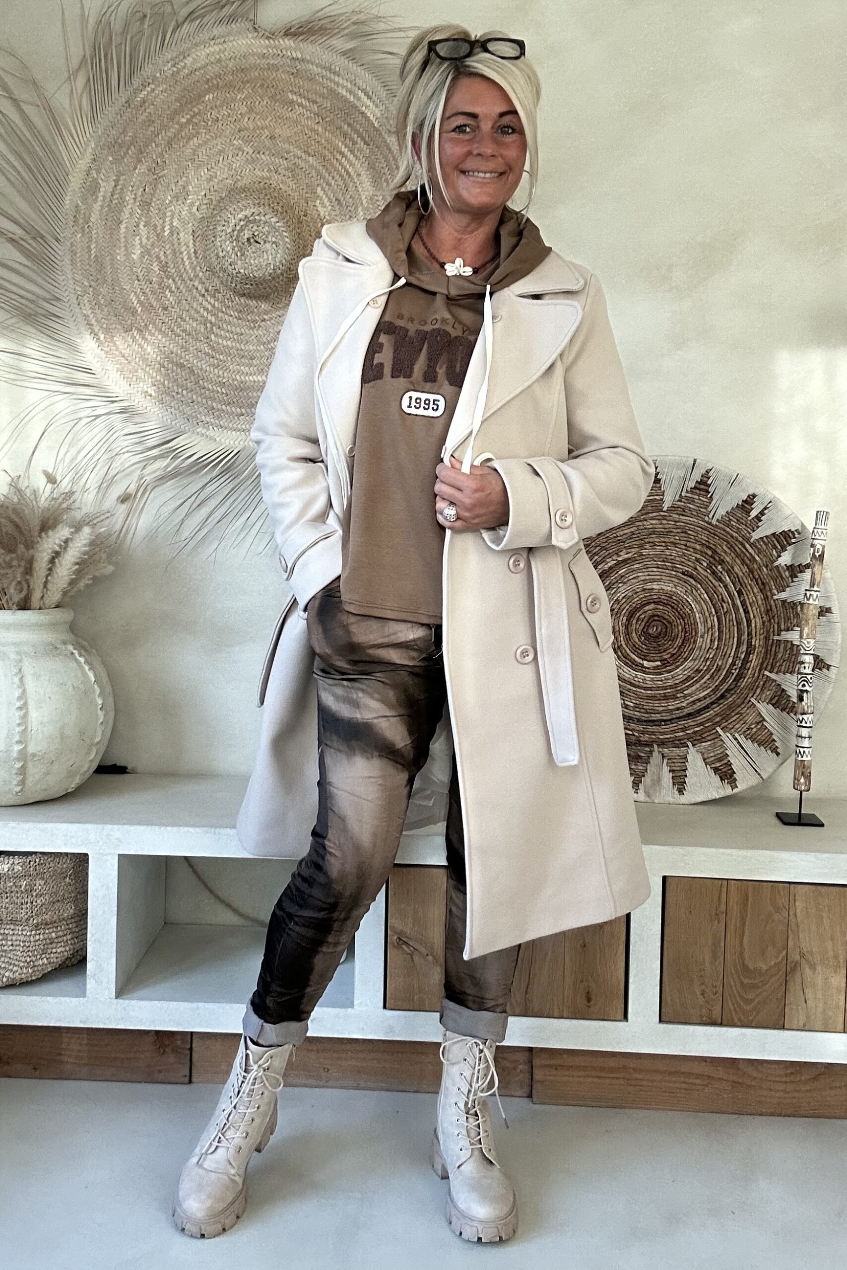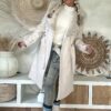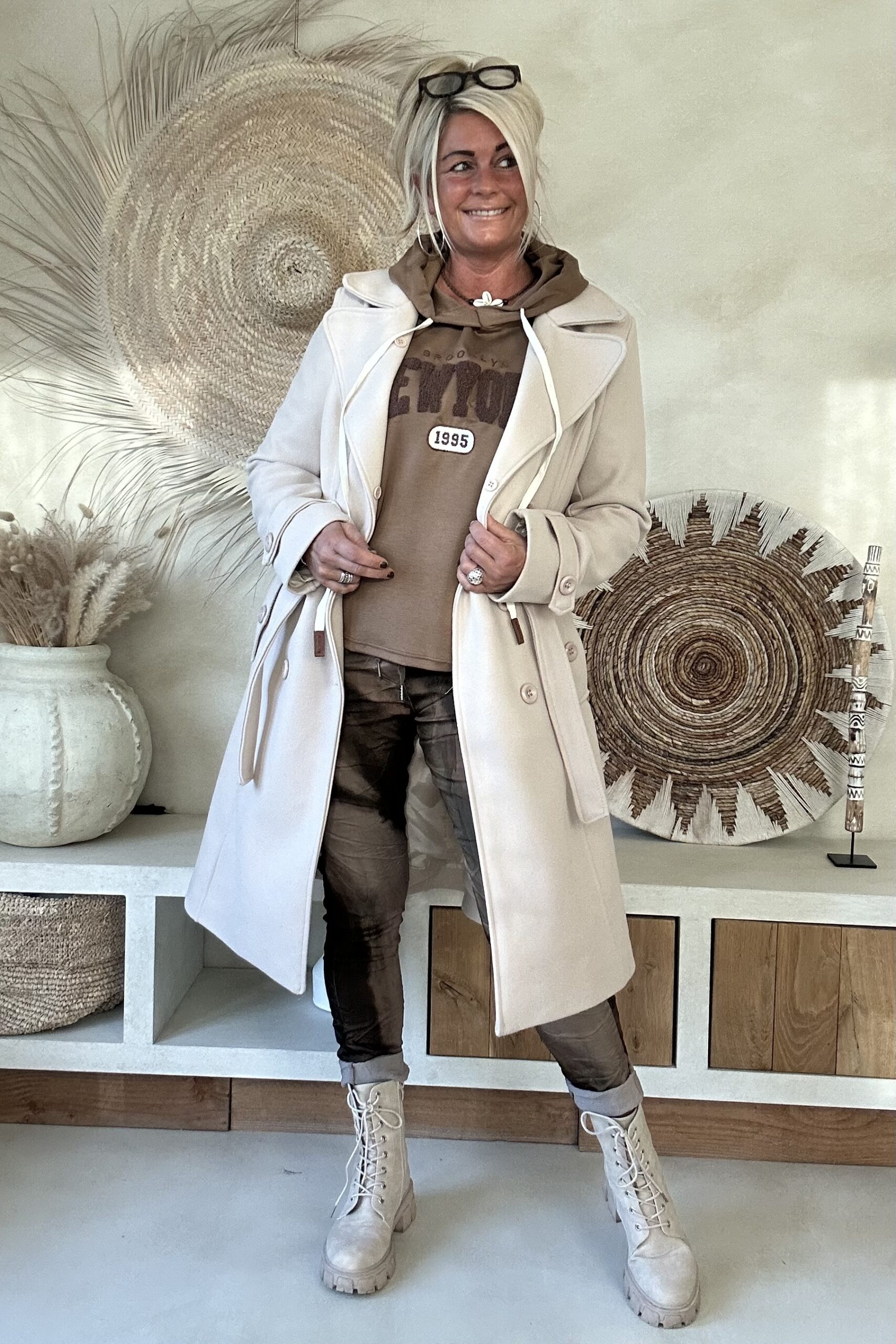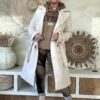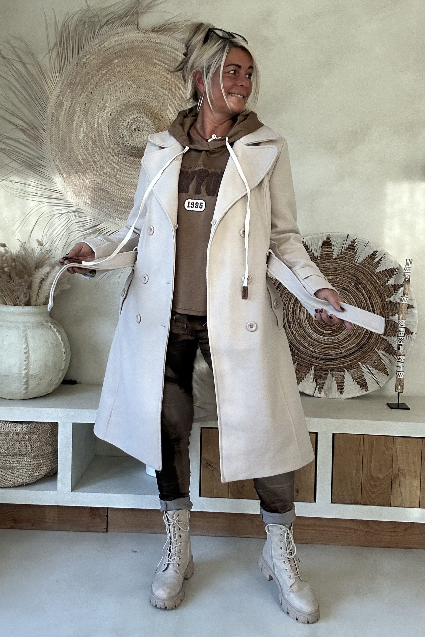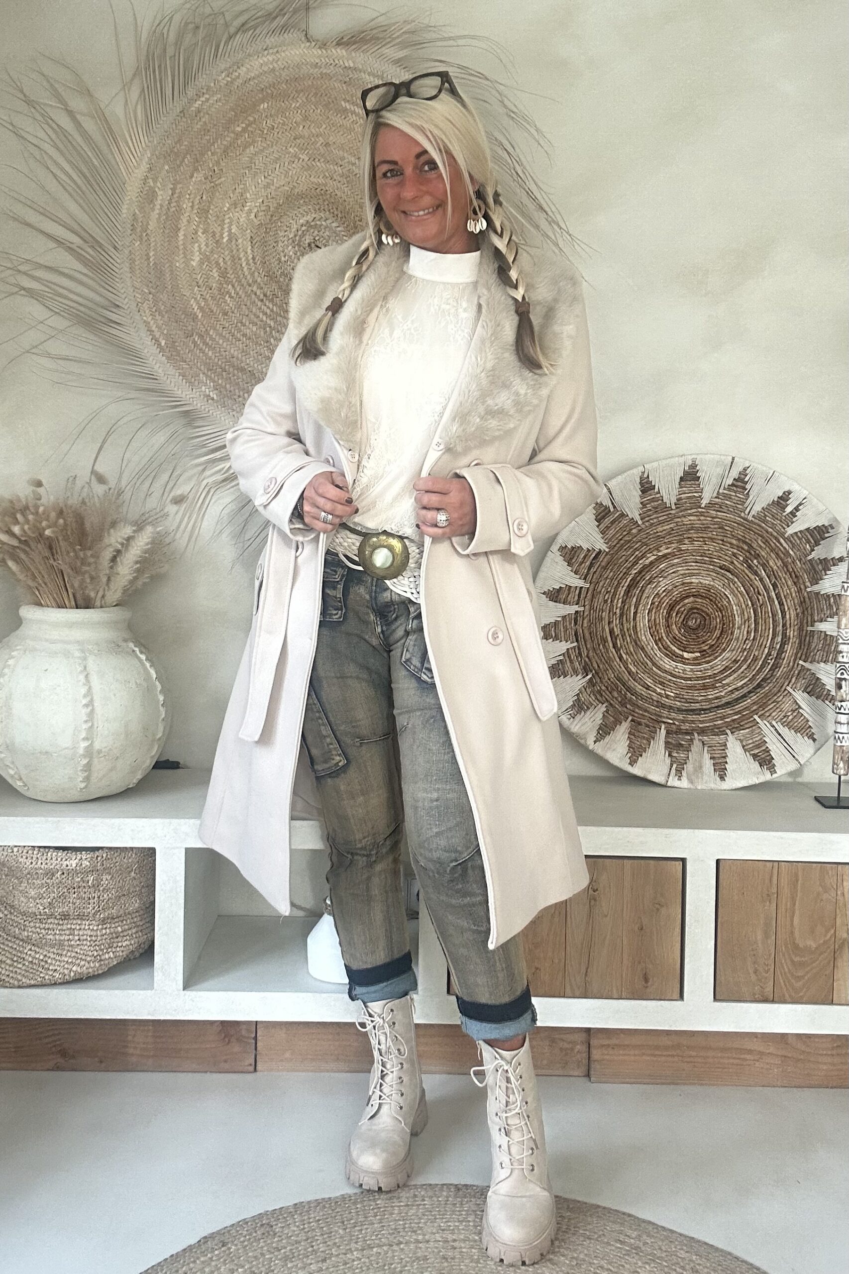 Deze elegante trenchcoat is een stijlvolle musthave voor het najaar en de winter. De soft beige kleur geeft een chique uitstraling en de afneembare fake fur kraag – bevestigd met knoopjes – zorgt voor een warme, luxe touch. Draag de jas met kraag voor een classy look of zonder voor een moderne, clean uitstraling. De dubbele rij knopen, ceintuur in de taille en flatterende pasvorm maken hem tijdloos én veelzijdig.