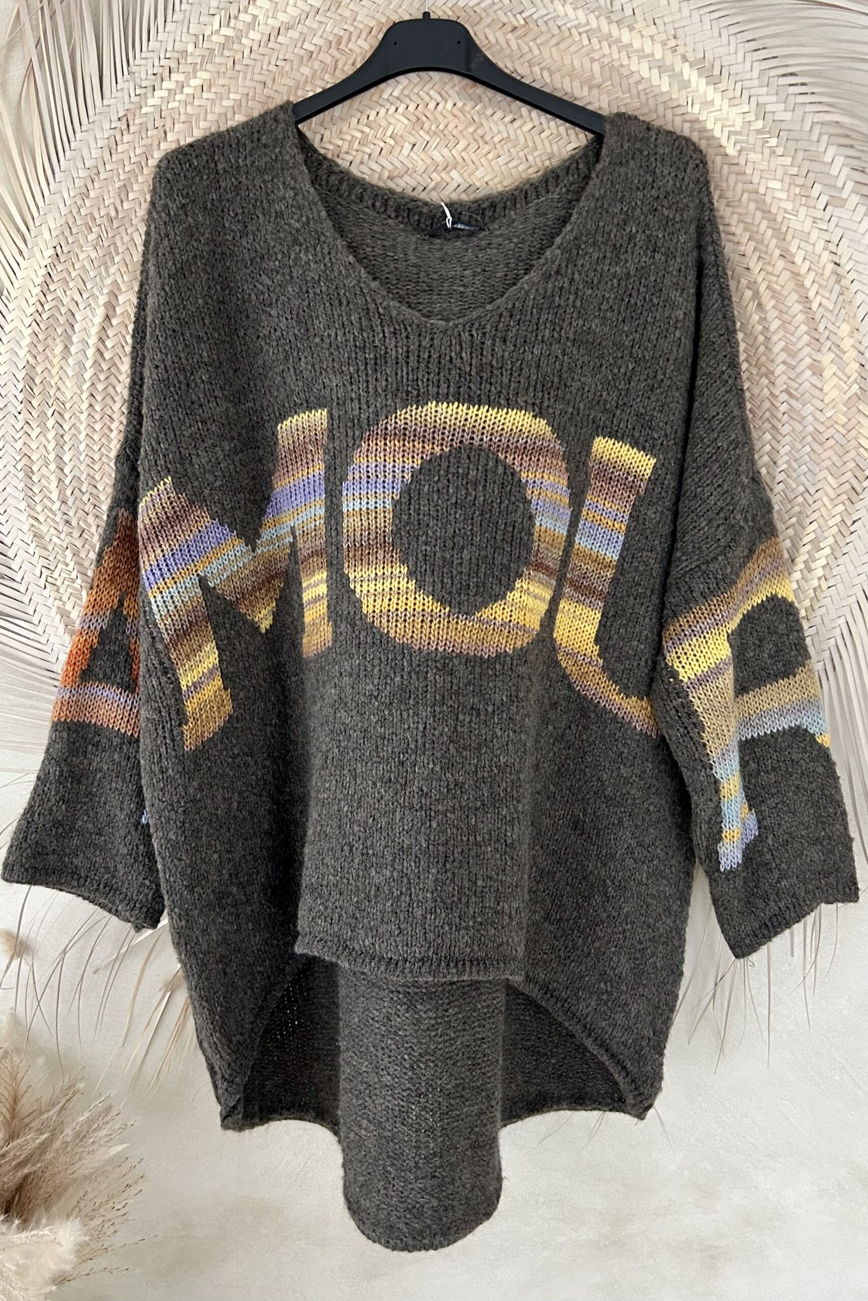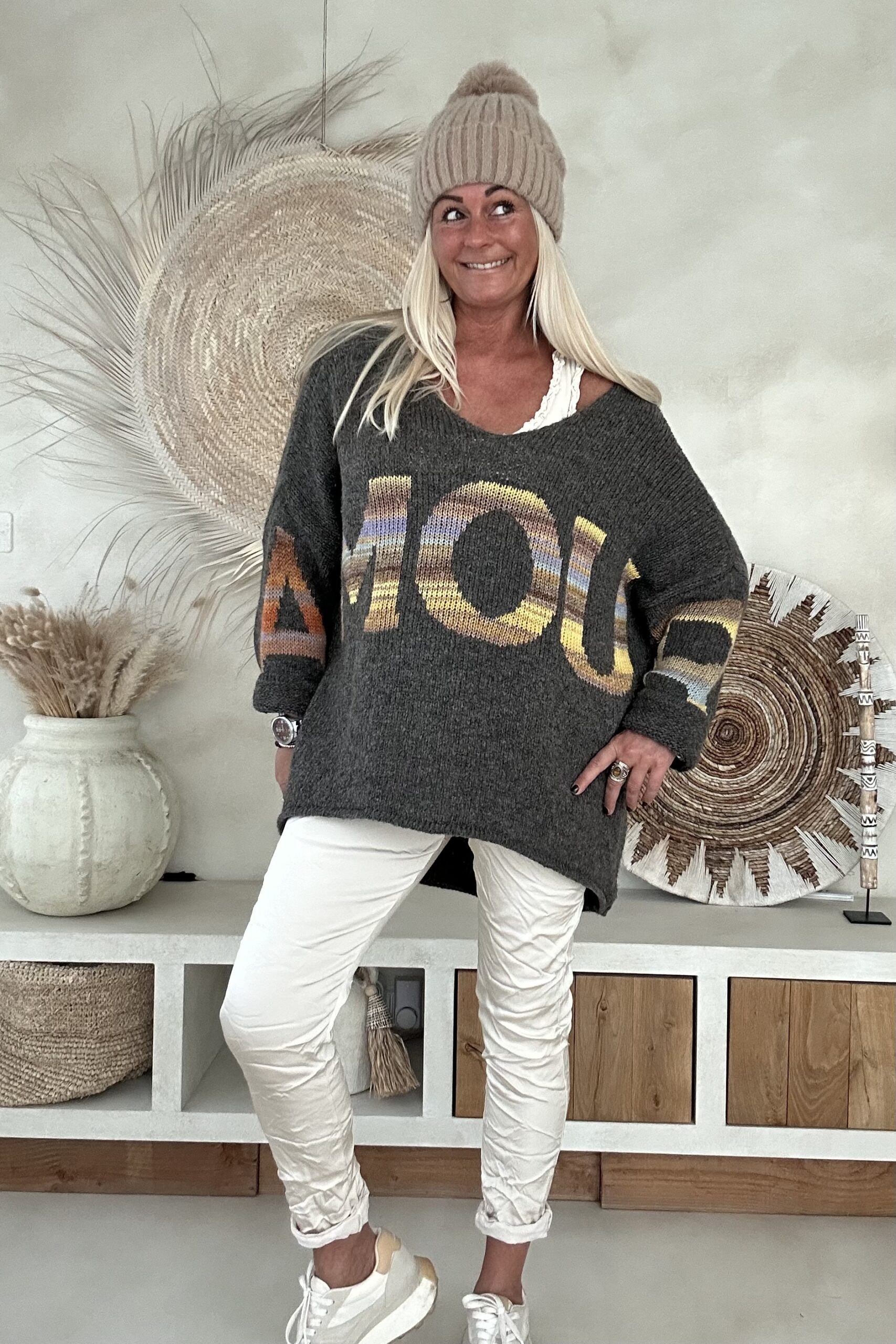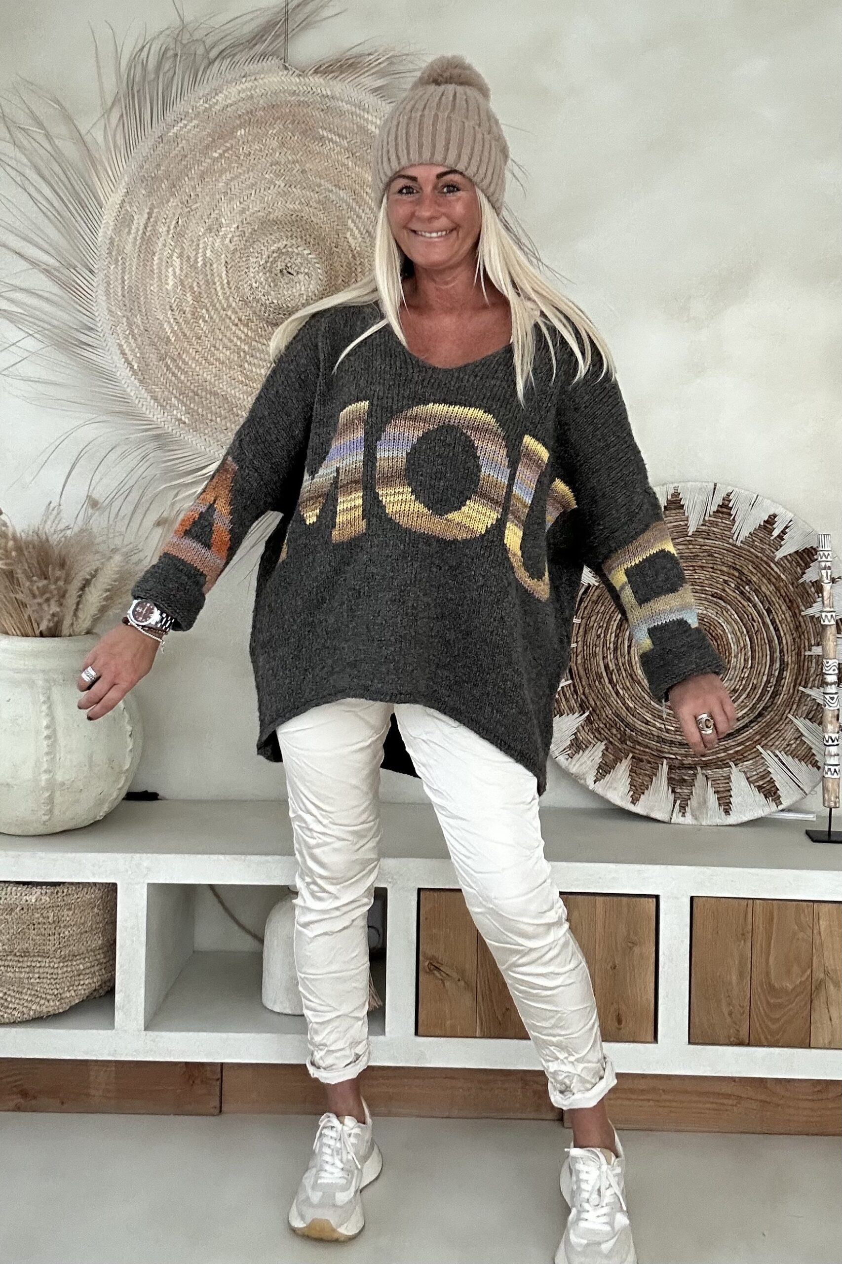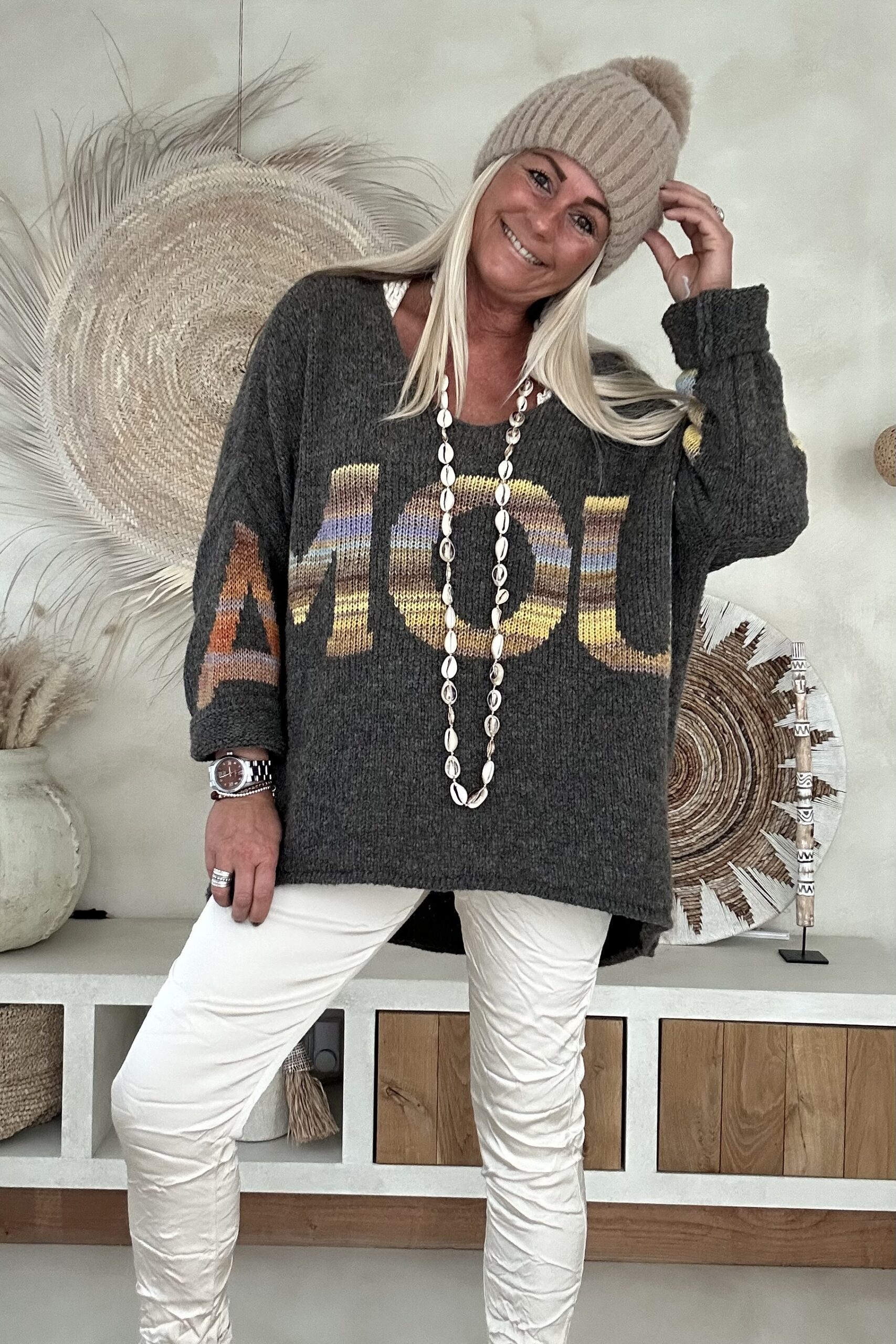 Deze AMOUR trui is een echte sfeermaker voor je outfit! Het zachte breisel, de mooie kleurovergangen en de grote AMOUR-tekst geven ’m een speelse én stijlvolle uitstraling. Dankzij het relaxte, ruimvallende model valt hij heerlijk nonchalant en draagt hij supercomfortabel. De asymmetrische lengte – langer aan de achterkant – zorgt voor een flatterende, moderne look. Perfect voor een cosy, trendy outfit en passend t/m maat 46.