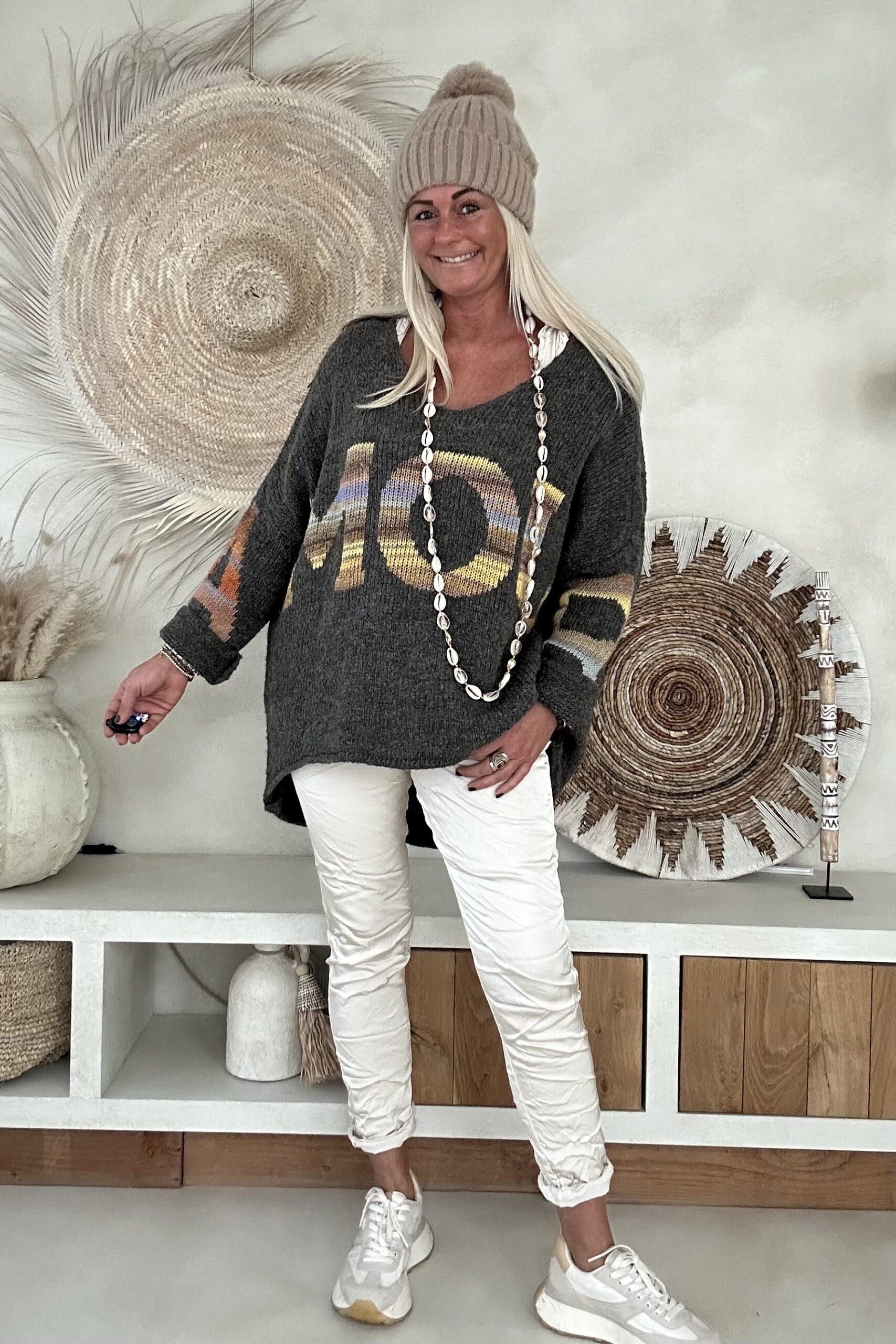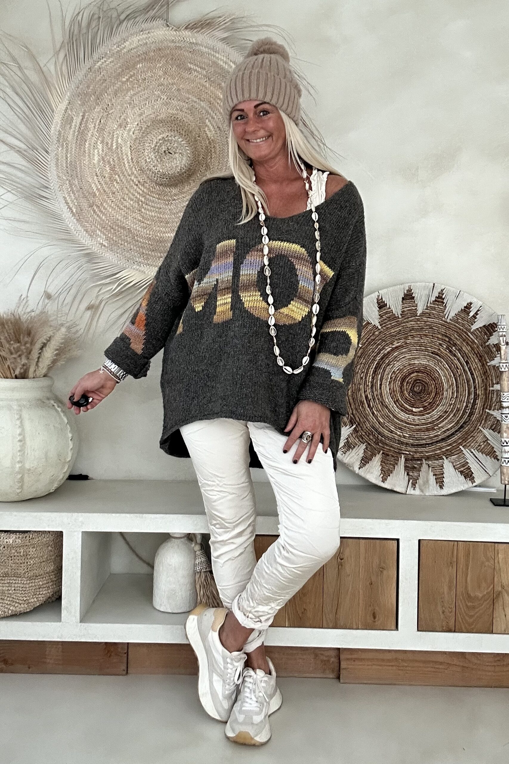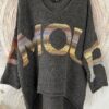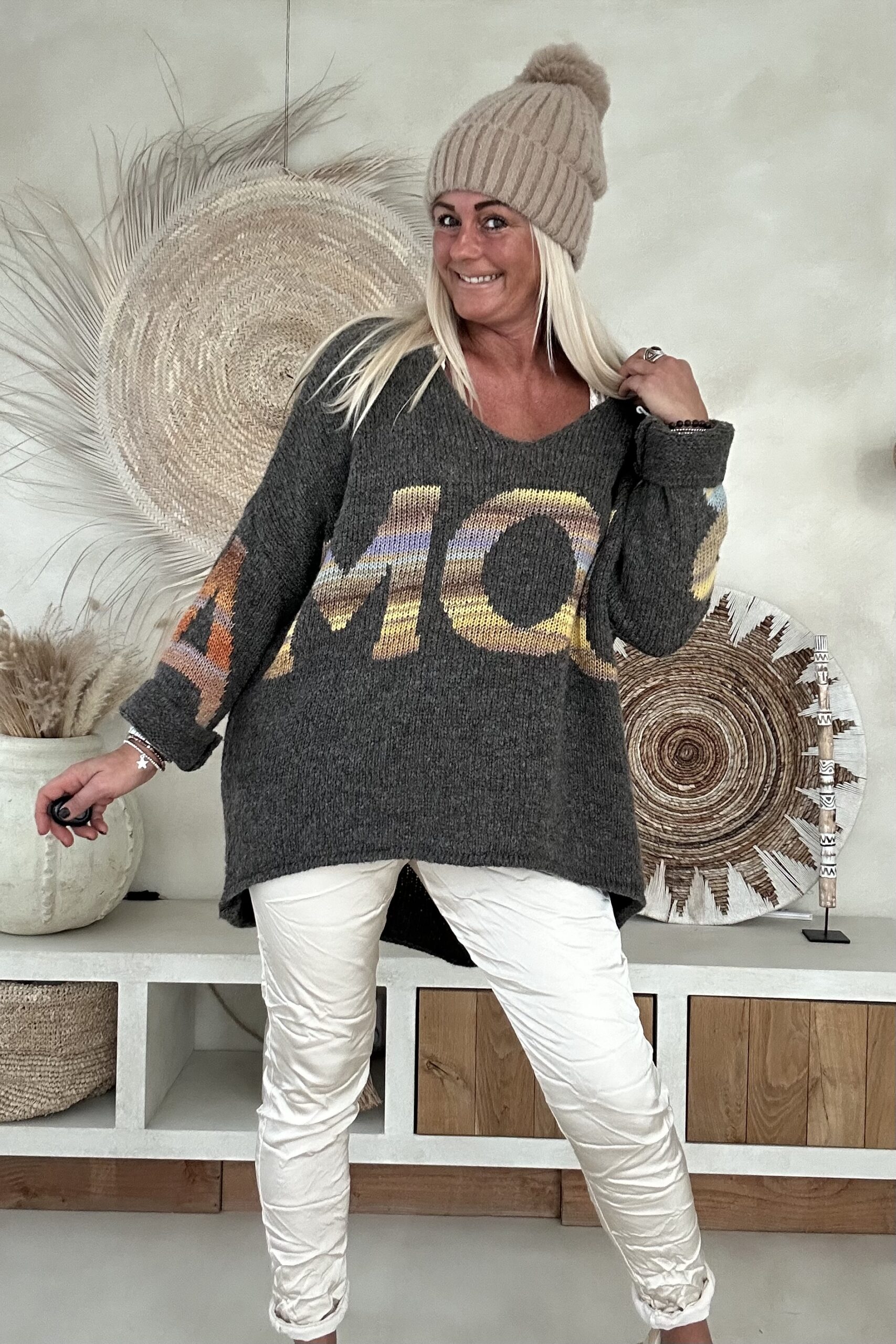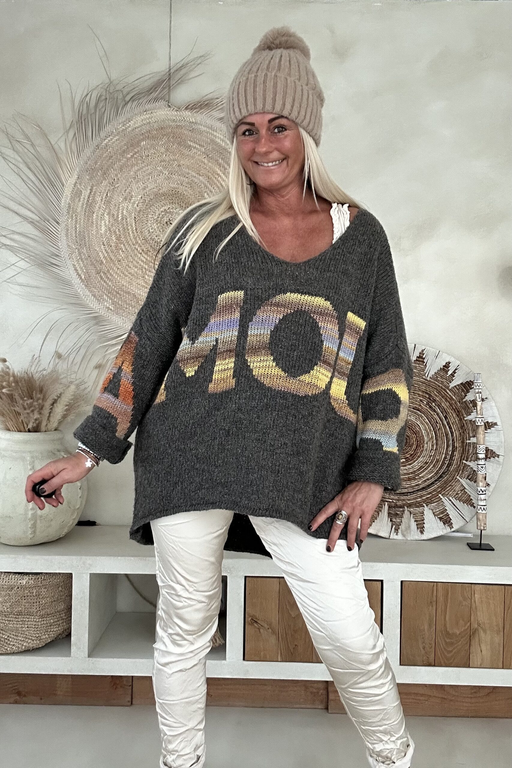 Deze AMOUR trui is een echte sfeermaker voor je outfit! Het zachte breisel, de mooie kleurovergangen en de grote AMOUR-tekst geven ’m een speelse én stijlvolle uitstraling. Dankzij het relaxte, ruimvallende model valt hij heerlijk nonchalant en draagt hij supercomfortabel. De asymmetrische lengte – langer aan de achterkant – zorgt voor een flatterende, moderne look. Perfect voor een cosy, trendy outfit en passend t/m maat 46.