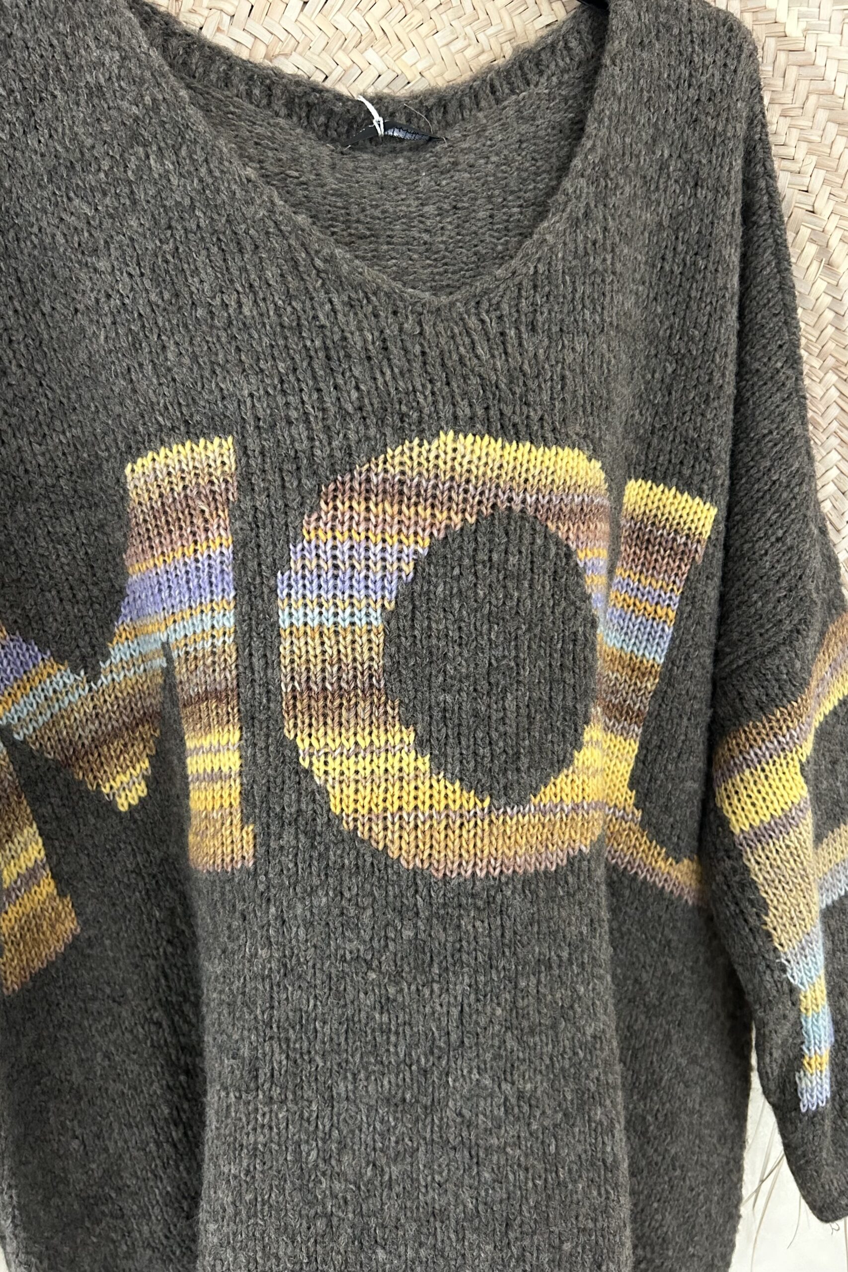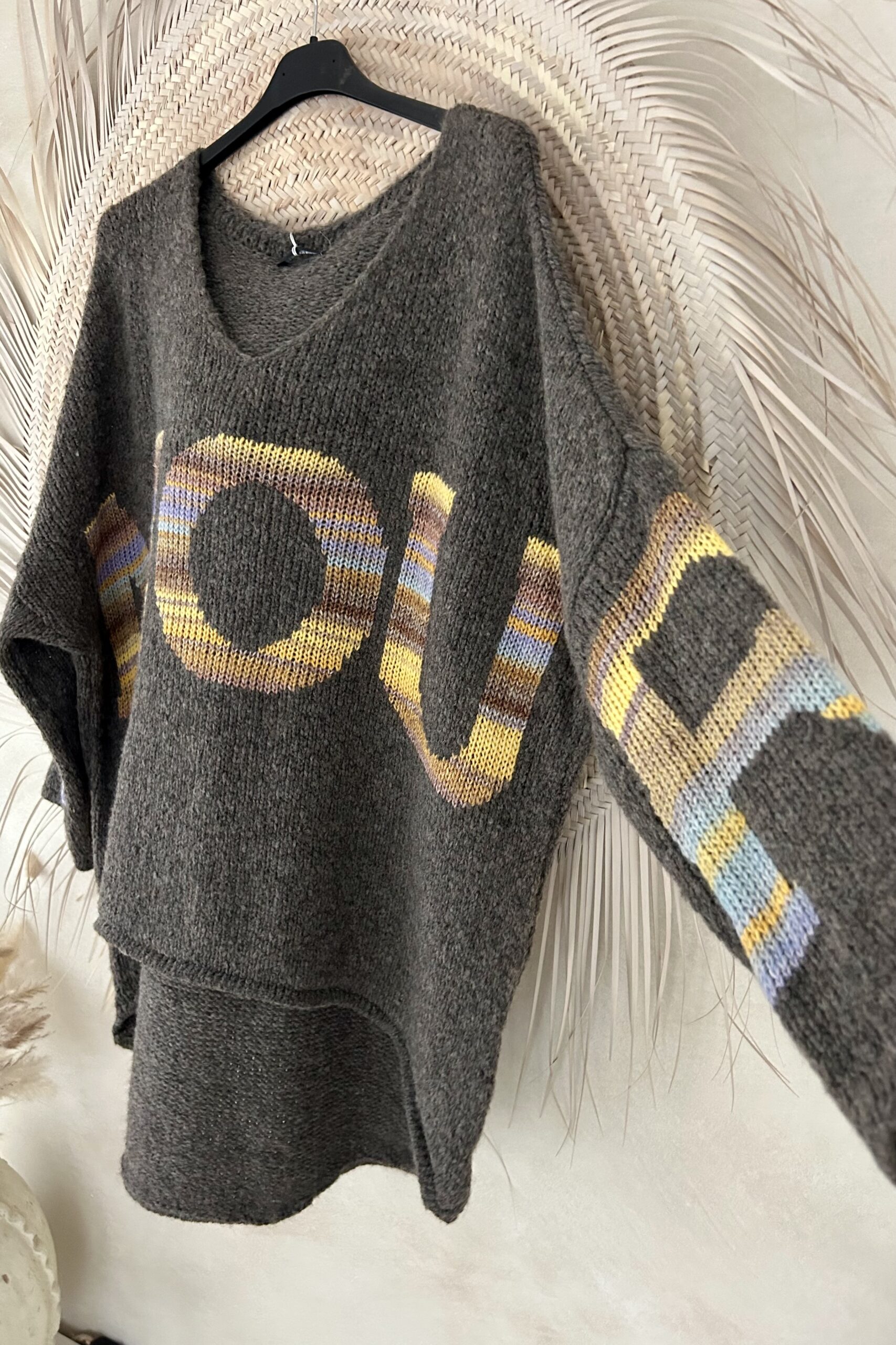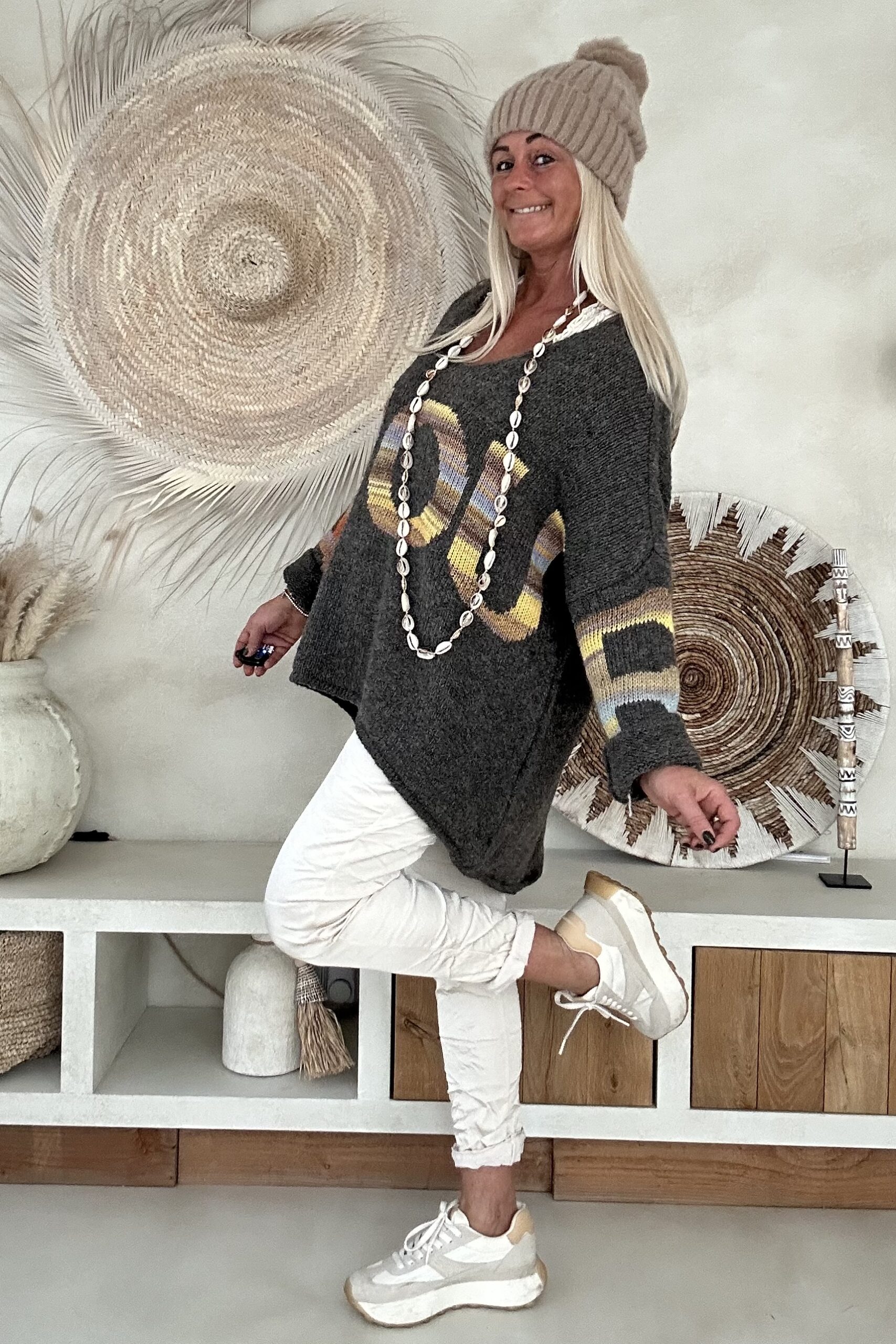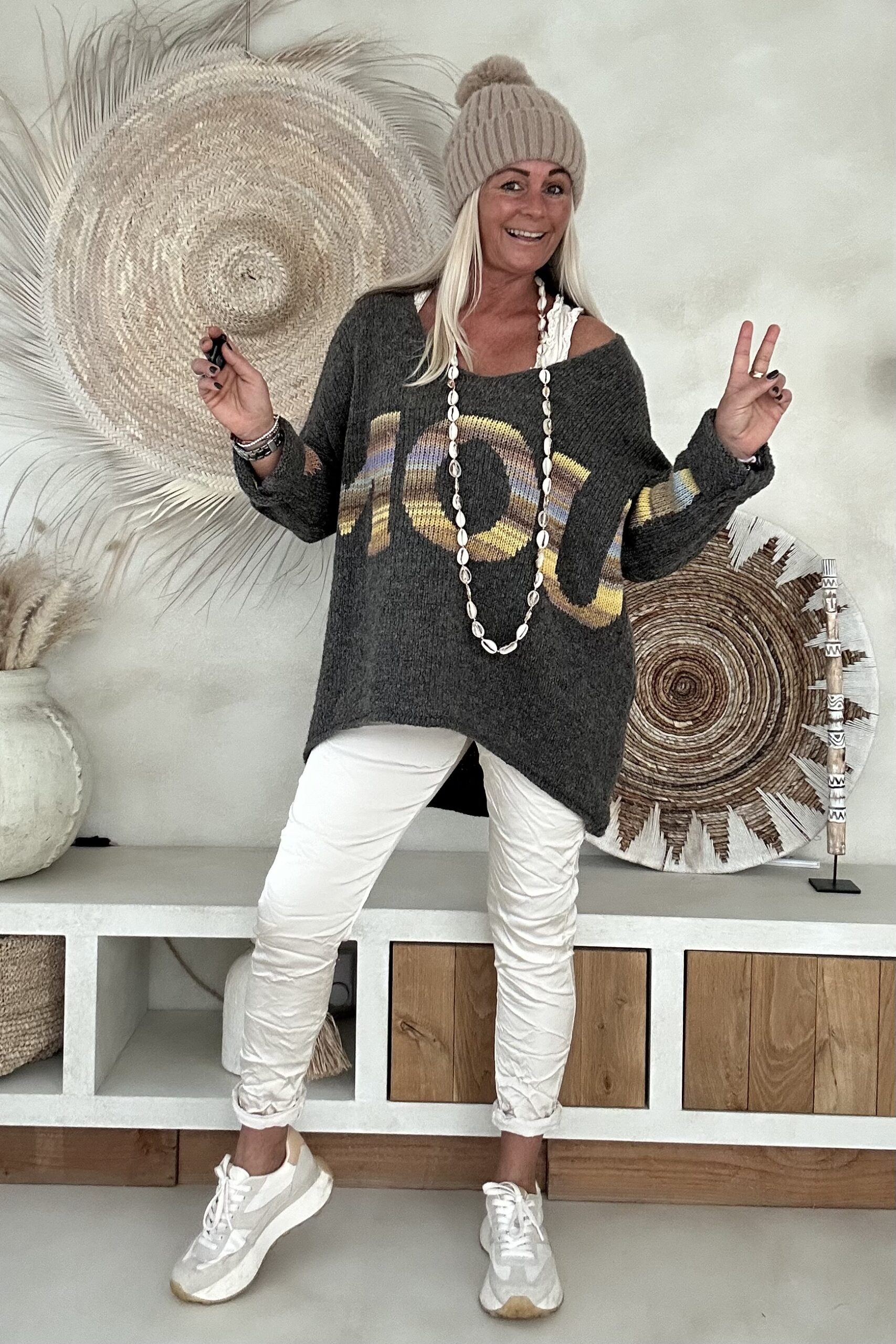 Deze AMOUR trui is een echte sfeermaker voor je outfit! Het zachte breisel, de mooie kleurovergangen en de grote AMOUR-tekst geven ’m een speelse én stijlvolle uitstraling. Dankzij het relaxte, ruimvallende model valt hij heerlijk nonchalant en draagt hij supercomfortabel. De asymmetrische lengte – langer aan de achterkant – zorgt voor een flatterende, moderne look. Perfect voor een cosy, trendy outfit en passend t/m maat 46.