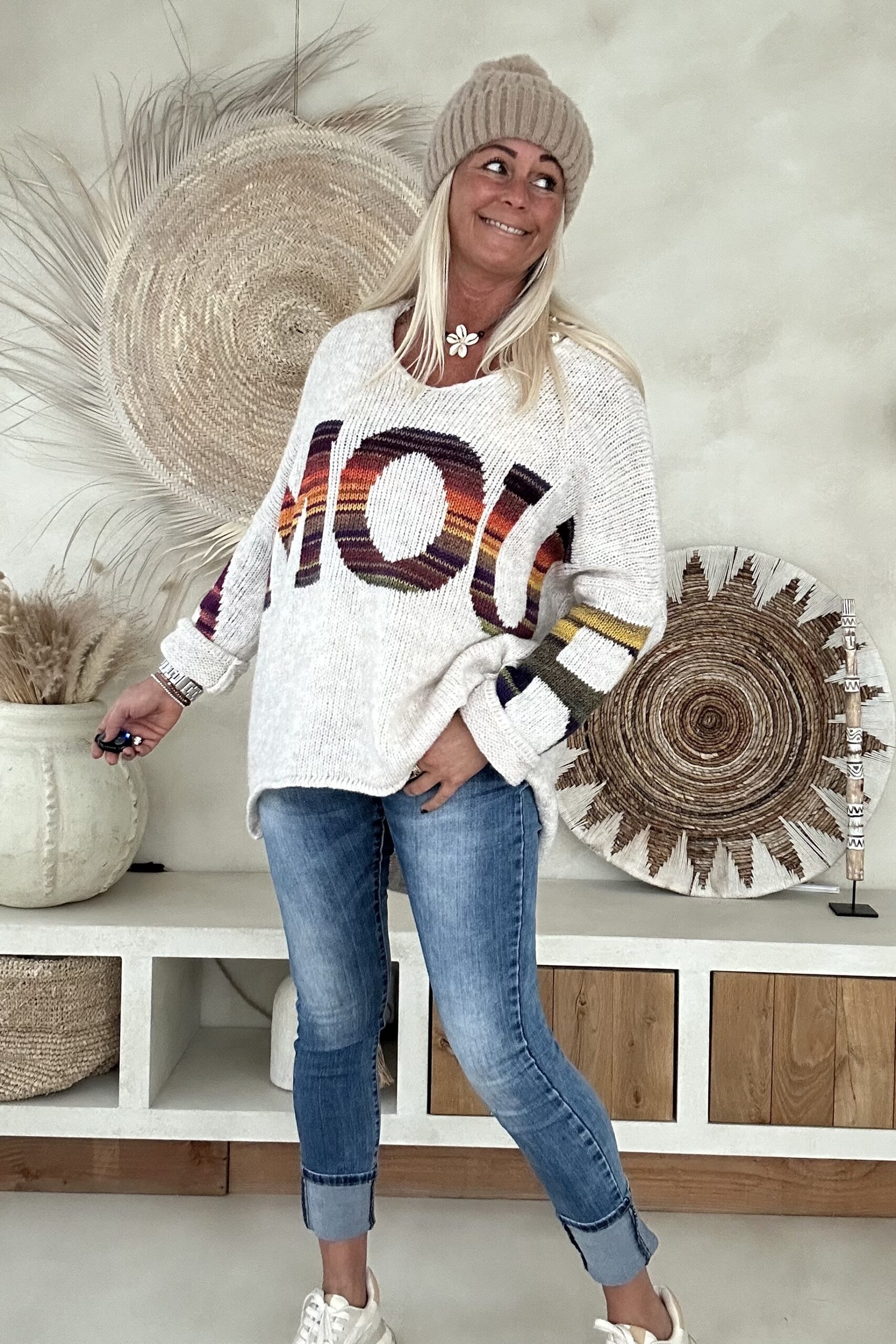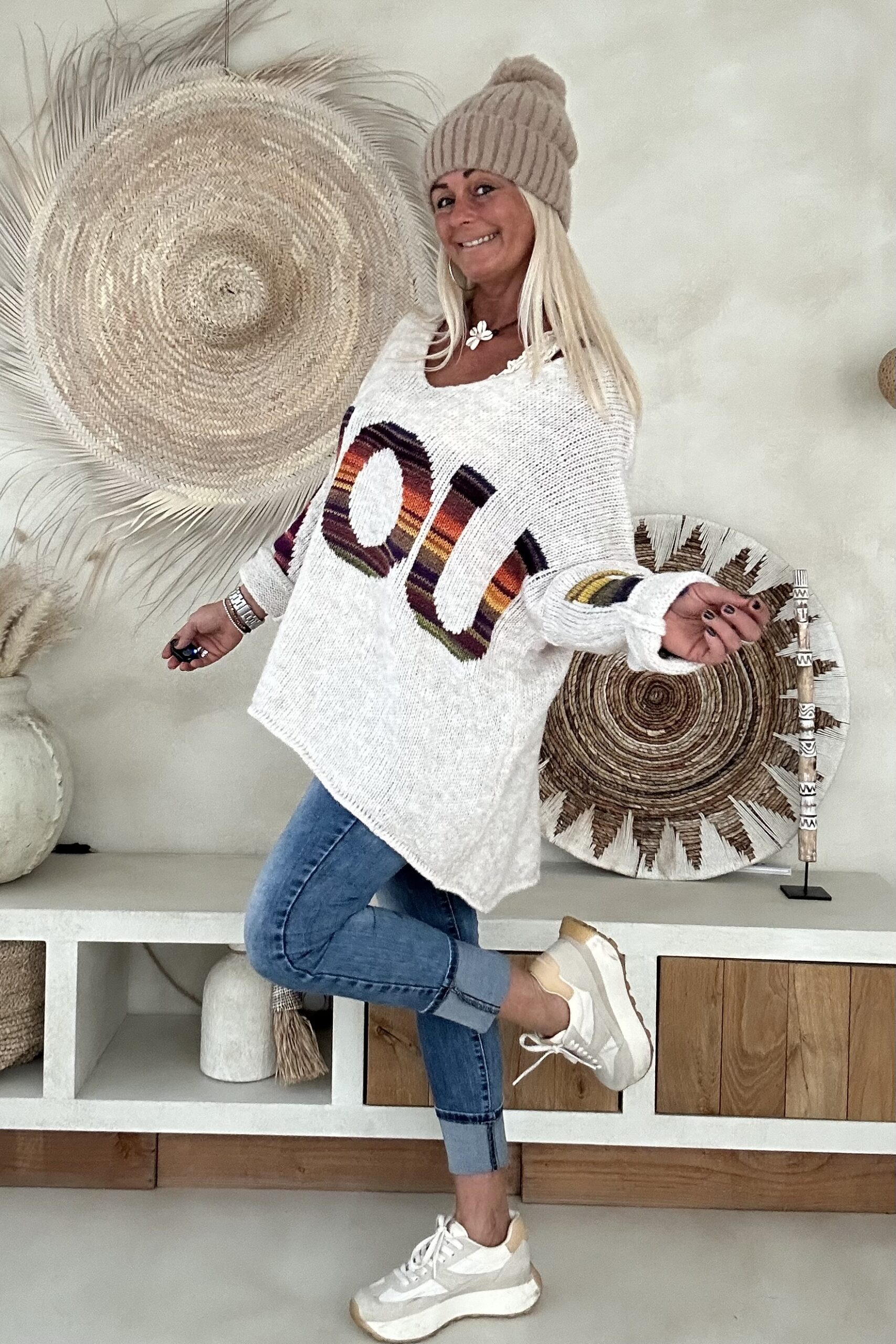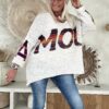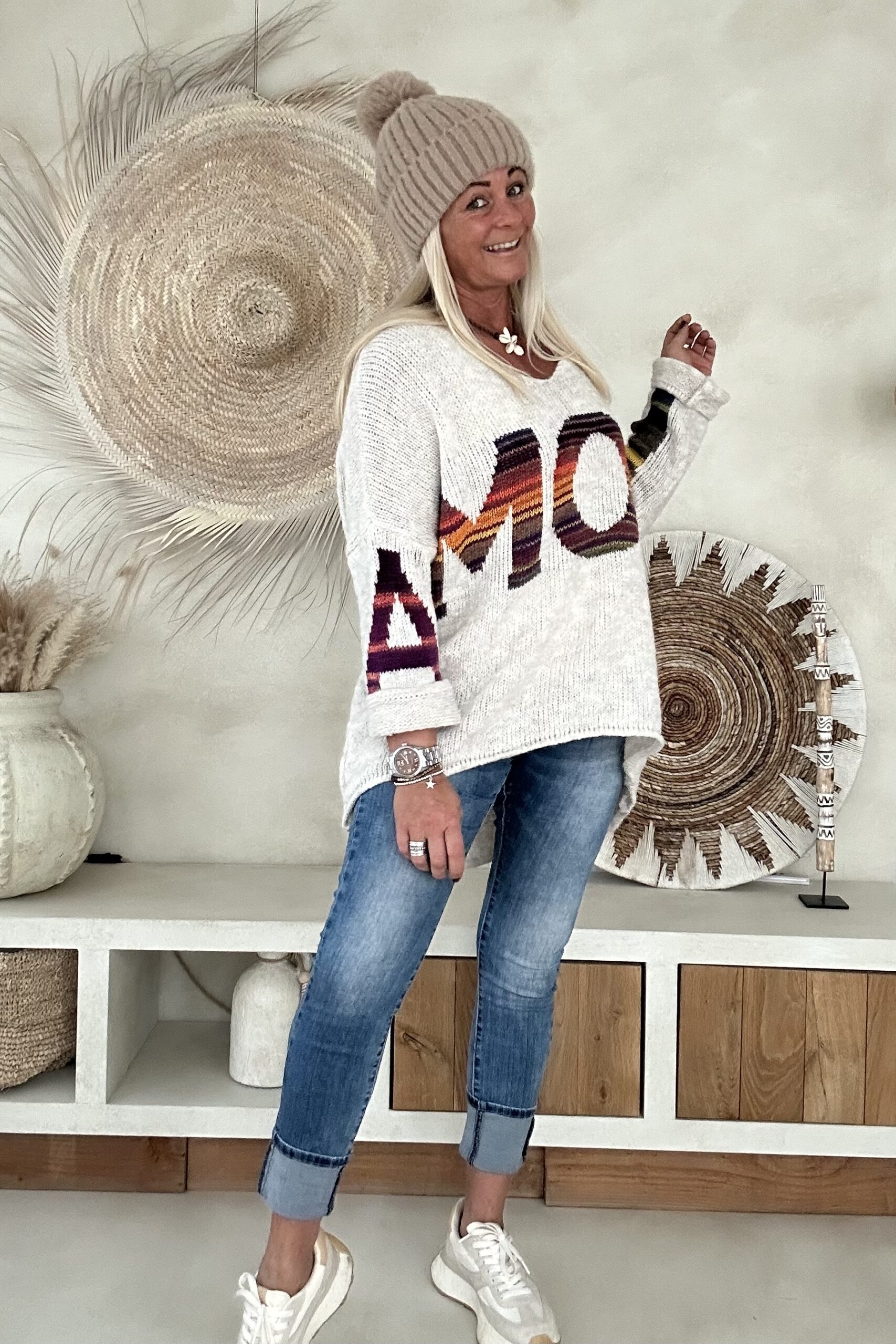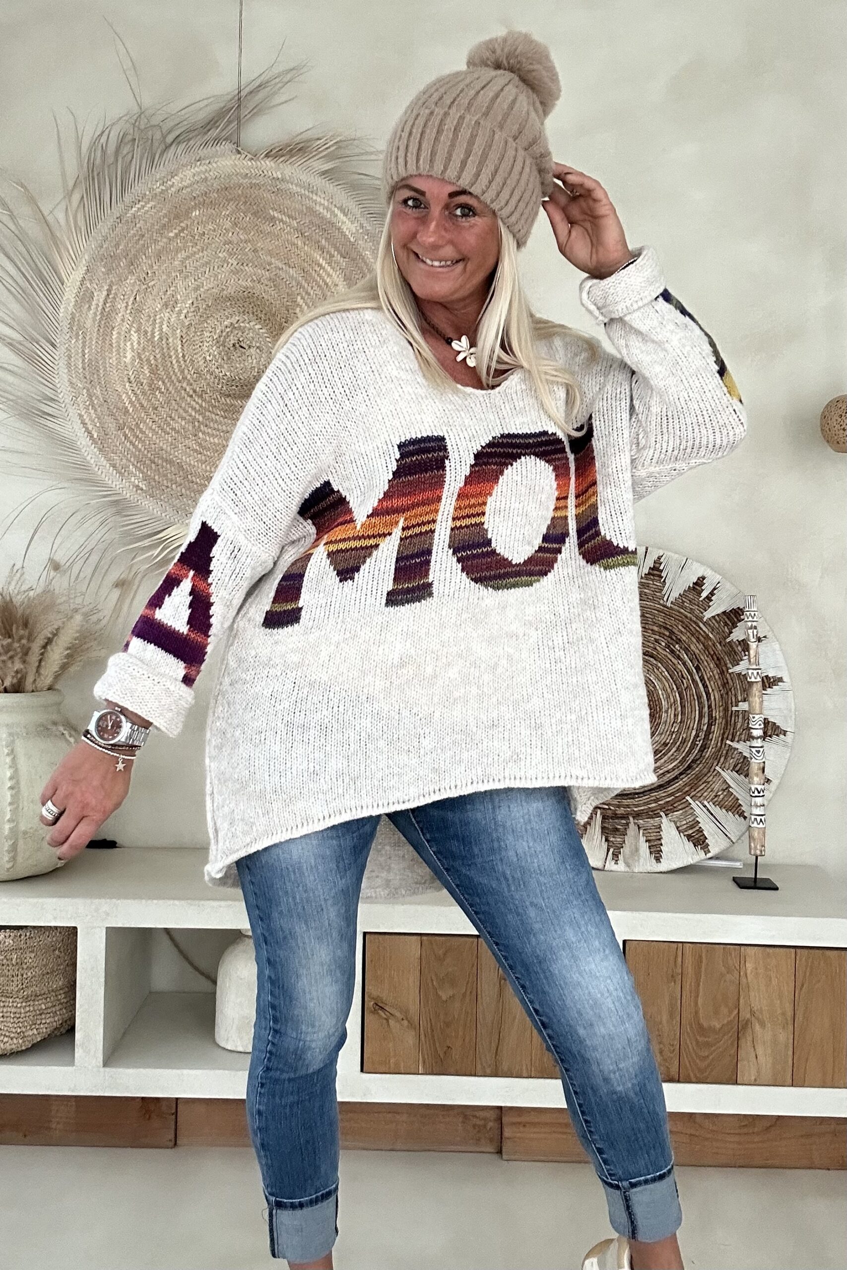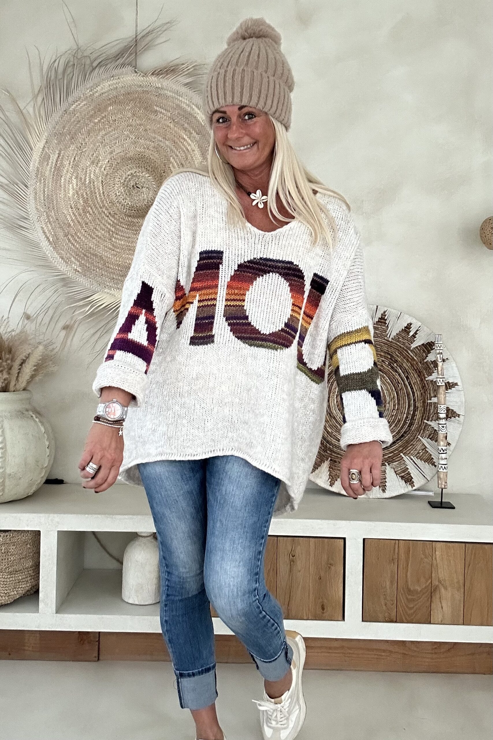 Deze AMOUR trui is een echte sfeermaker voor je outfit! Het zachte breisel, de mooie kleurovergangen en de grote AMOUR-tekst geven ’m een speelse én stijlvolle uitstraling. Dankzij het relaxte, ruimvallende model valt hij heerlijk nonchalant en draagt hij supercomfortabel. De asymmetrische lengte – langer aan de achterkant – zorgt voor een flatterende, moderne look. Perfect voor een cosy, trendy outfit en passend t/m maat 46.