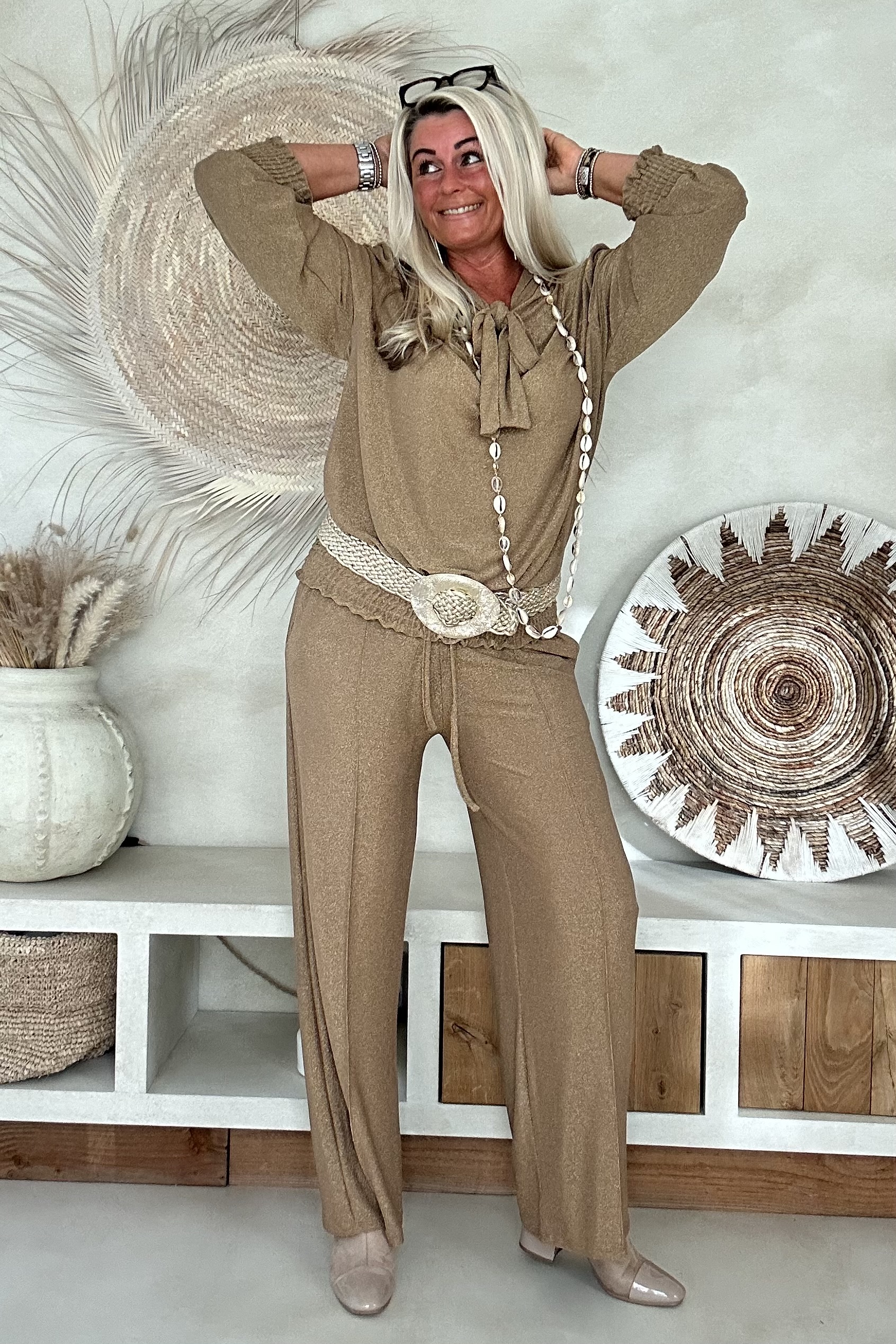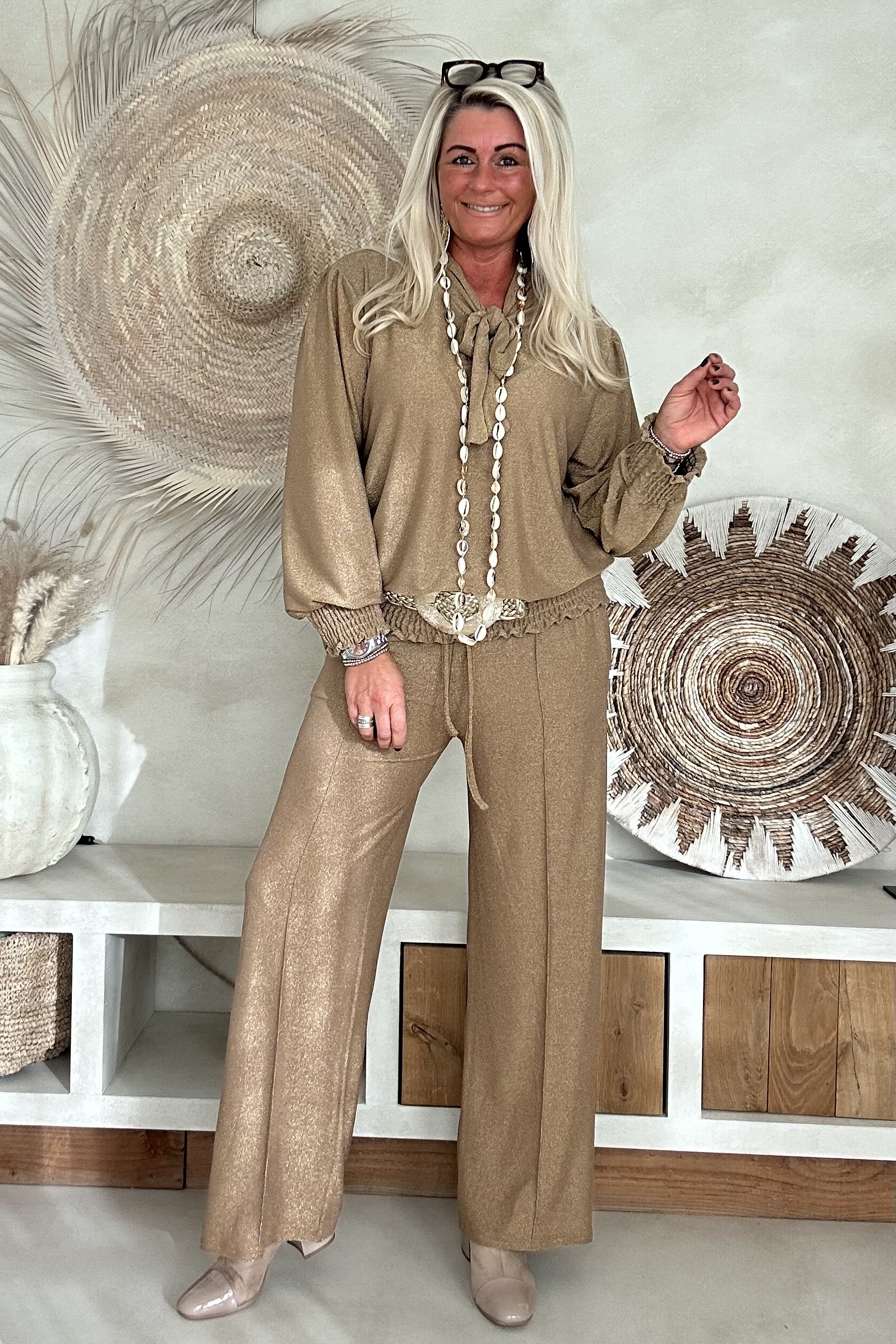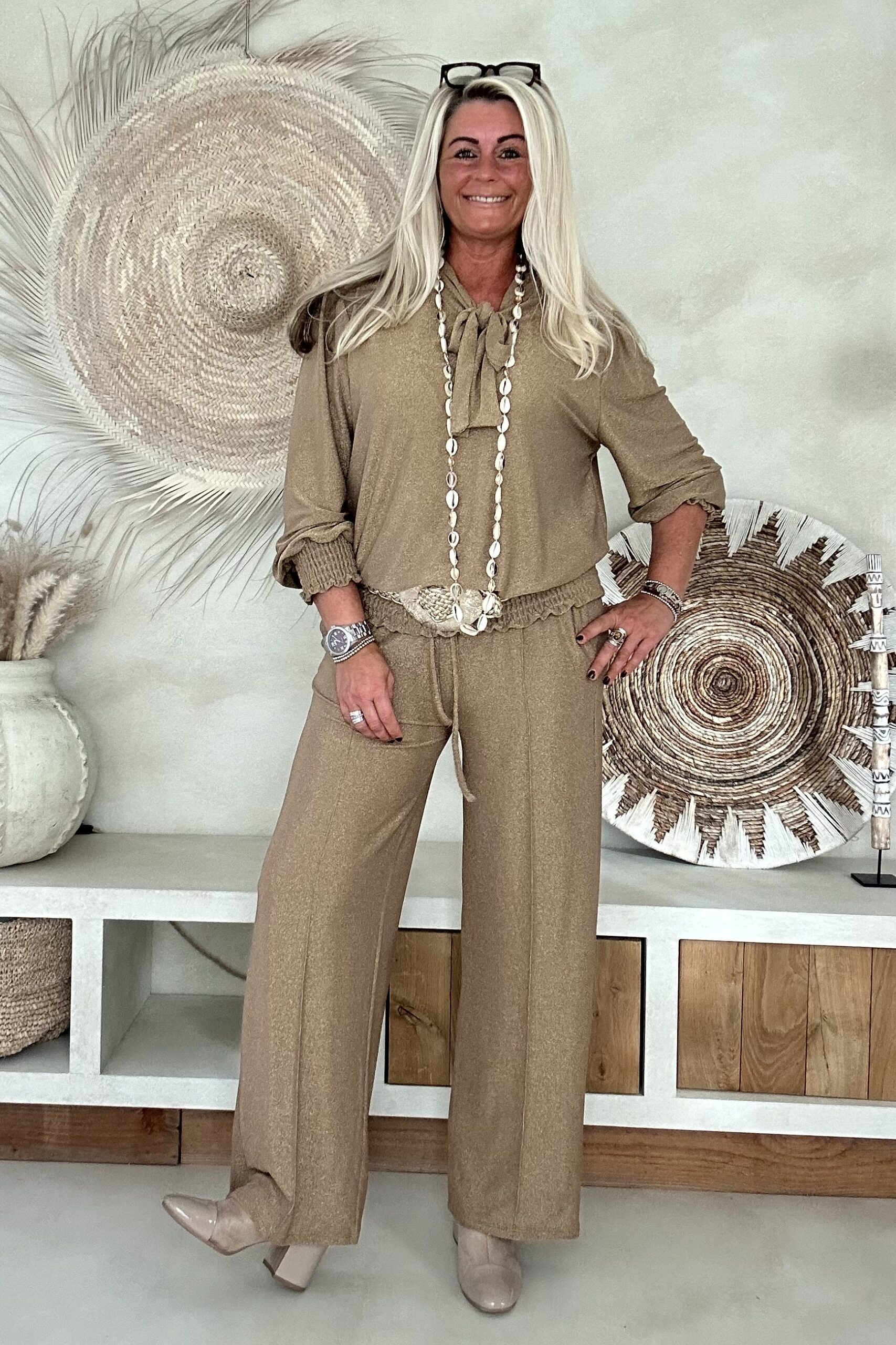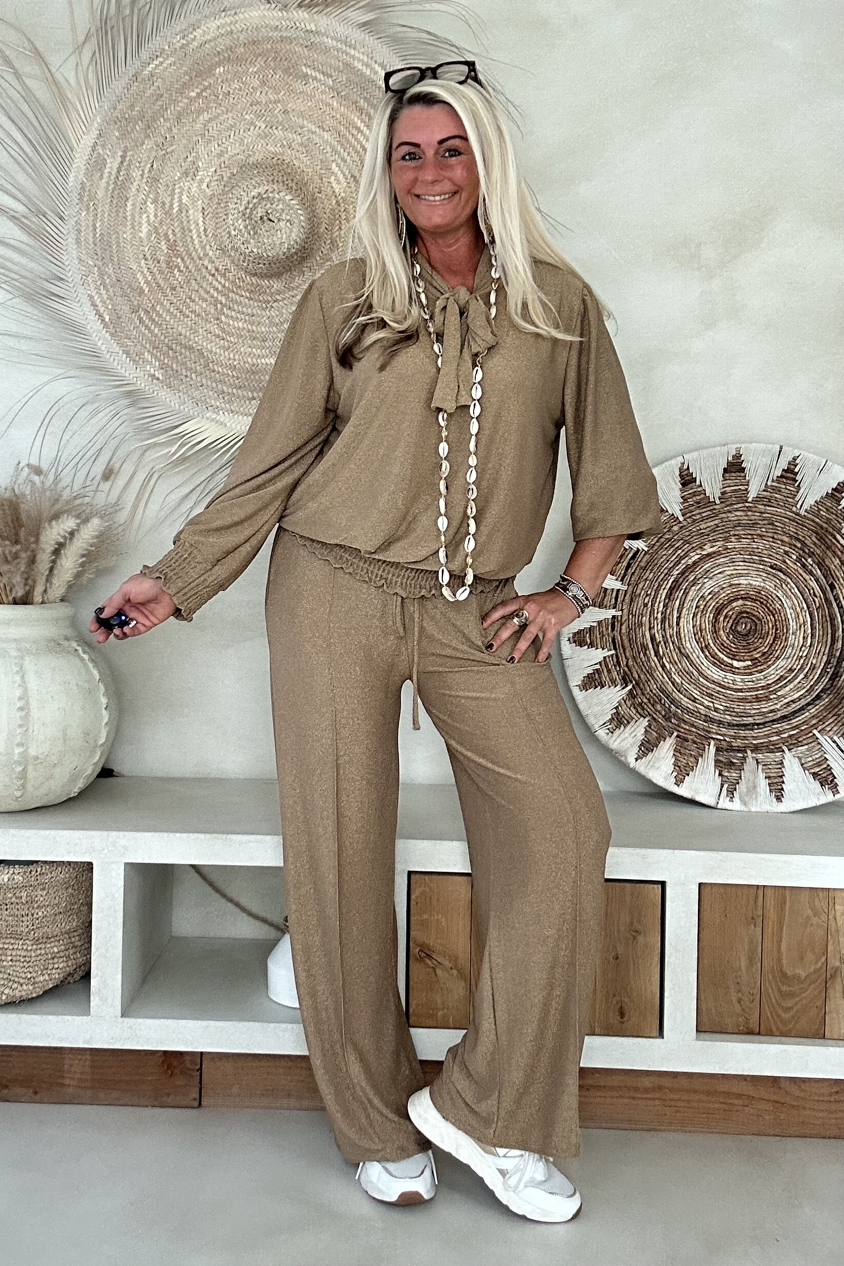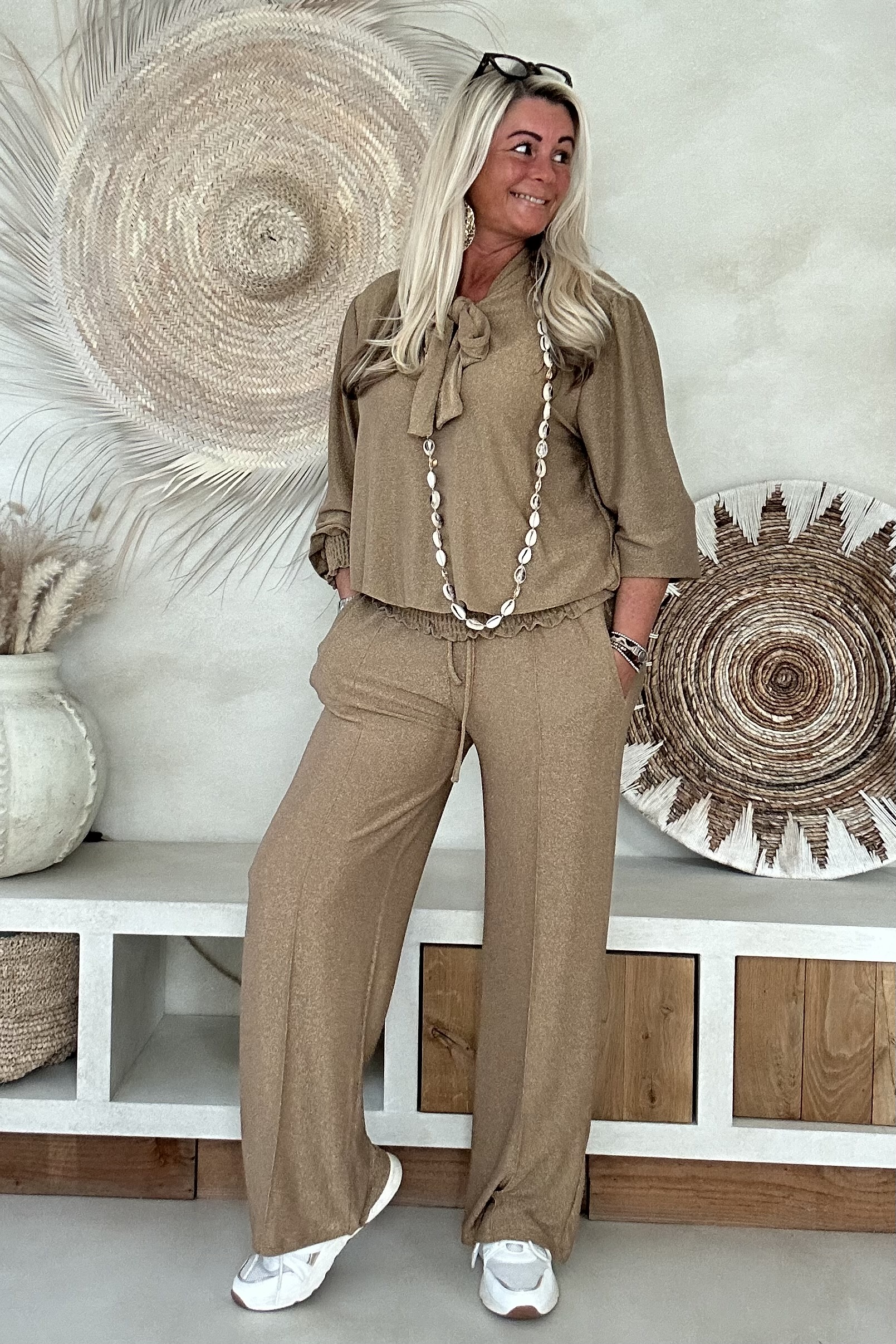 De broek heeft een elastische tailleband en valt soepel langs het been voor een elegante, vrouwelijke look. De blouse heeft eveneens een elastische boord én een chique strikdetail bij de hals, wat het geheel een verfijnde finishing touch geeft. Een outfit die moeiteloos glamoureus én heerlijk comfy is!