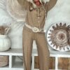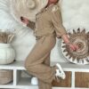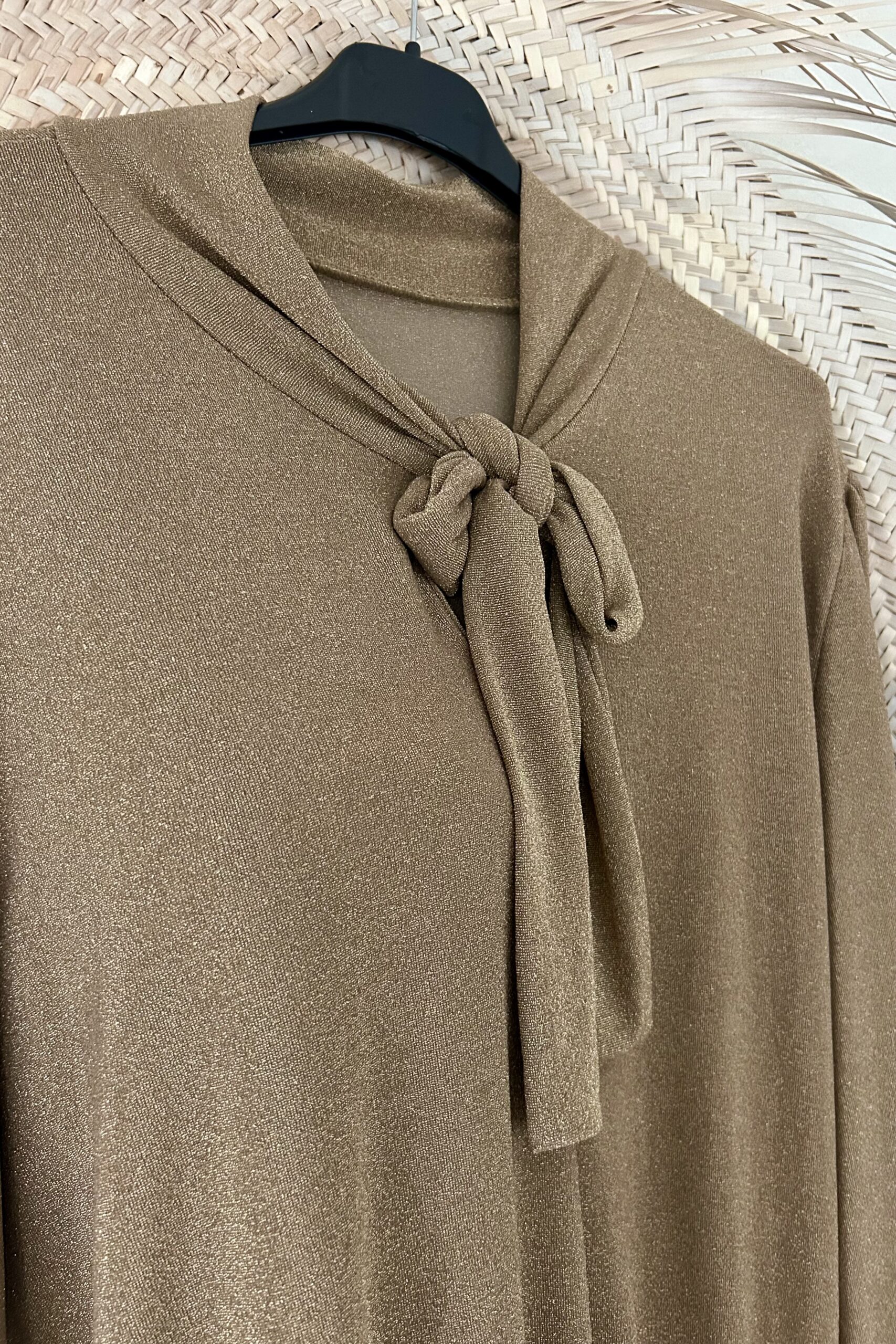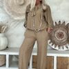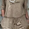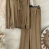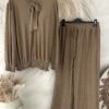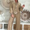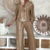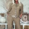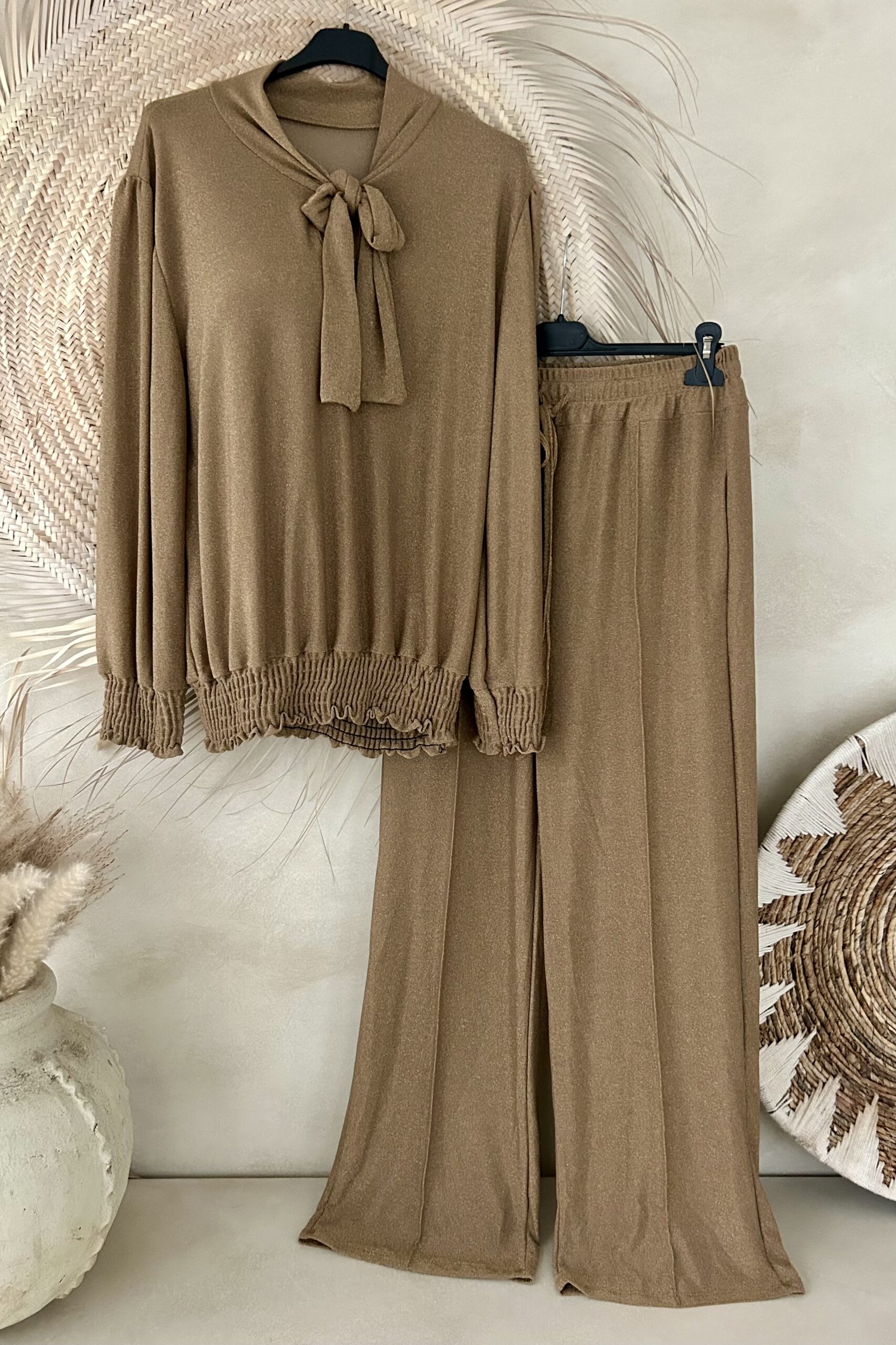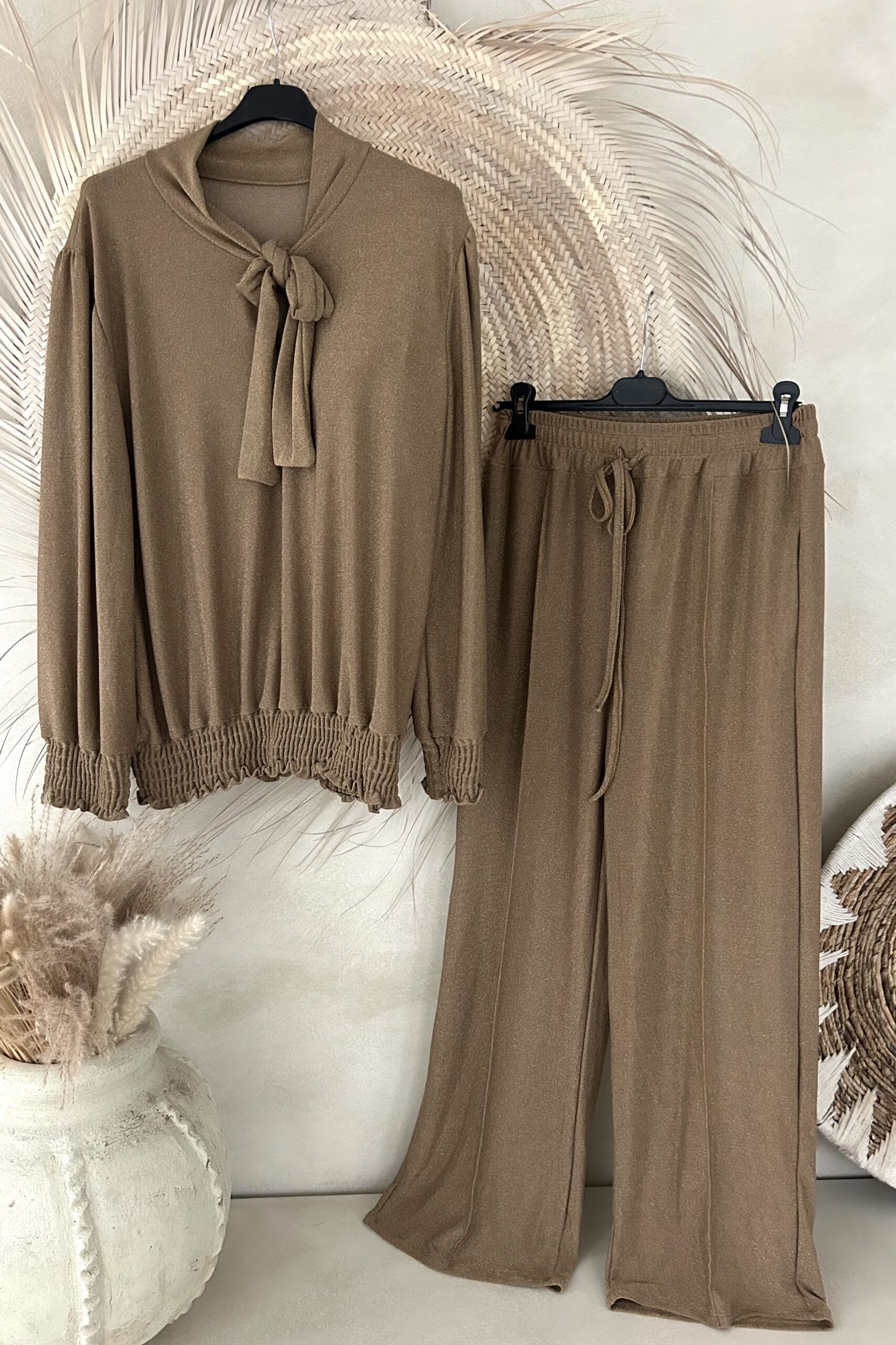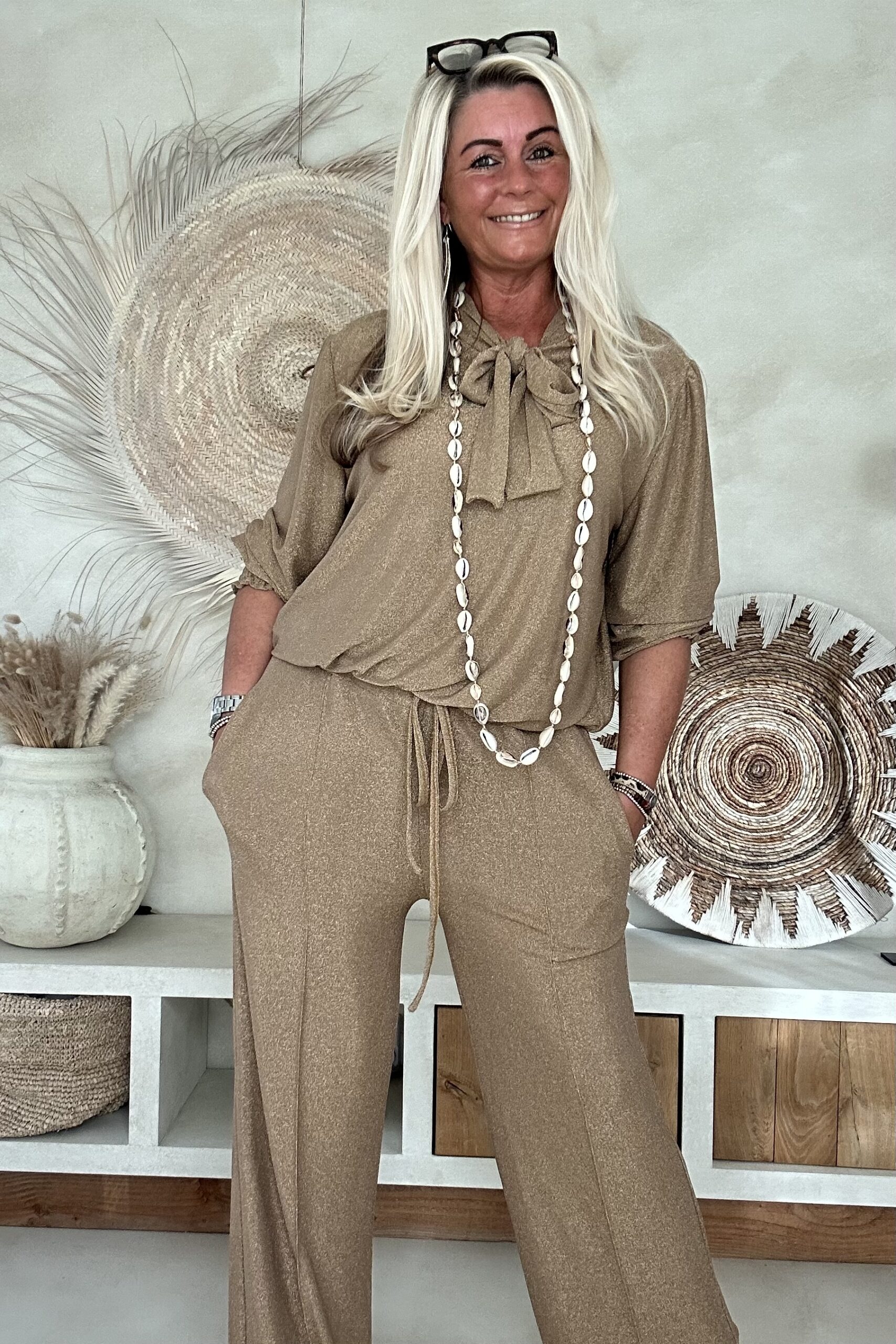 De broek heeft een elastische tailleband en valt soepel langs het been voor een elegante, vrouwelijke look. De blouse heeft eveneens een elastische boord én een chique strikdetail bij de hals, wat het geheel een verfijnde finishing touch geeft. Een outfit die moeiteloos glamoureus én heerlijk comfy is!