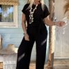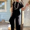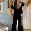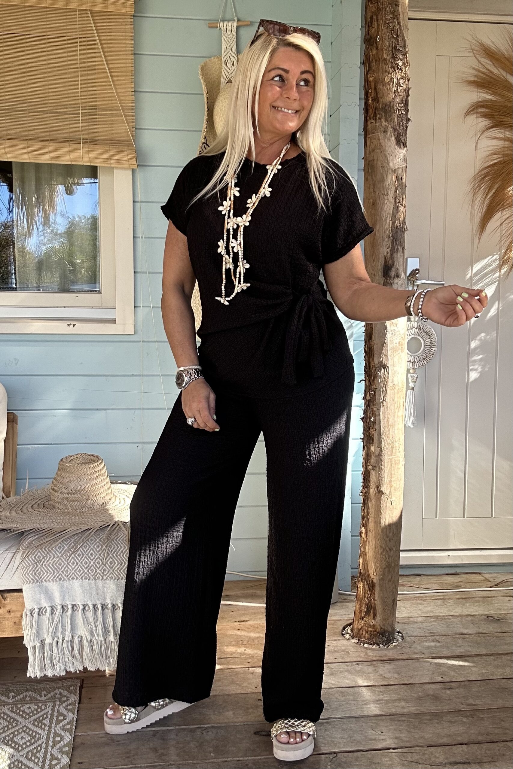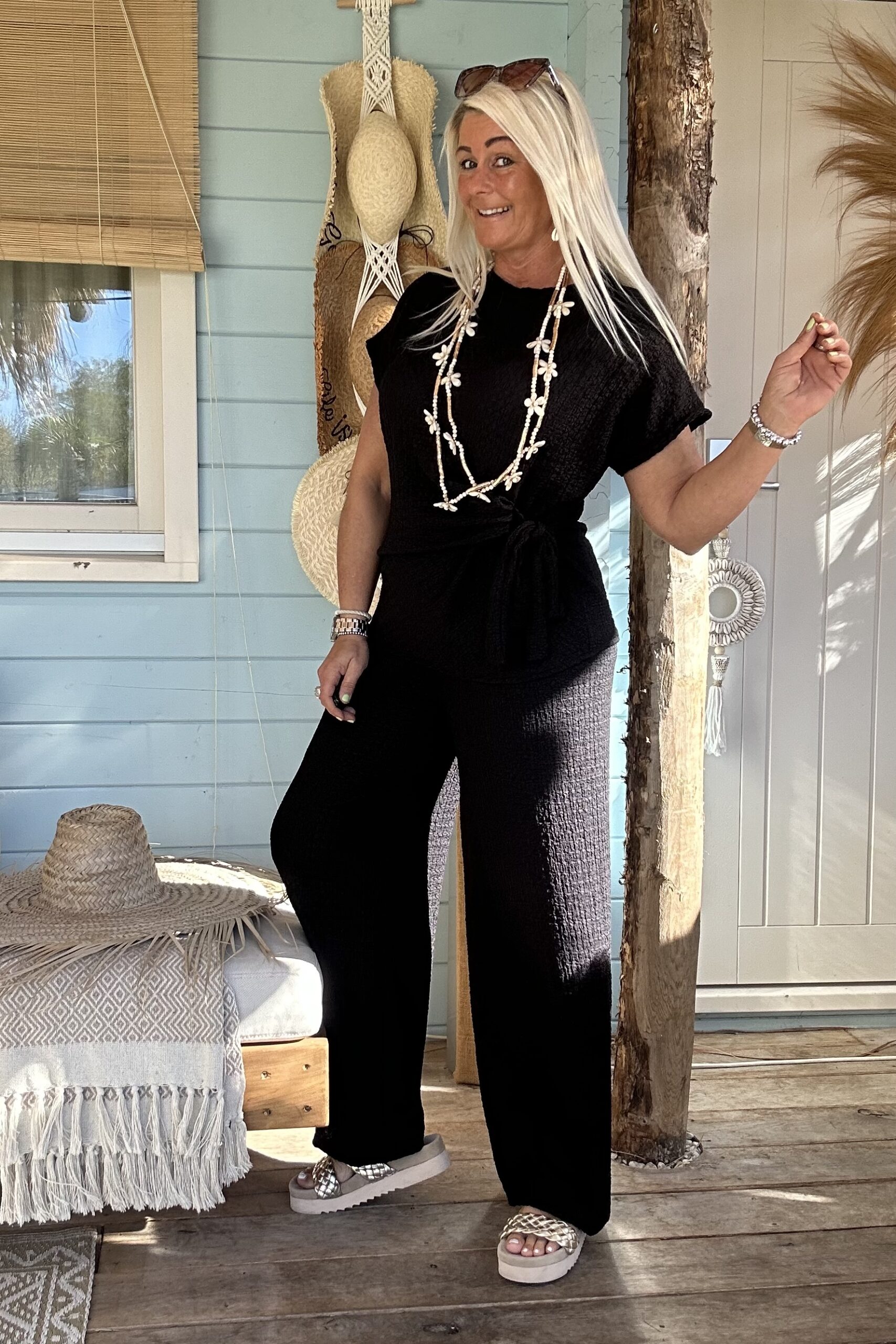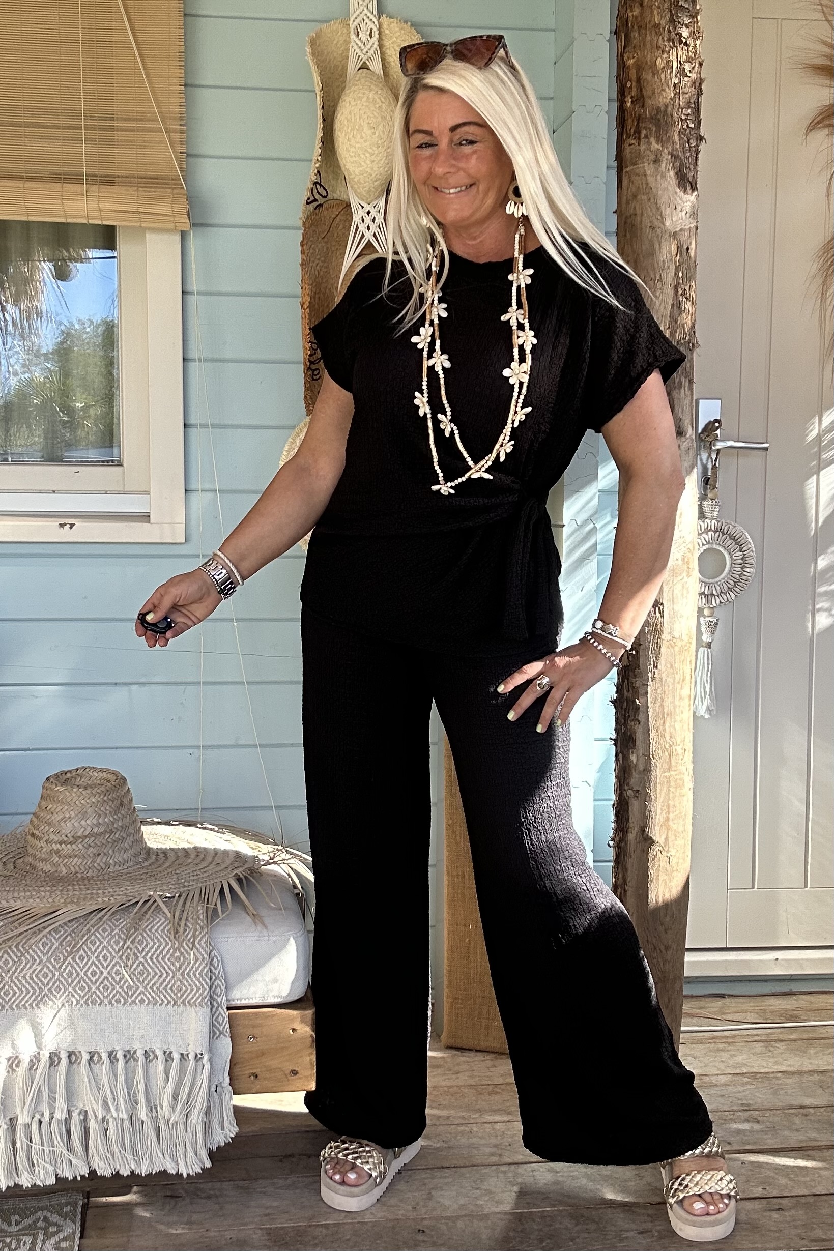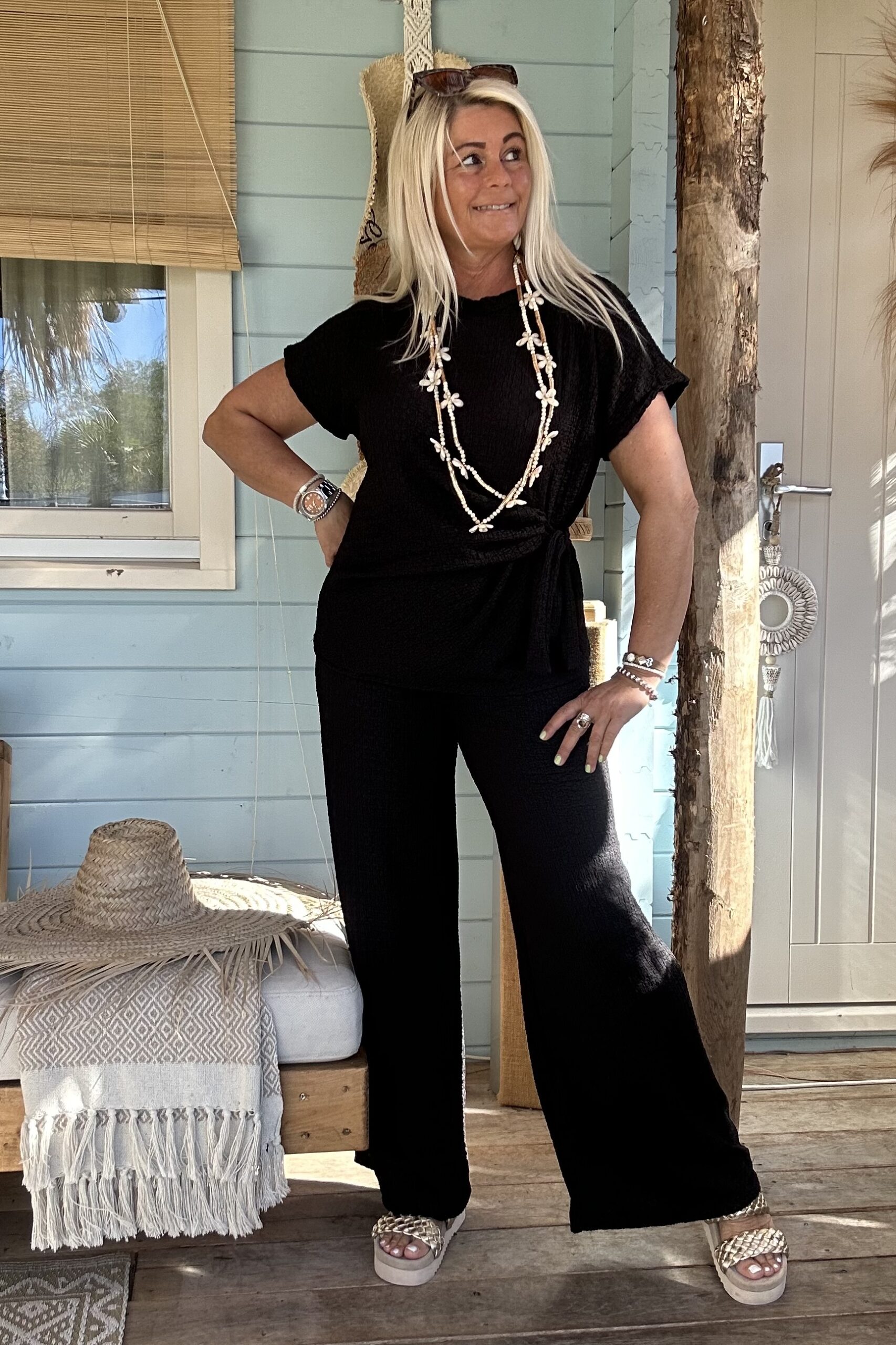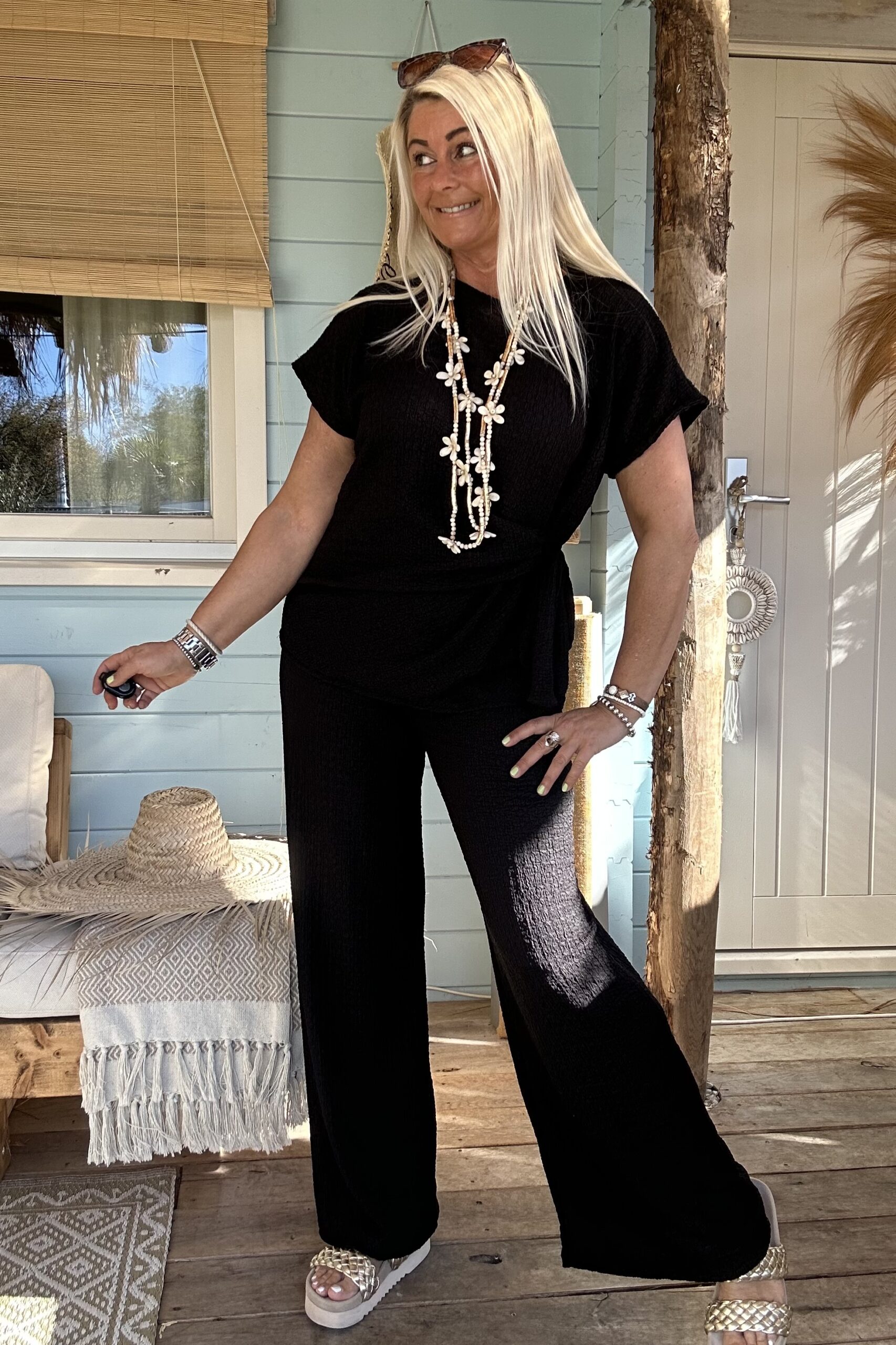 Deze comfortabele 2-delige set is uitgevoerd in een fijne wafelstructuur met veel stretch, waardoor hij heerlijk draagt en mooi met je lichaam meebeweegt. De top heeft een losse fit met een speels strikdetail aan de zijkant, wat zorgt voor een flatterend effect. De broek heeft een elastische tailleband en wijde pijpen, wat zorgt voor een relaxte en stijlvolle look. Perfect als set, maar ook los van elkaar eindeloos te combineren.