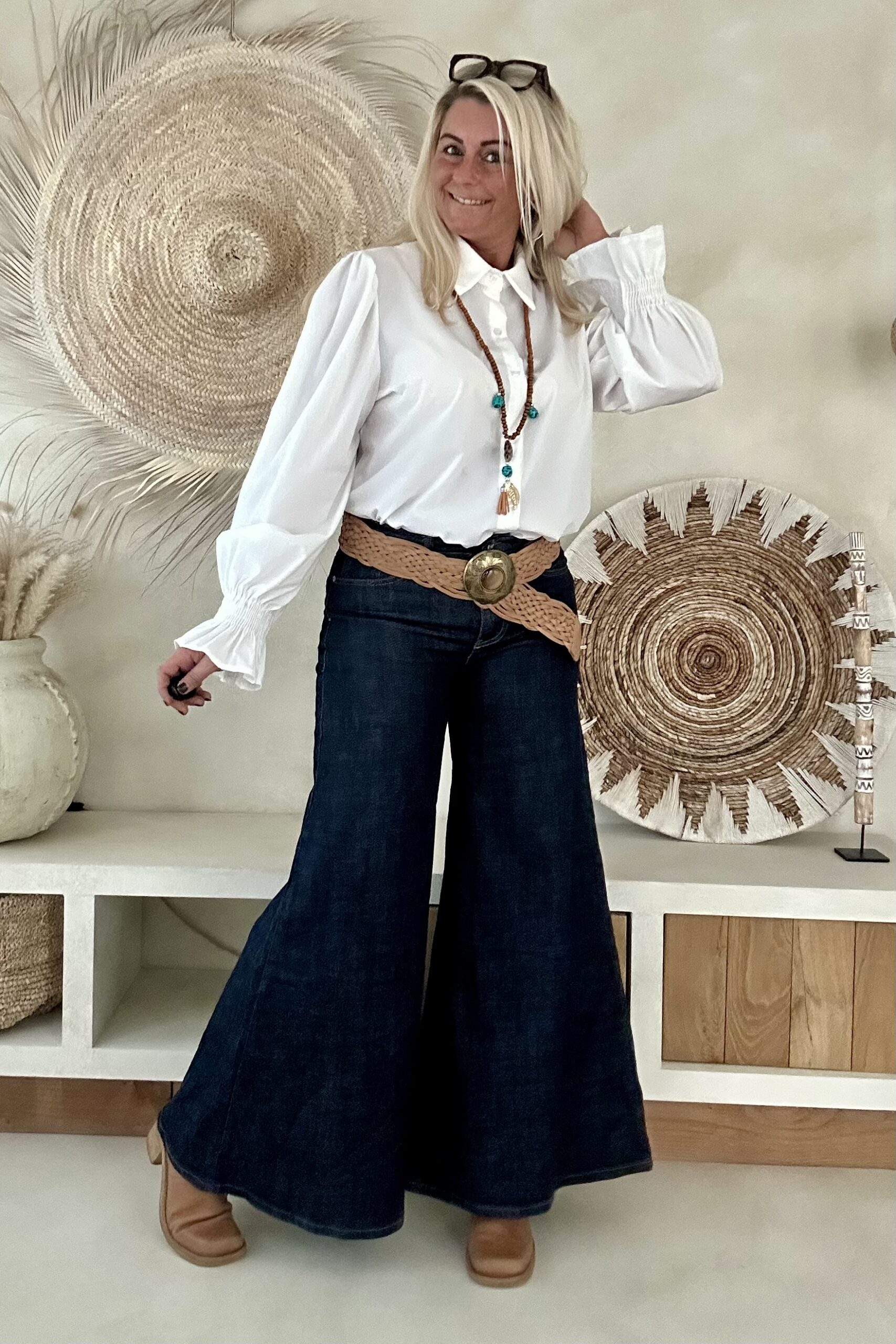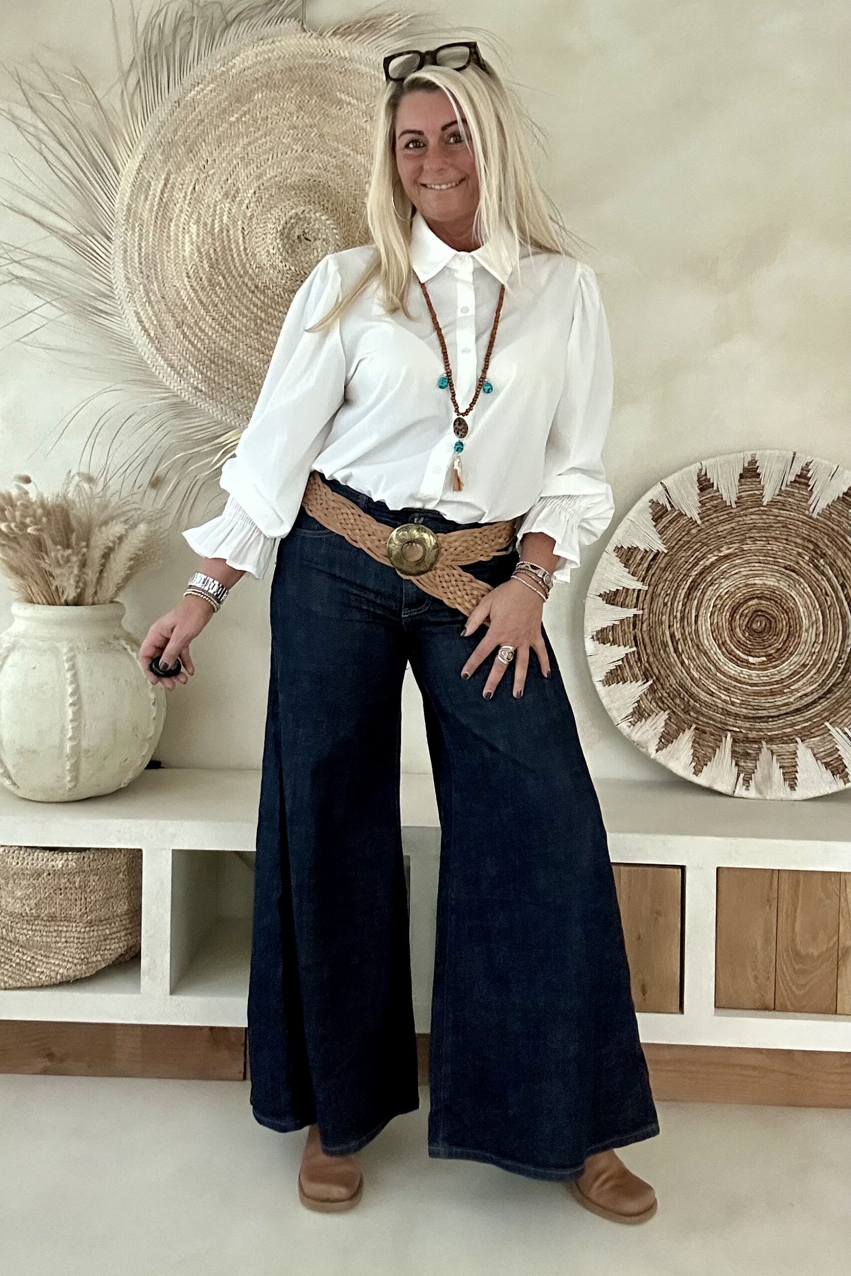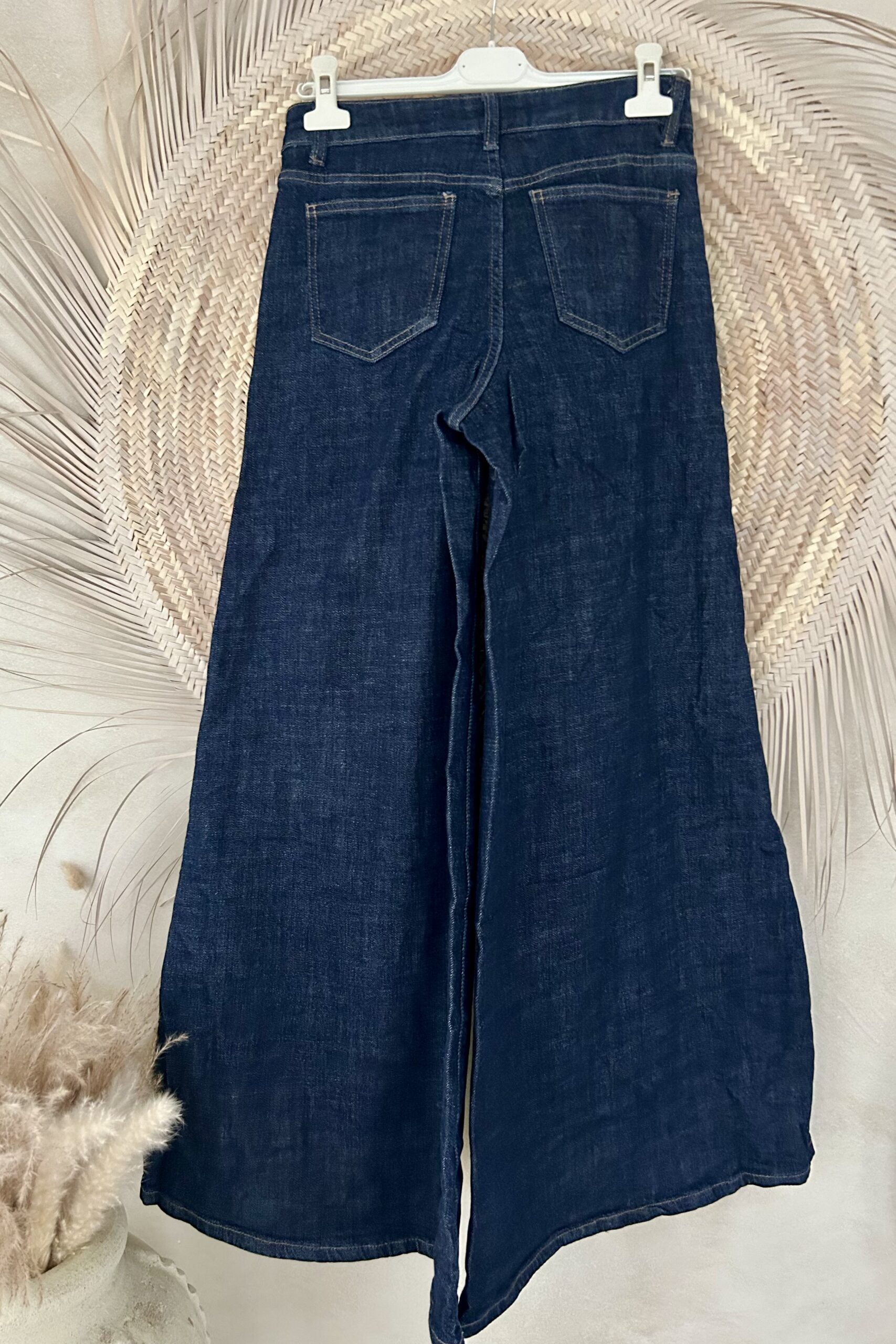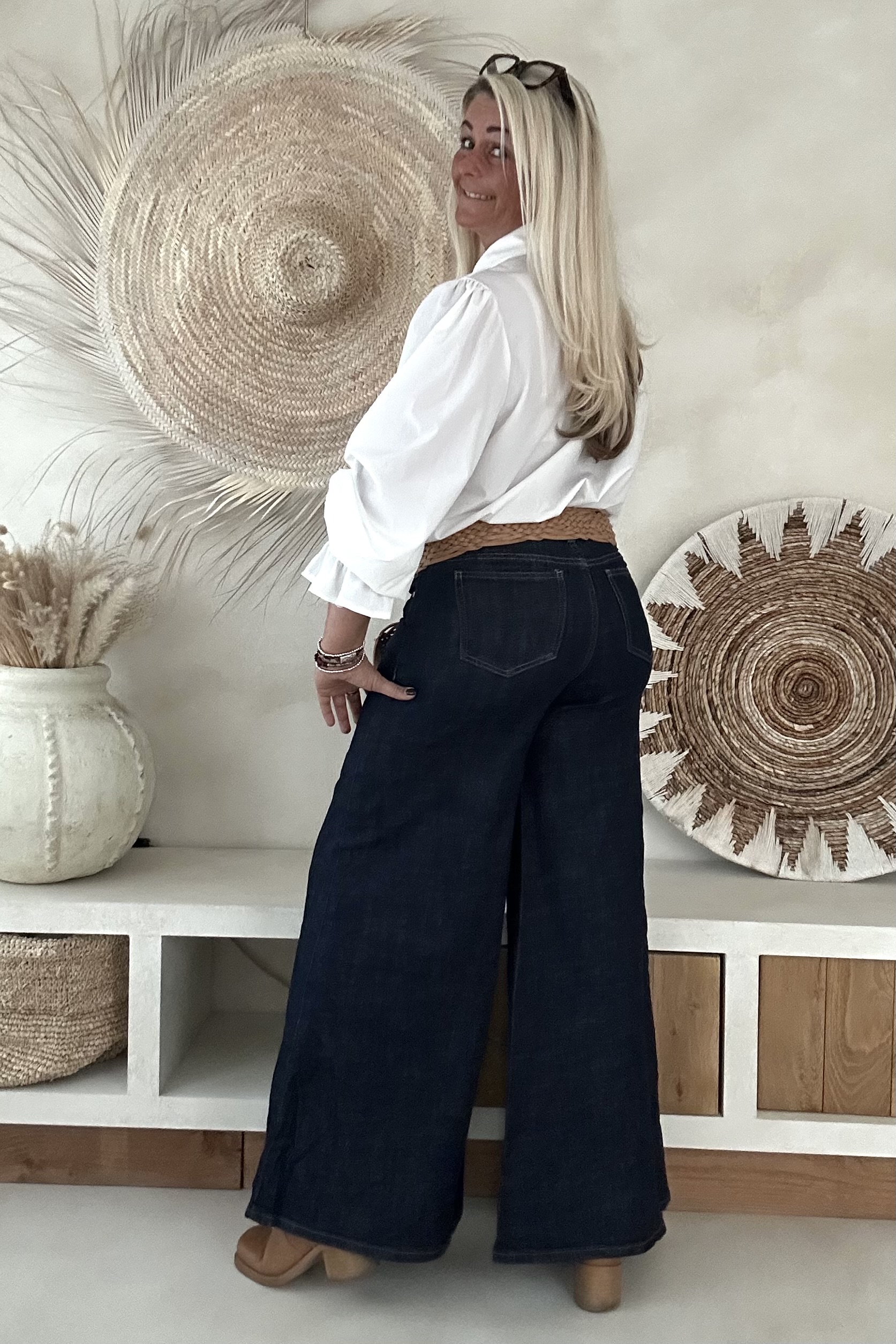 Deze ultra wide leg jeans is perfect voor iedereen die houdt van een moderne hippie vibe. De donkerblauwe denim valt soepel en extra wijd, waardoor je een prachtig zwierend silhouet creëert bij elke stap. De medium hoge taille sluit mooi aan rond de heupen en zorgt samen met de normale pasvorm voor een vrouwelijke, flatterende look. Ideaal te combineren met een basic top, chunky knit of boho blouse — deze jeans maakt elke outfit moeiteloos stijlvol.
