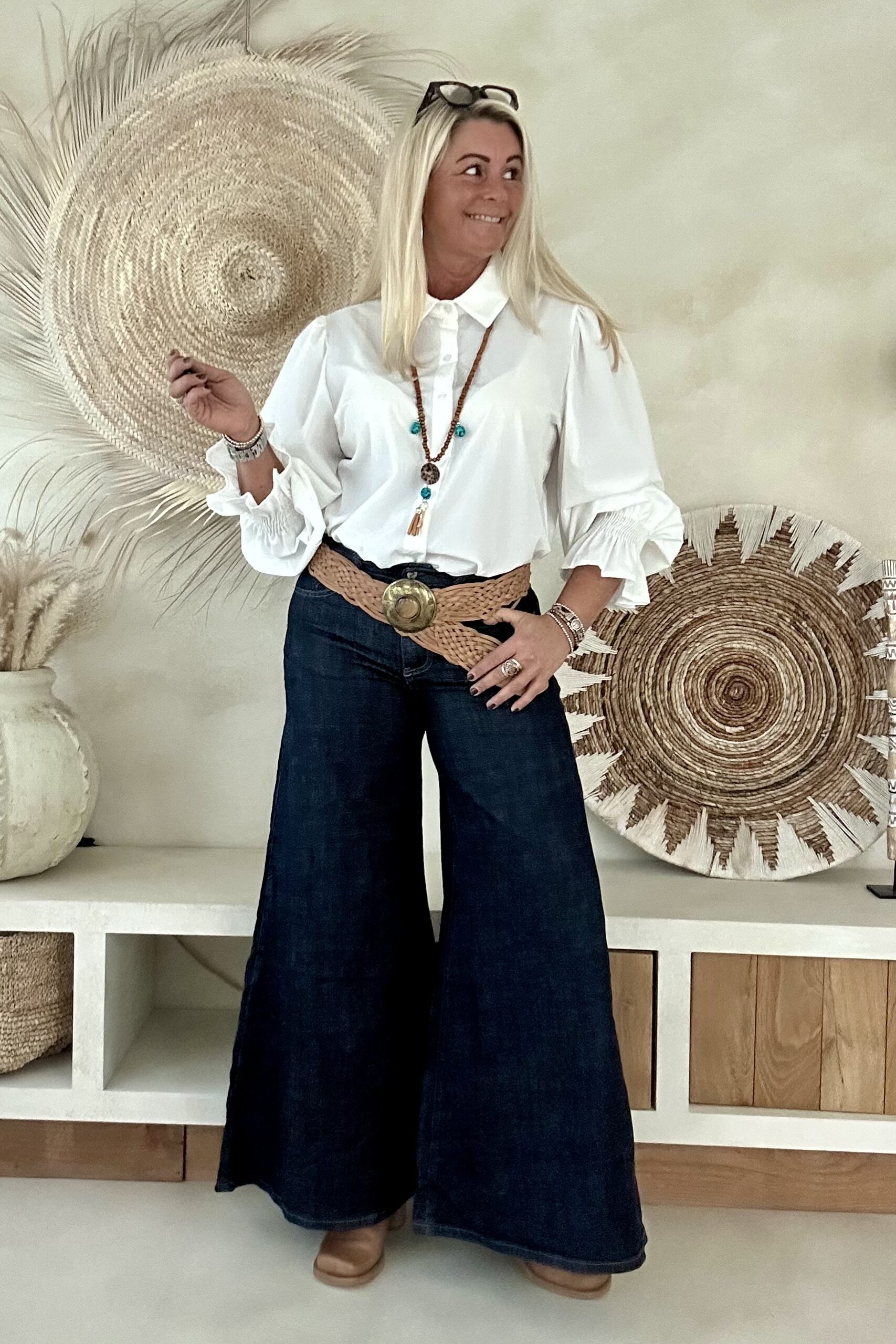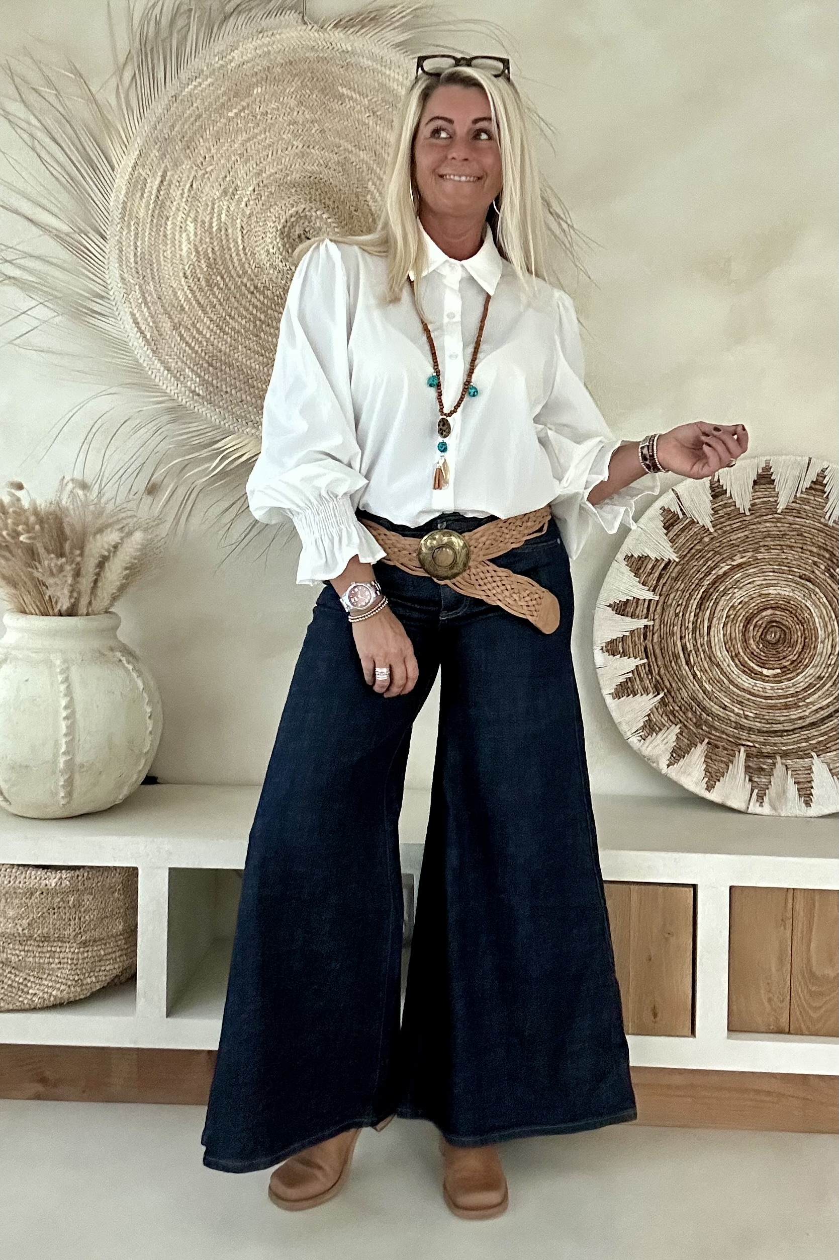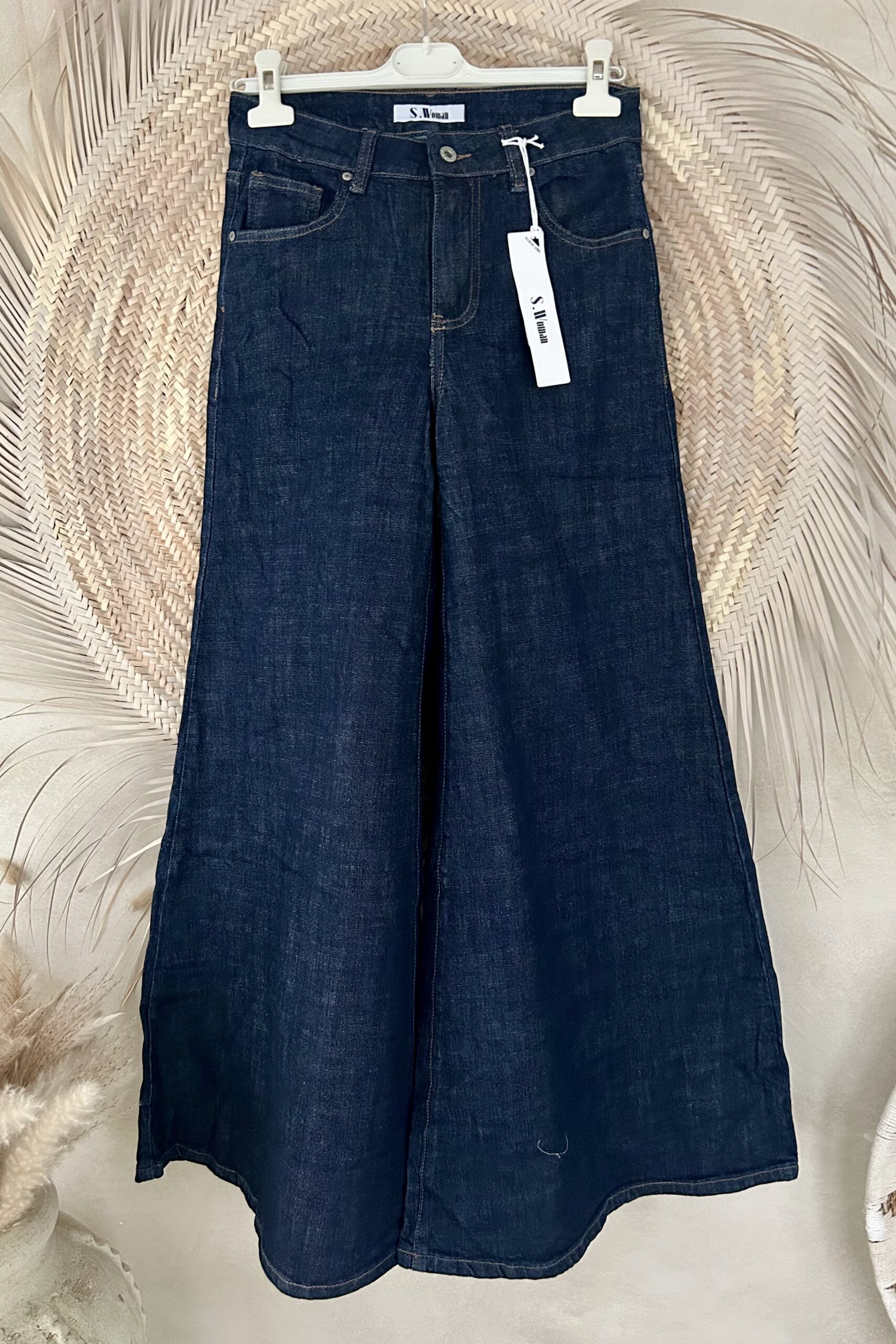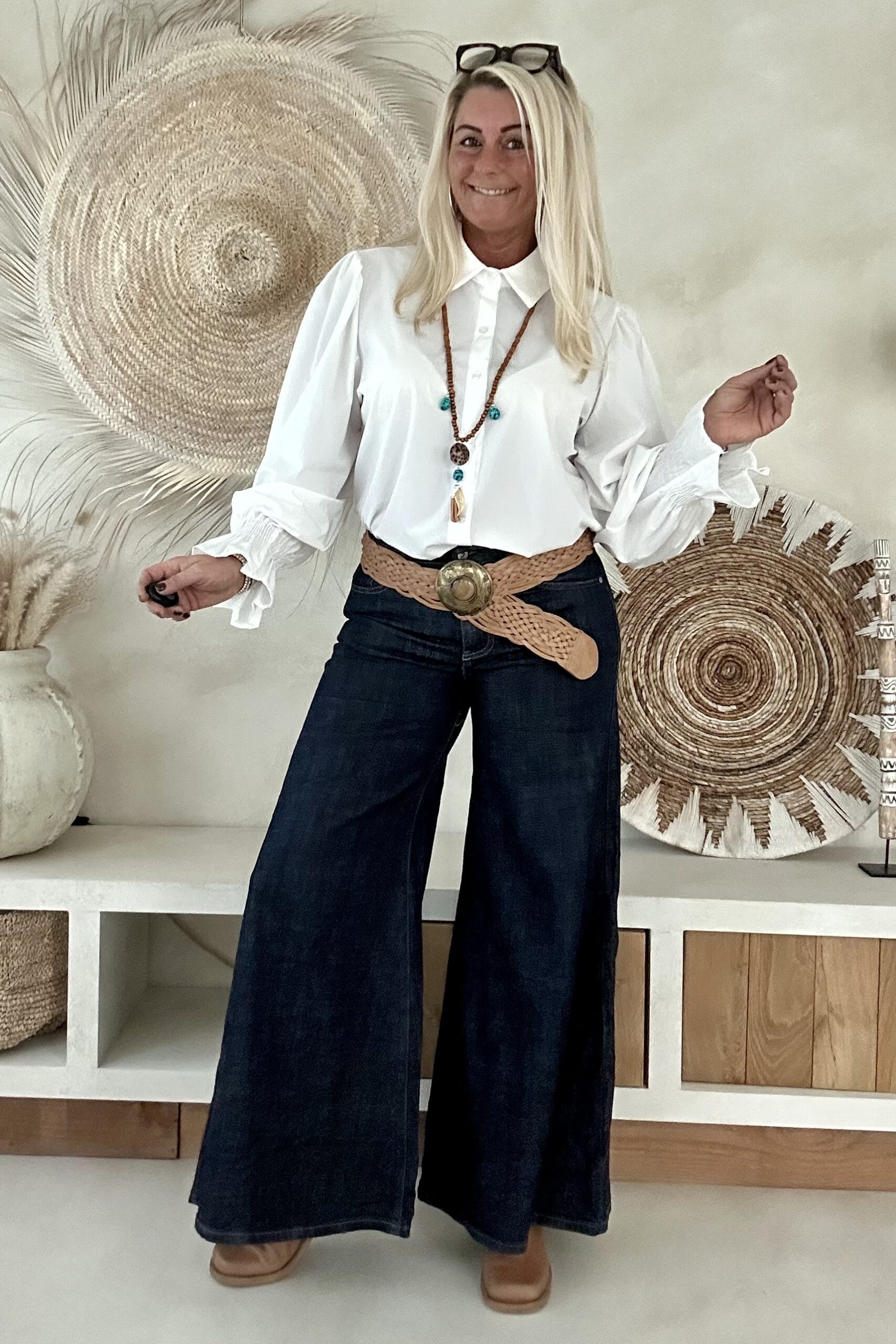 Deze ultra wide leg jeans is perfect voor iedereen die houdt van een moderne hippie vibe. De donkerblauwe denim valt soepel en extra wijd, waardoor je een prachtig zwierend silhouet creëert bij elke stap. De medium hoge taille sluit mooi aan rond de heupen en zorgt samen met de normale pasvorm voor een vrouwelijke, flatterende look. Ideaal te combineren met een basic top, chunky knit of boho blouse — deze jeans maakt elke outfit moeiteloos stijlvol.