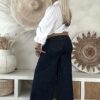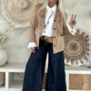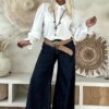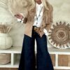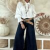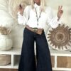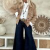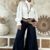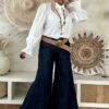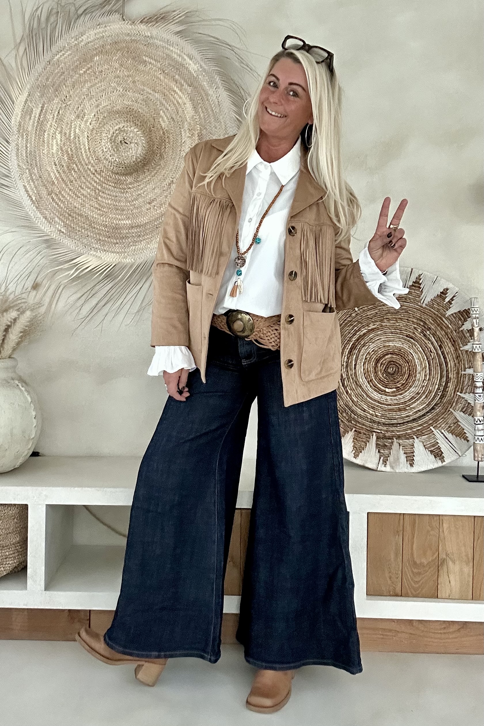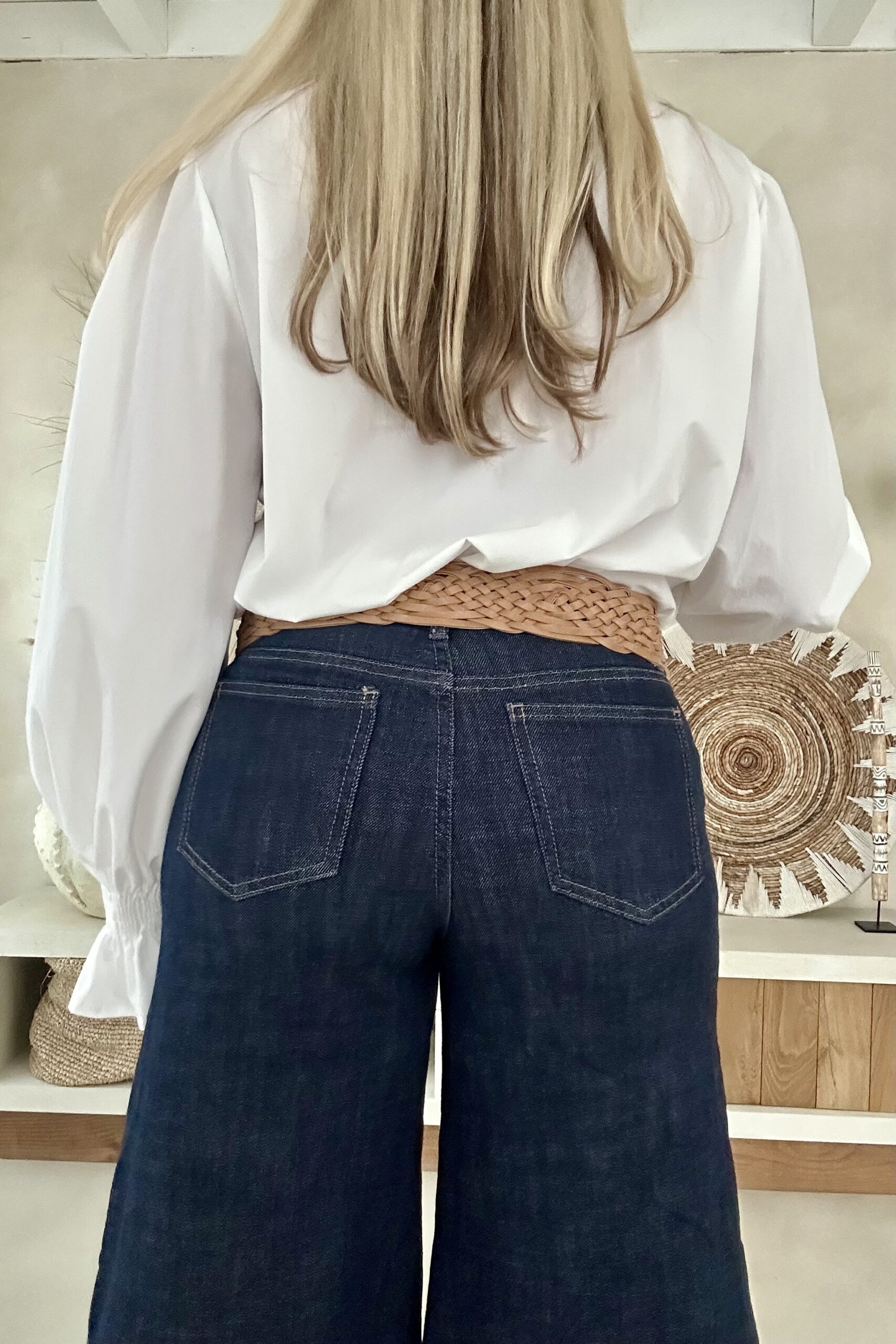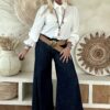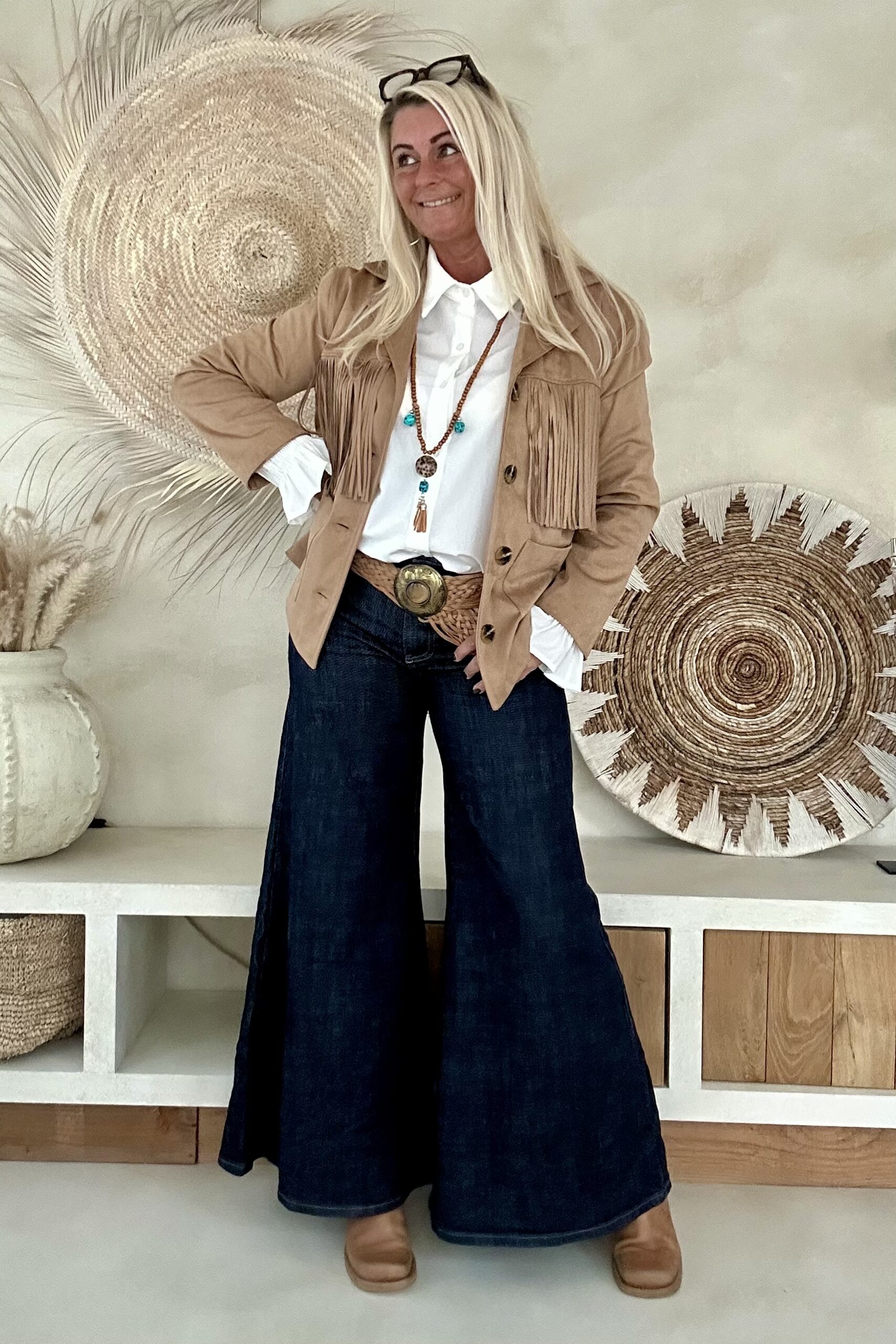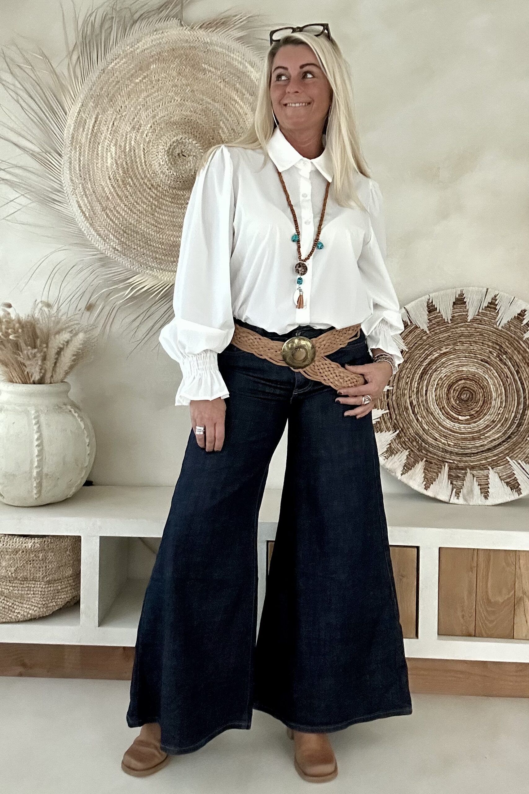 Deze ultra wide leg jeans is perfect voor iedereen die houdt van een moderne hippie vibe. De donkerblauwe denim valt soepel en extra wijd, waardoor je een prachtig zwierend silhouet creëert bij elke stap. De medium hoge taille sluit mooi aan rond de heupen en zorgt samen met de normale pasvorm voor een vrouwelijke, flatterende look. Ideaal te combineren met een basic top, chunky knit of boho blouse — deze jeans maakt elke outfit moeiteloos stijlvol.