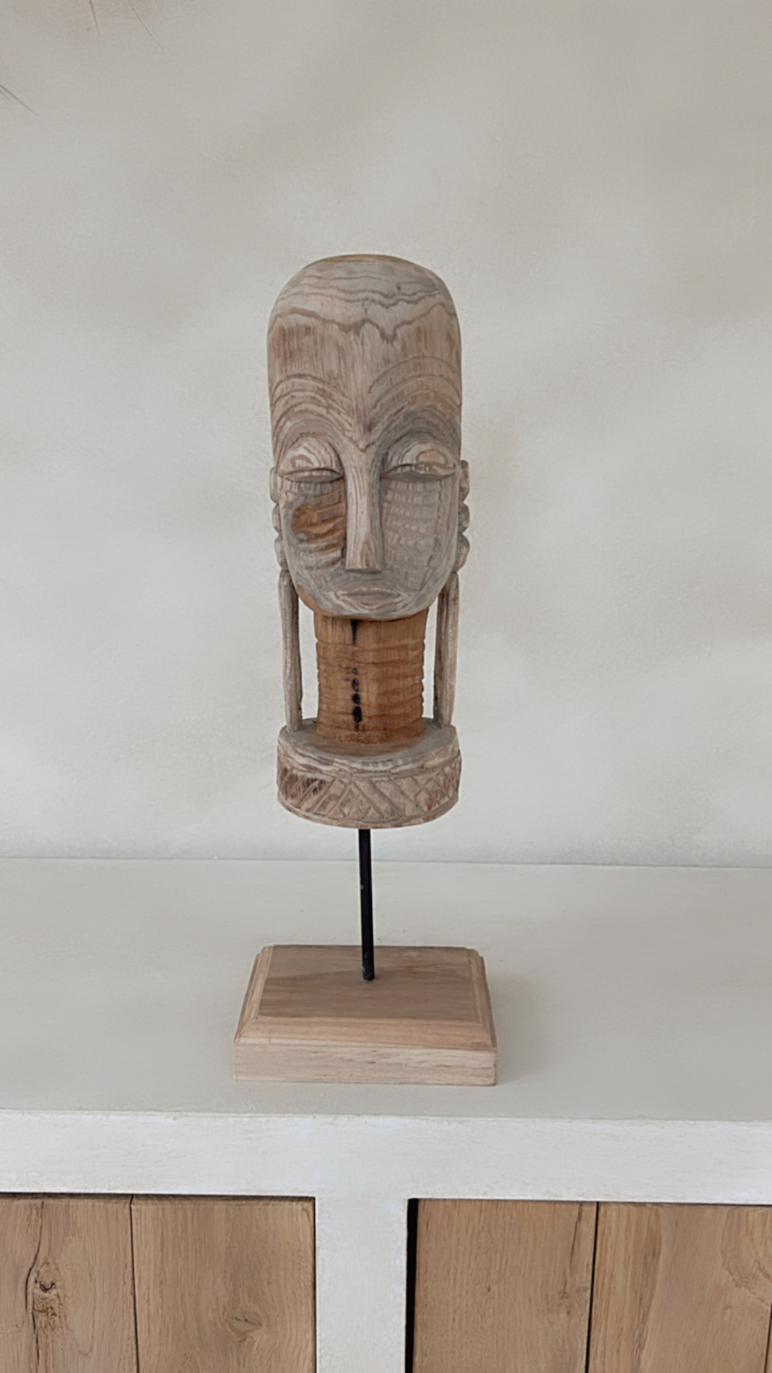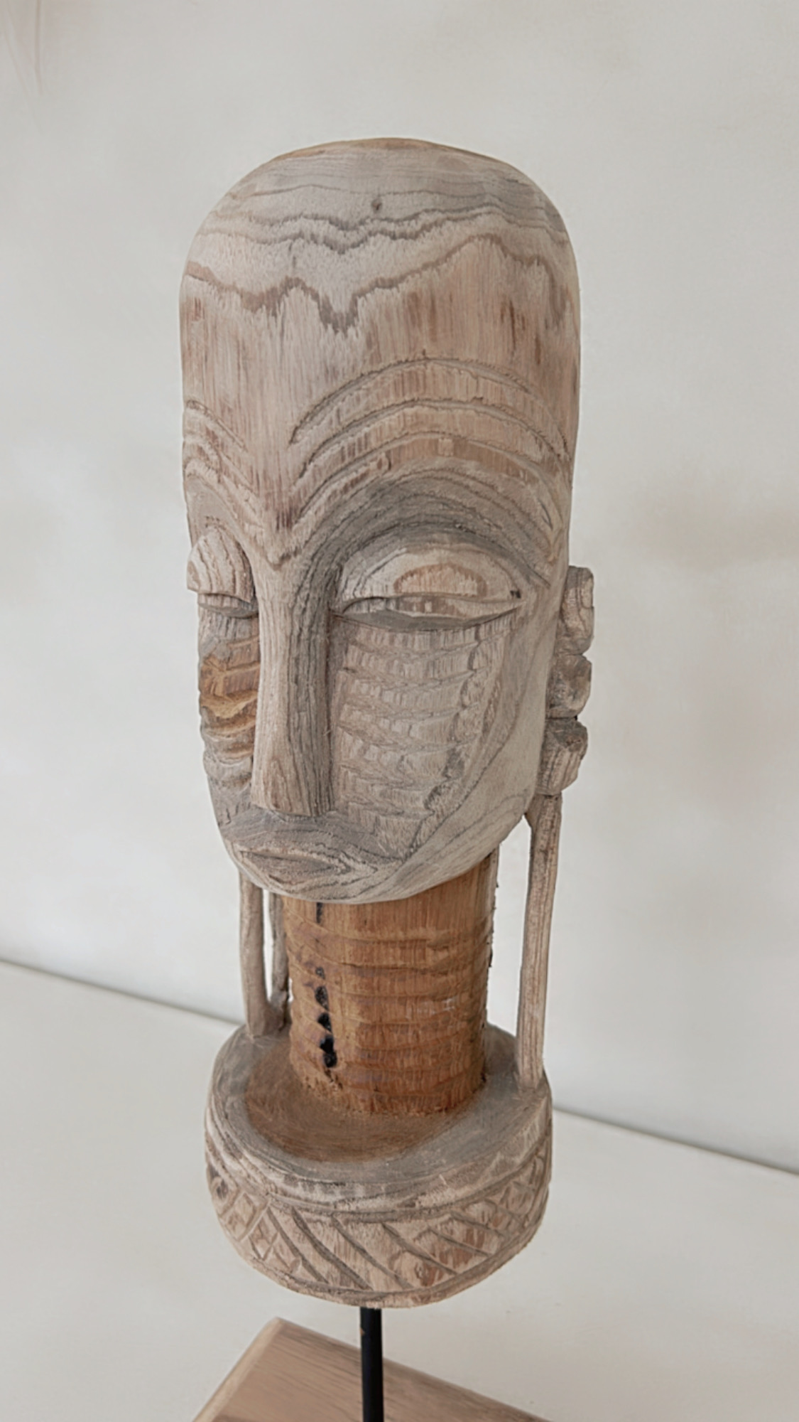Dit handgesneden houten Wayang-beeld brengt een subtiele, spirituele sfeer in huis. Met zijn serene expressie, lange gelaatstrekken en verfijnde lijnen straalt het beeld rust en diepgang uit. De natuurlijke houtnerf blijft mooi zichtbaar en maakt elk exemplaar uniek – geen massaproductie, maar puur vakmanschap.