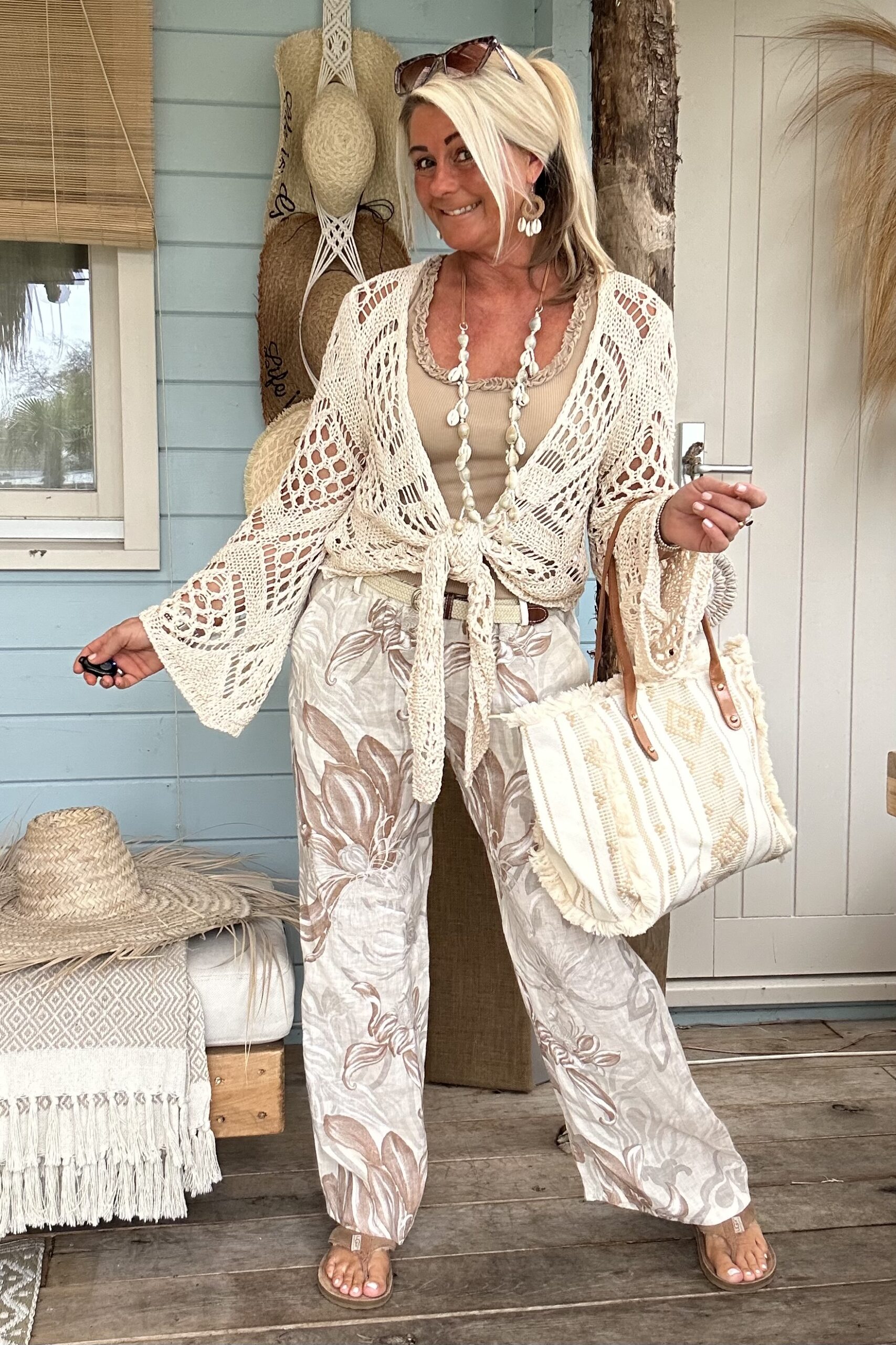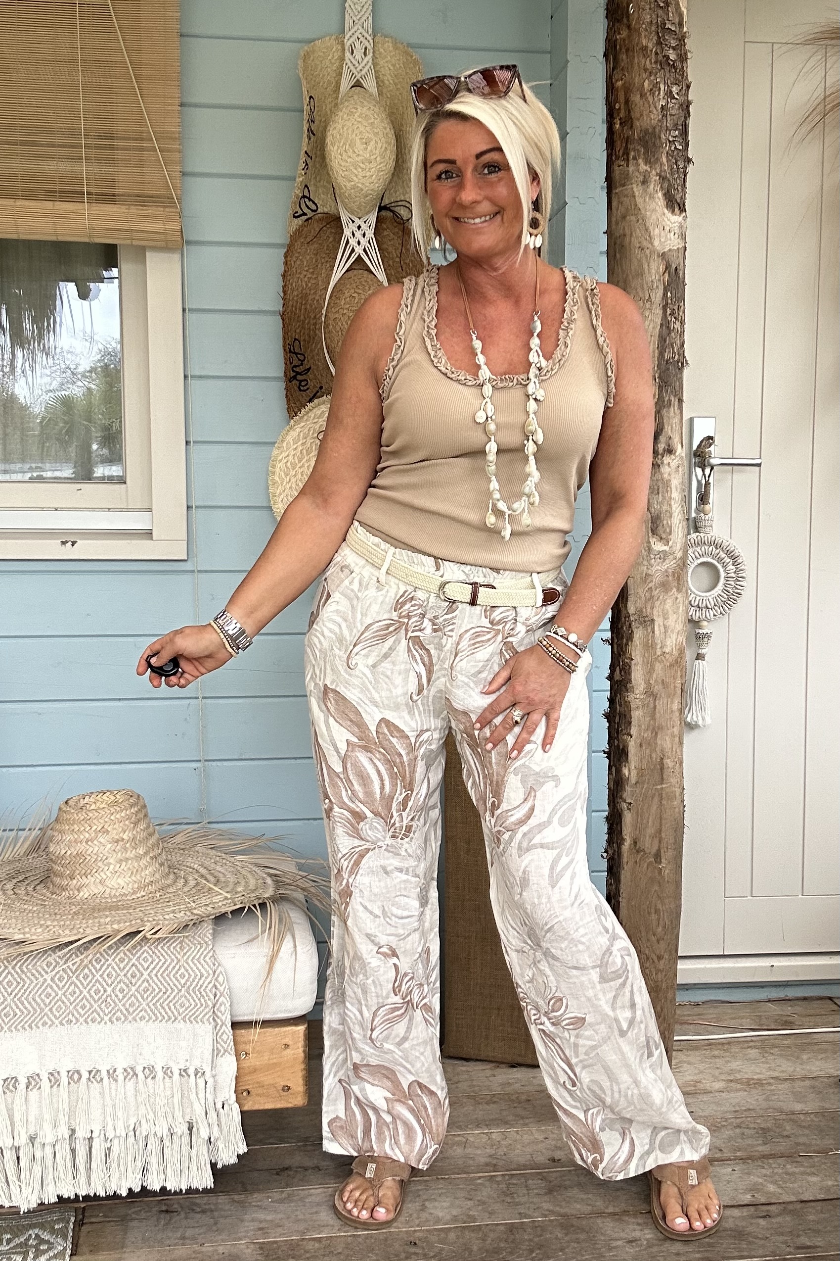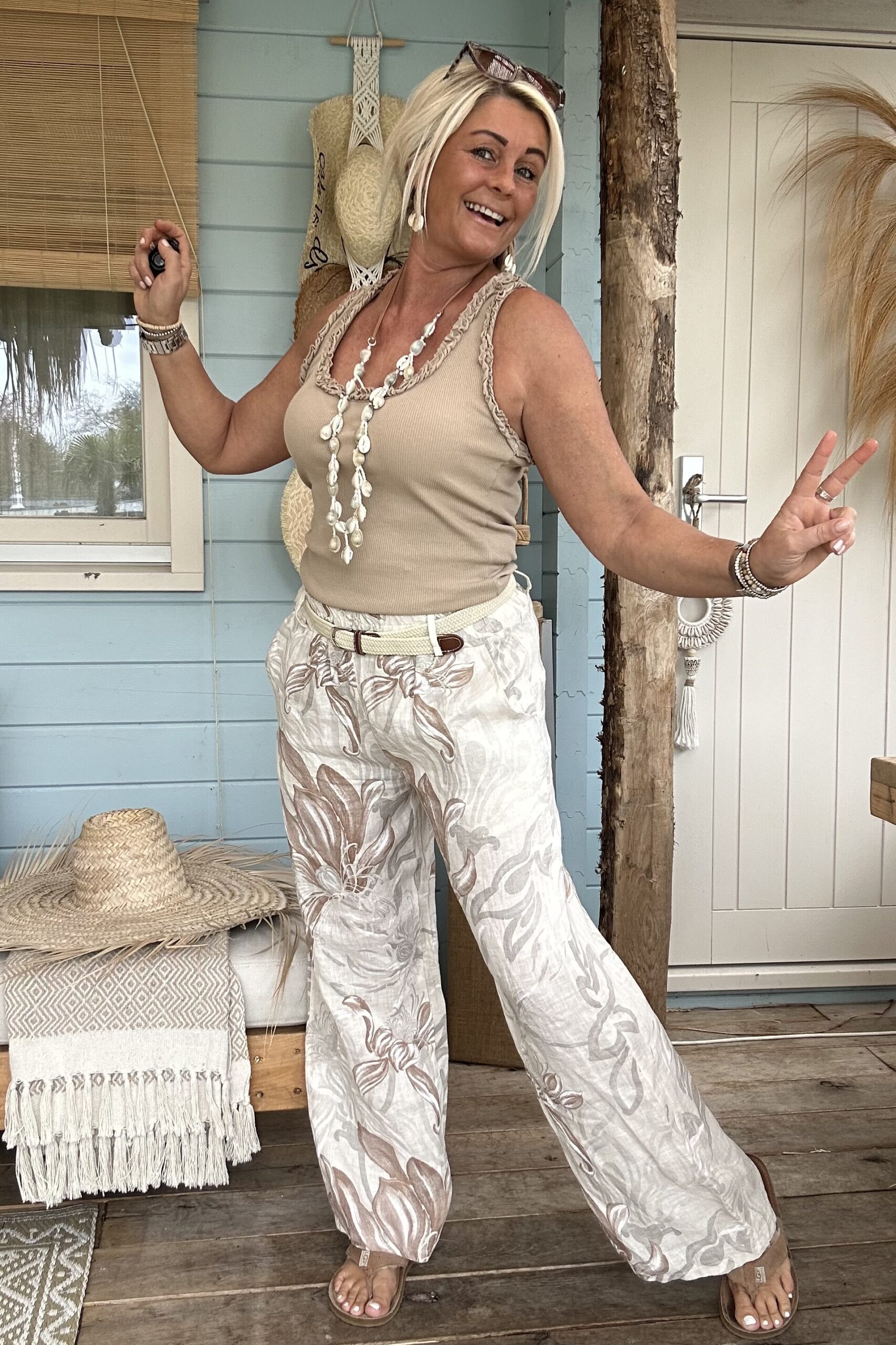 Ontdek onze wijde broek met een prachtige, zachte bloemenprint in naturel tinten – een echte eyecatcher voor je zomergarderobe. De luchtige stof en soepele fit zorgen voor een heerlijk draagcomfort, terwijl de print een stijlvolle en vrouwelijke uitstraling geeft. De elastische tailleband wordt gecombineerd met een elastisch gevlochten riempje, wat zorgt voor een mooie pasvorm én een speels detail.