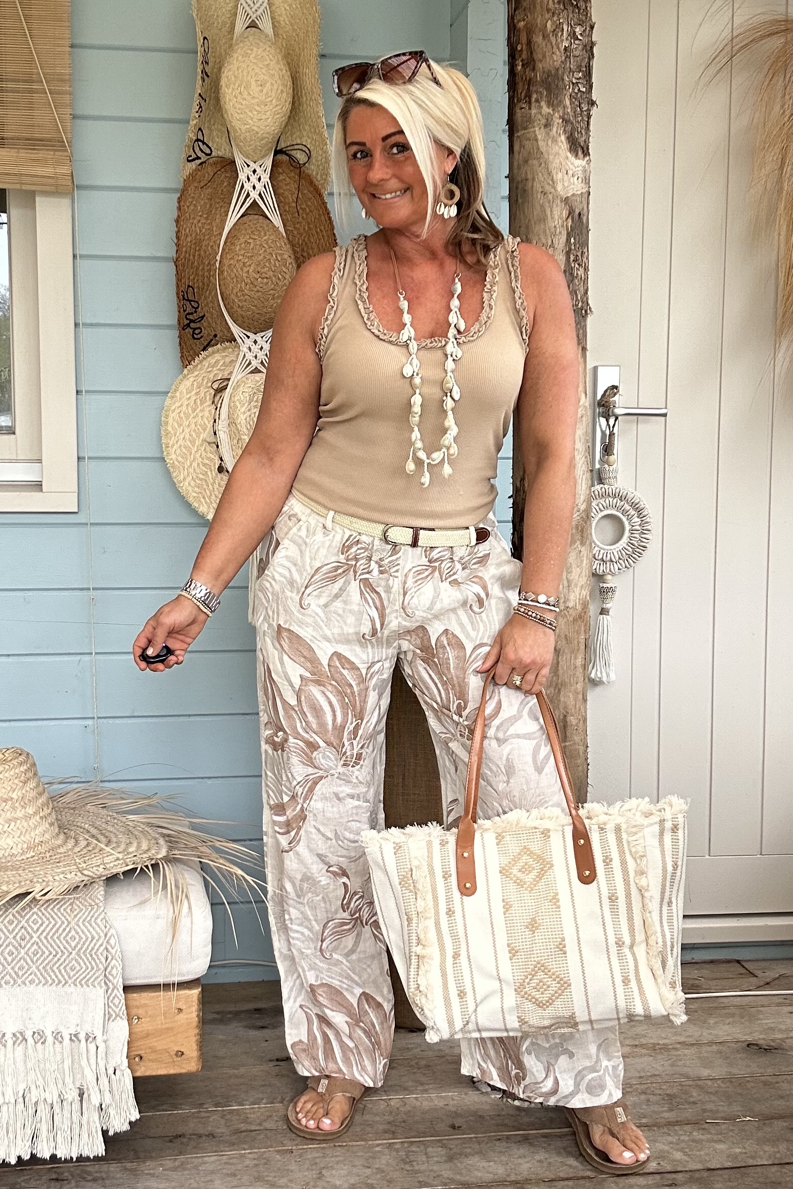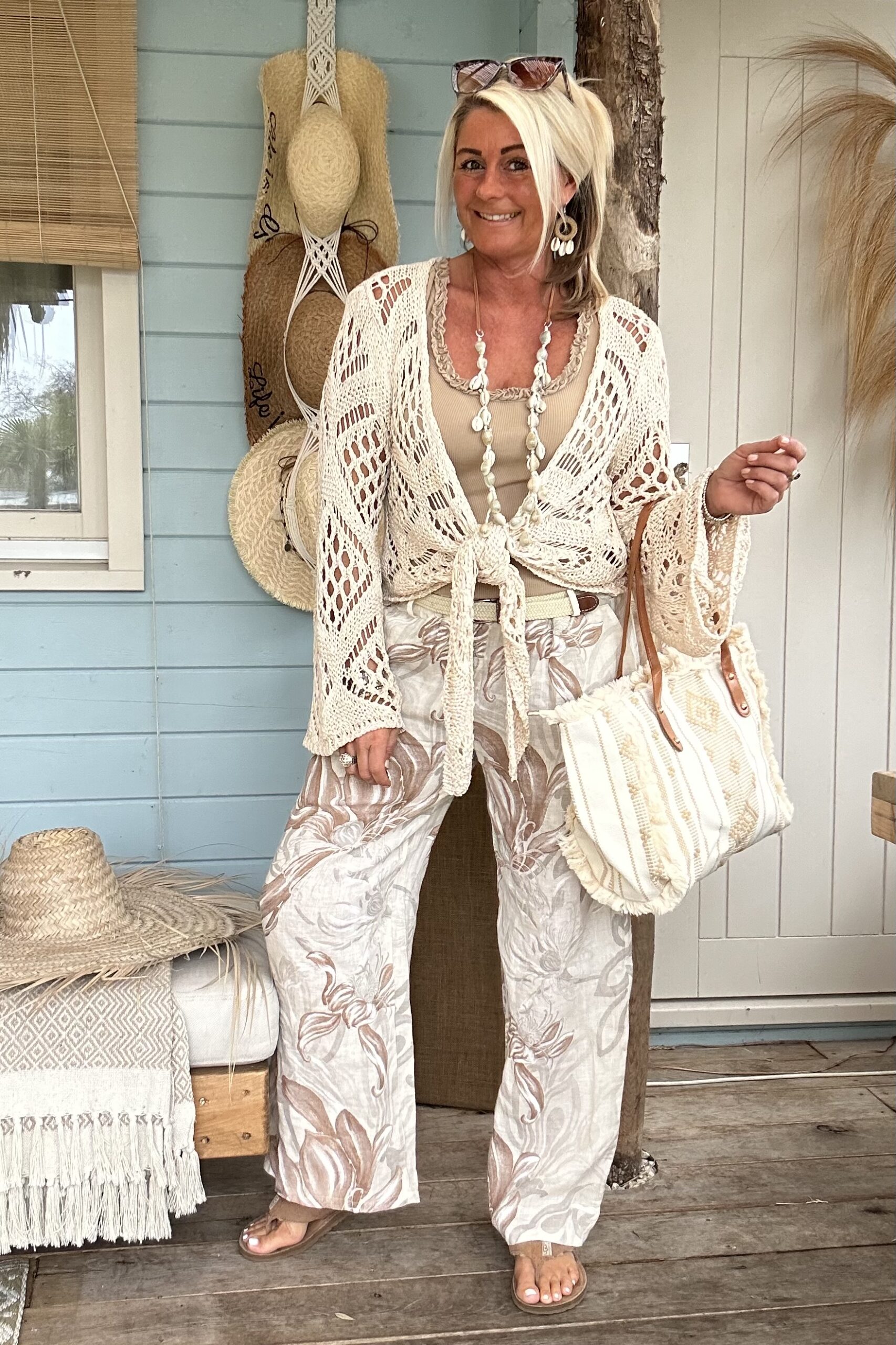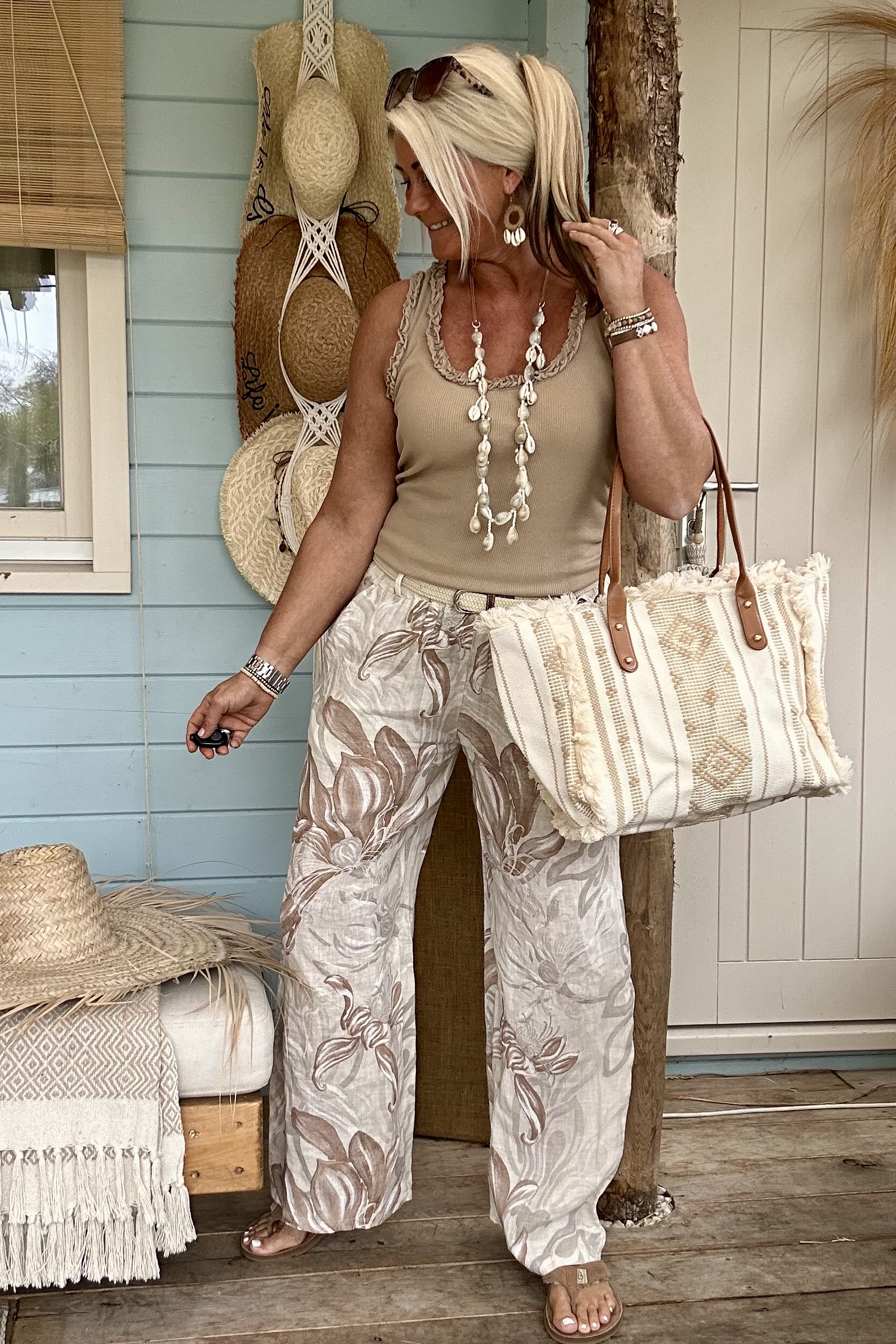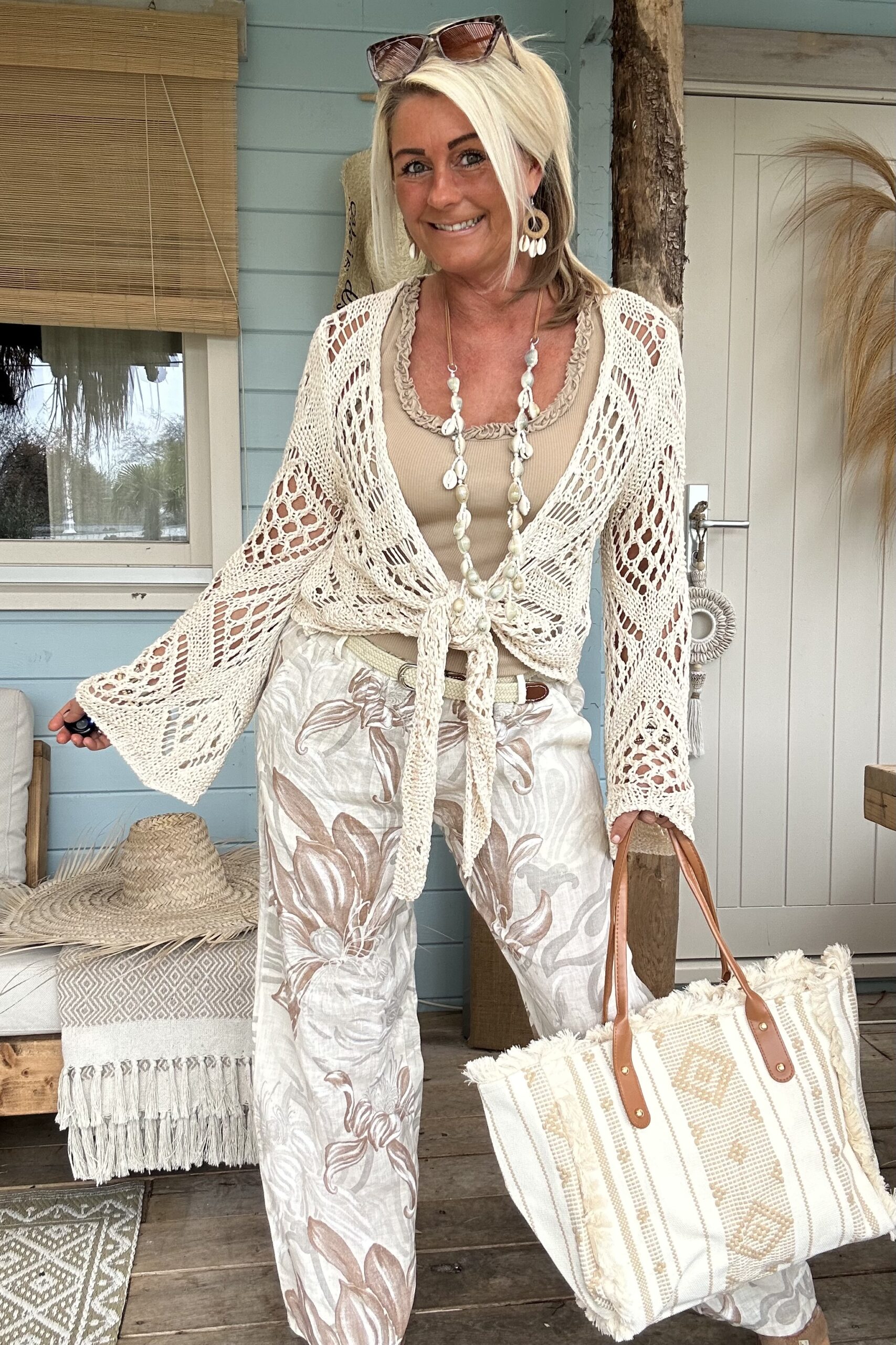 Ontdek onze wijde broek met een prachtige, zachte bloemenprint in naturel tinten – een echte eyecatcher voor je zomergarderobe. De luchtige stof en soepele fit zorgen voor een heerlijk draagcomfort, terwijl de print een stijlvolle en vrouwelijke uitstraling geeft. De elastische tailleband wordt gecombineerd met een elastisch gevlochten riempje, wat zorgt voor een mooie pasvorm én een speels detail.