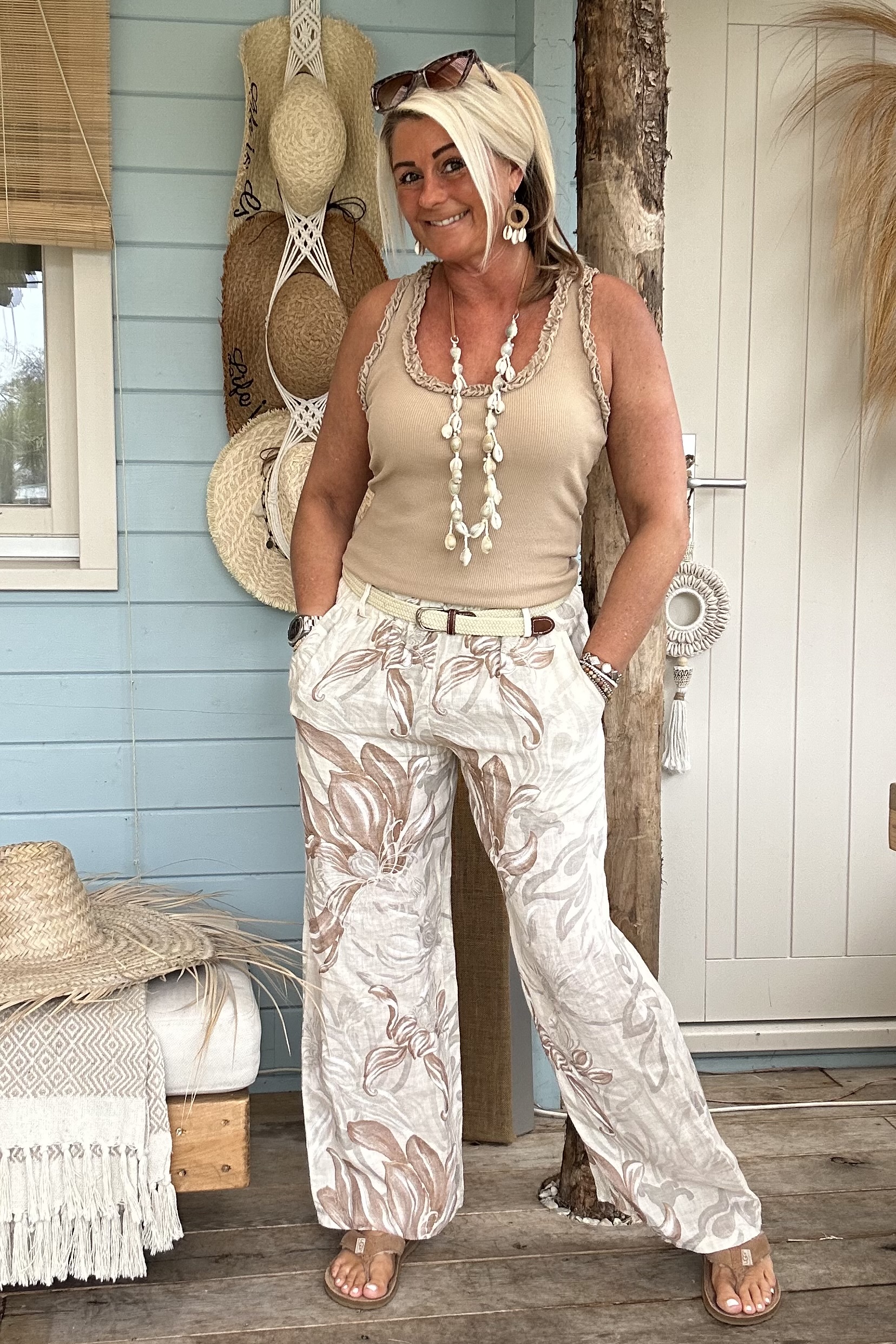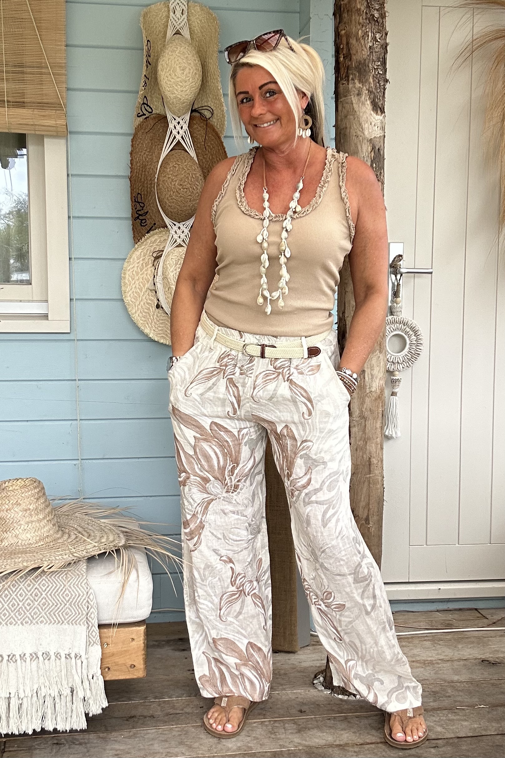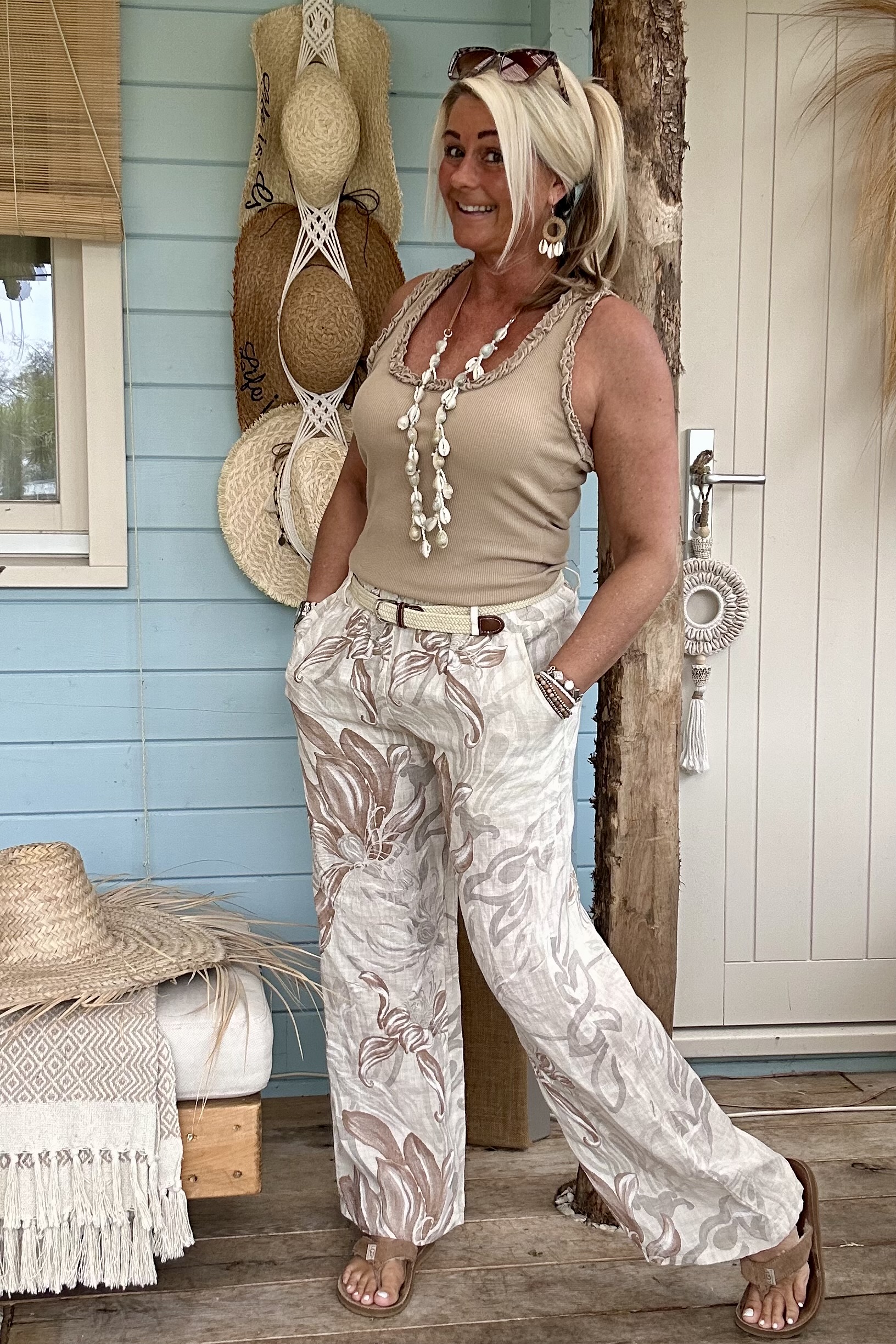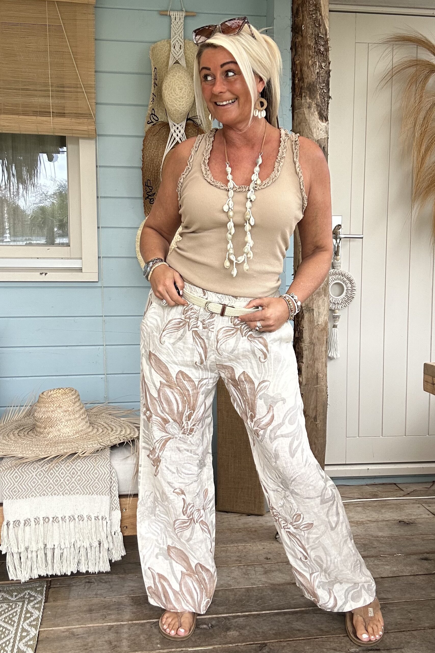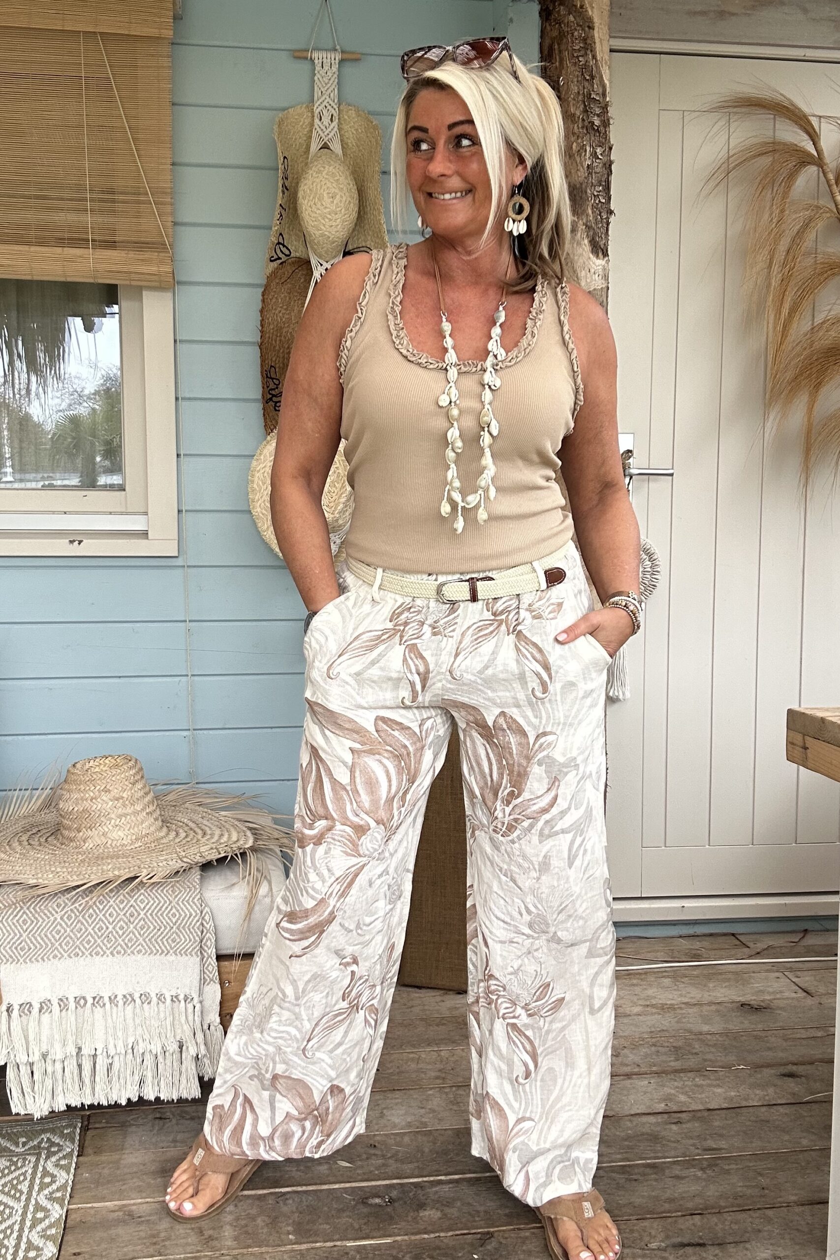 Wijde Linnen Broek Louise met Riempje, Flower Naturel