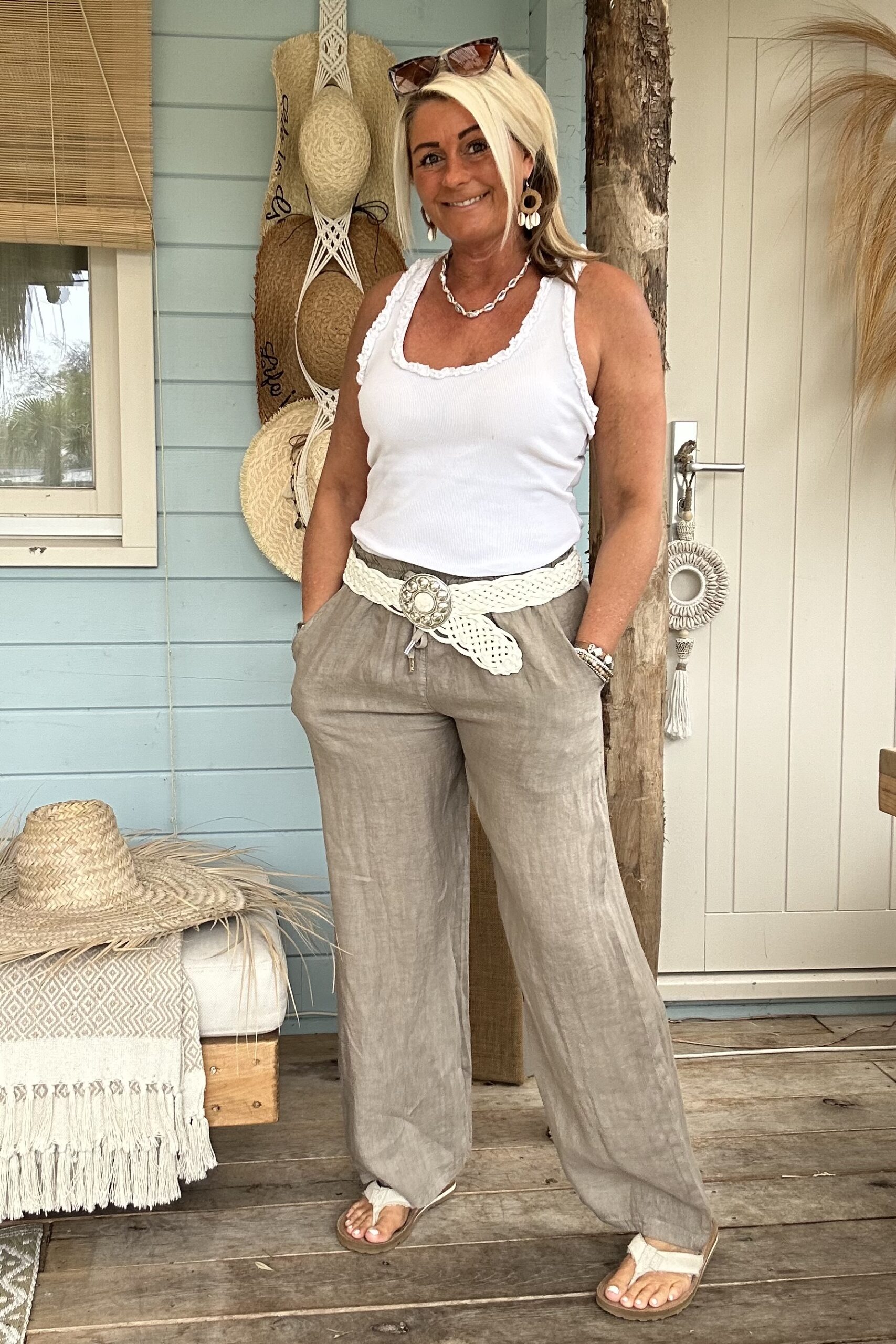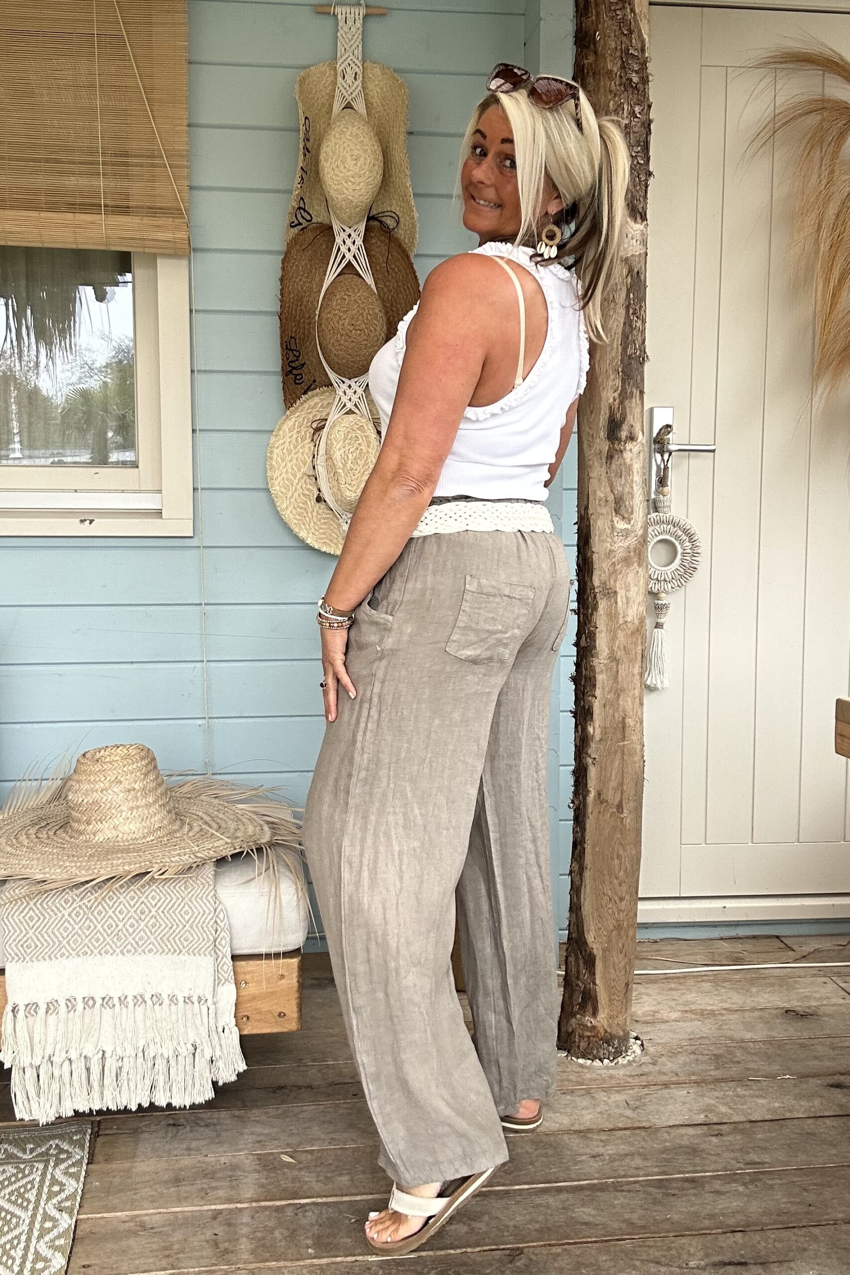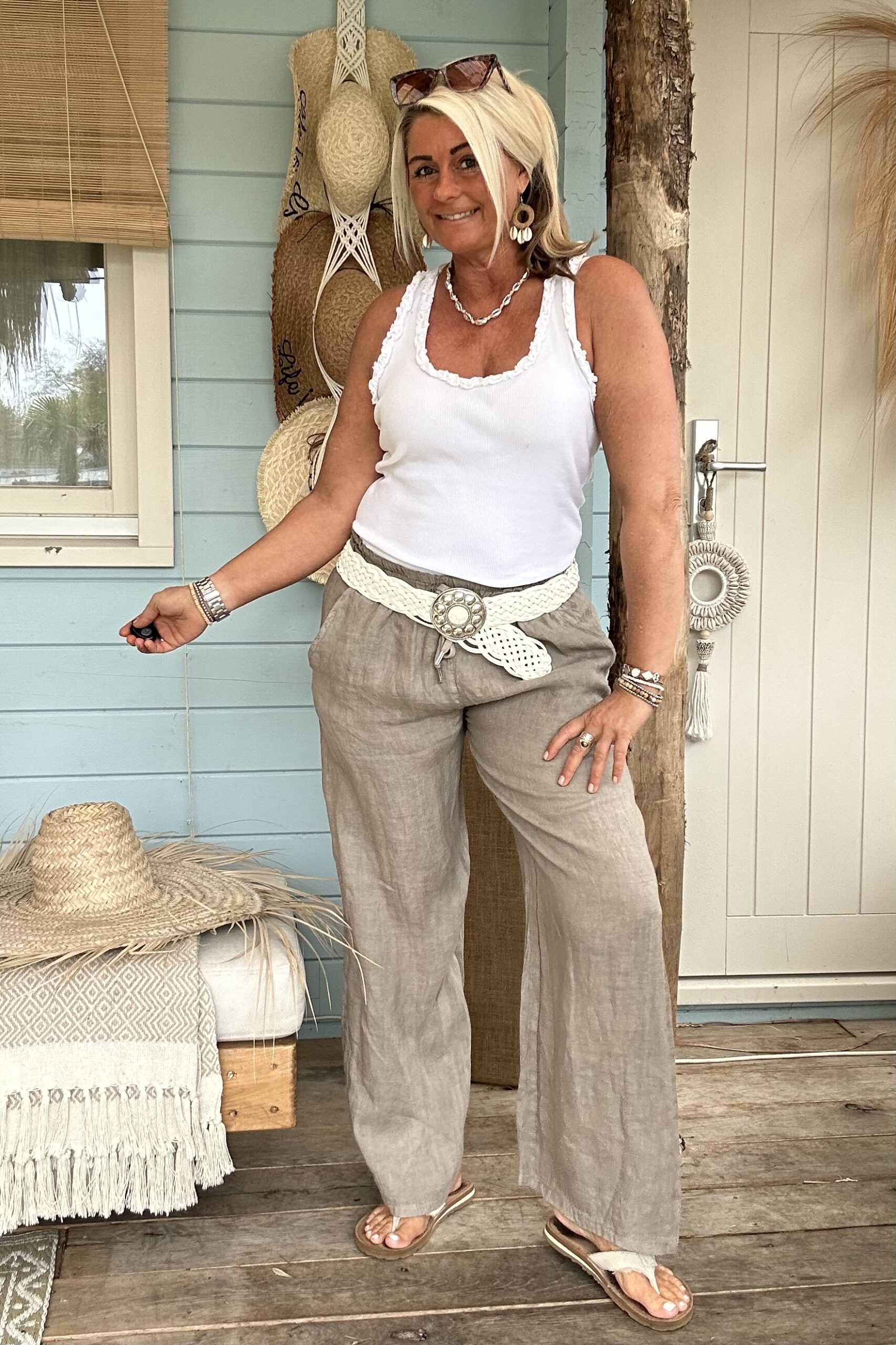 Combineer deze linnen broek met een ruffle top voor een luchtige, vrouwelijke look. Voeg leuke accessoires toe, zoals een opvallende ketting en een stijlvolle hoed, om een echte Ibiza boho-vibe te creëren. Of je nu een dagje naar het strand gaat of een zomerse wandeling maakt, deze outfit zorgt ervoor dat je er altijd modieus en ontspannen uitziet.